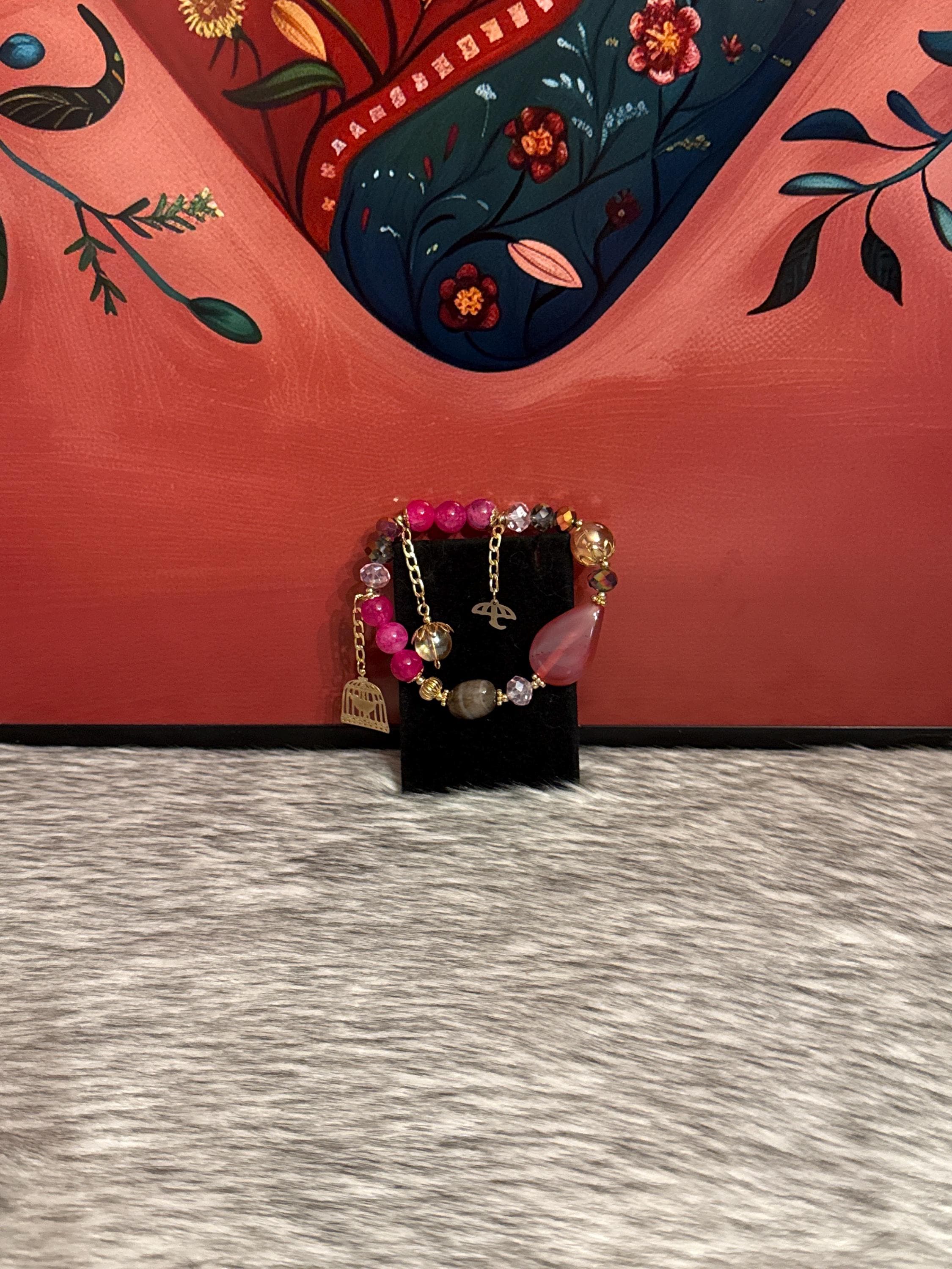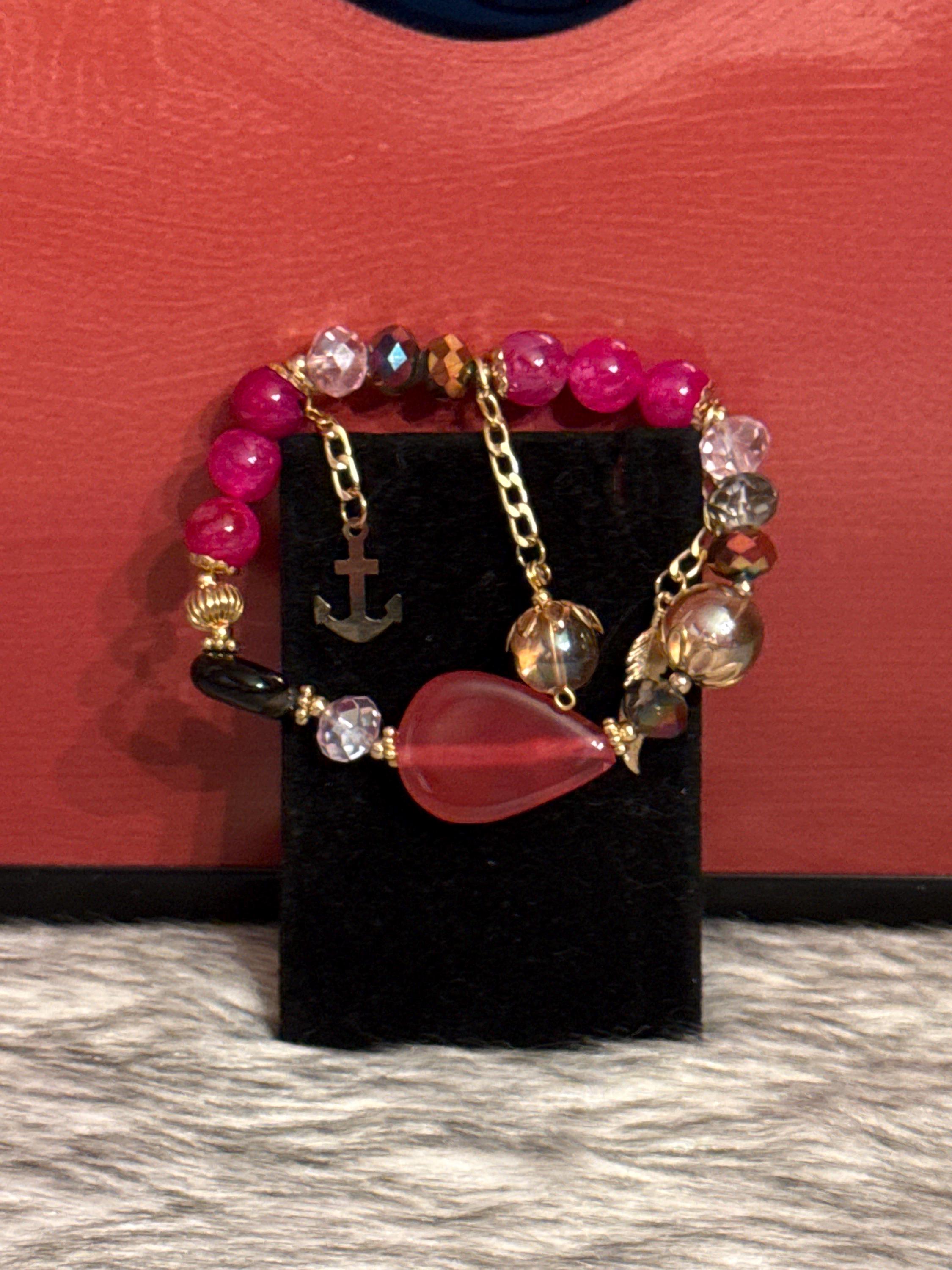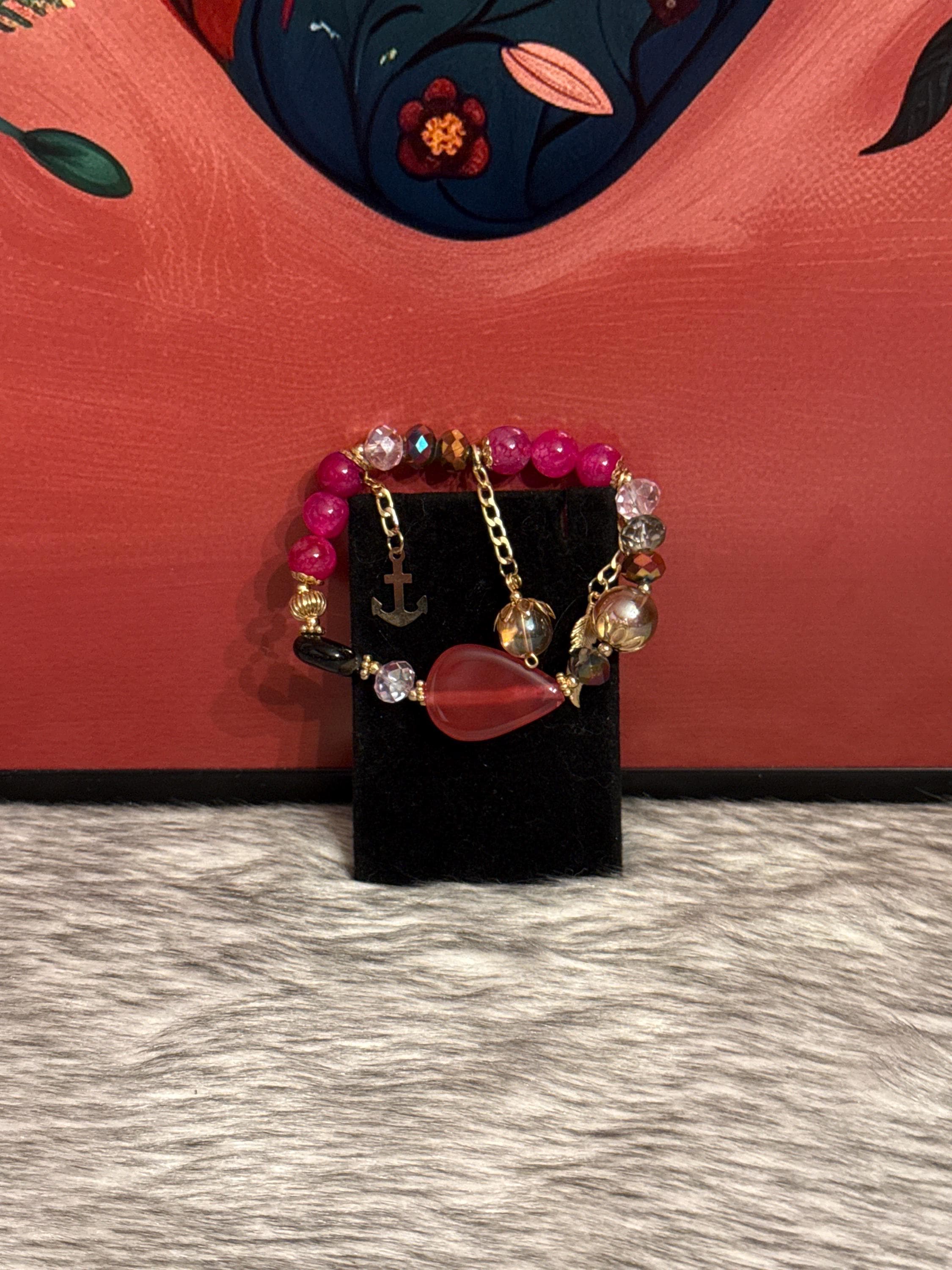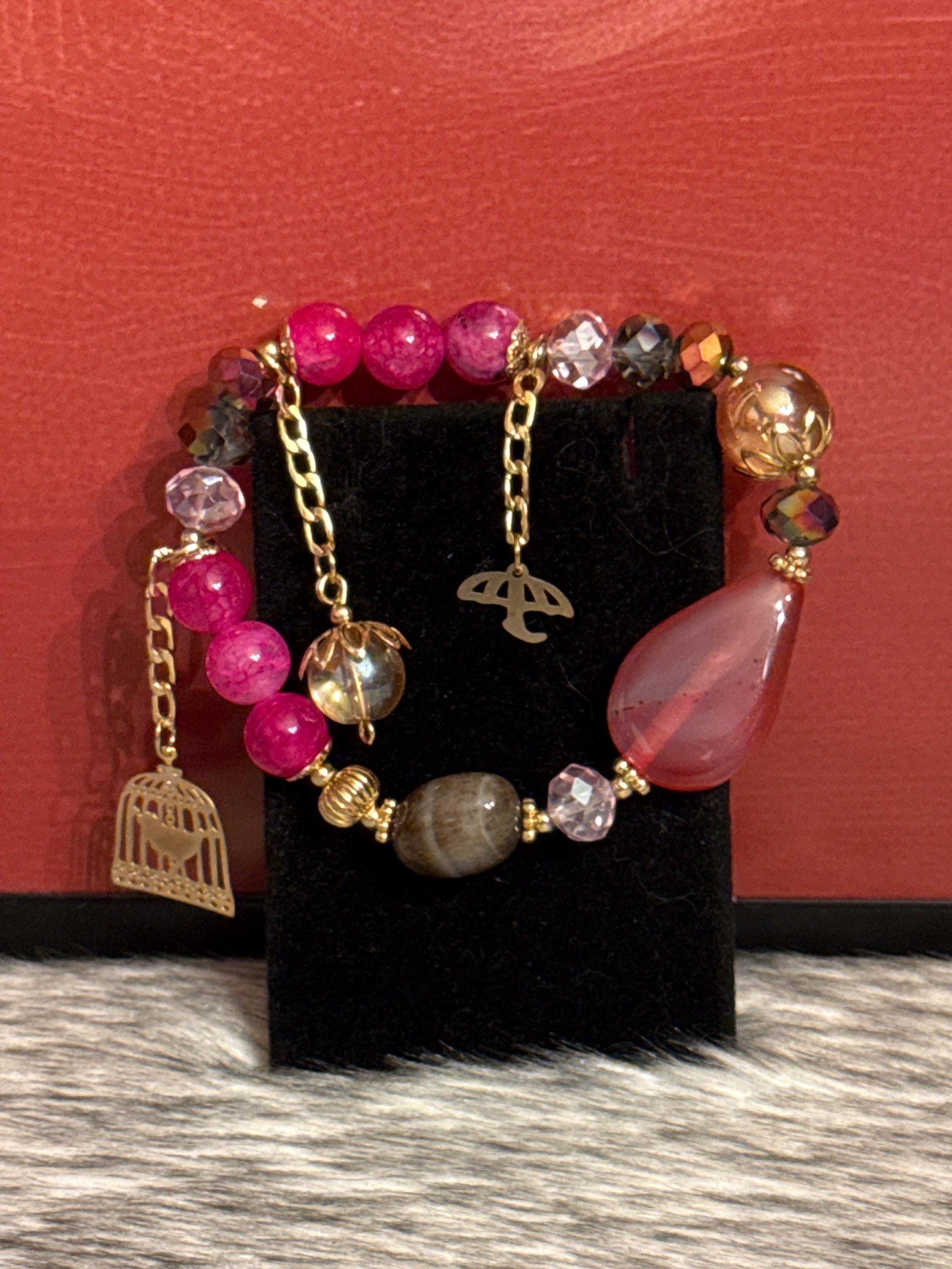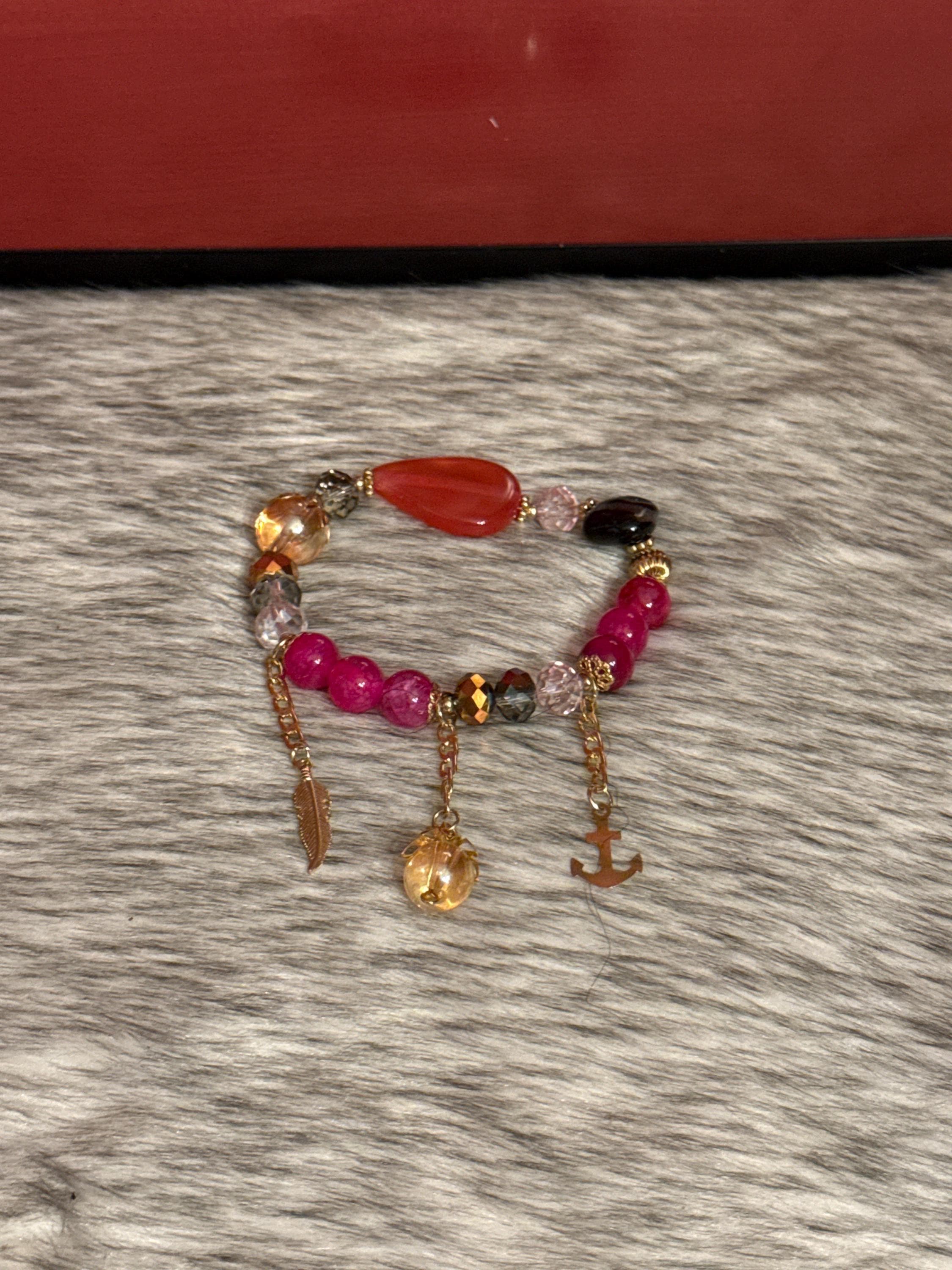 Beautiful handmade Gypsy bracelet made with Czech crystals, natural agate stones and 14k gold plated pendants, Mexican craftsmanship.
