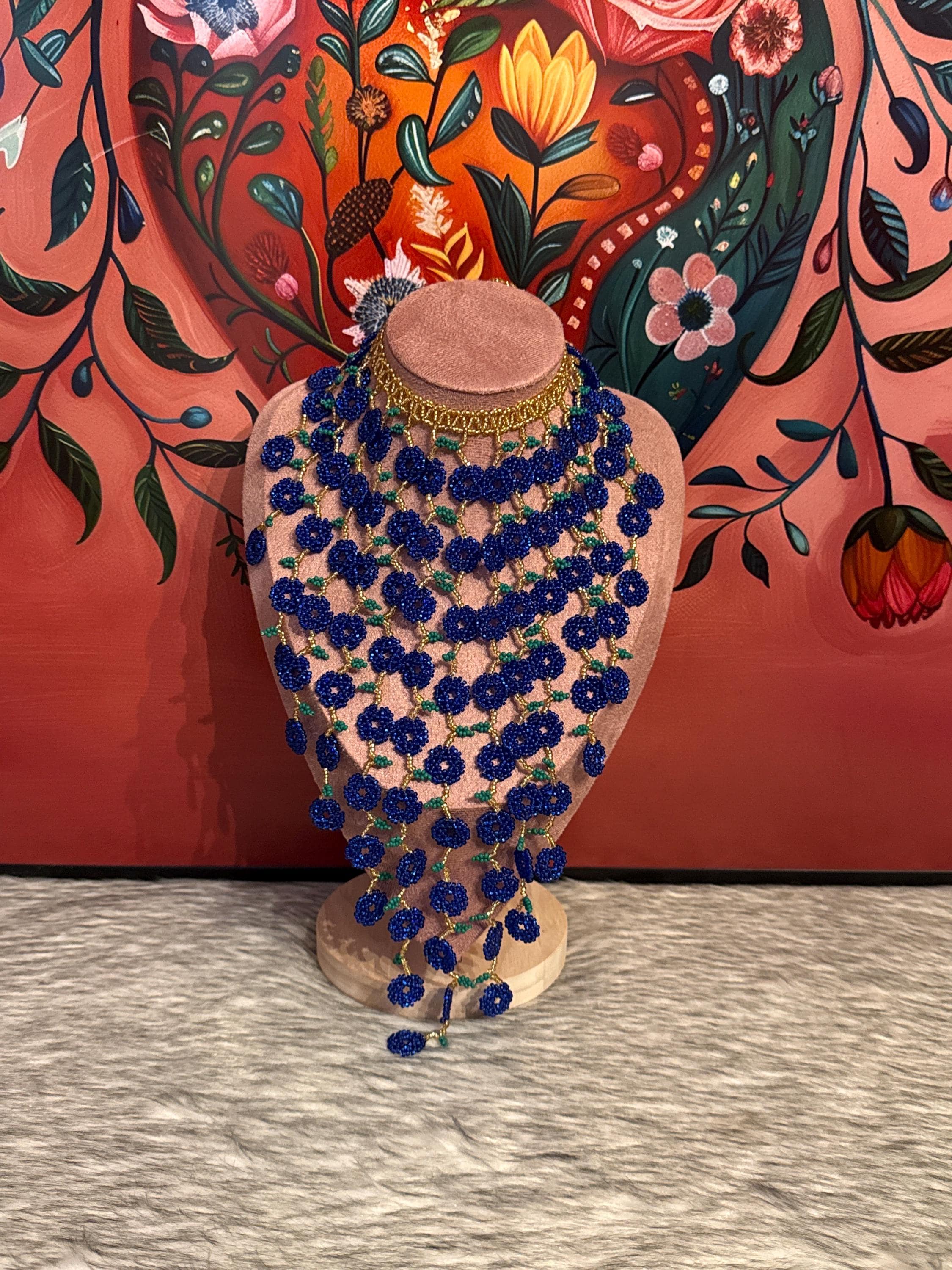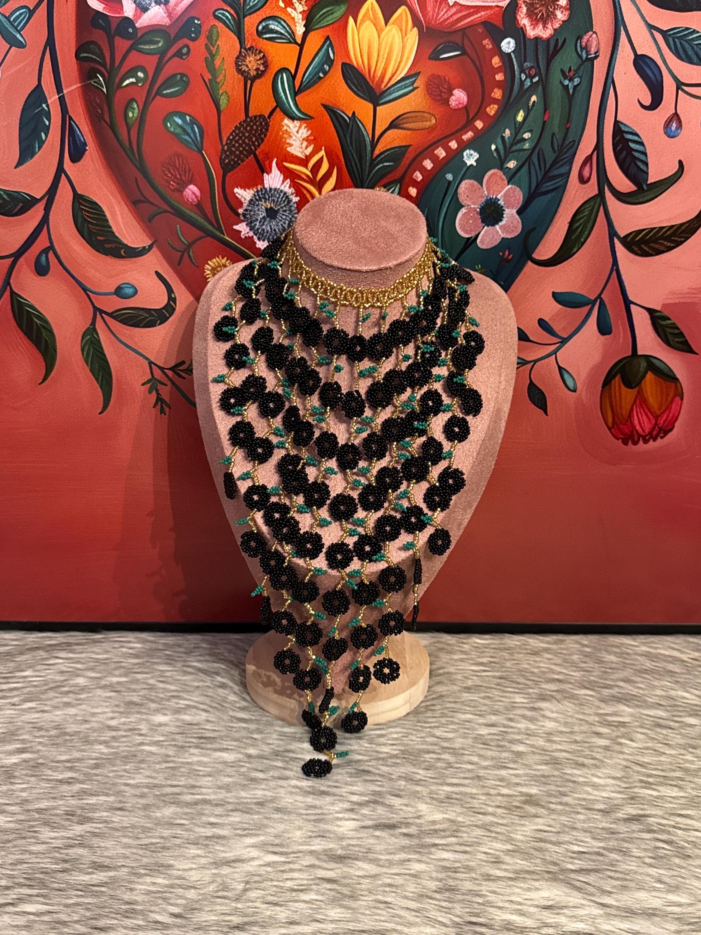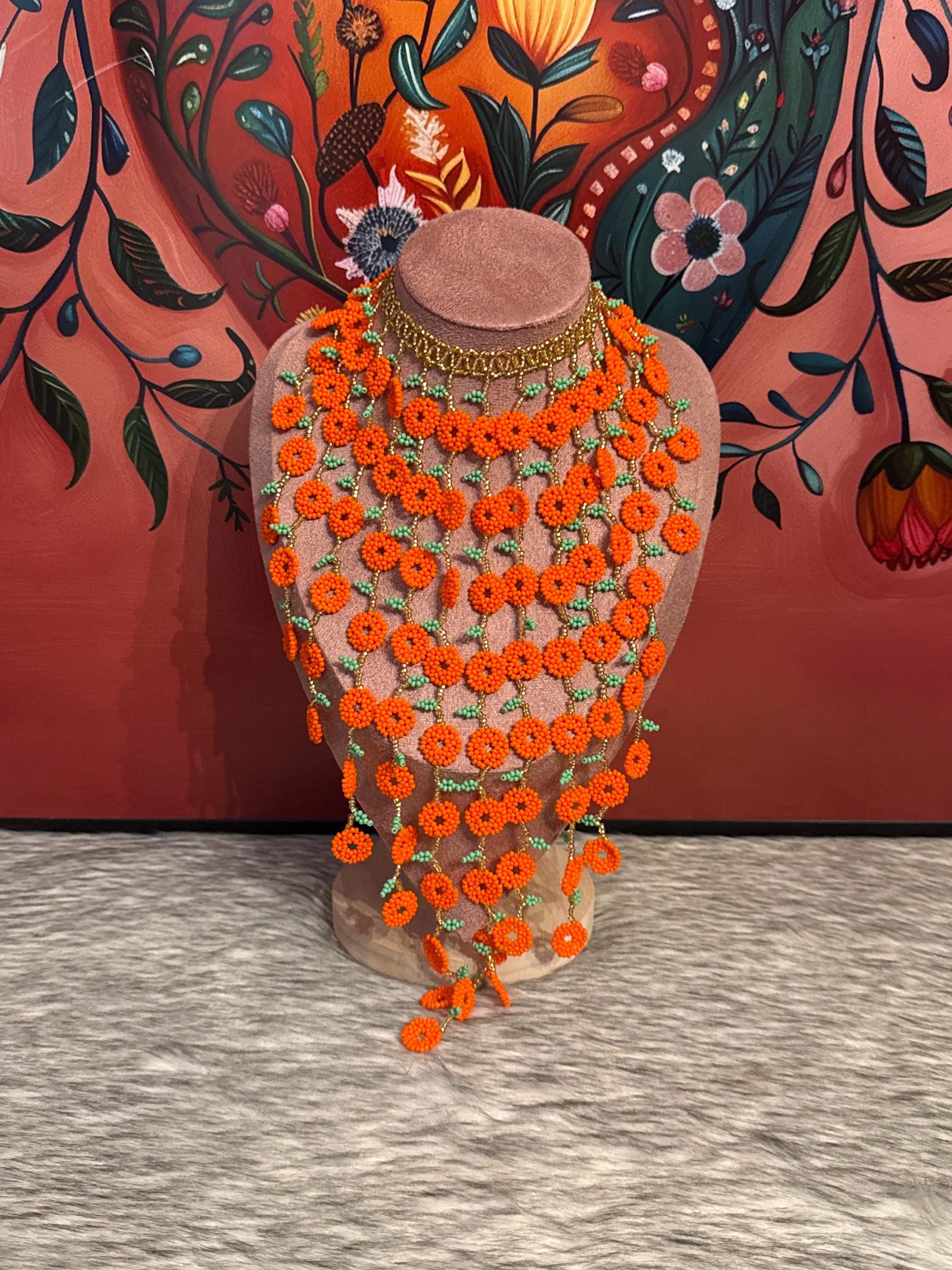 Beautiful necklace and earrings with round flowers, made with beads by Mexican artisans, are a colorful piece that enhances any outfit.