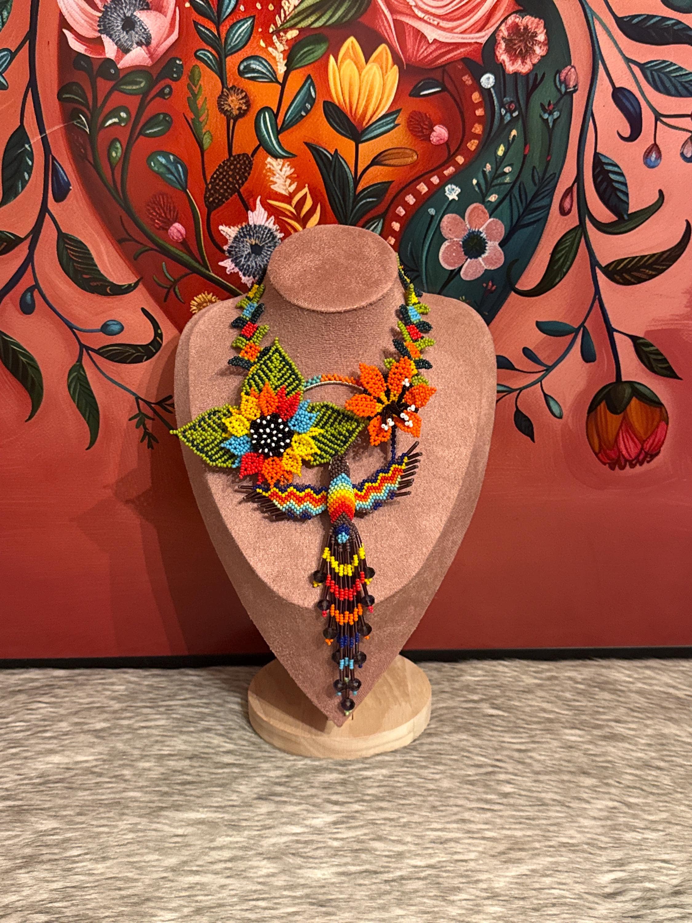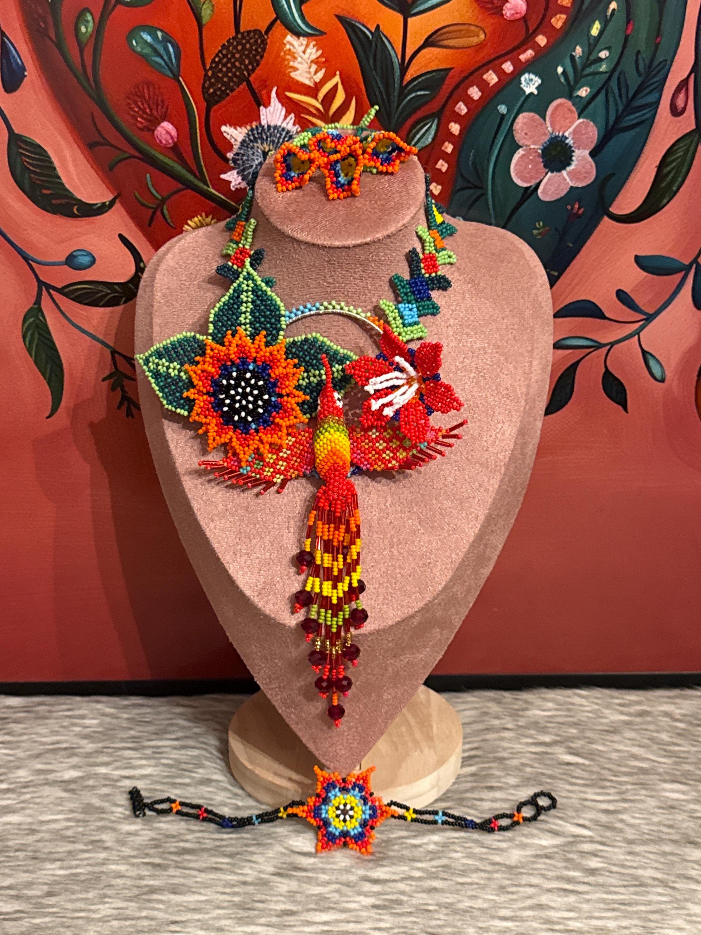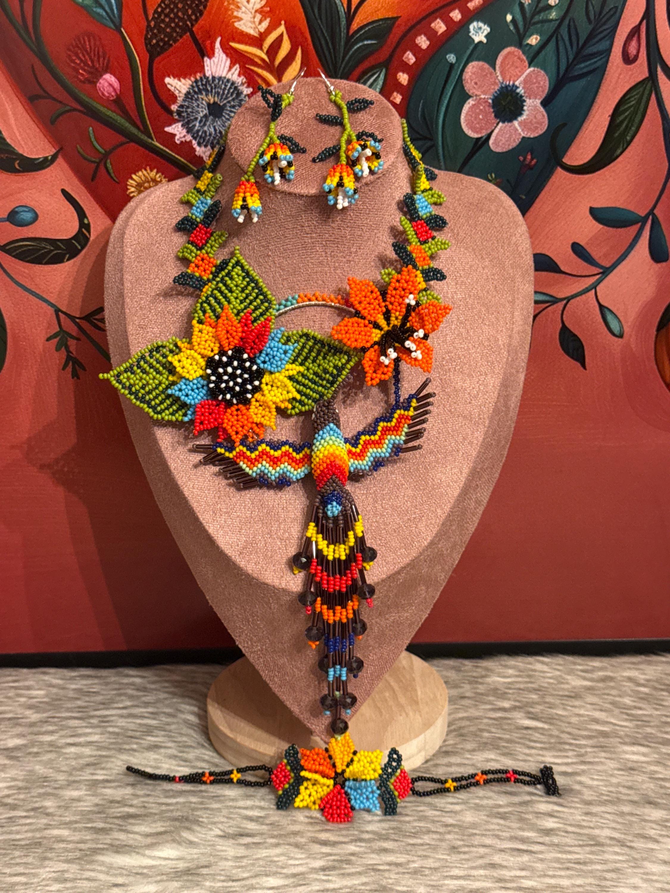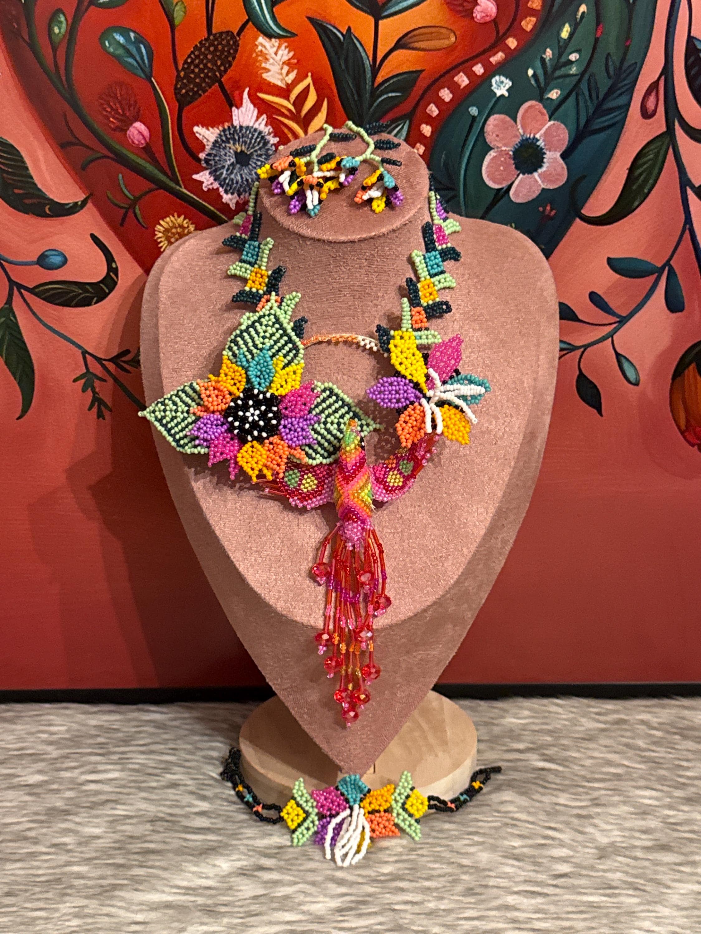 Hermoso set de collar,aretes y pulsera,inspirados en las flores y el colibri,hechos a mano por artesanos mexicanos.