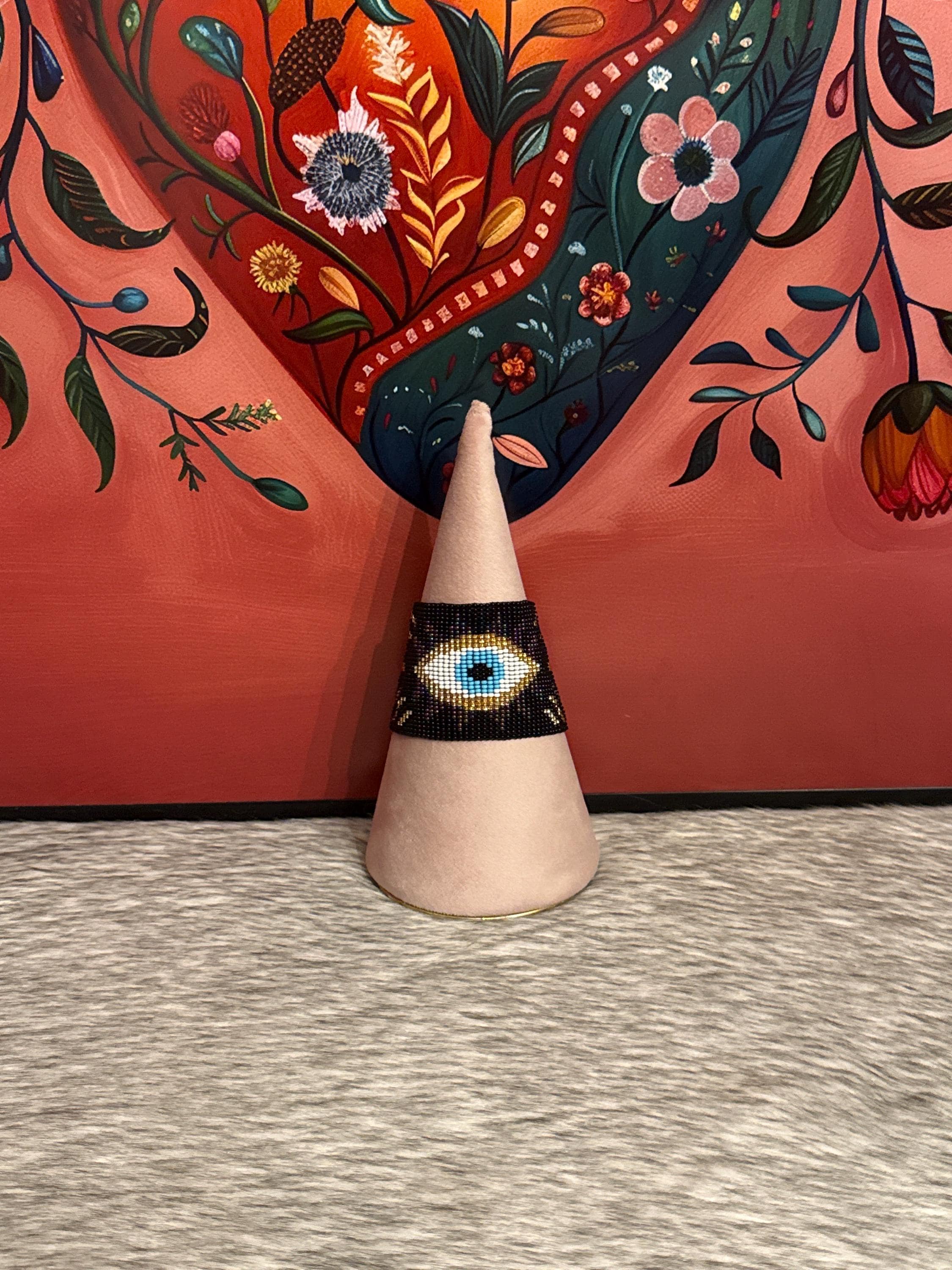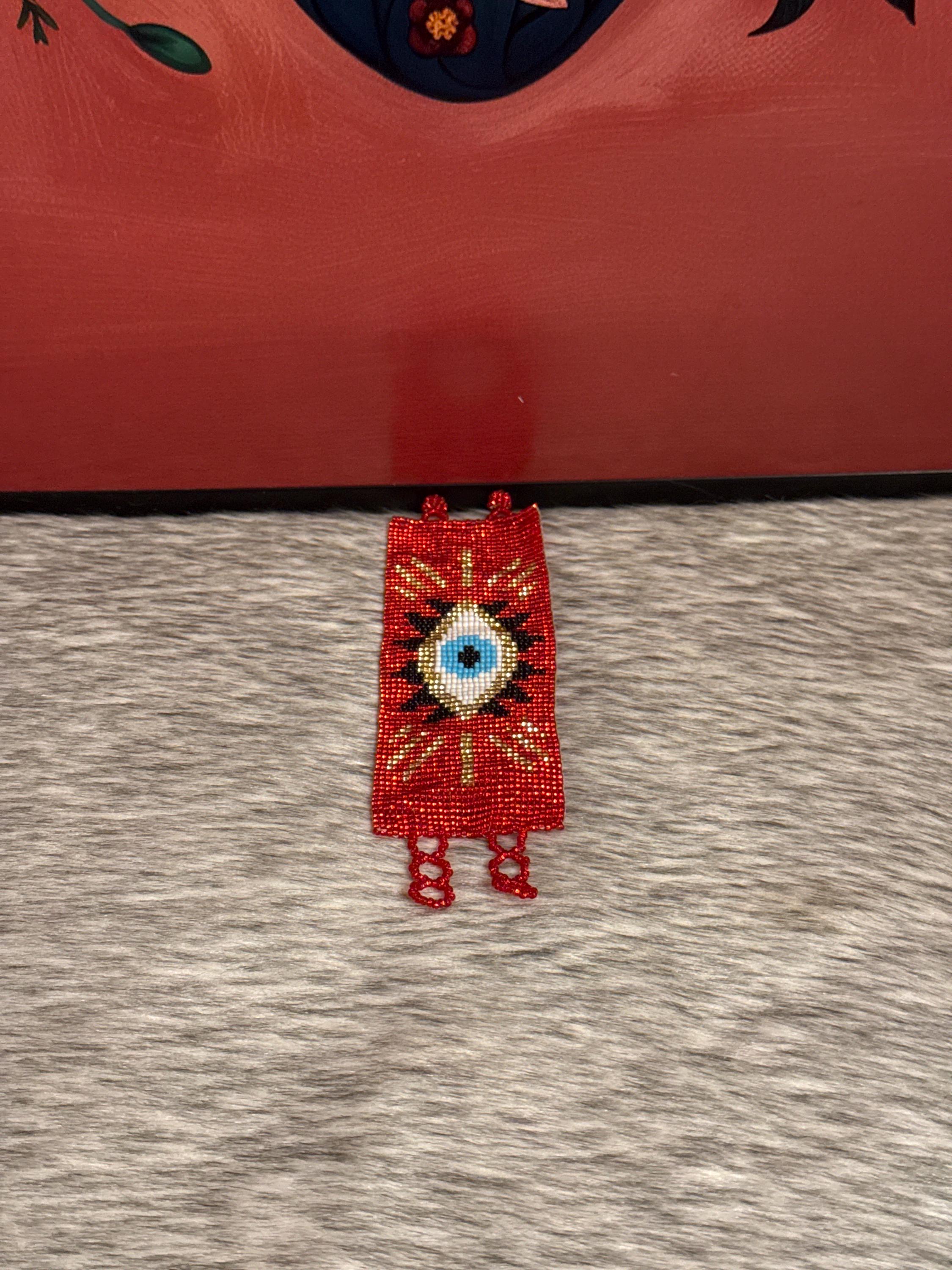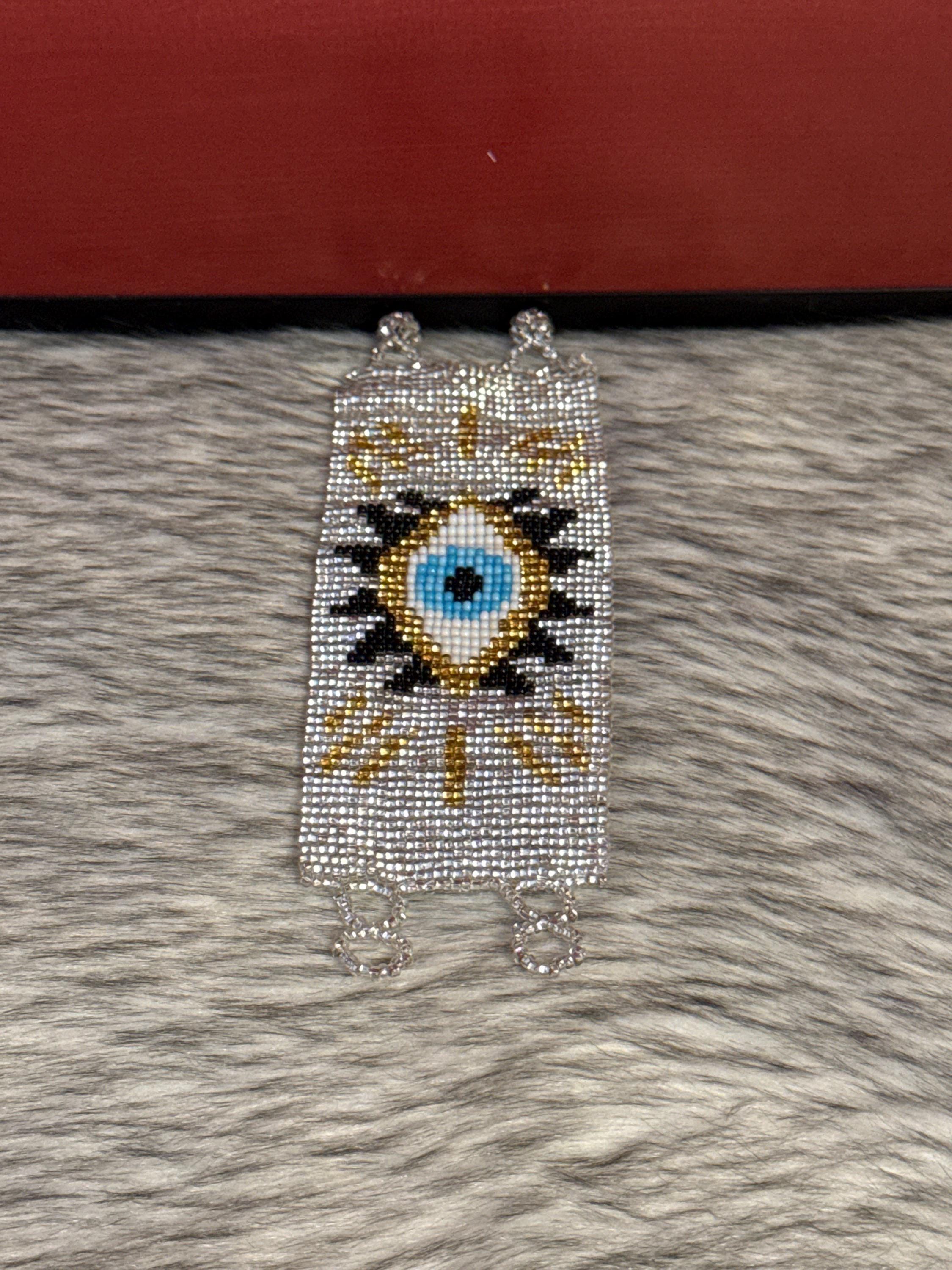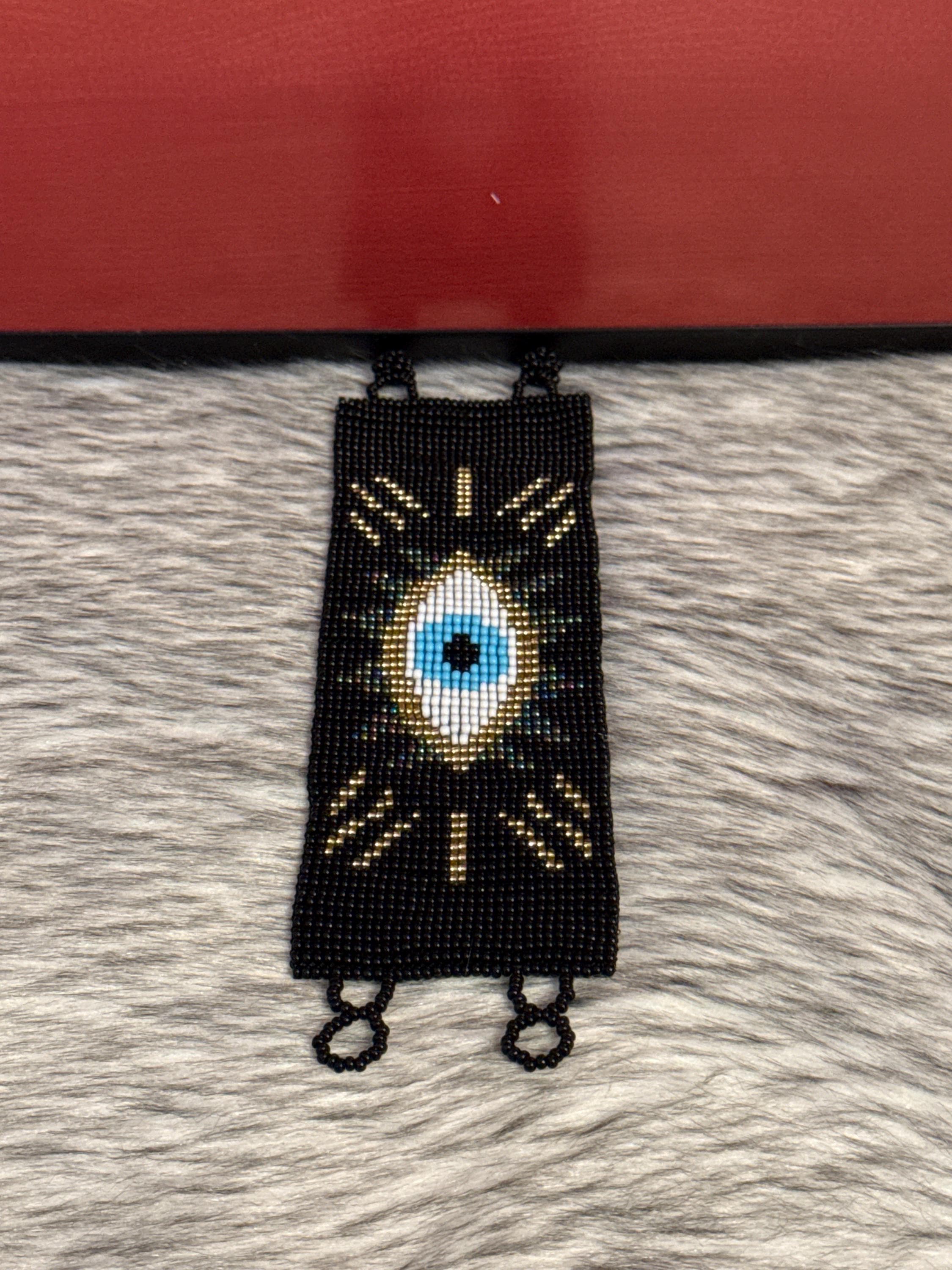 Beautiful bracelets made with a Turkish eye pattern, made with seed beads by Mexican artisans. The bracelets measure approximately 7 inches long by 2 inches wide.