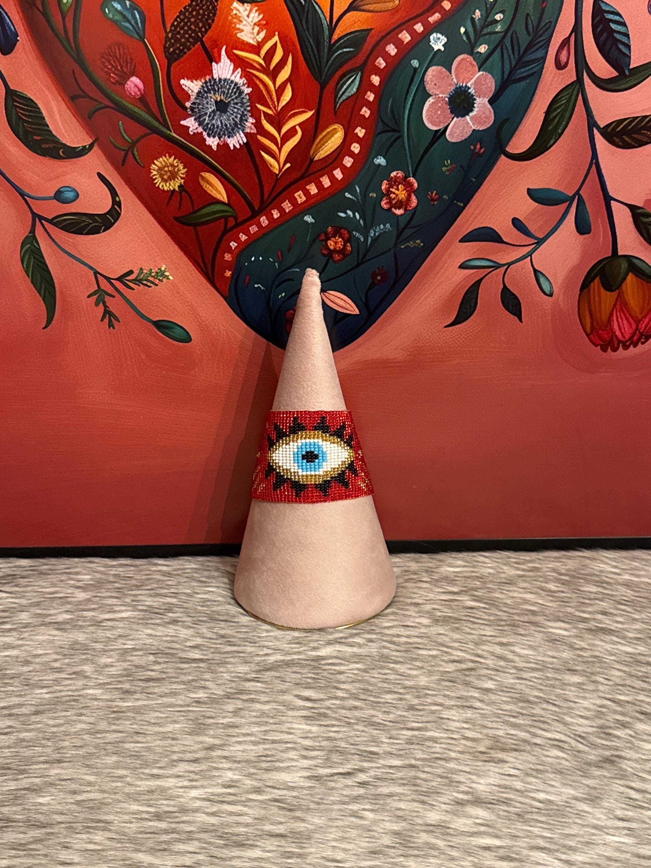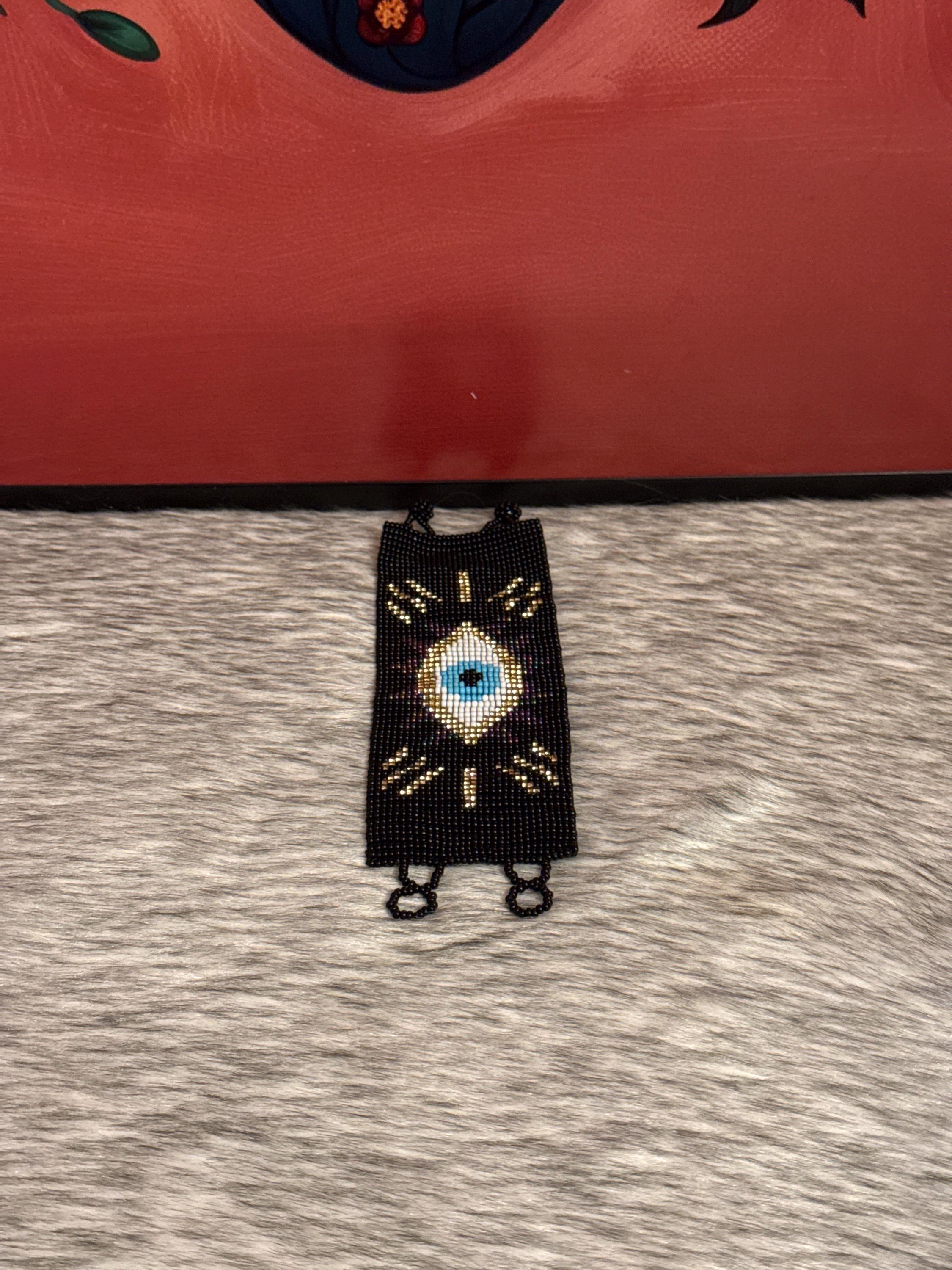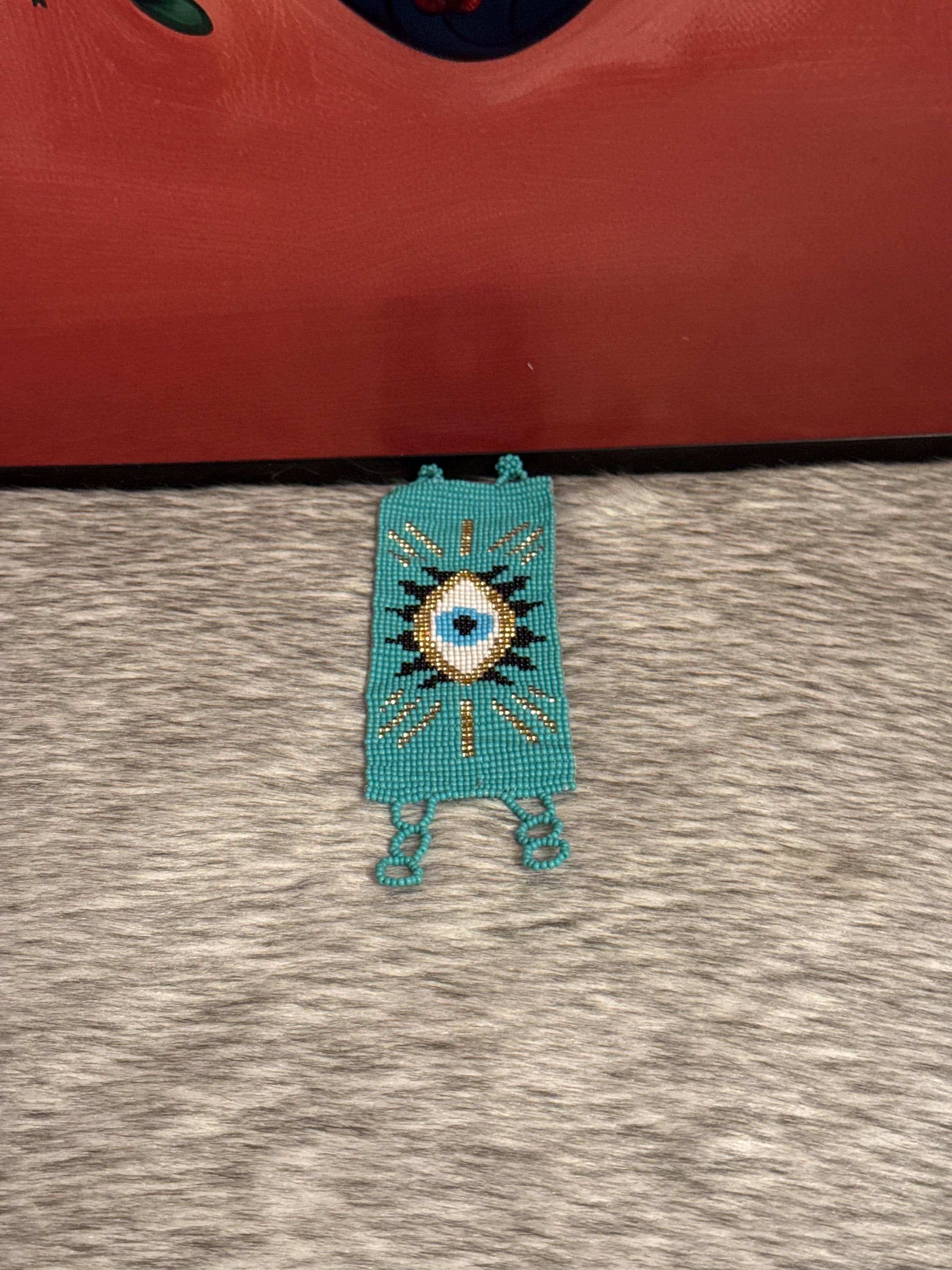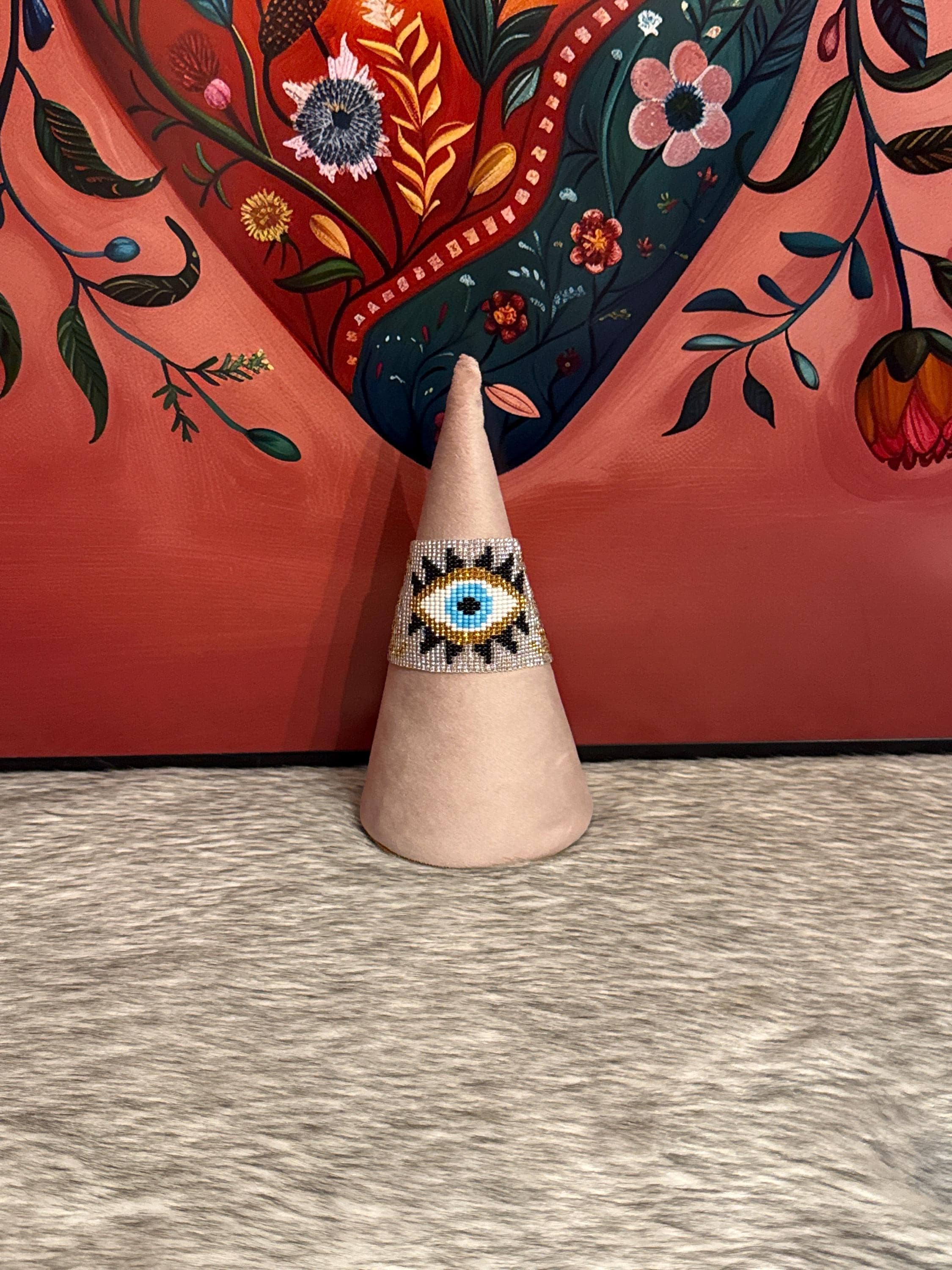 Beautiful bracelets made with a Turkish eye pattern, made with seed beads by Mexican artisans. The bracelets measure approximately 7 inches long by 2 inches wide.