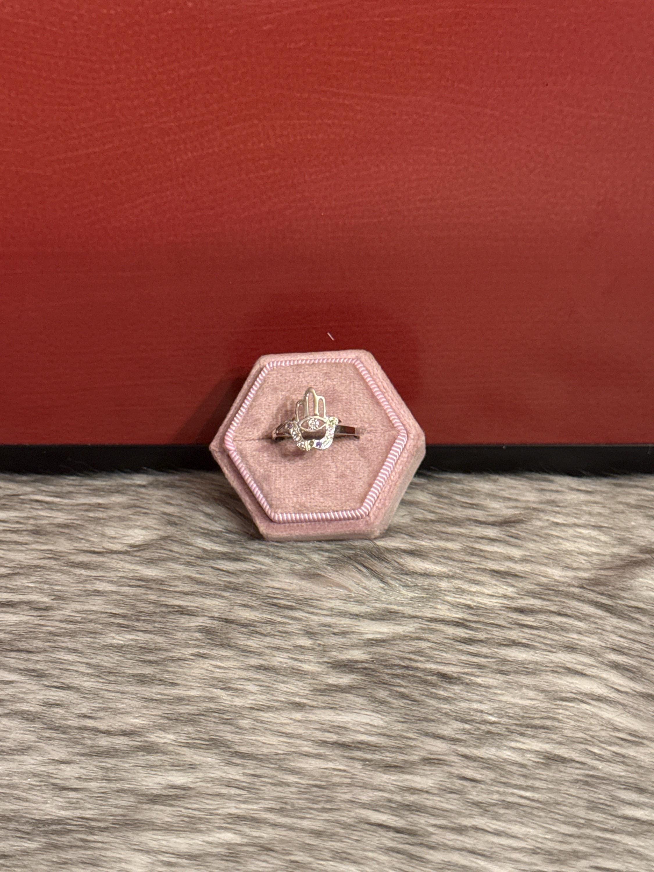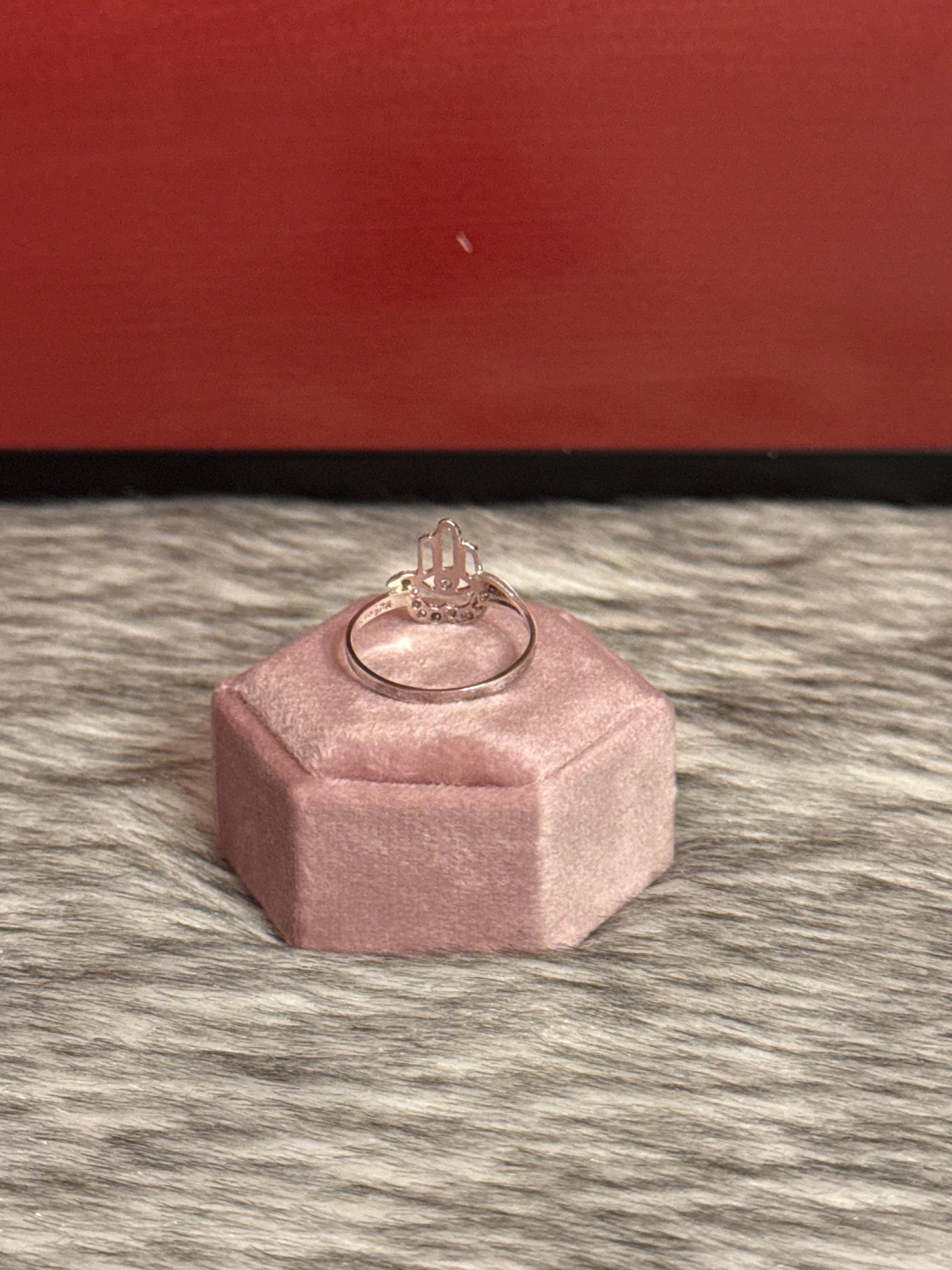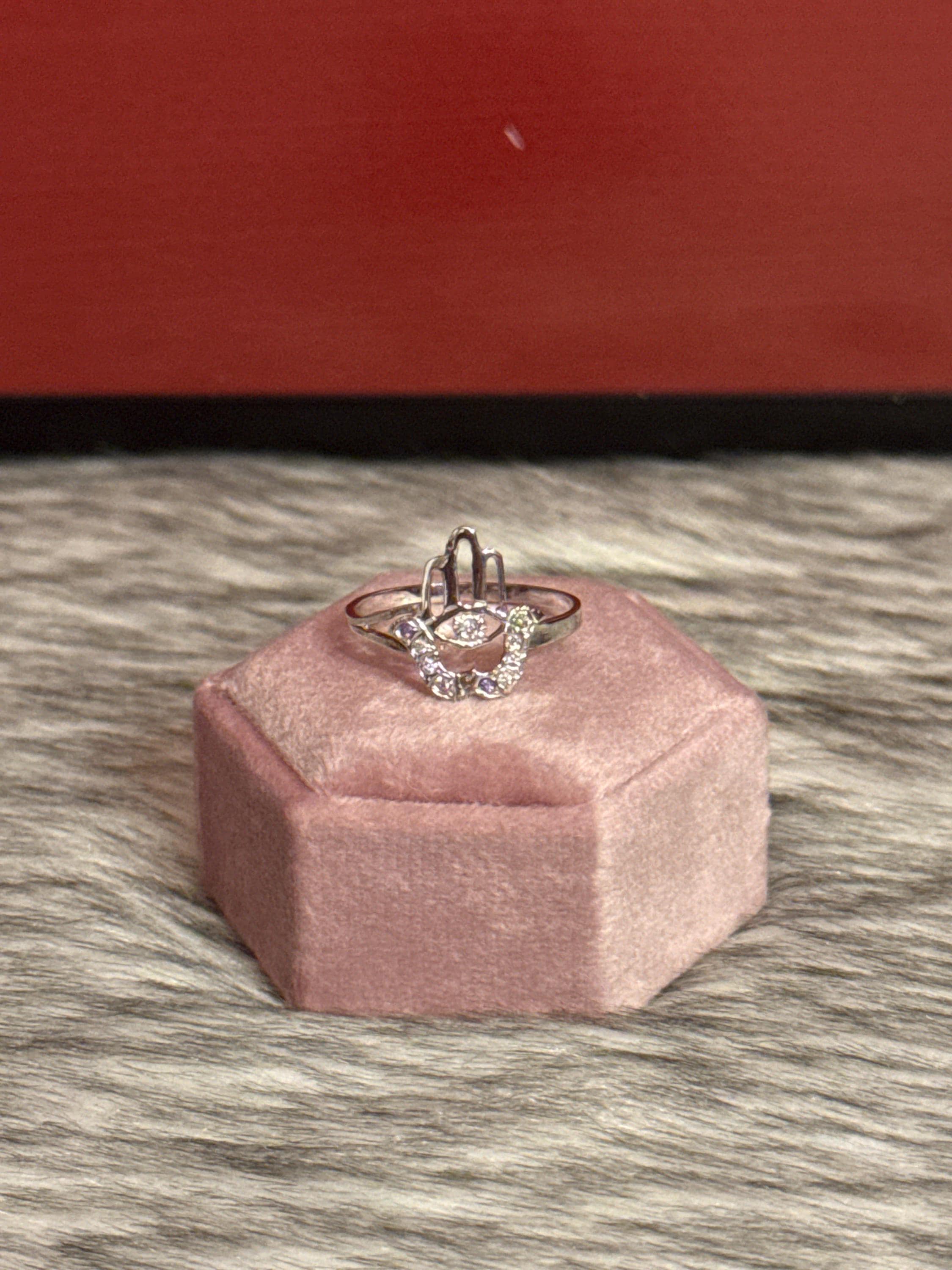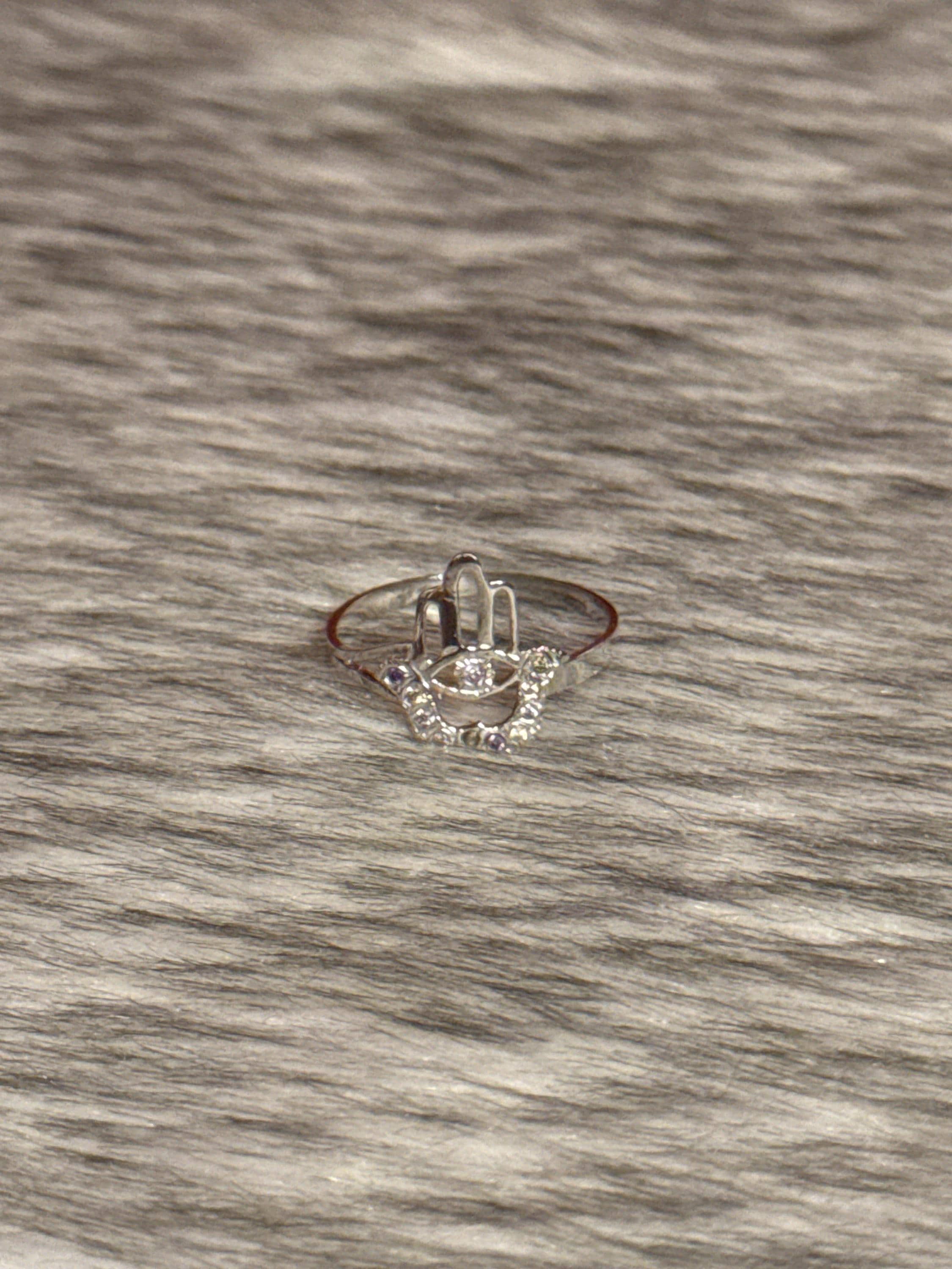 Beautiful Fatima's Hand or Hamsa ring made of 925 sterling silver and cubic zirconia. The ring is size 7.5.
