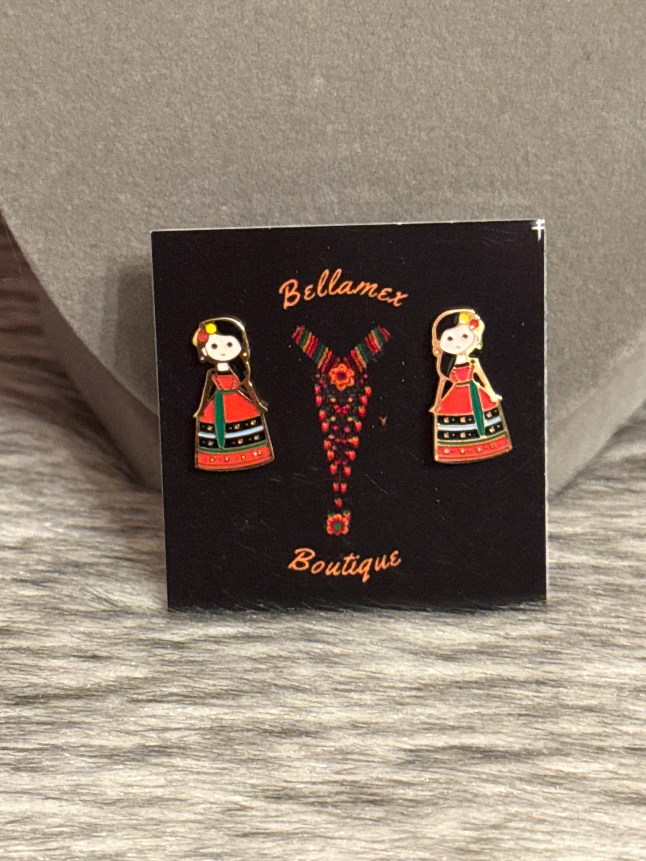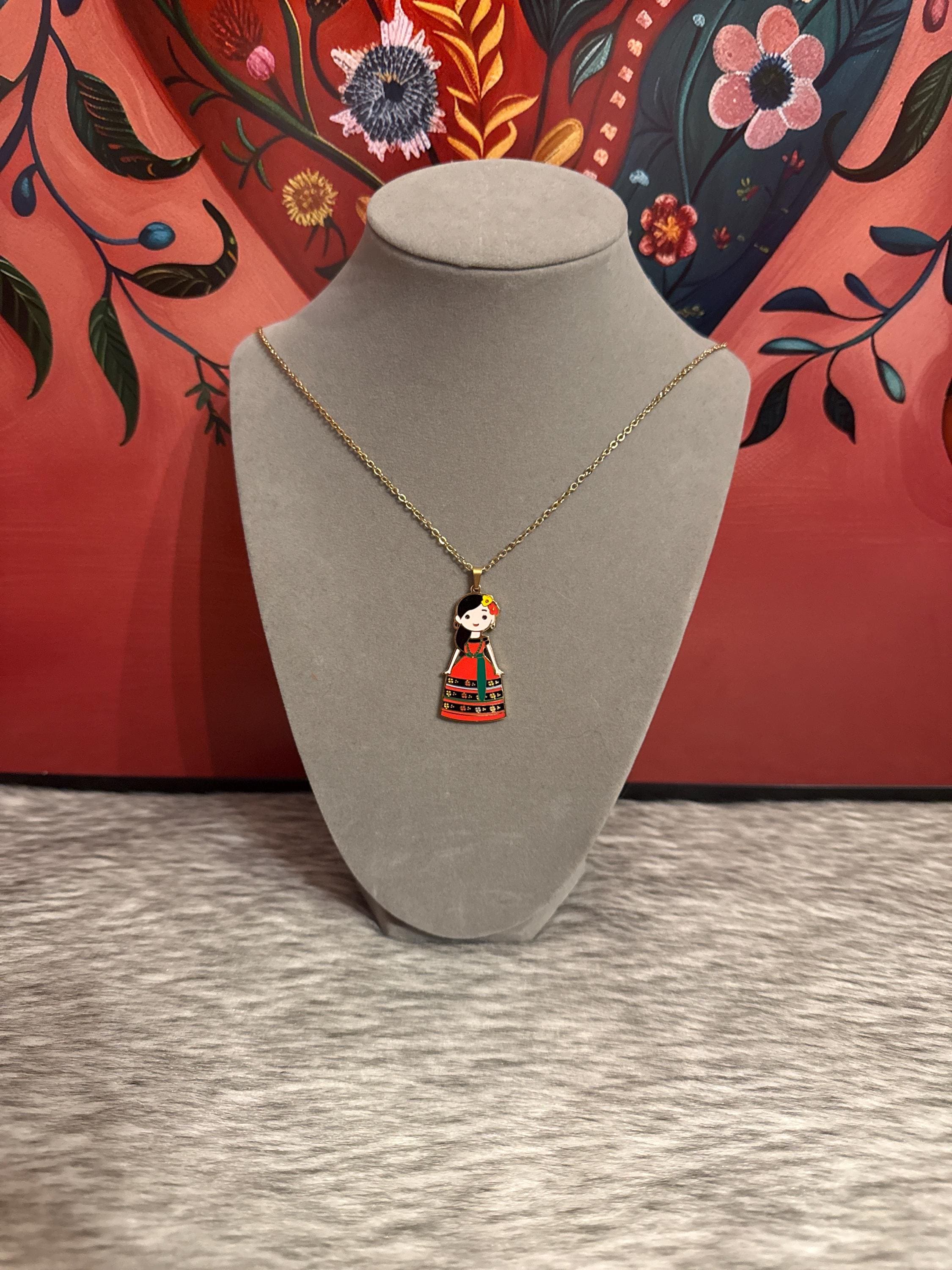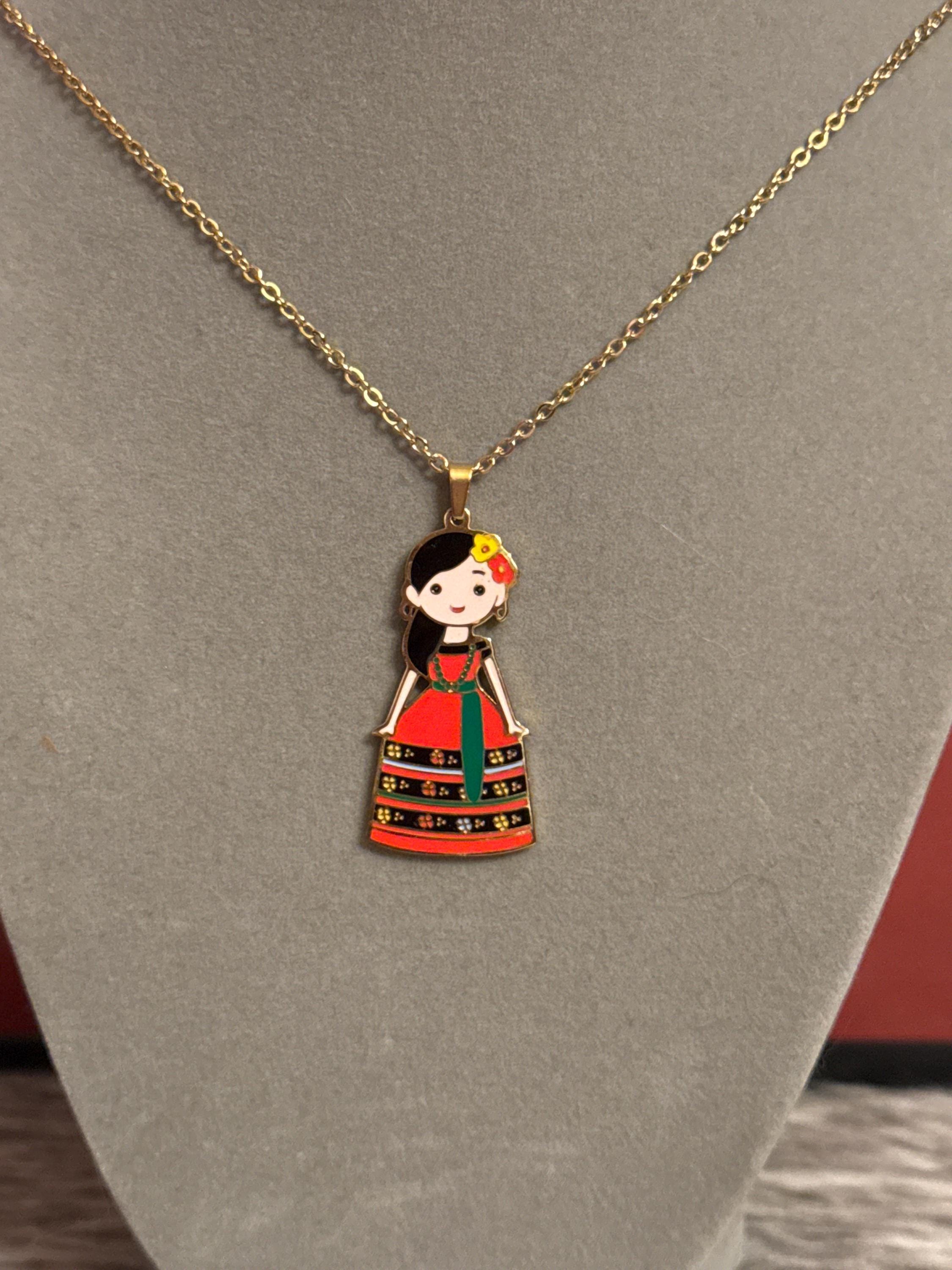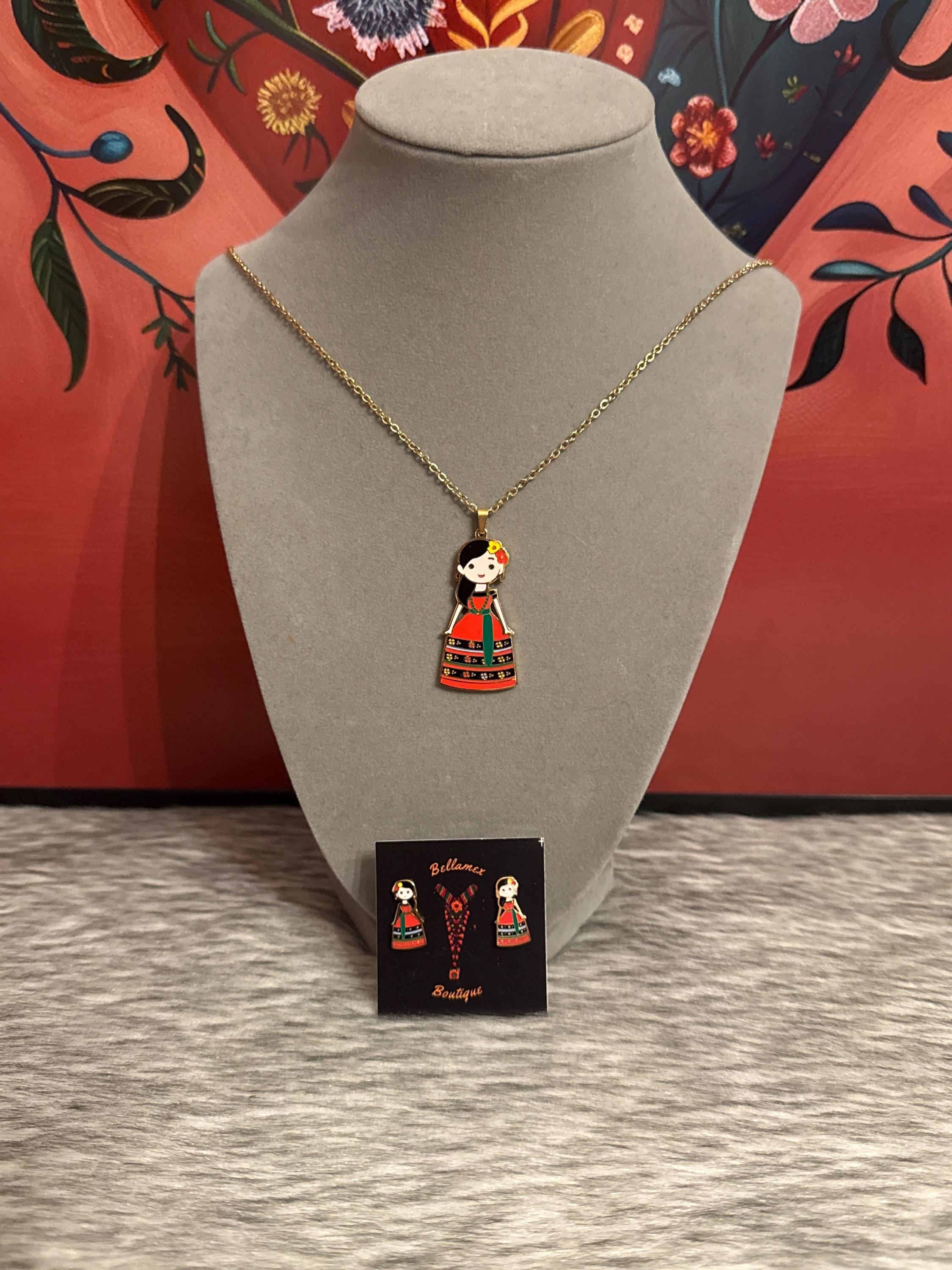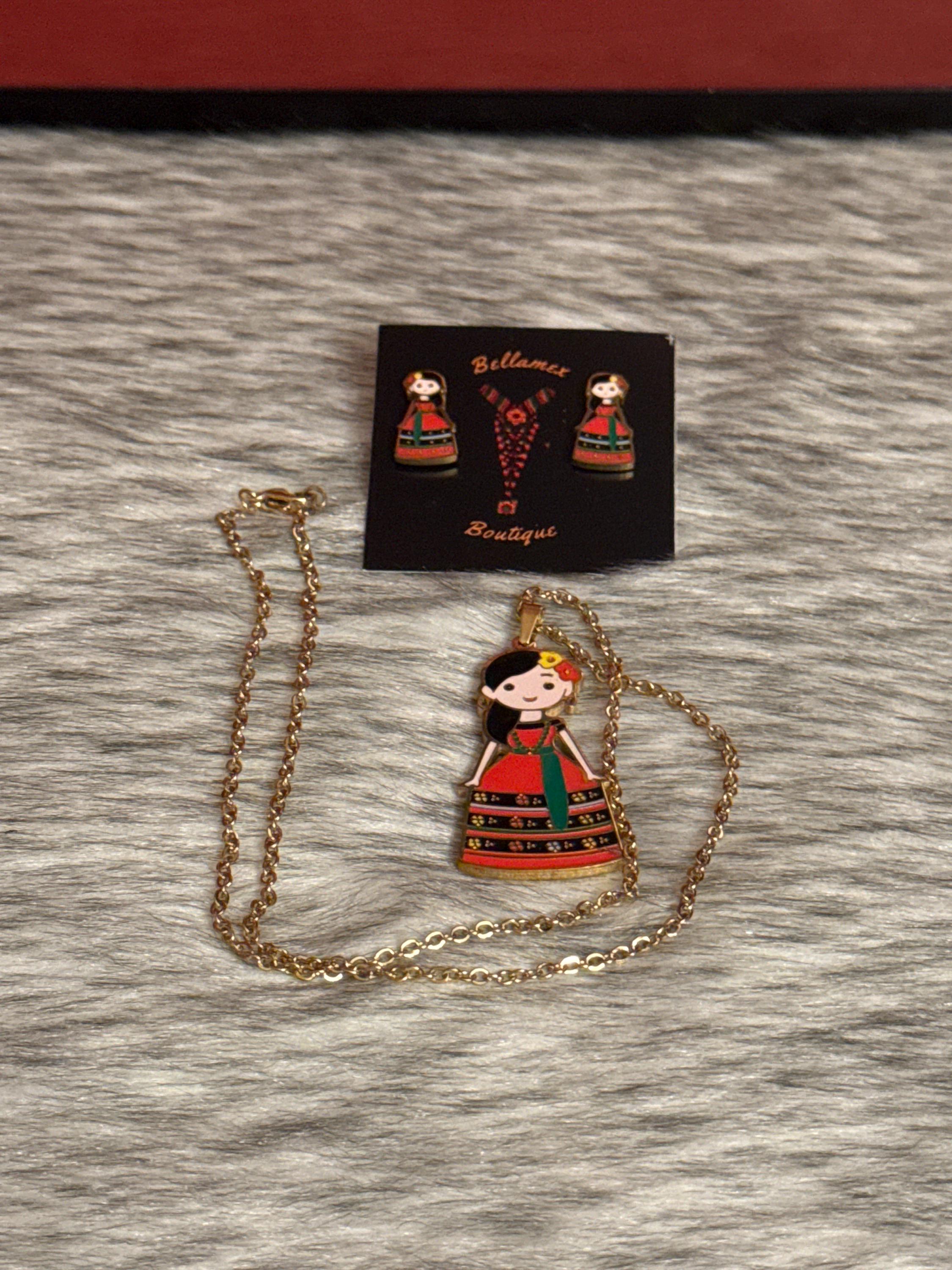 Mexican doll pendant necklace in gold-colored stainless steel. Includes earrings. The necklace measures approximately 17 inches long.