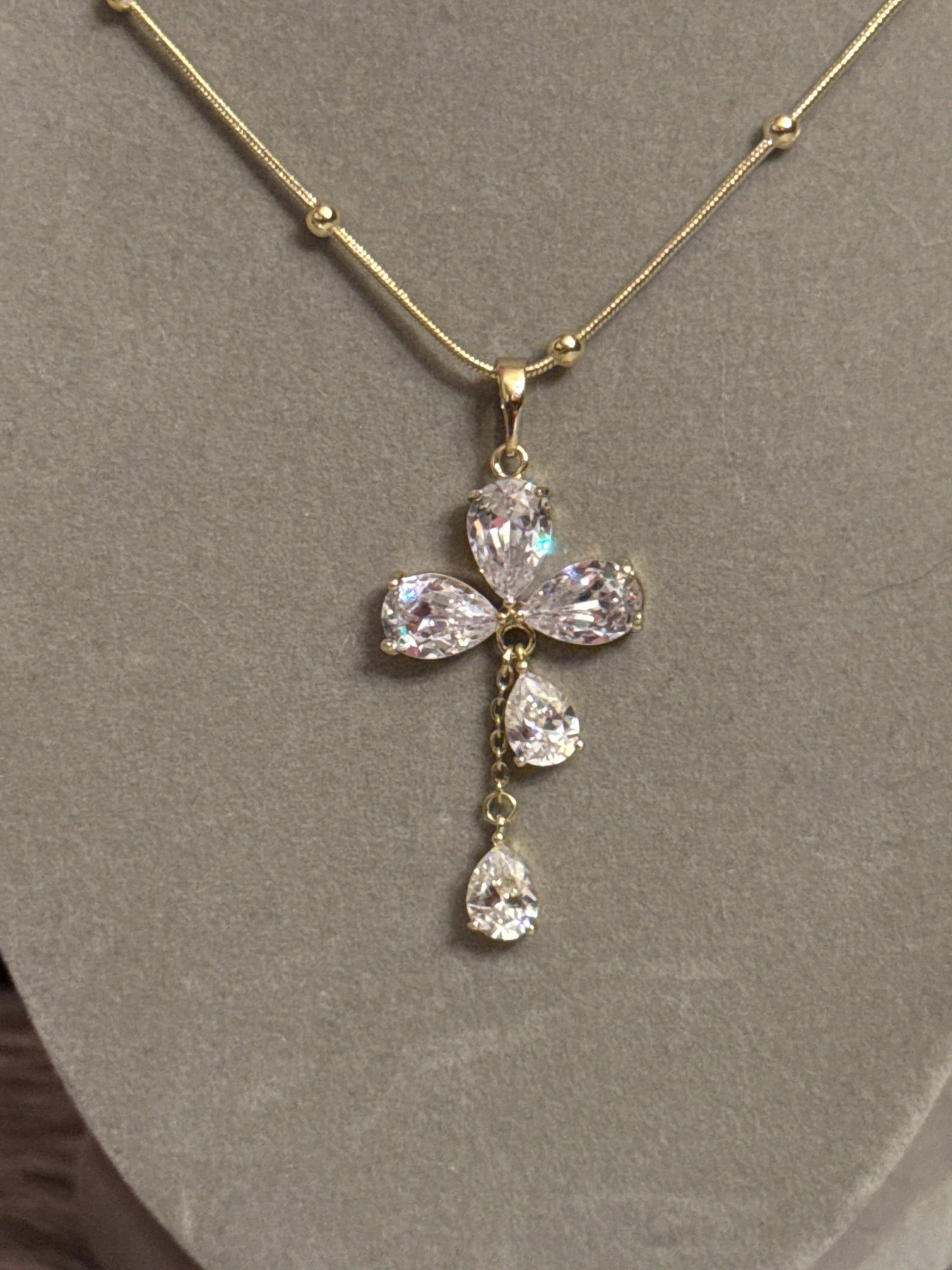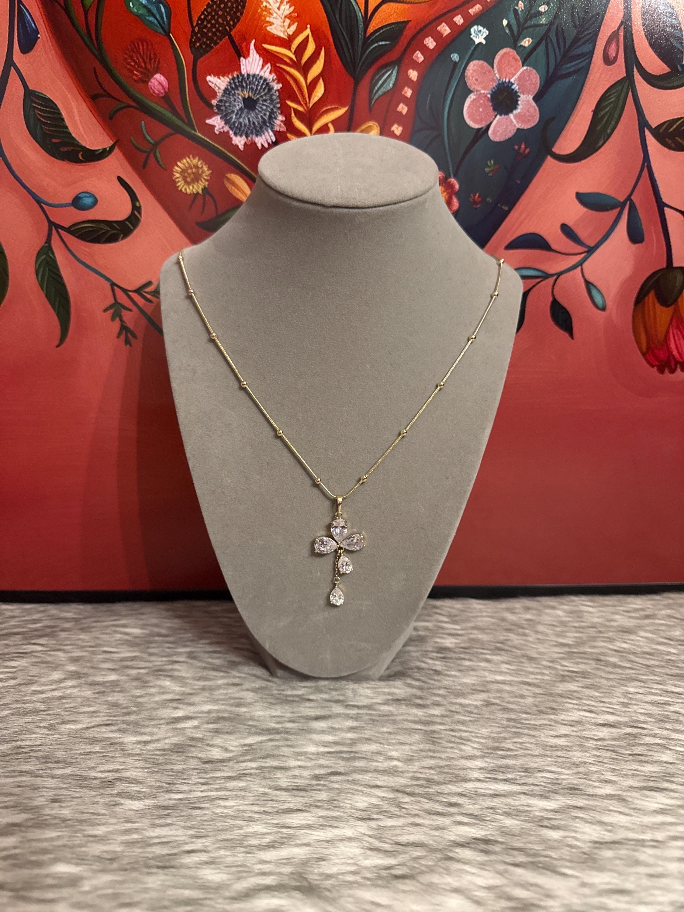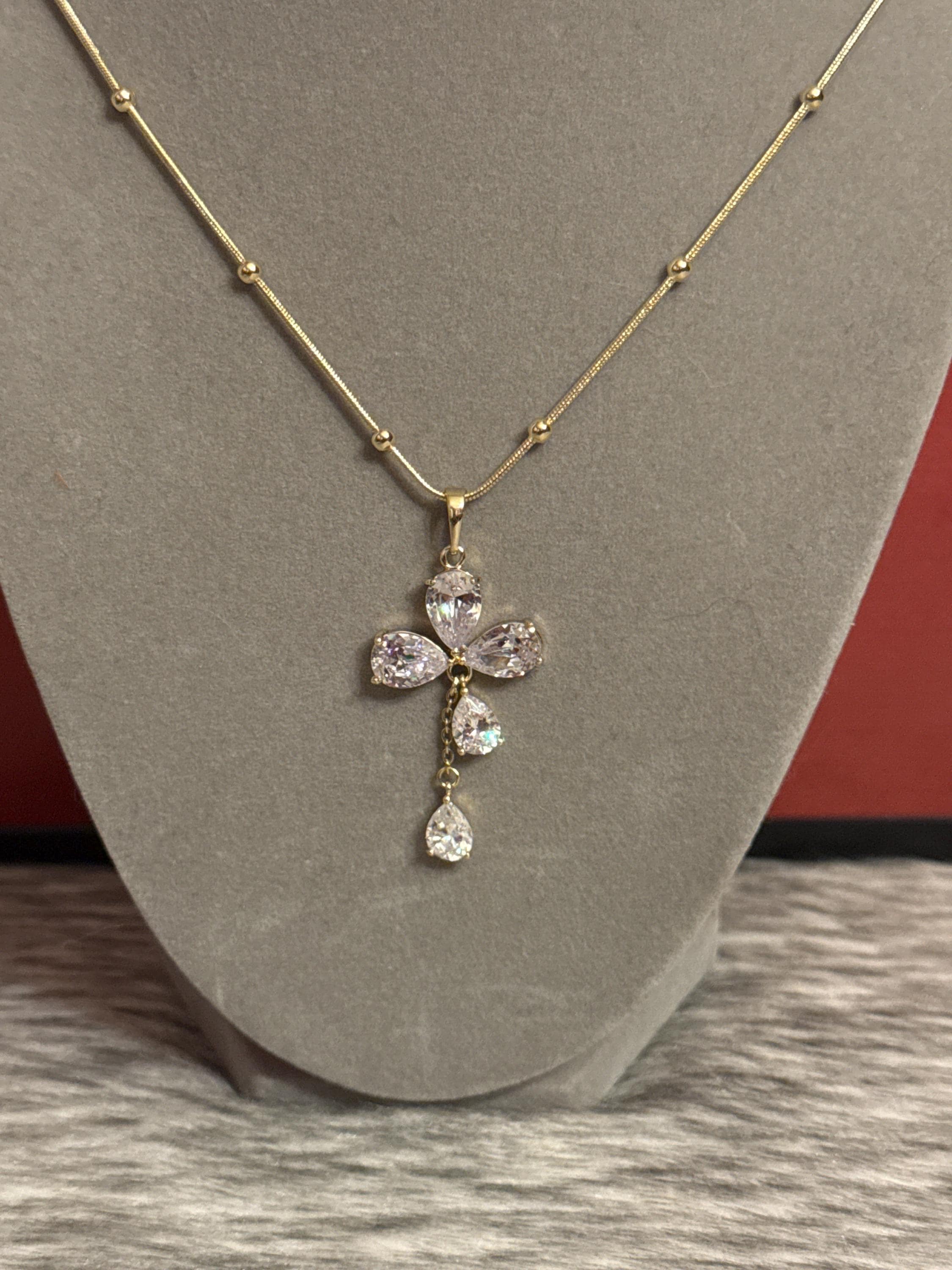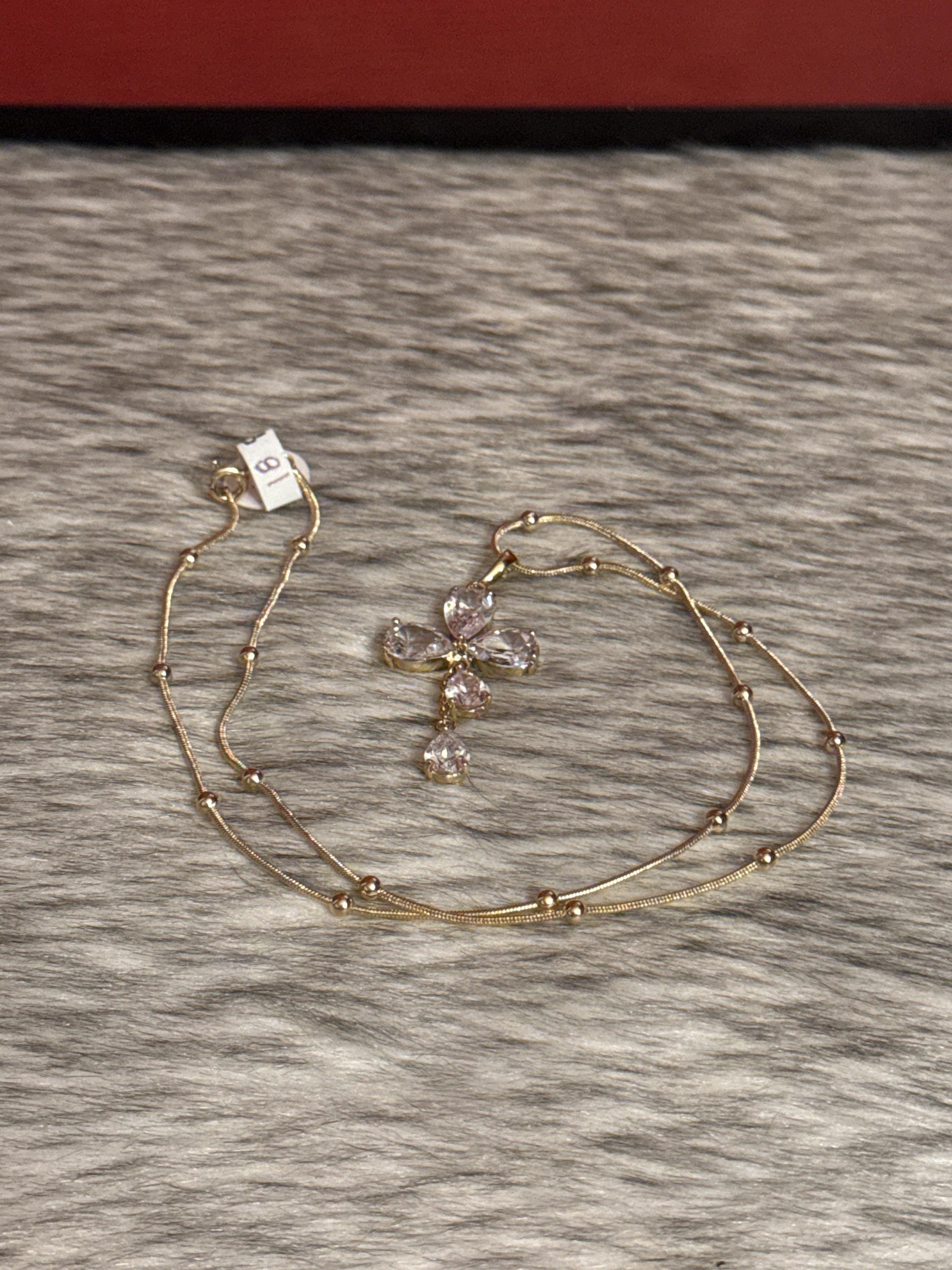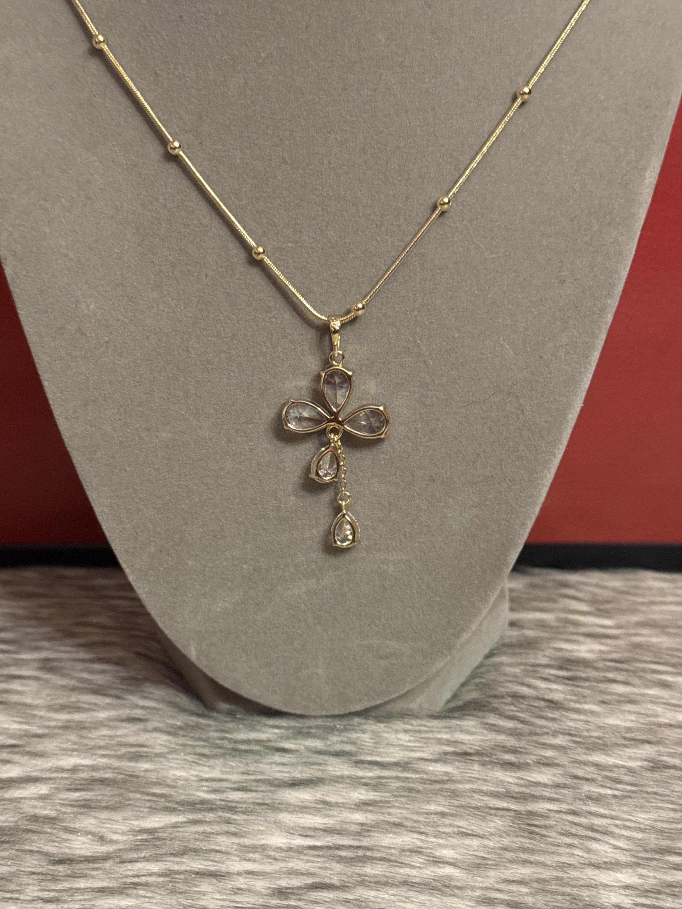 Beautiful necklace with flower pendant in 14k gold plated and cubic zirconia stones, the chain measures approximately 18 inches long.
