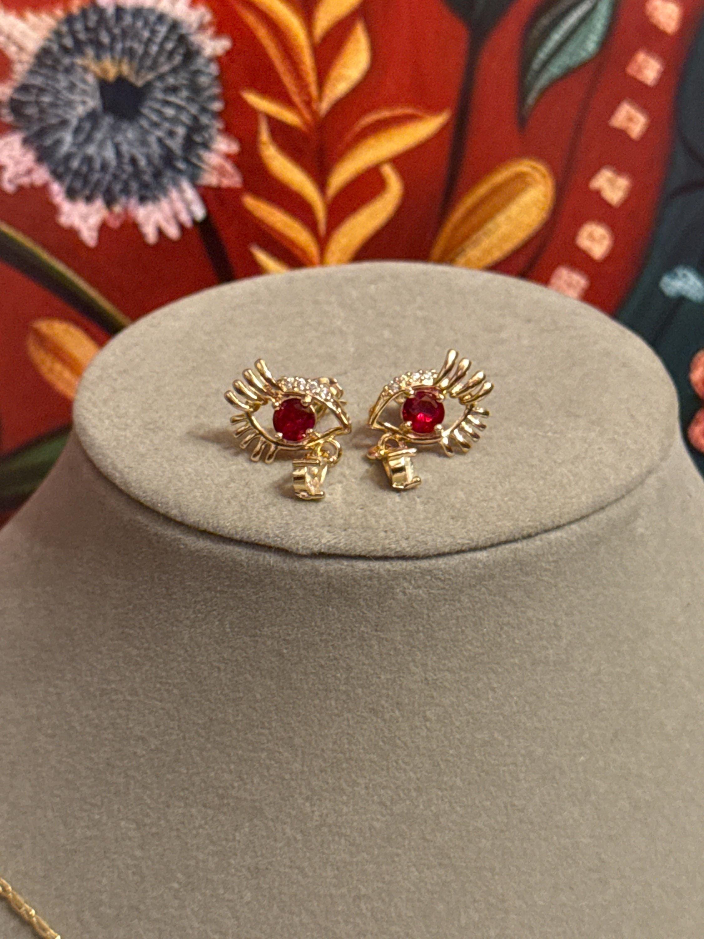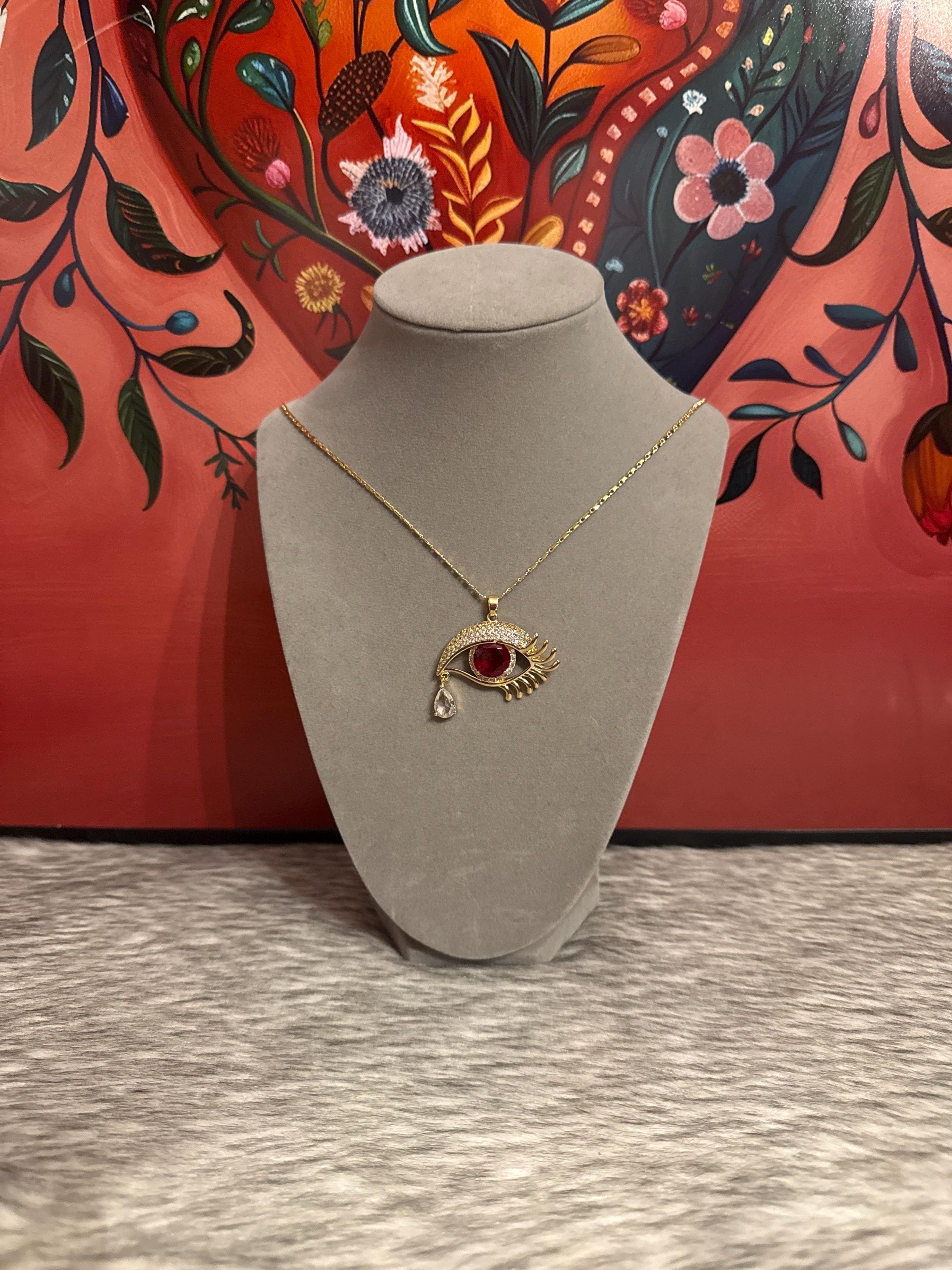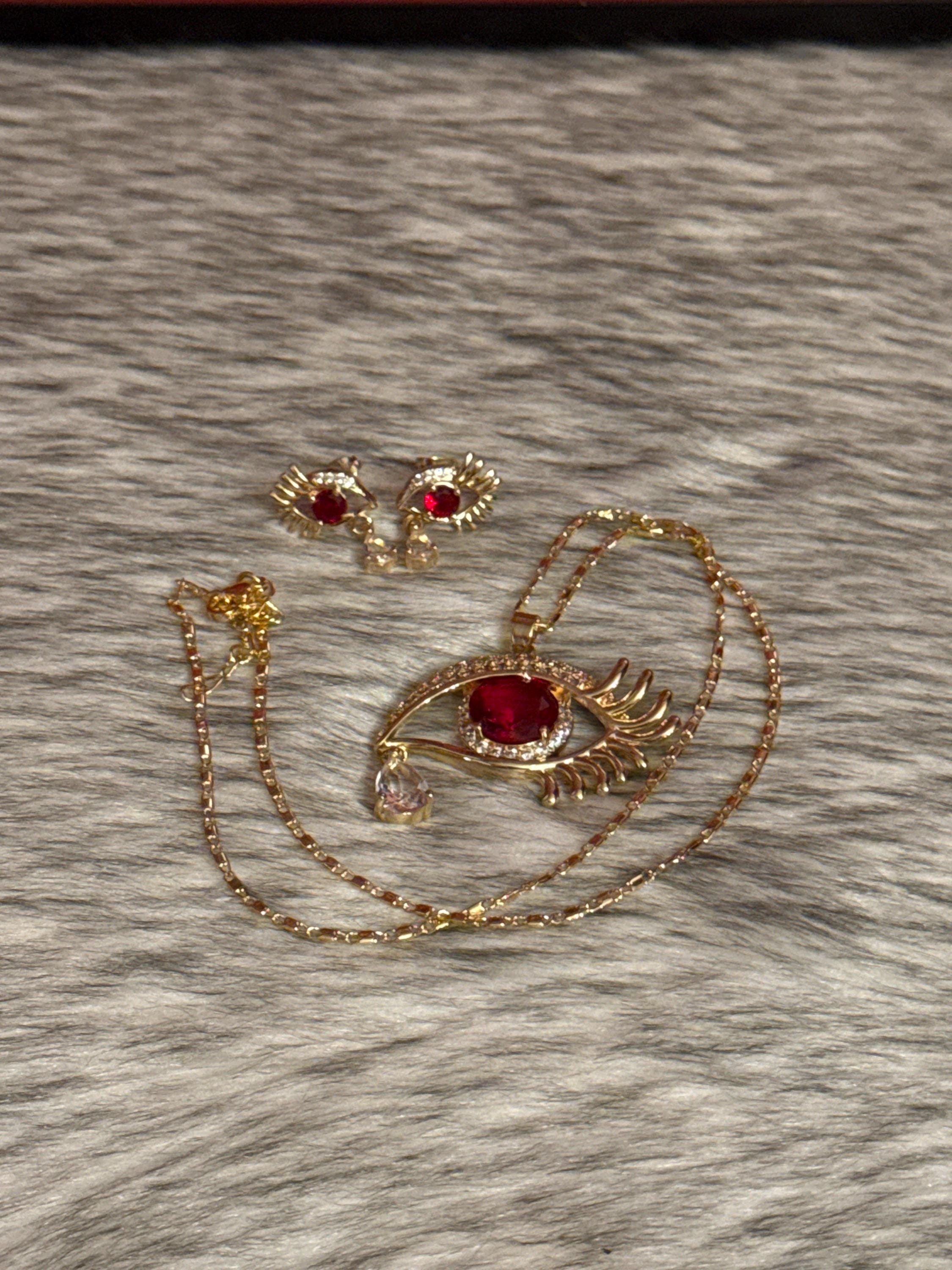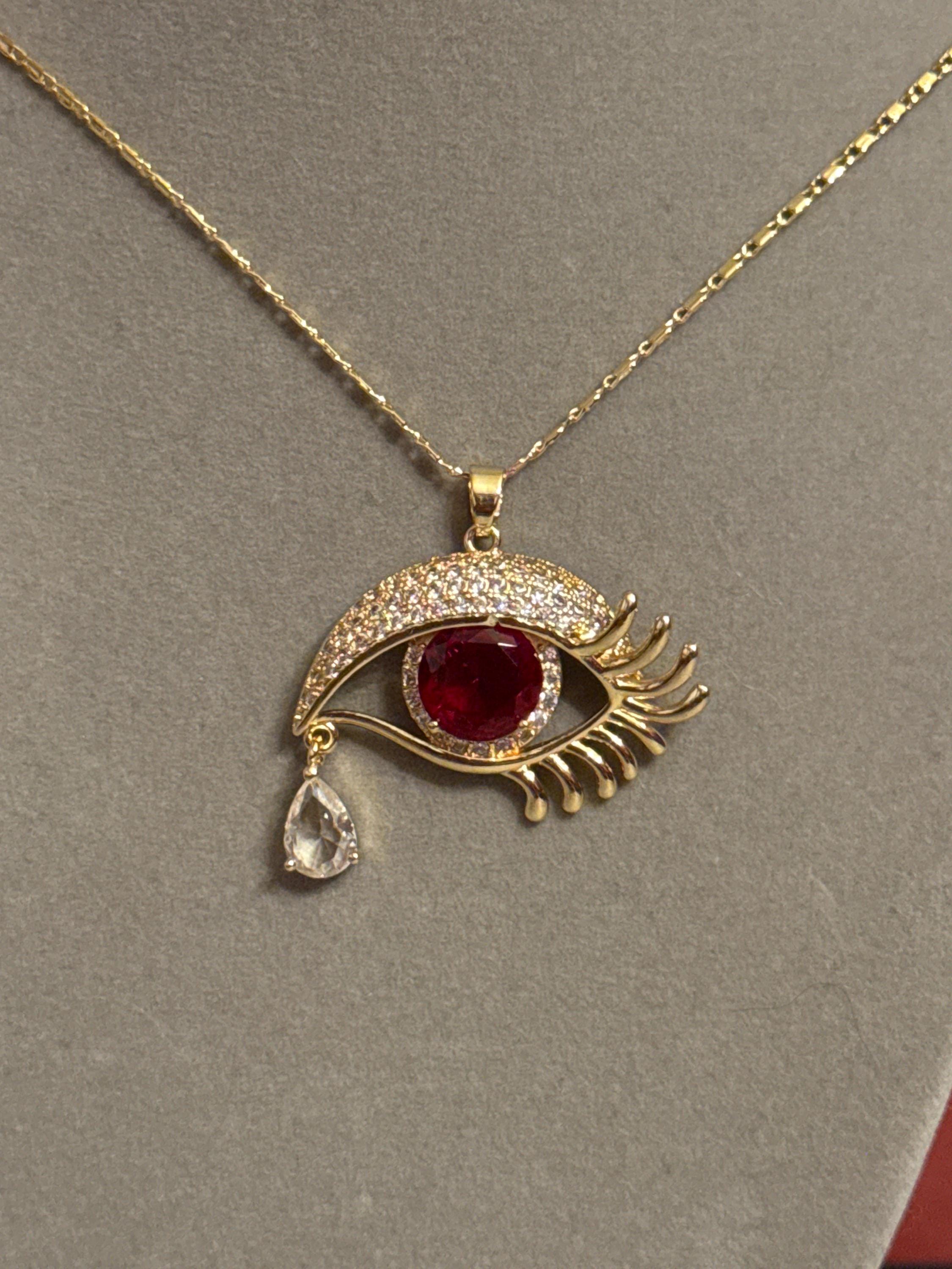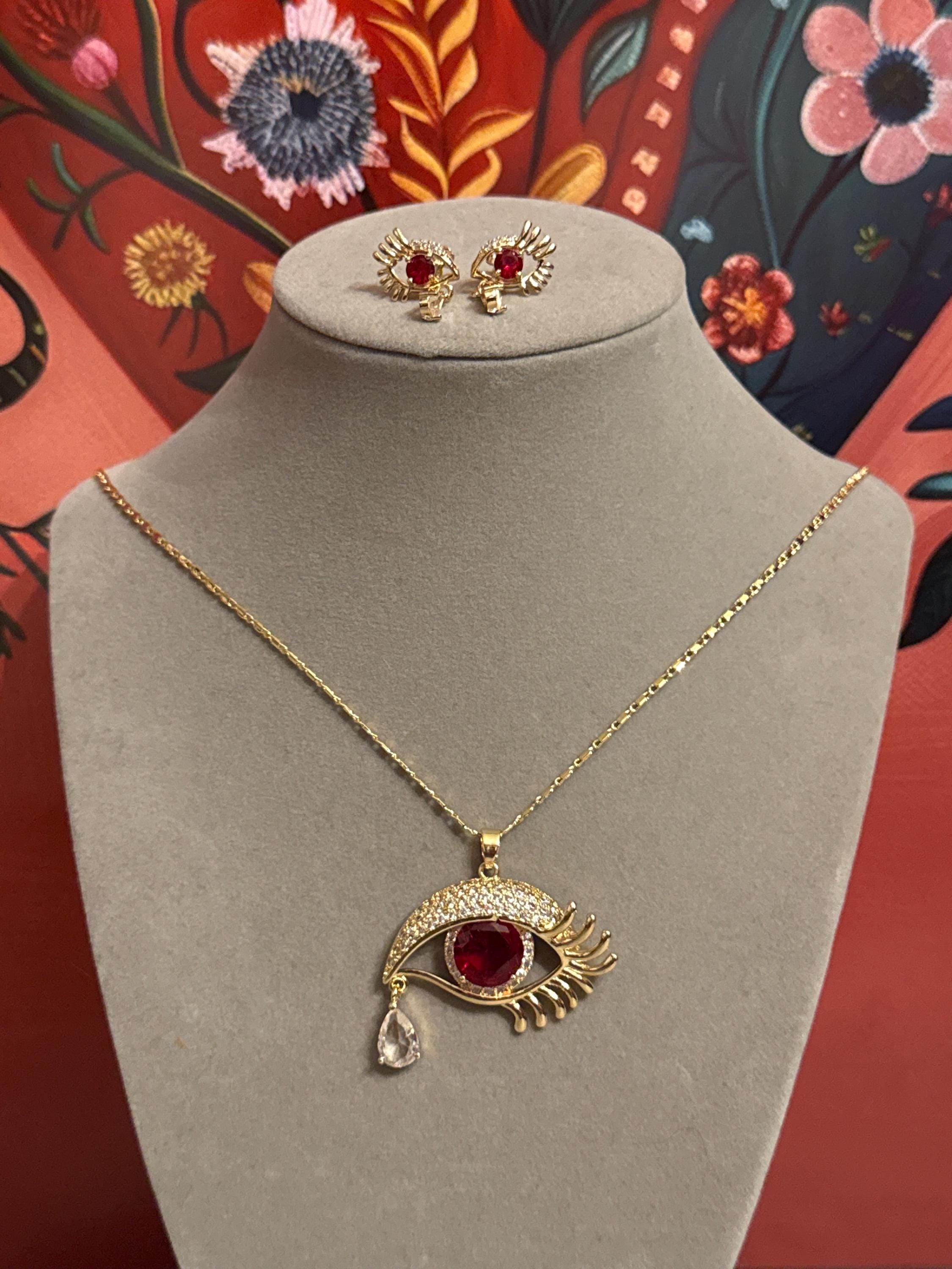 Beautiful necklace with eye pendant in 14k gold plated and cubic zirconia stones, the chain measures approximately 17 inches long and includes earrings.