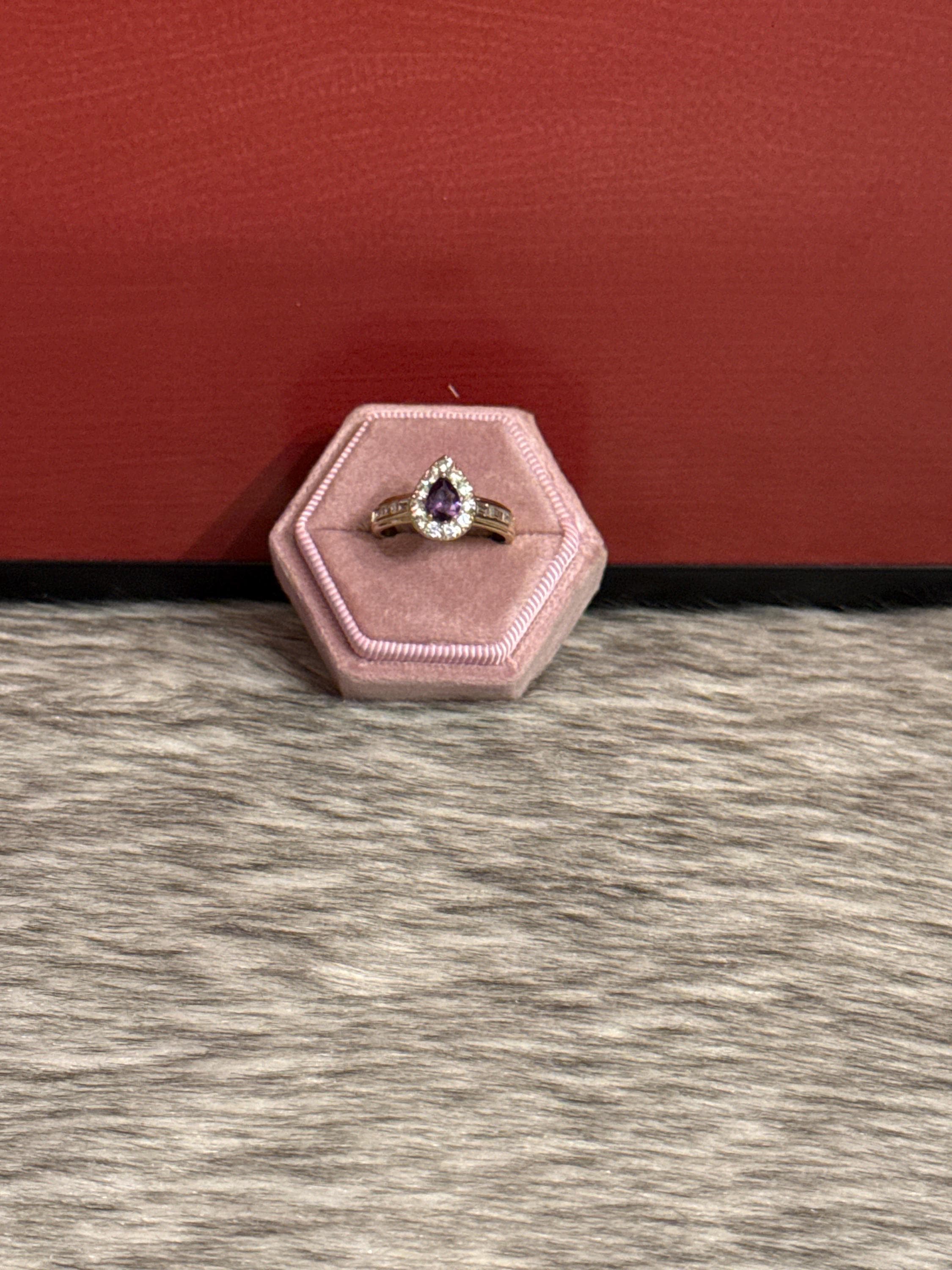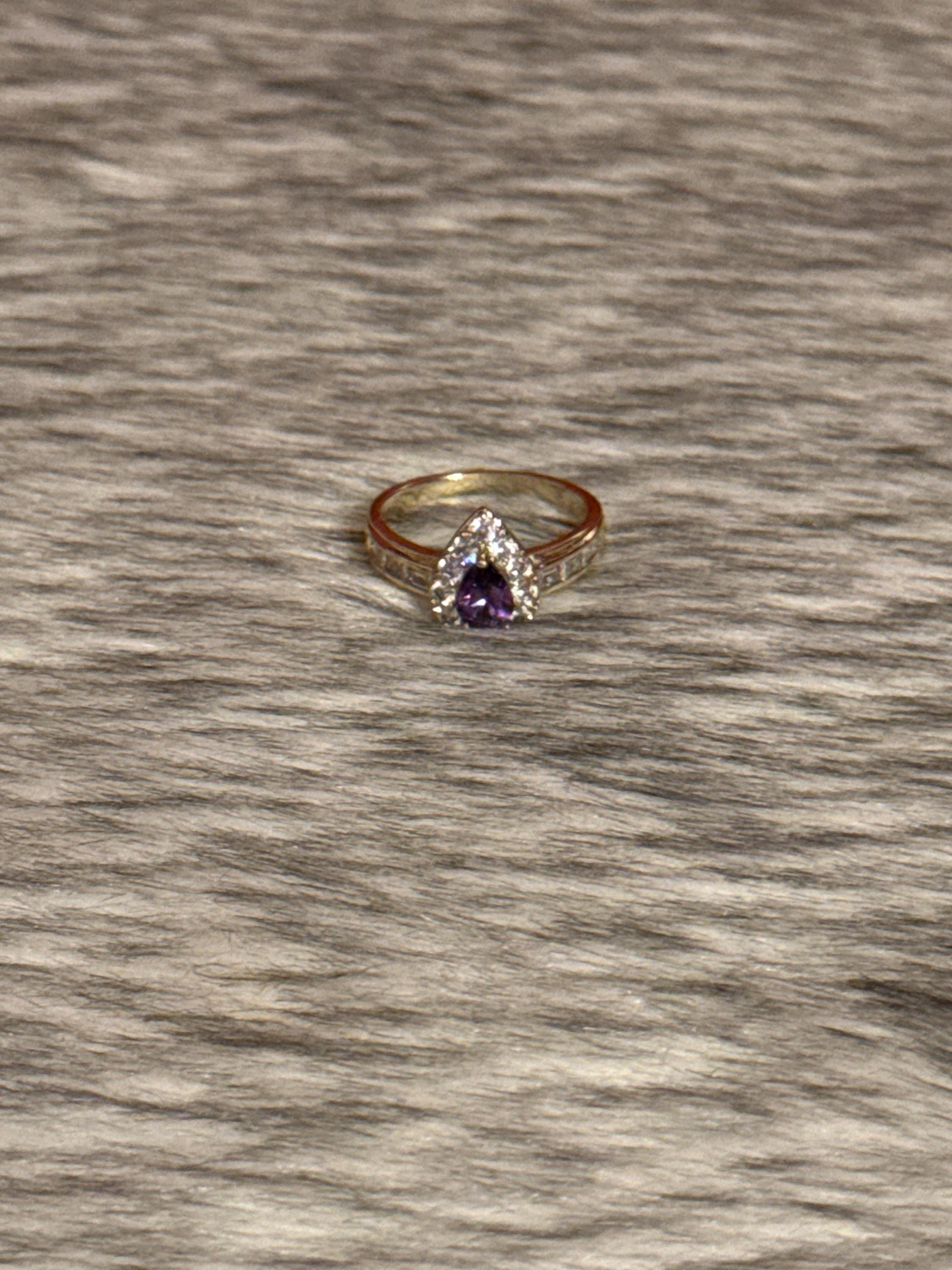 Promise or commitment ring with zirconias and crystals in shades of purple and white, made in 14k gold plated, available in adjustable size 8.