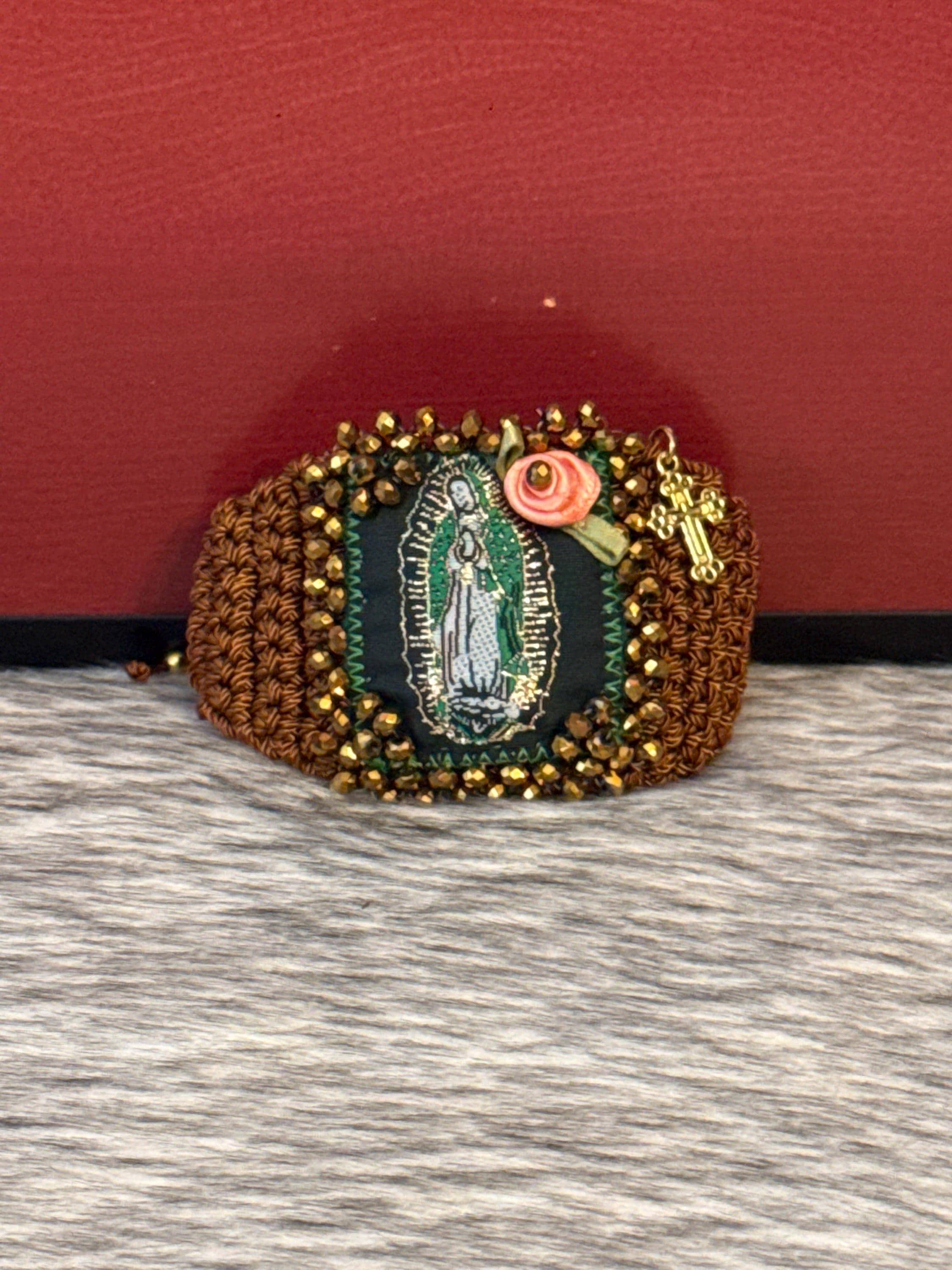 Beautiful adjustable macrame-style bracelet, made with cotton thread and an image of the Virgin of Guadalupe decorated with crystals. To ensure your bracelet lasts a long time, we recommend avoiding getting it wet and storing it in a cool, dry place.