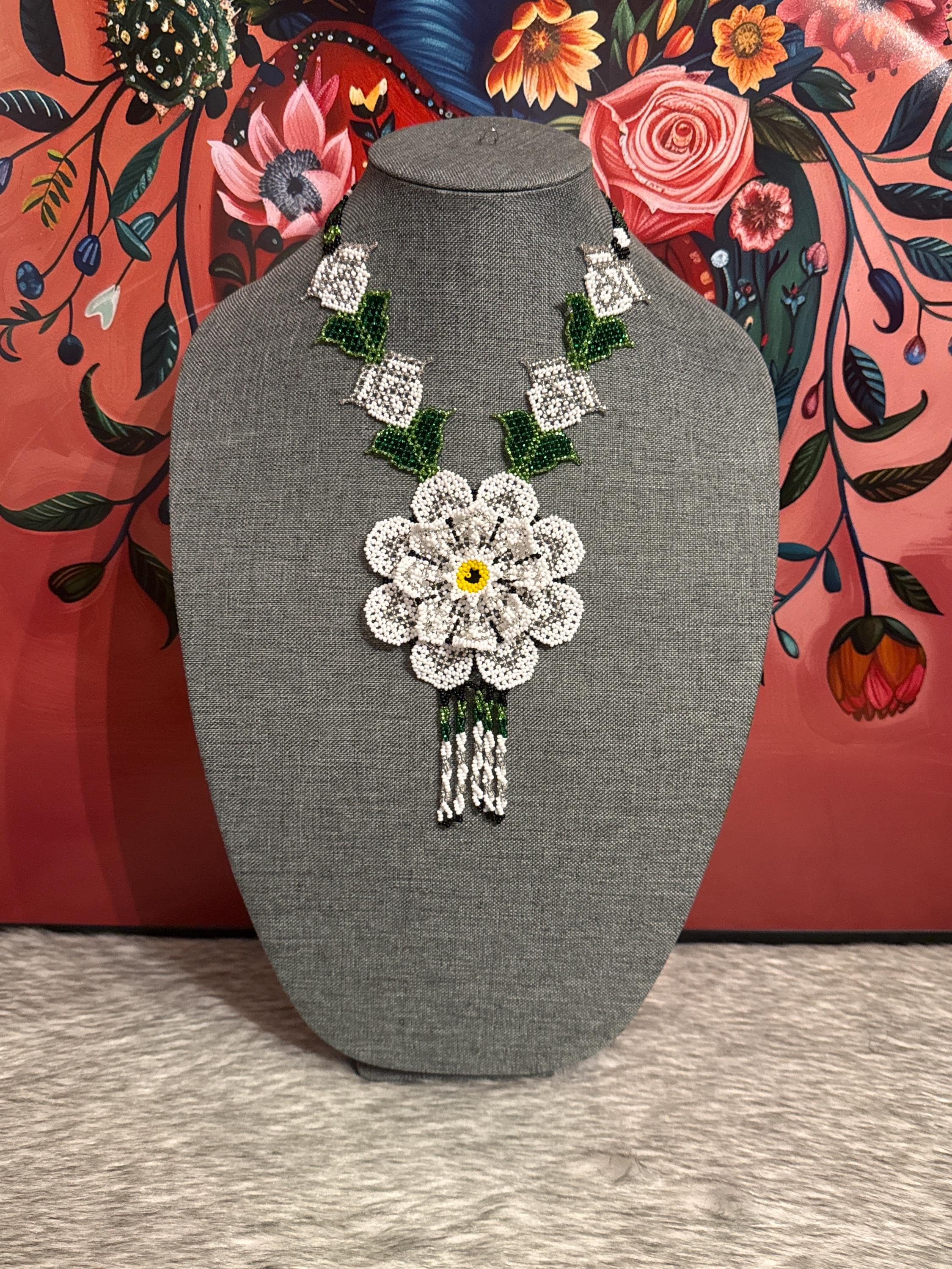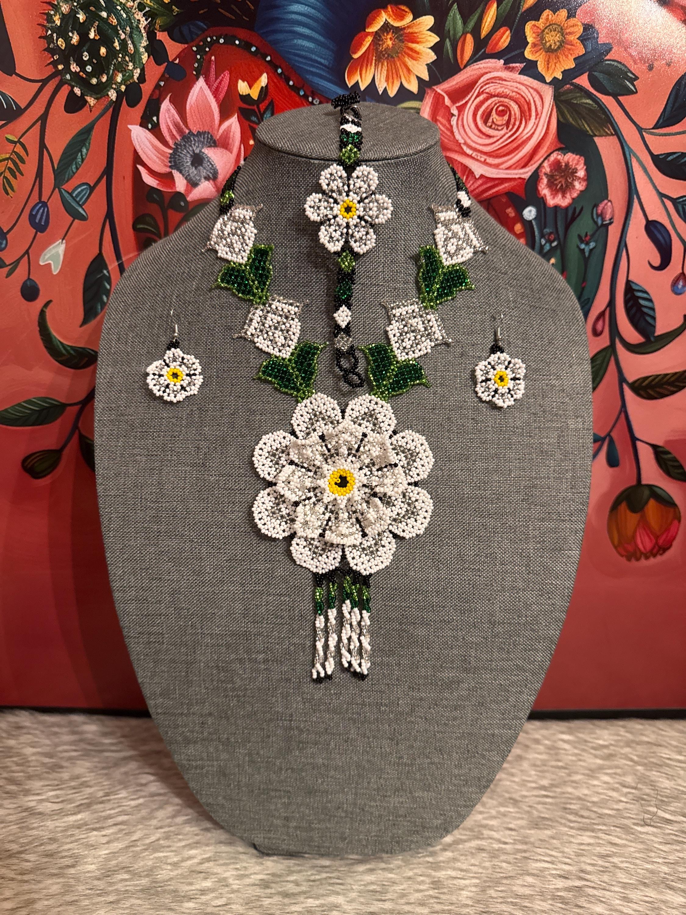 Hermoso collar de flor con pulsera y aretes,hechos a mano con chaquira por artesanos mexicanos