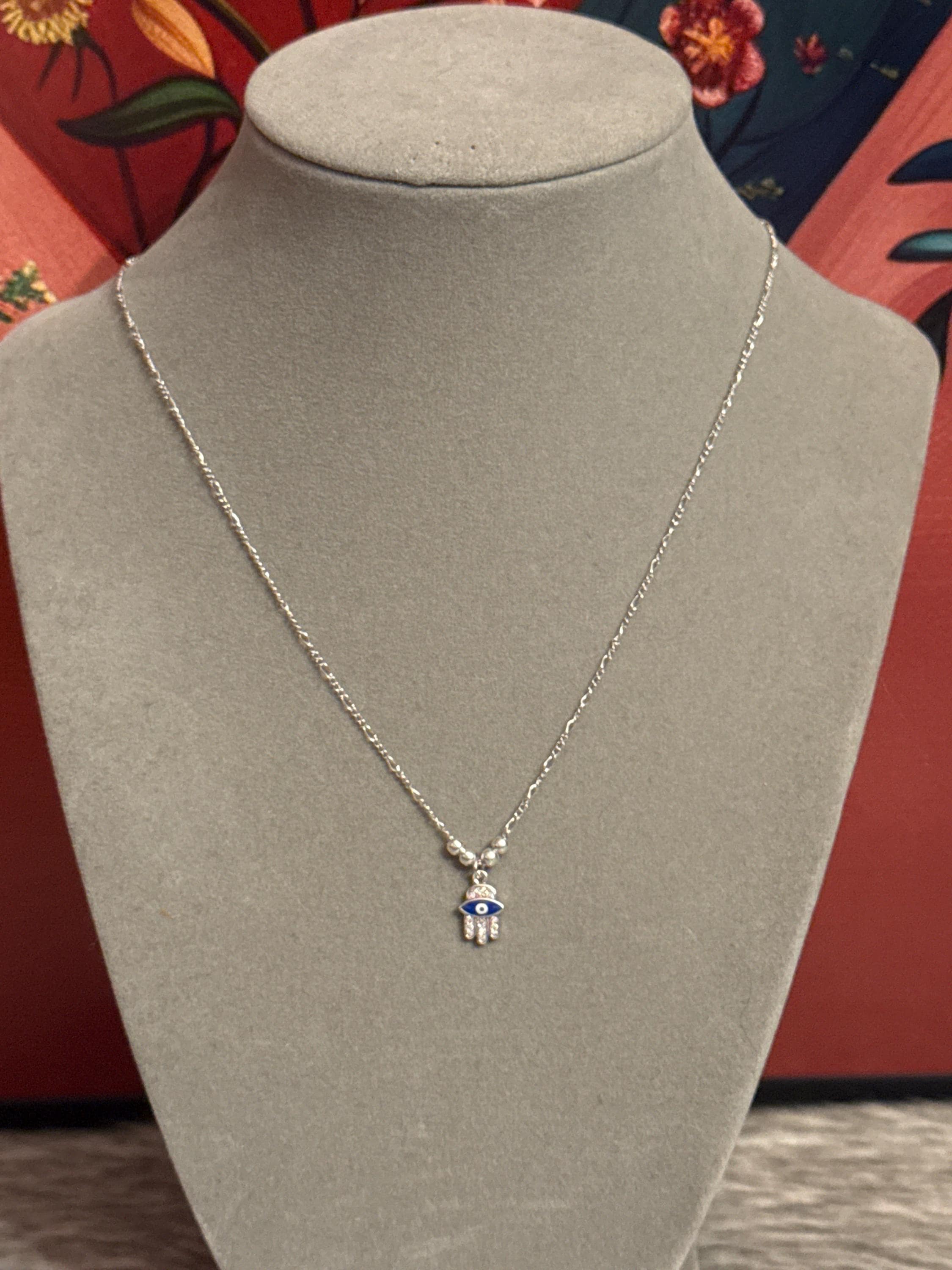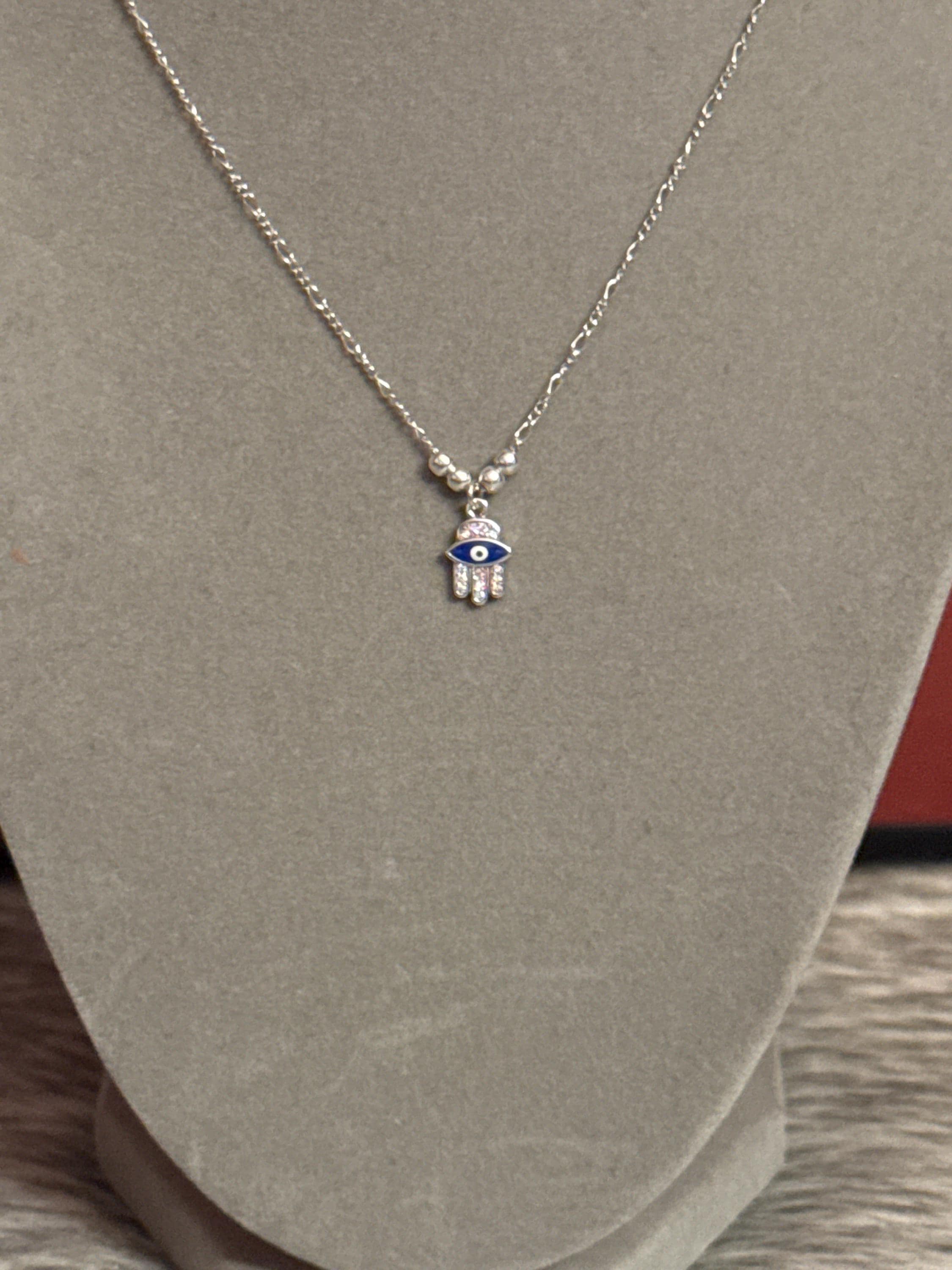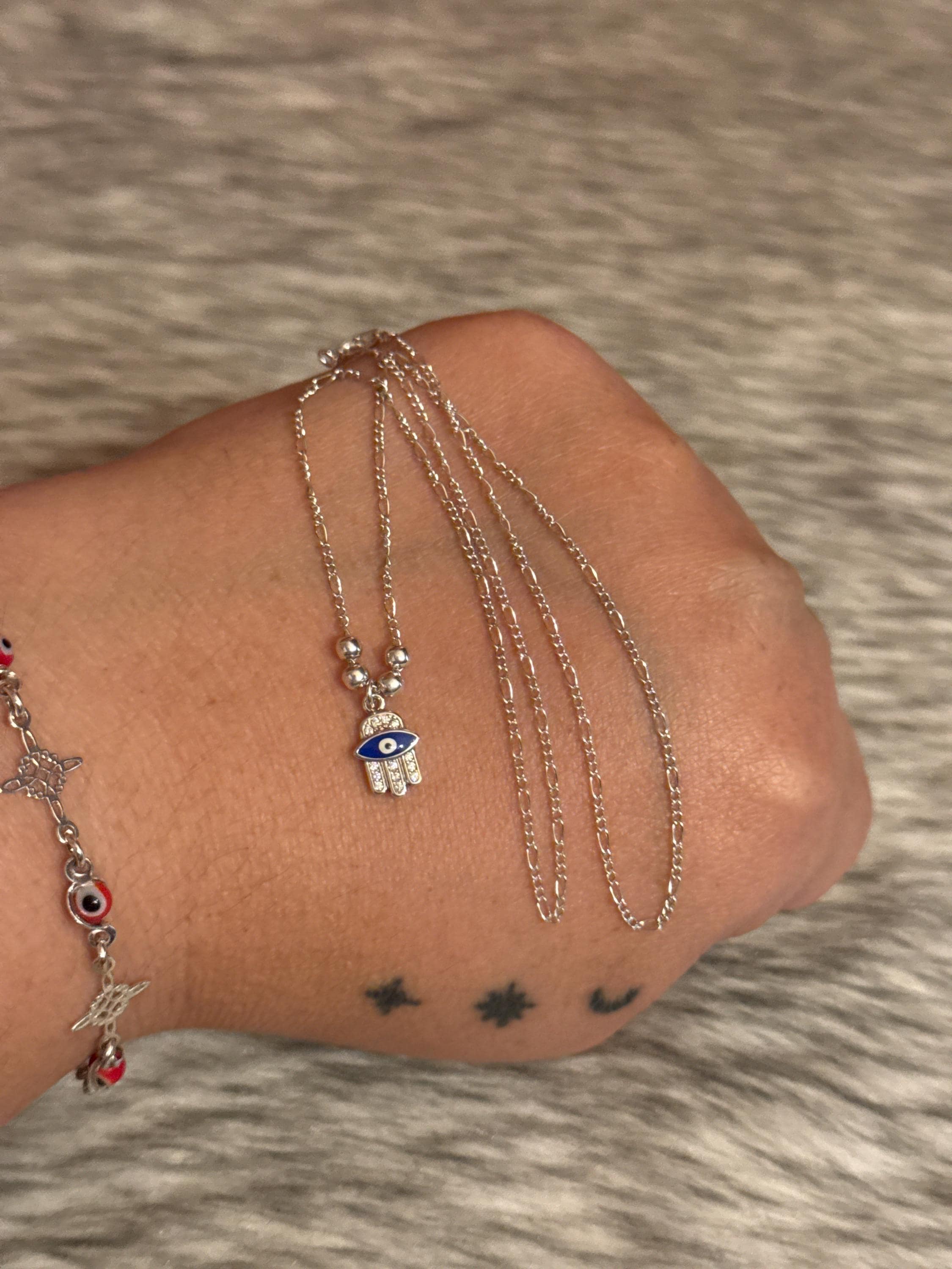 Hermosa cadena fina y delicada en plata de ley 925 con colgante de la Mano de Fátima y ojo turco con zirconias,la cadena mide aproximadamente 17 pulgadas de largo.