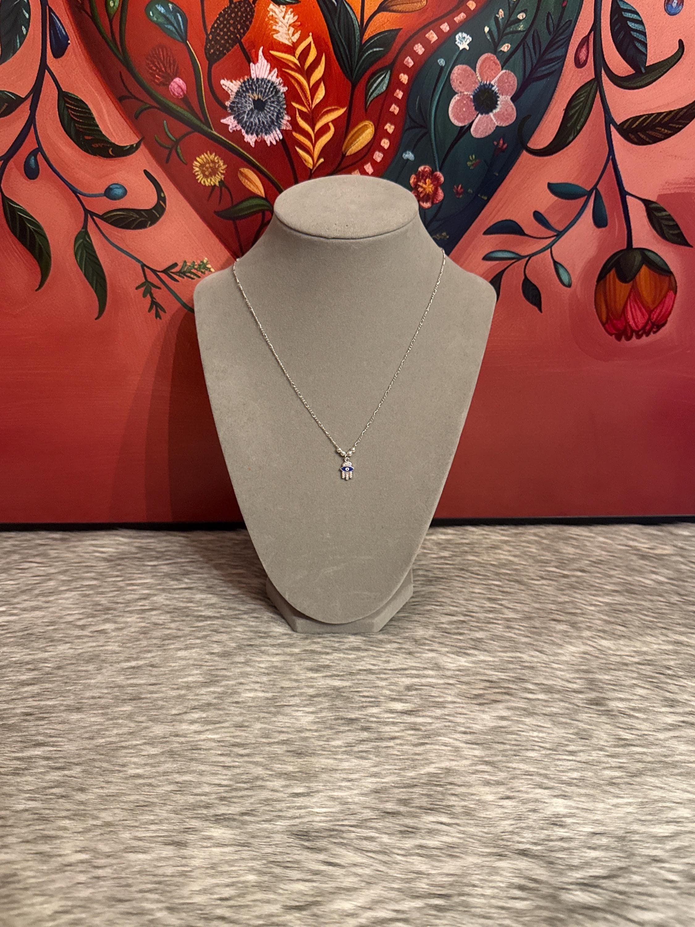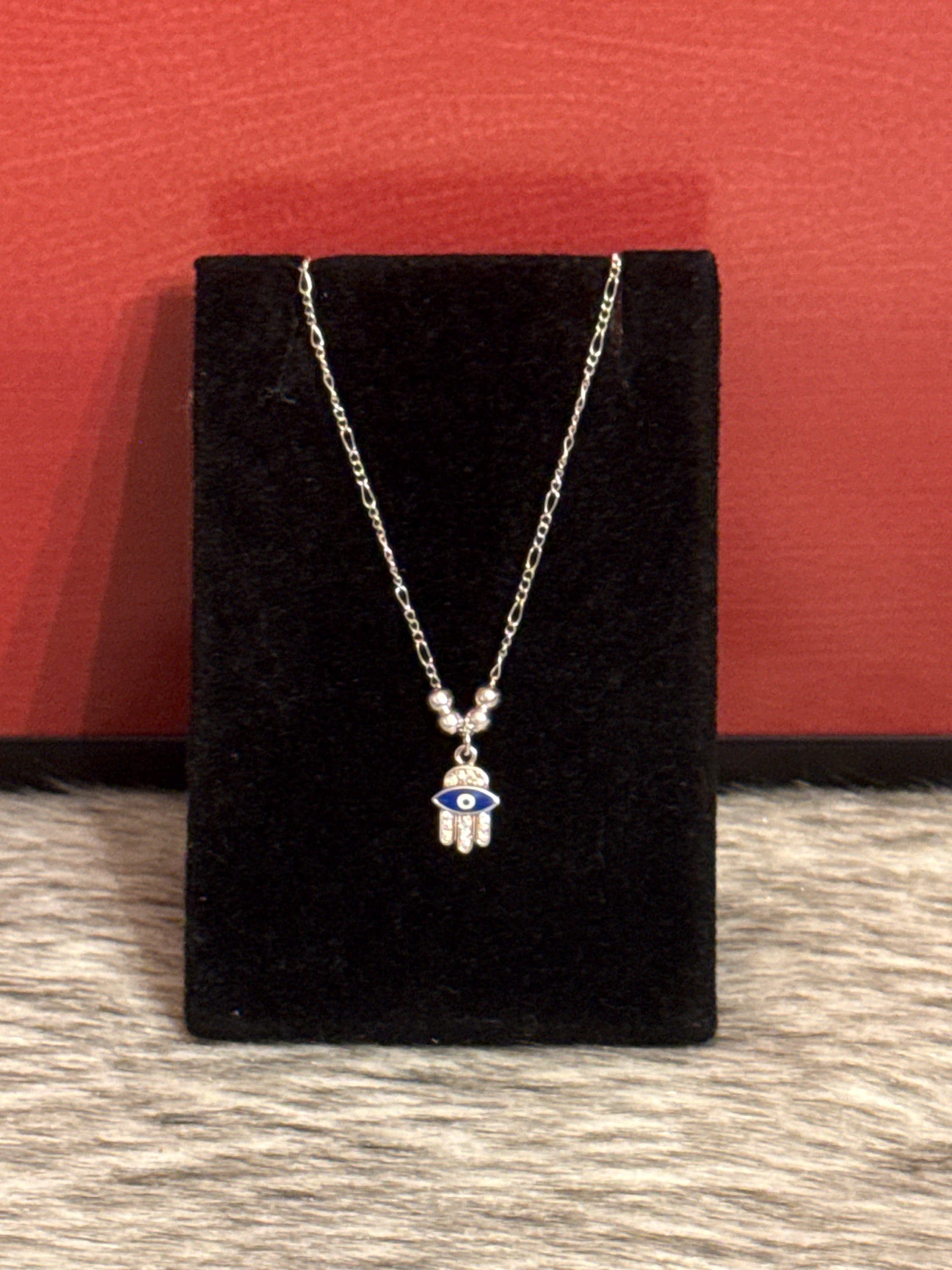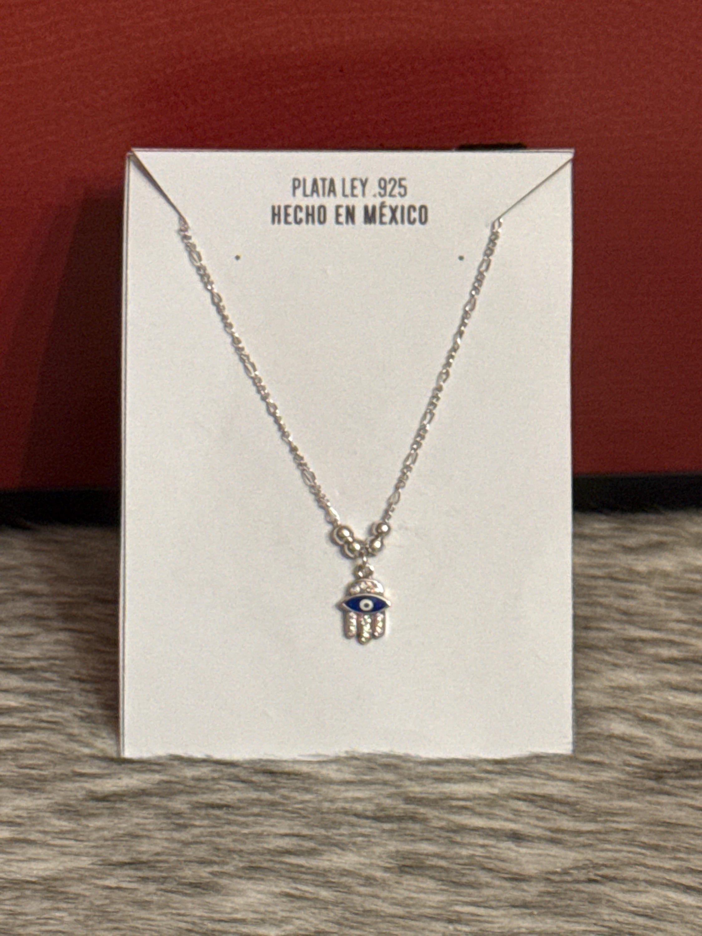 Hermosa cadena fina y delicada en plata de ley 925 con colgante de la Mano de Fátima y ojo turco con zirconias,la cadena mide aproximadamente 17 pulgadas de largo.