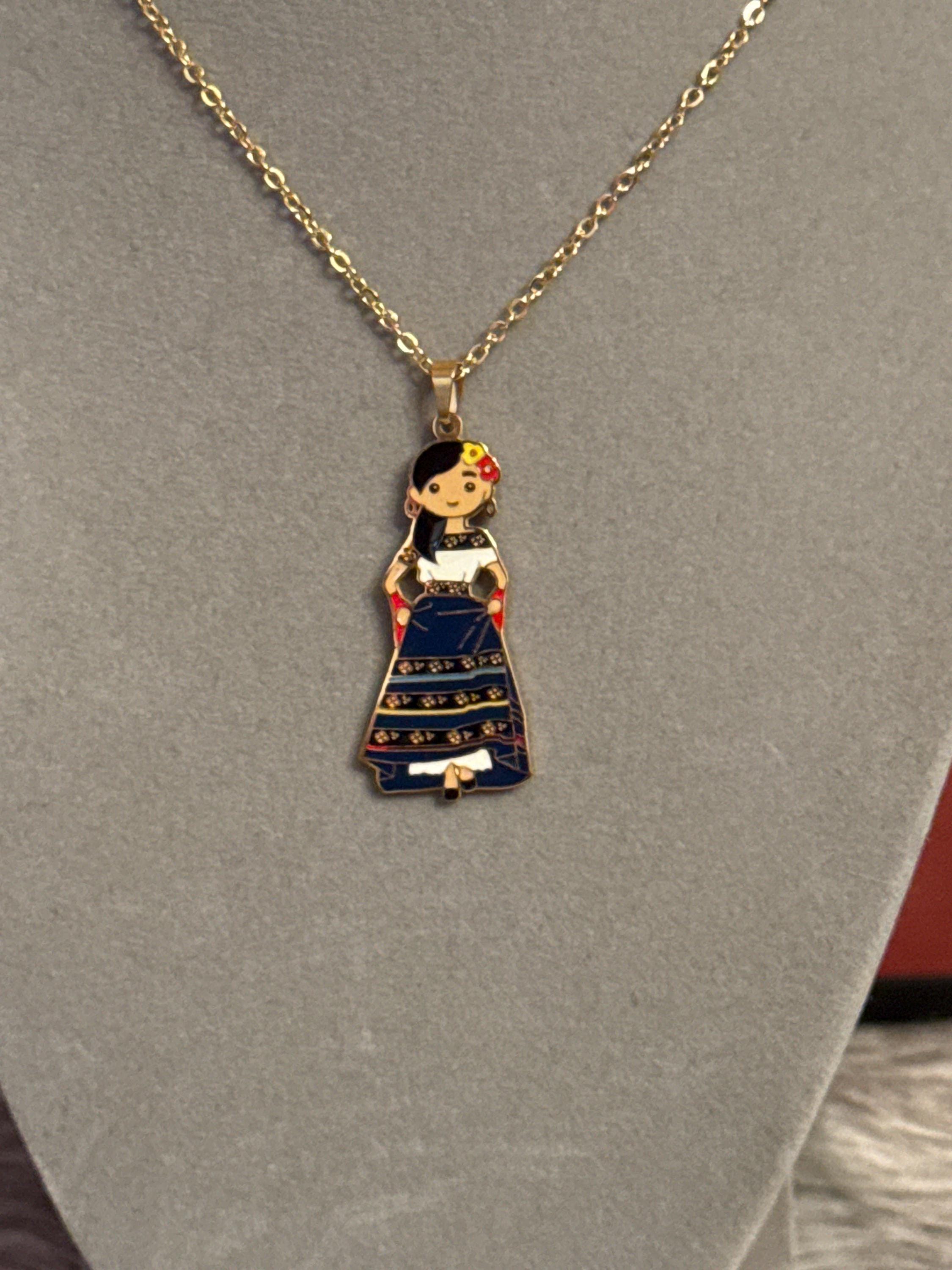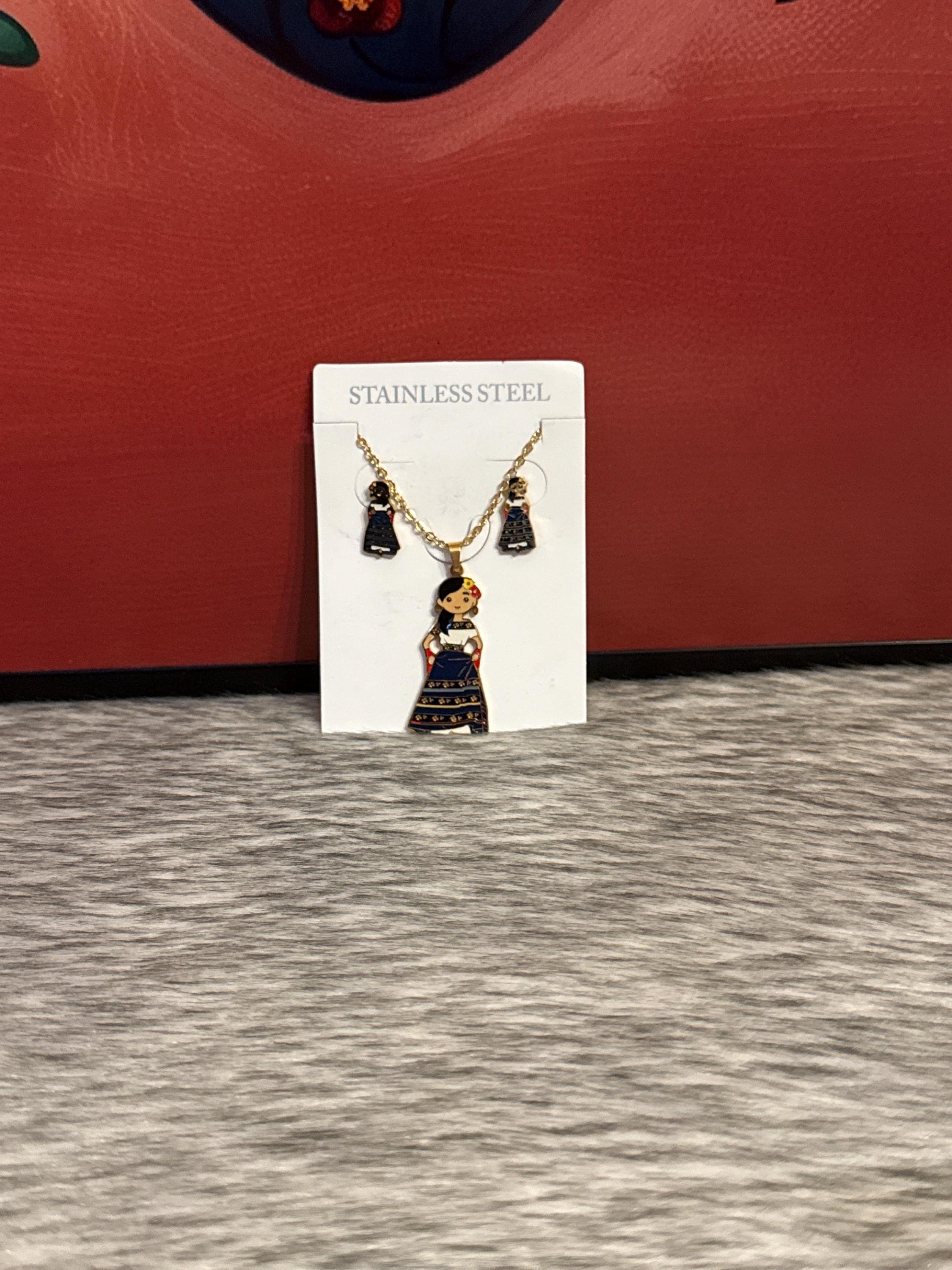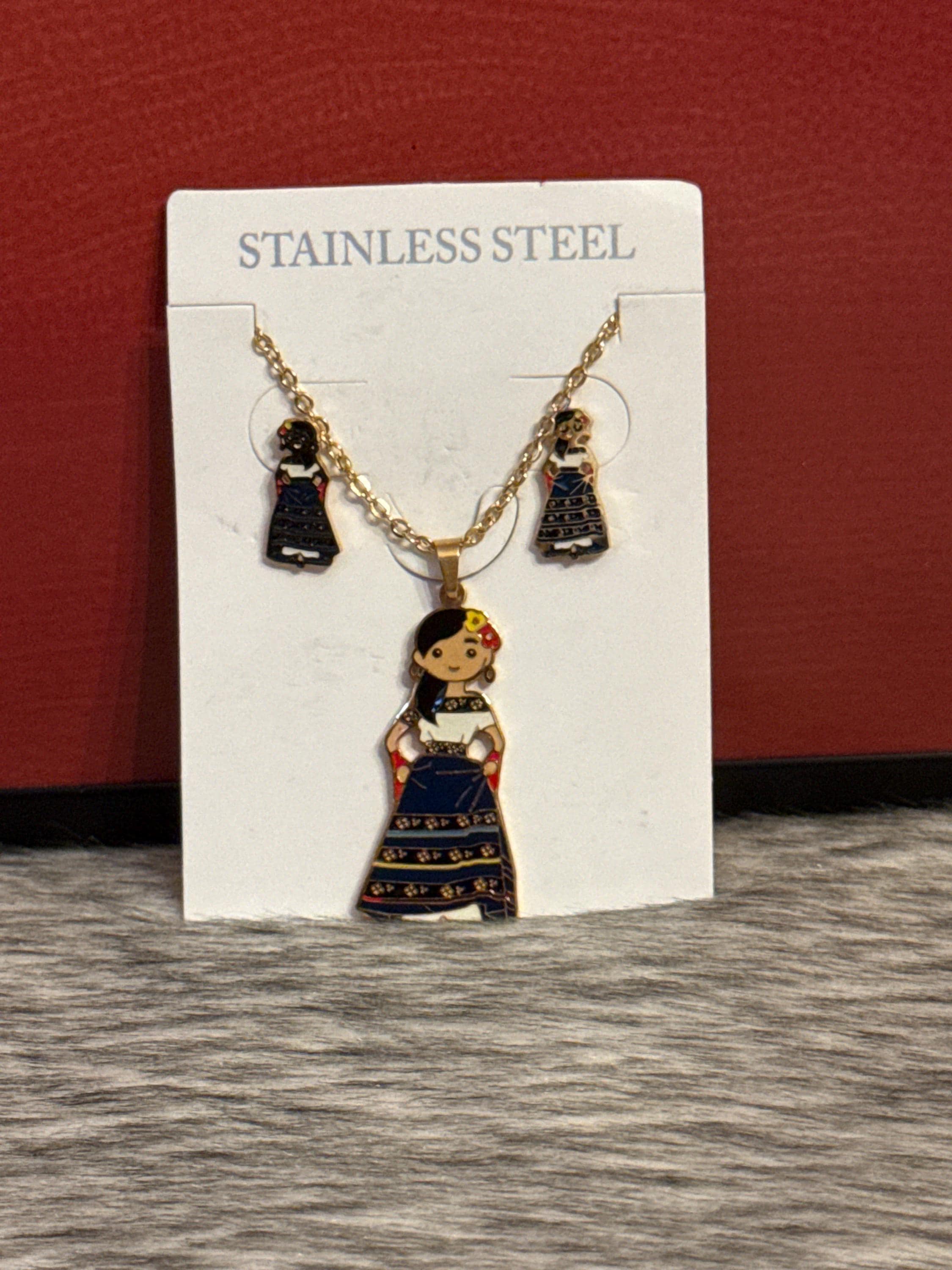Mexican doll pendant necklace in gold-colored stainless steel. Includes earrings. The necklace measures approximately 17 inches long.