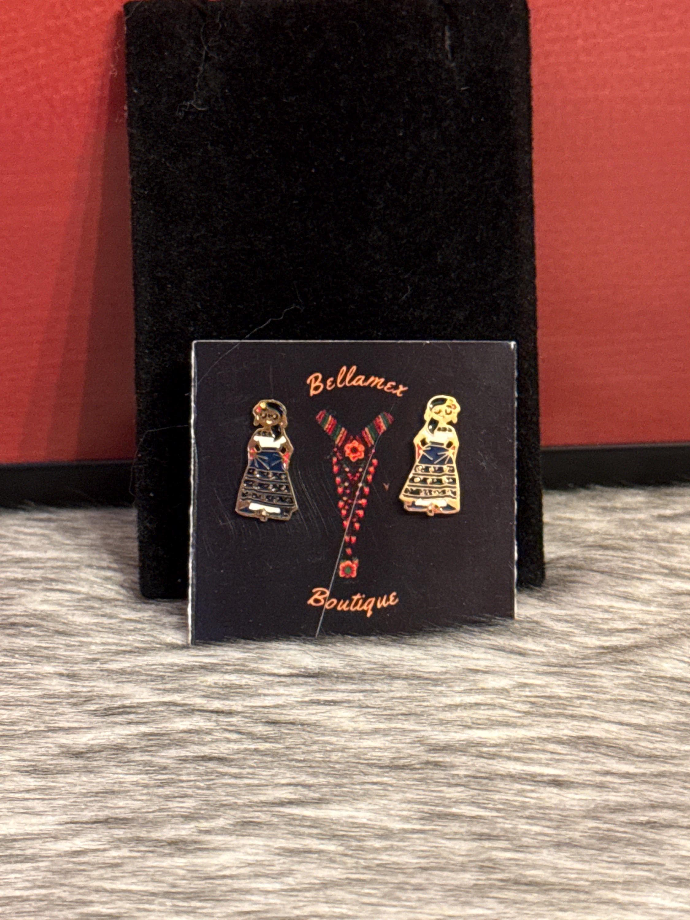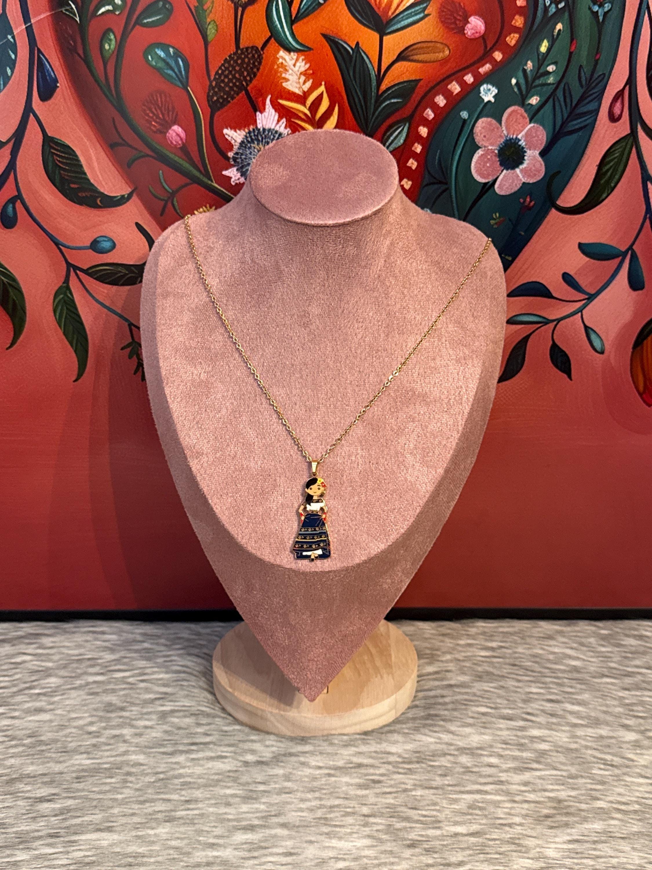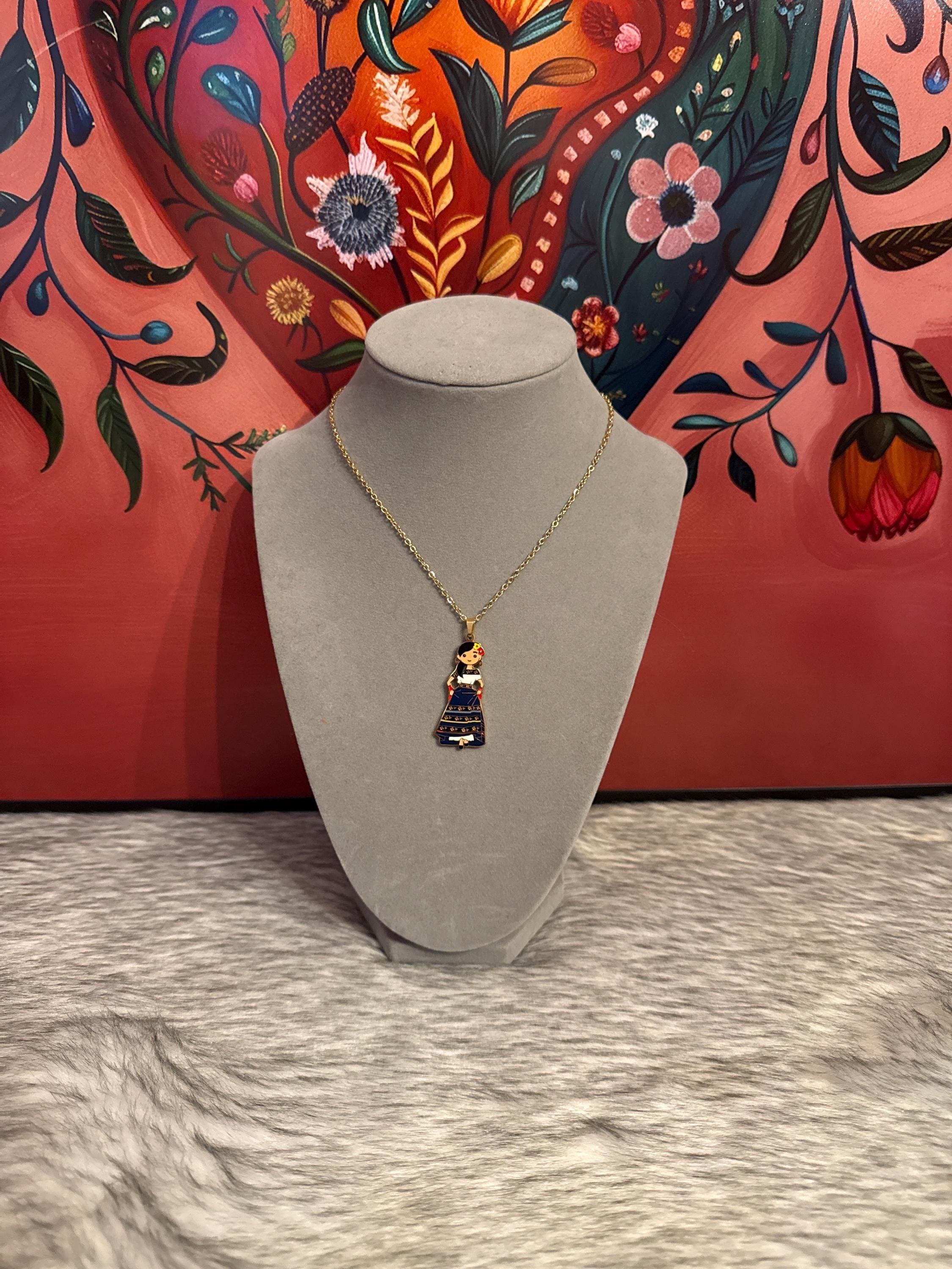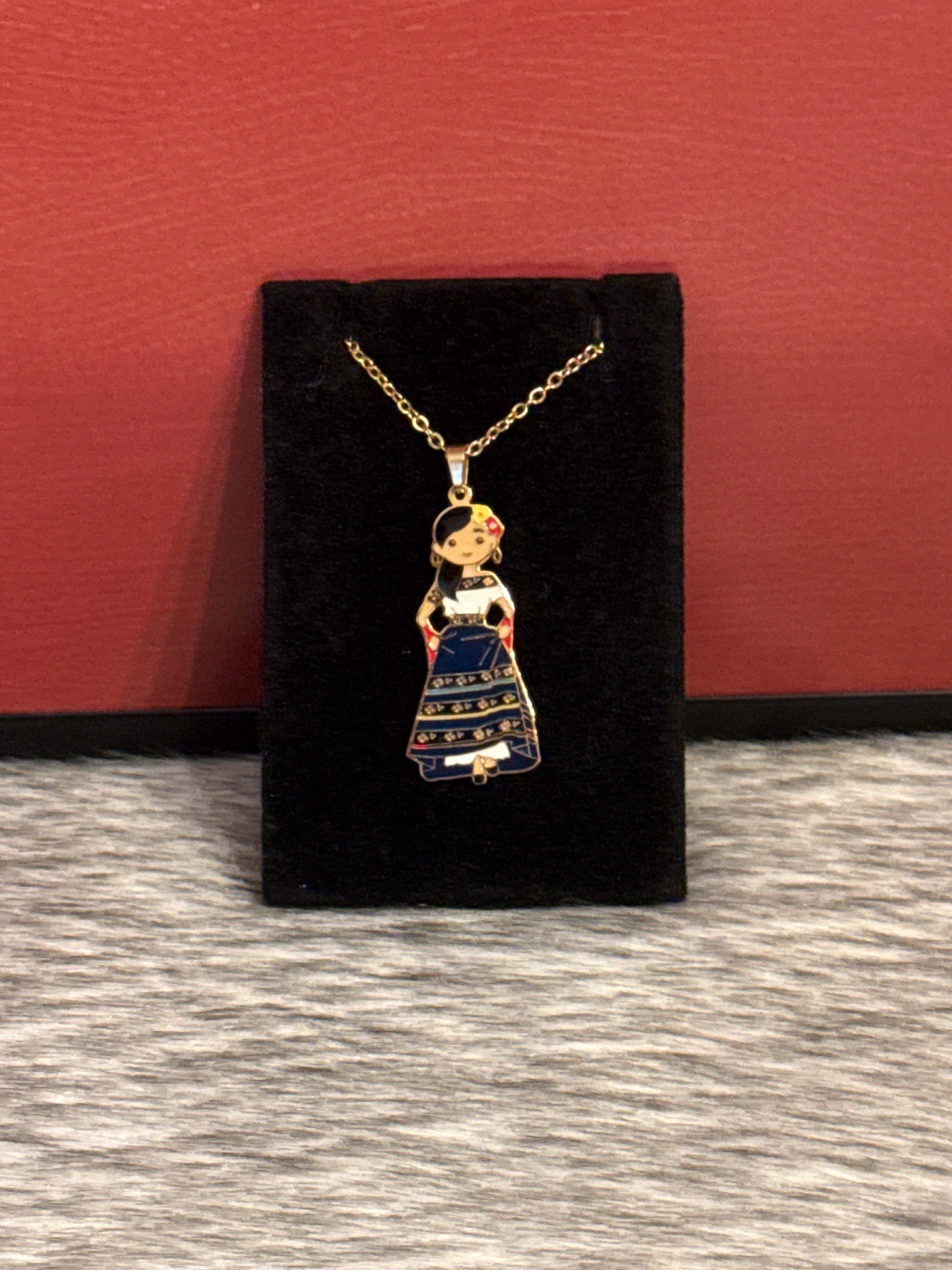 Mexican doll pendant necklace in gold-colored stainless steel. Includes earrings. The necklace measures approximately 17 inches long.