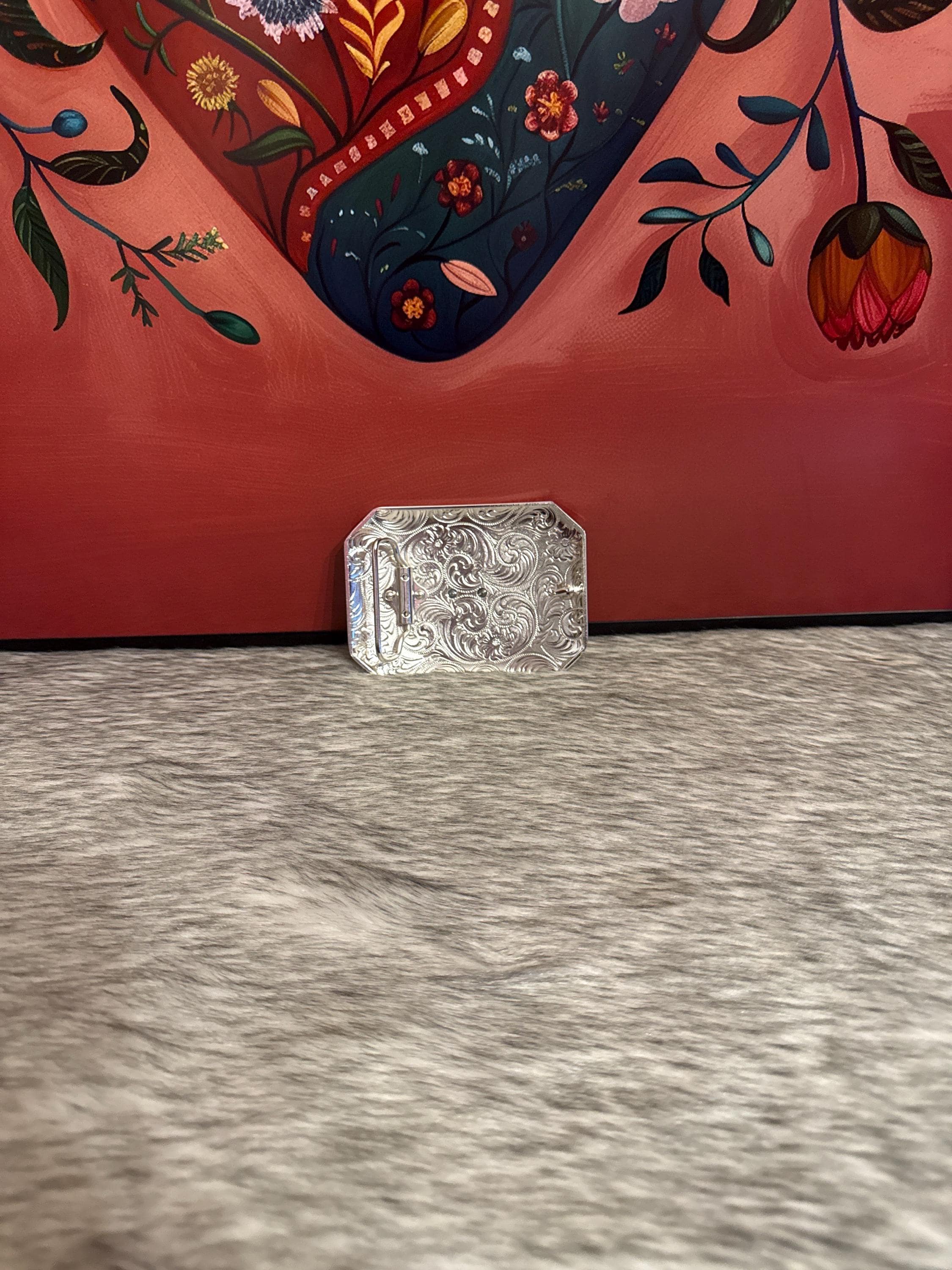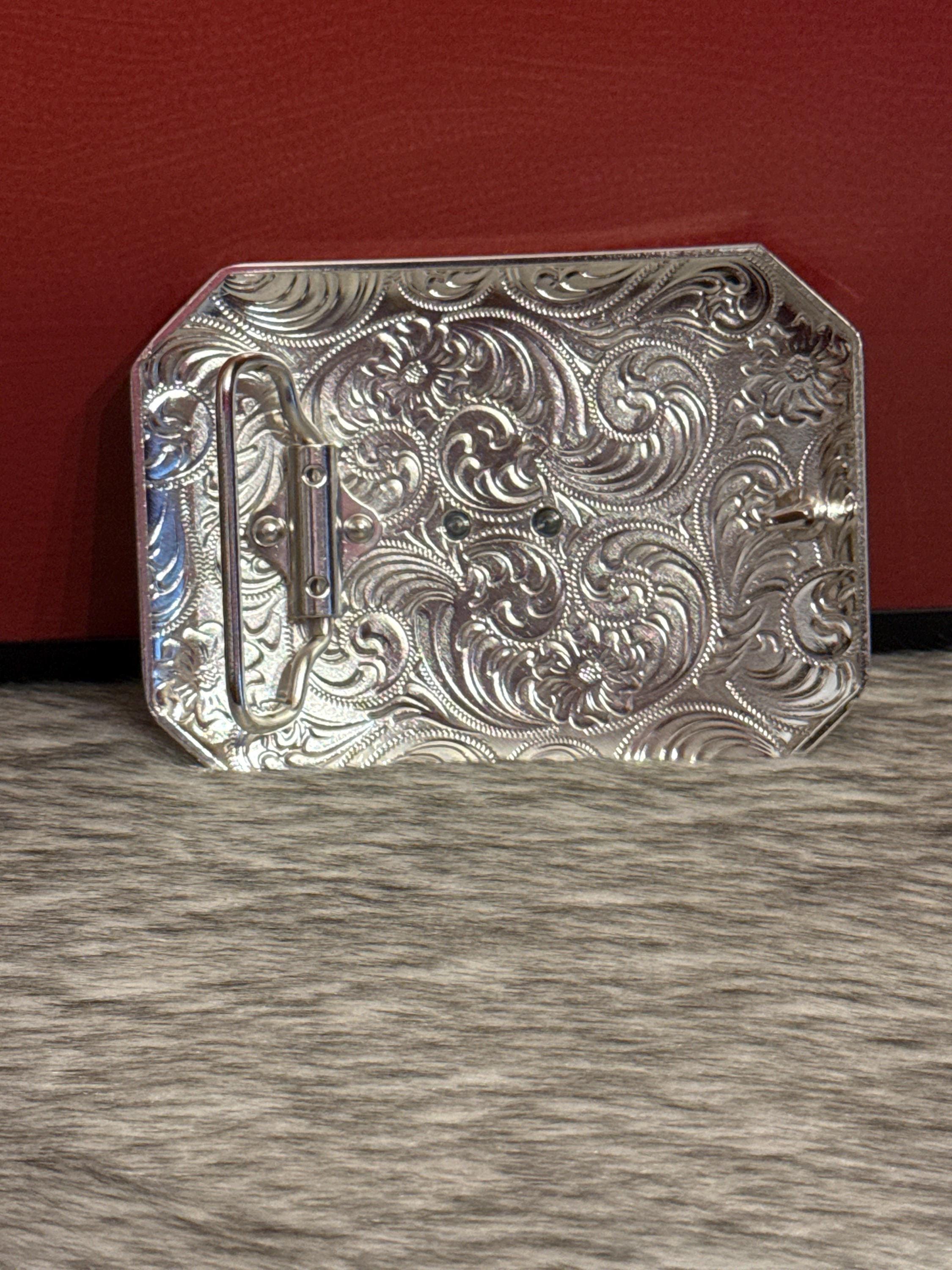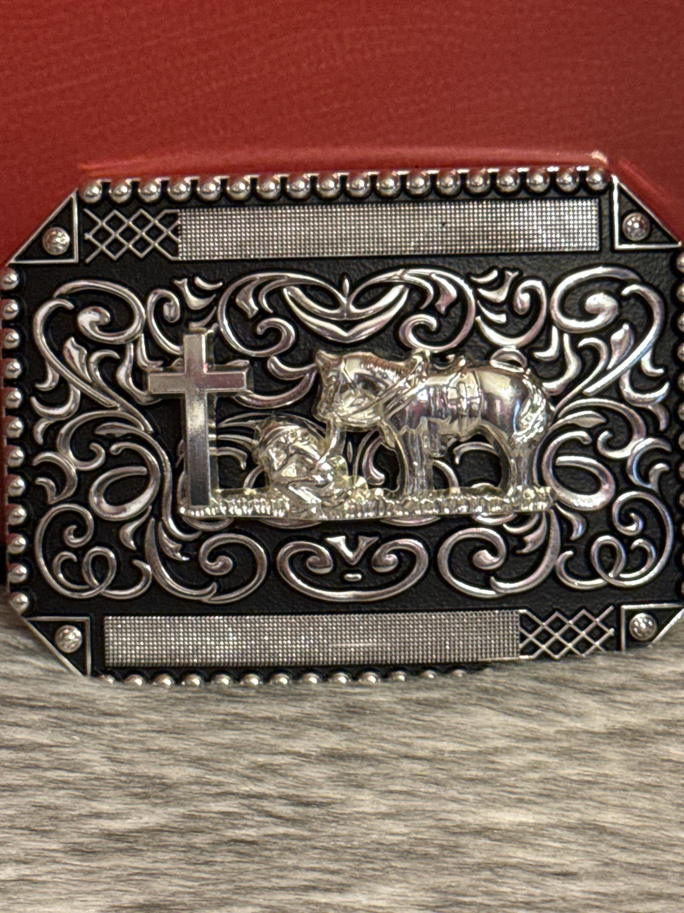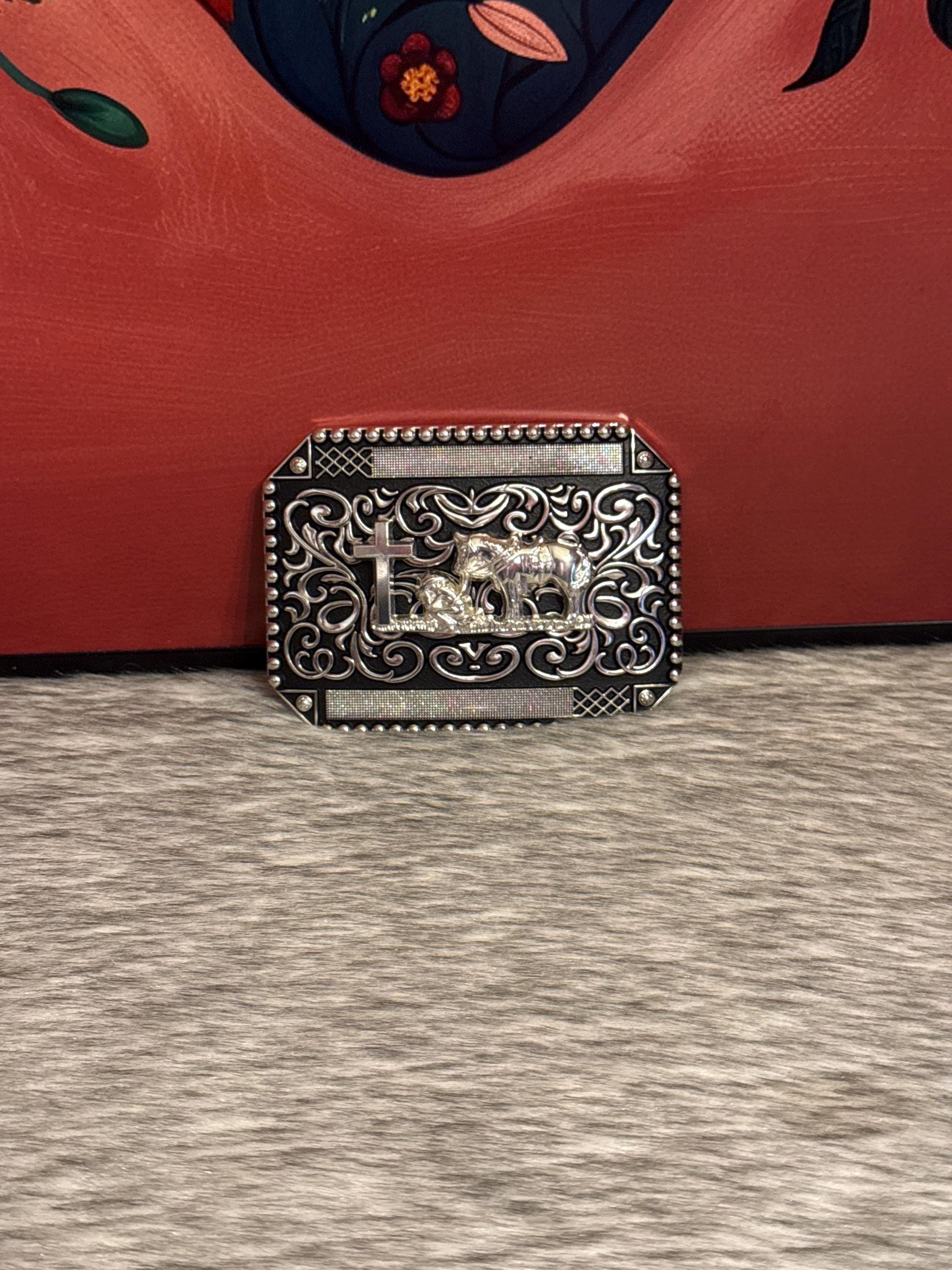 Silver-tone cowboy belt buckle, sacred prayer, made in Mexico.