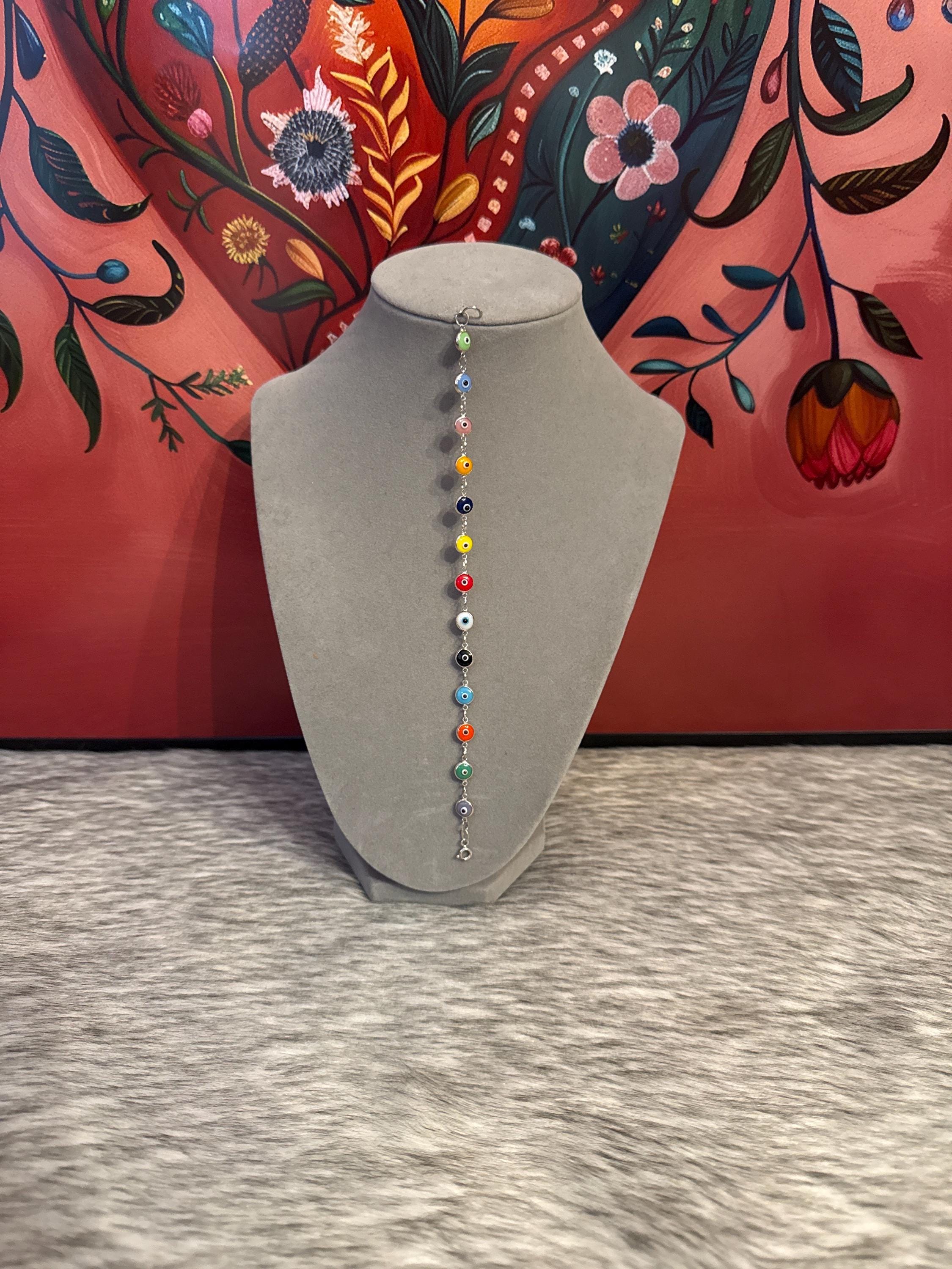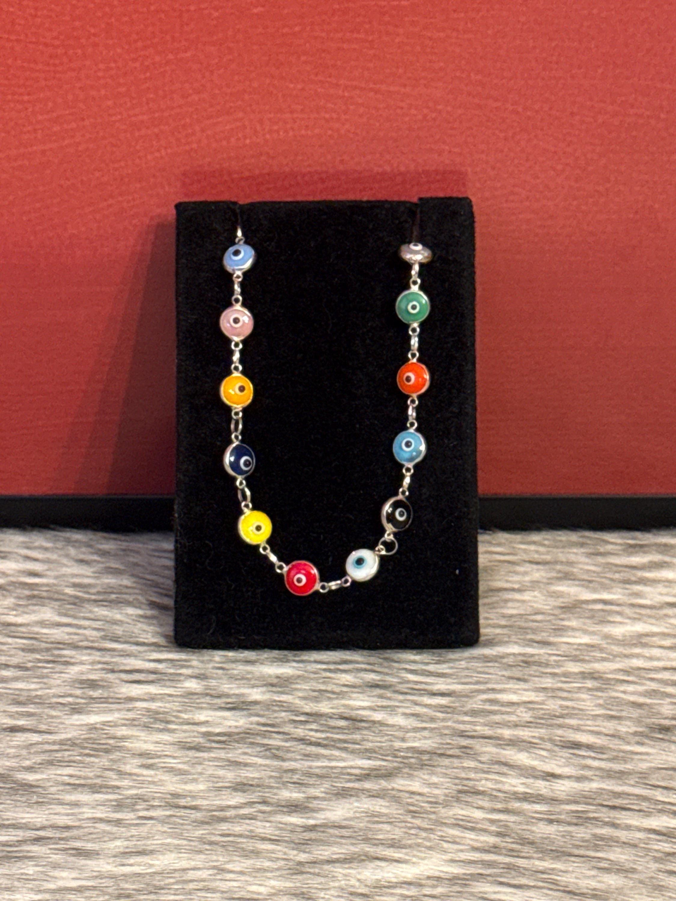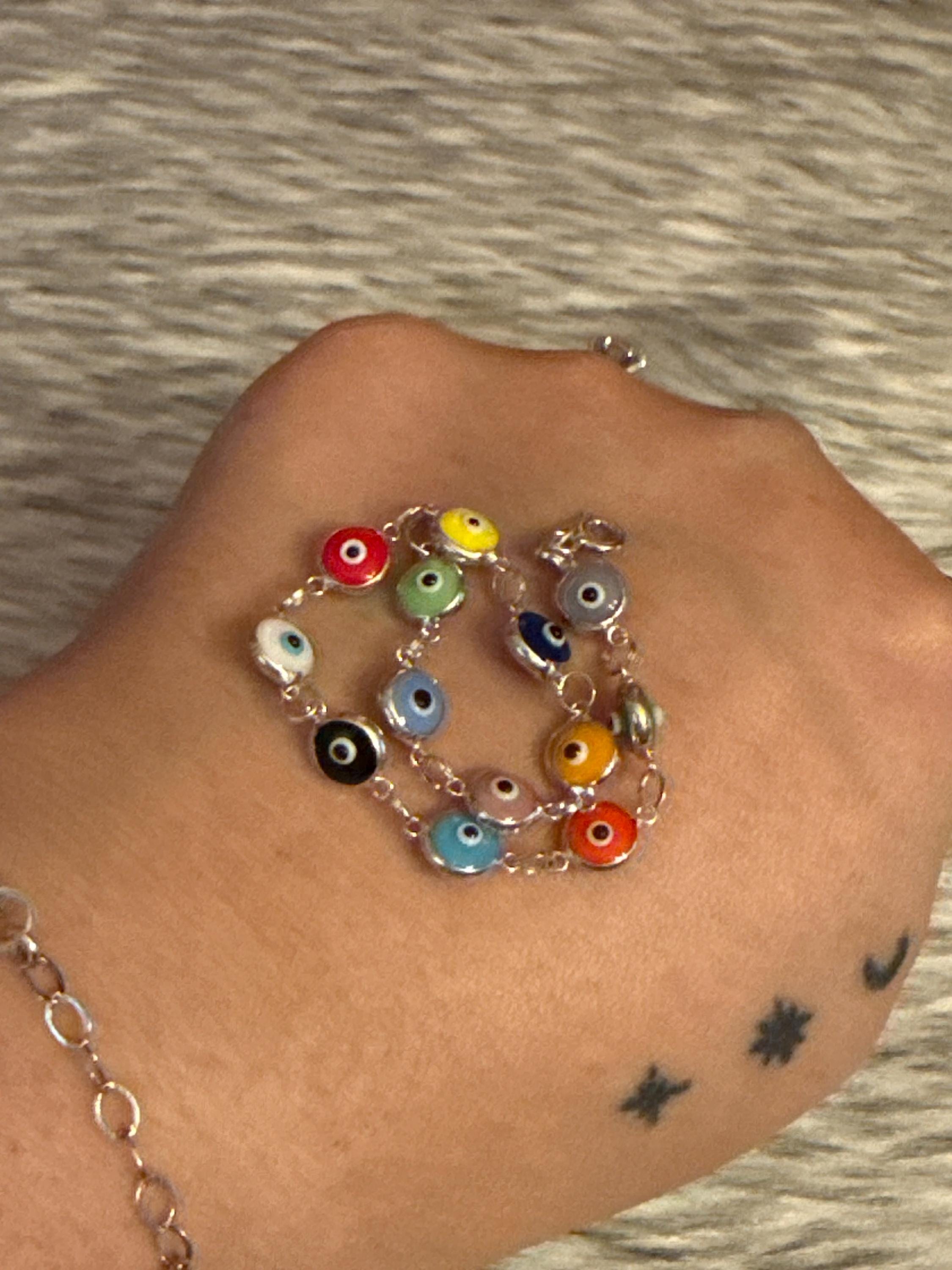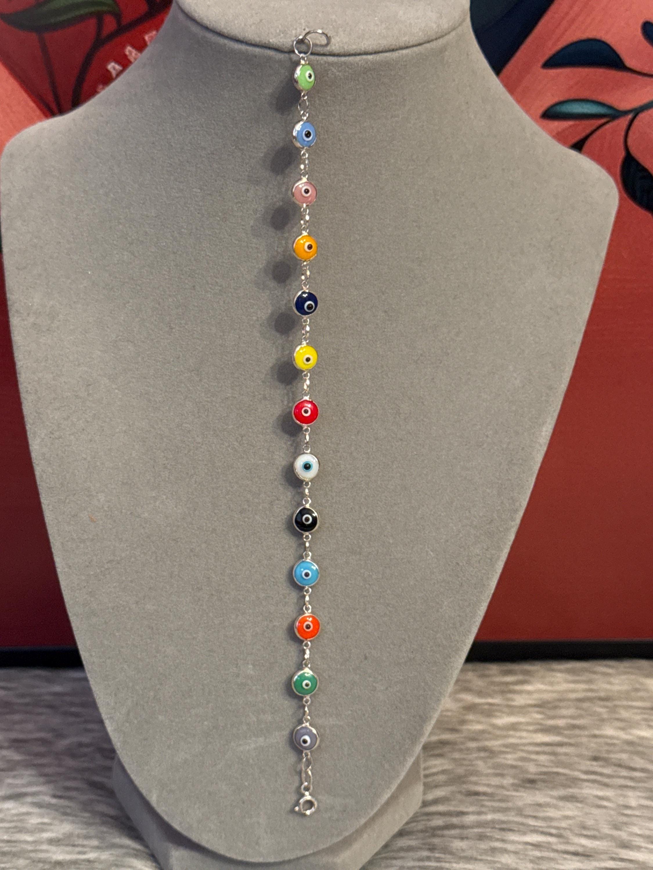 Multicolored eyes, made in Mexico with 925 sterling silver, the bracelet measures approximately 7 inches long.