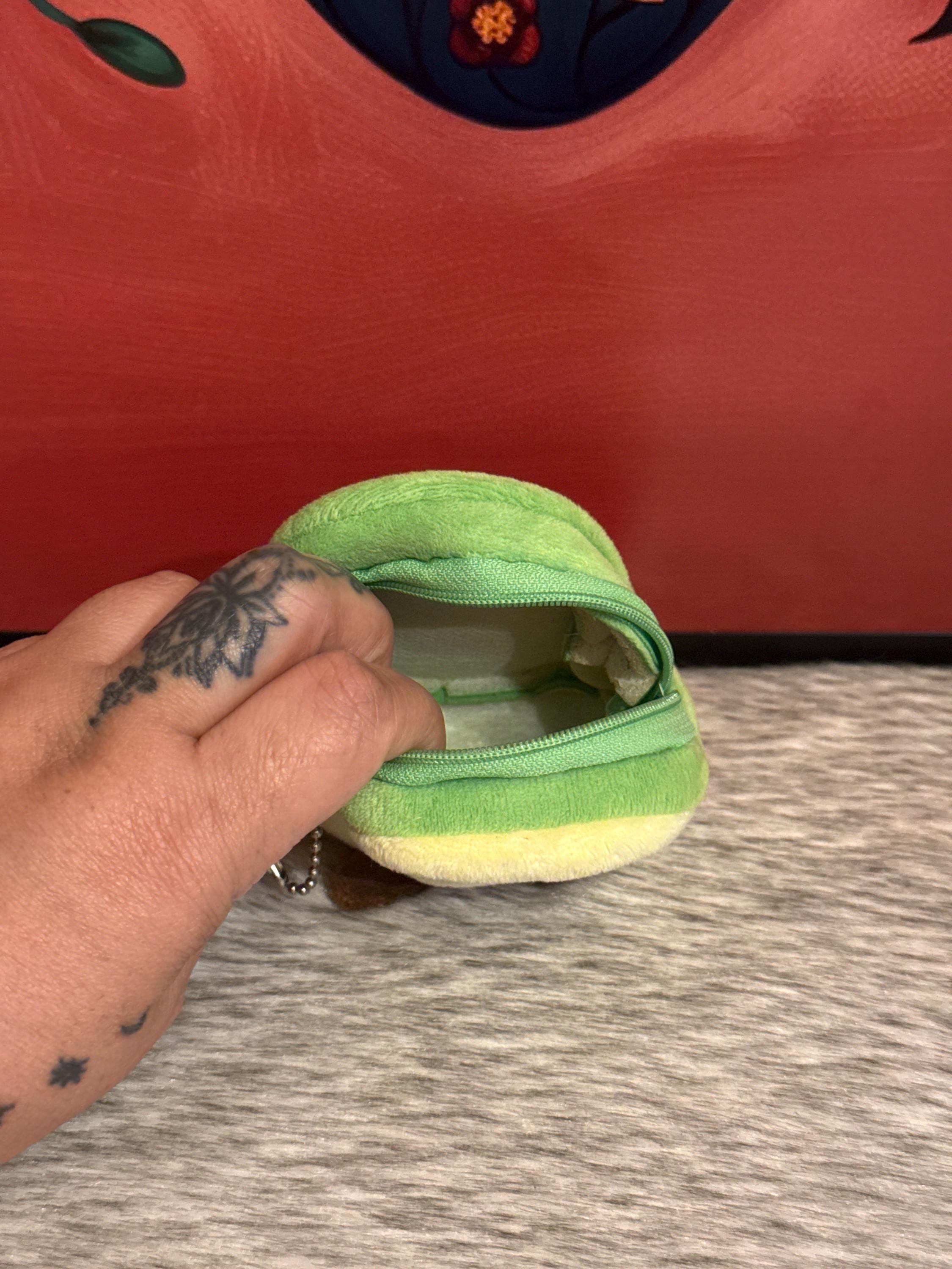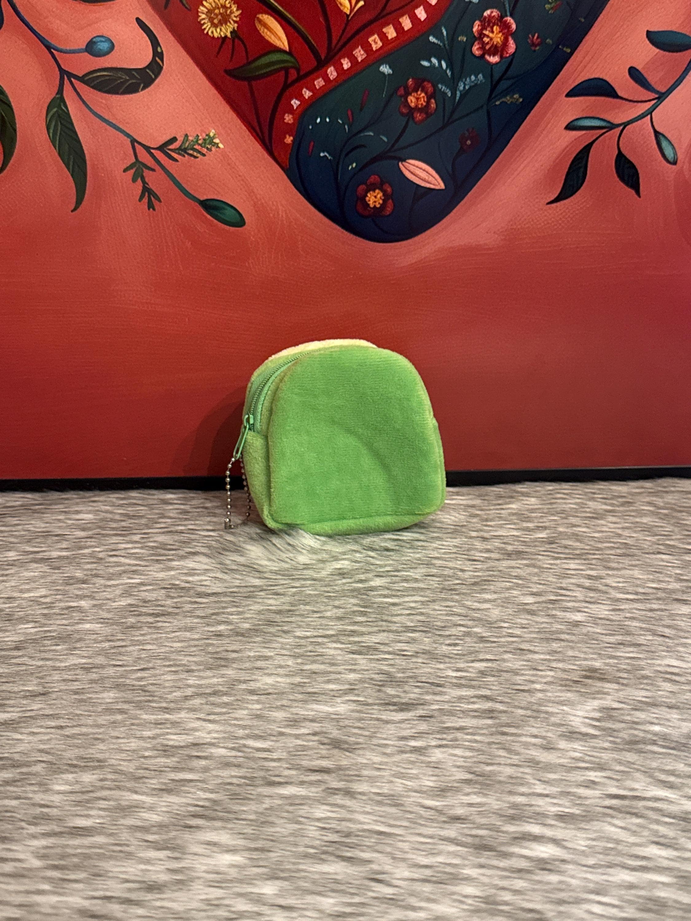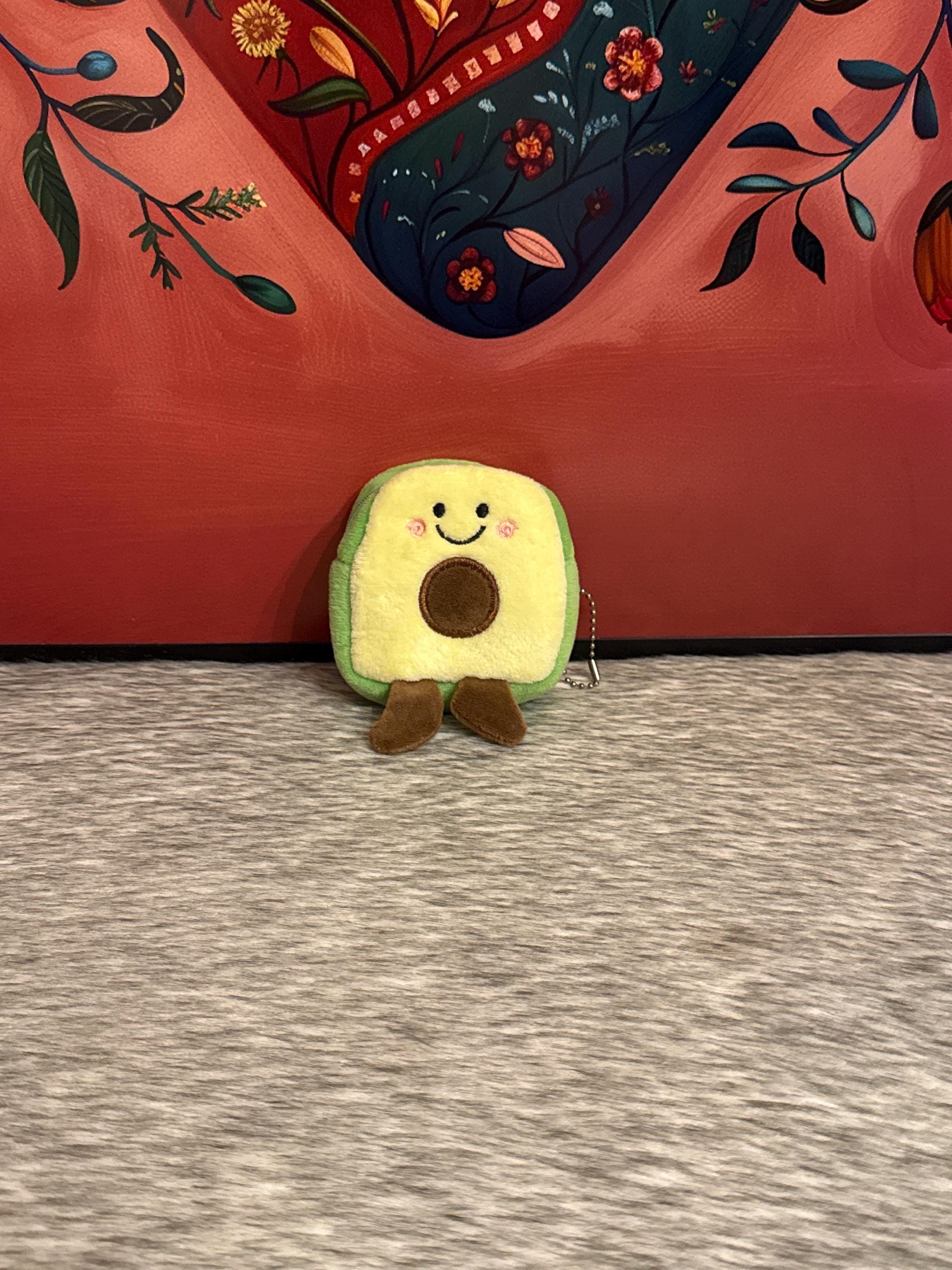 Avocado-shaped fabric backpack-style coin purse. The purse measures approximately 4 inches long by 3 inches wide. Made in Mexico.