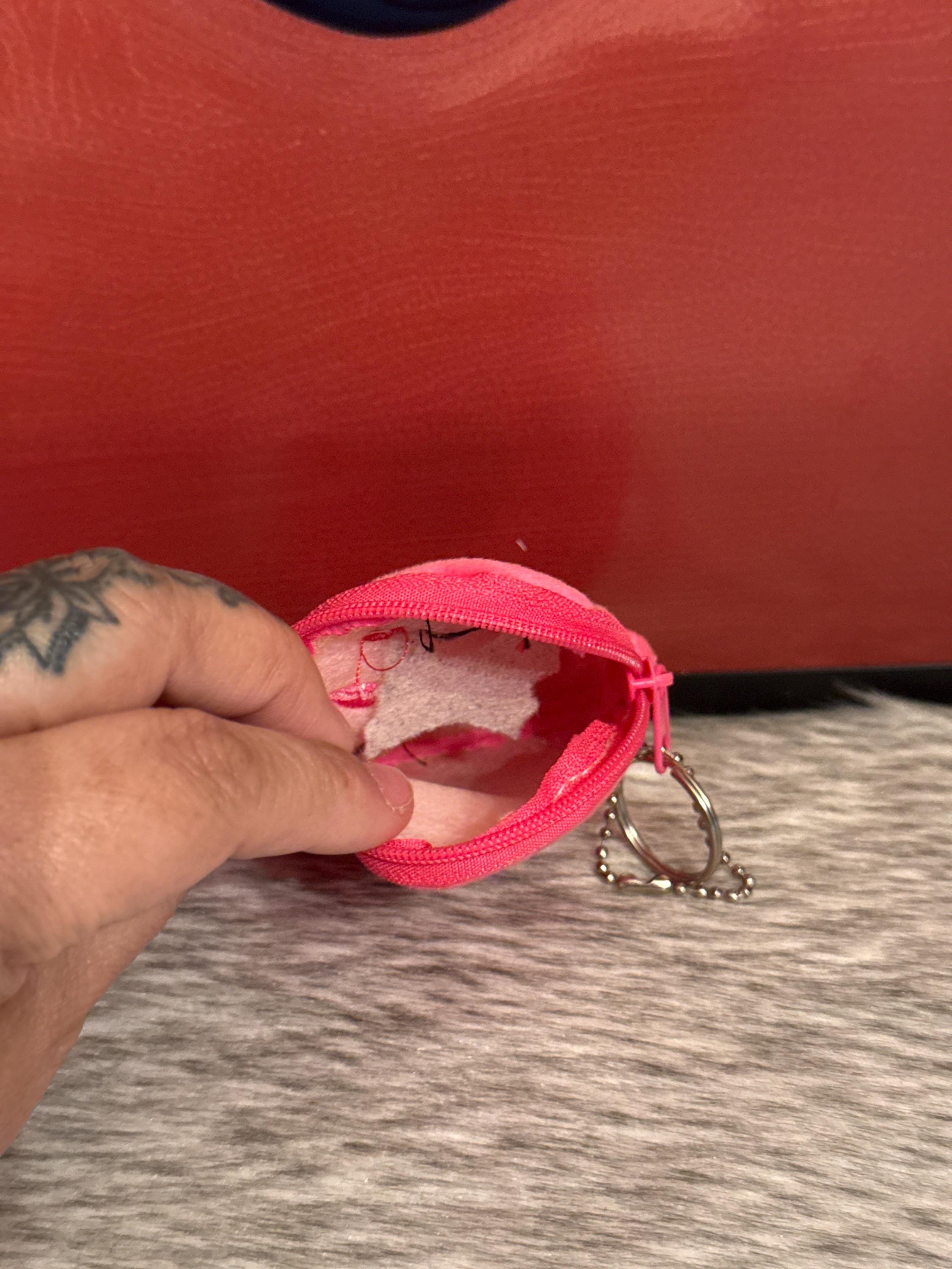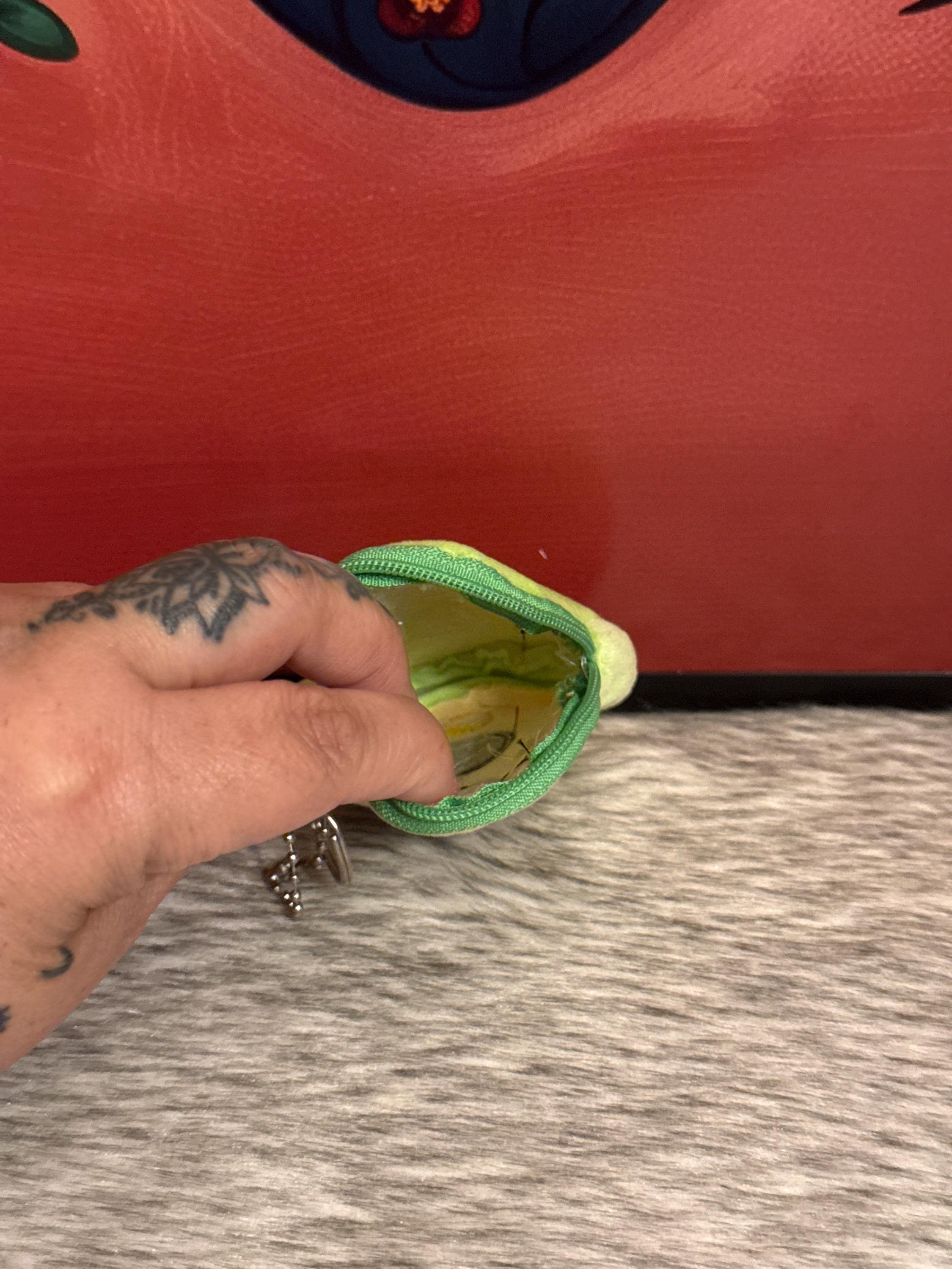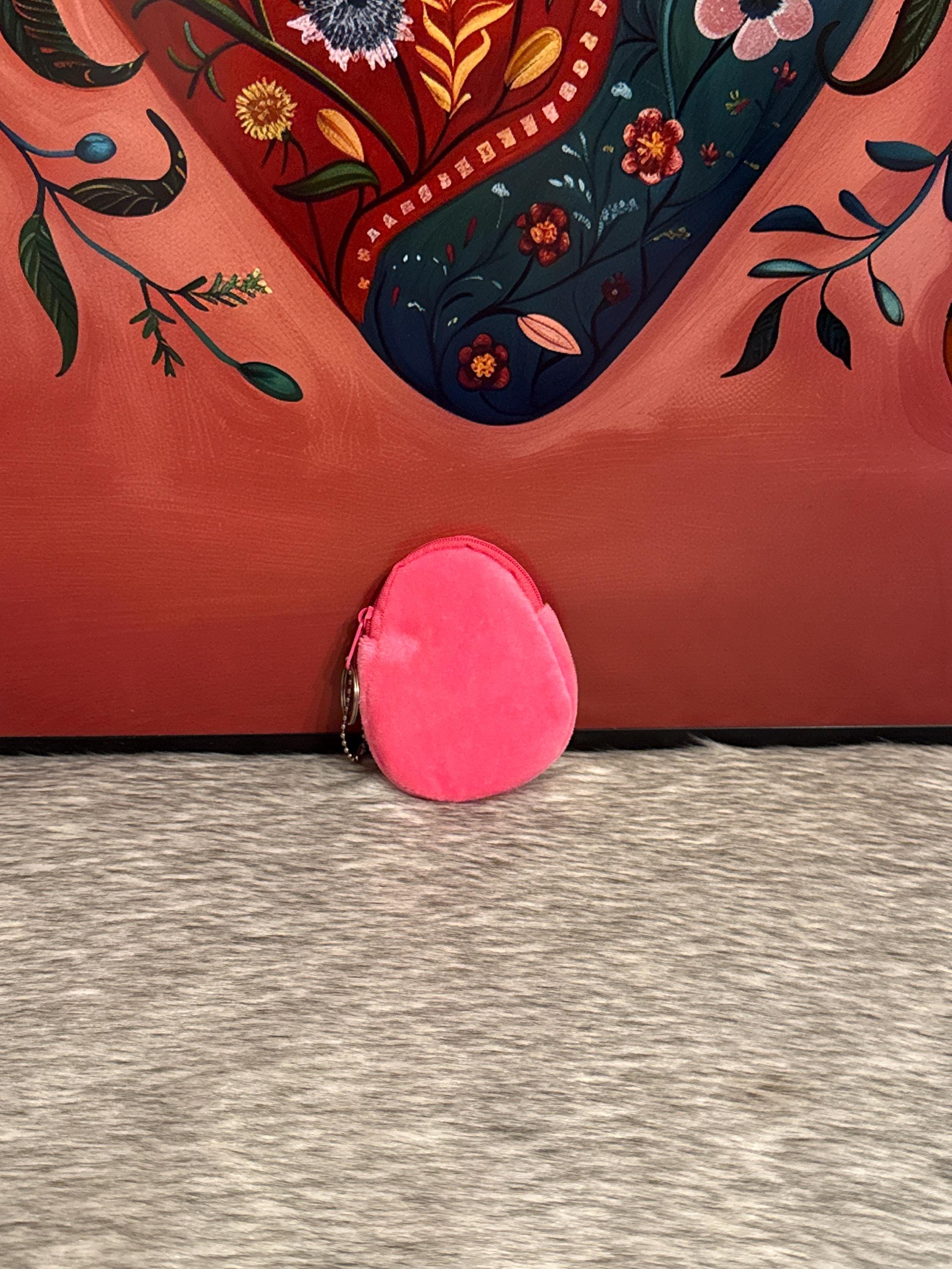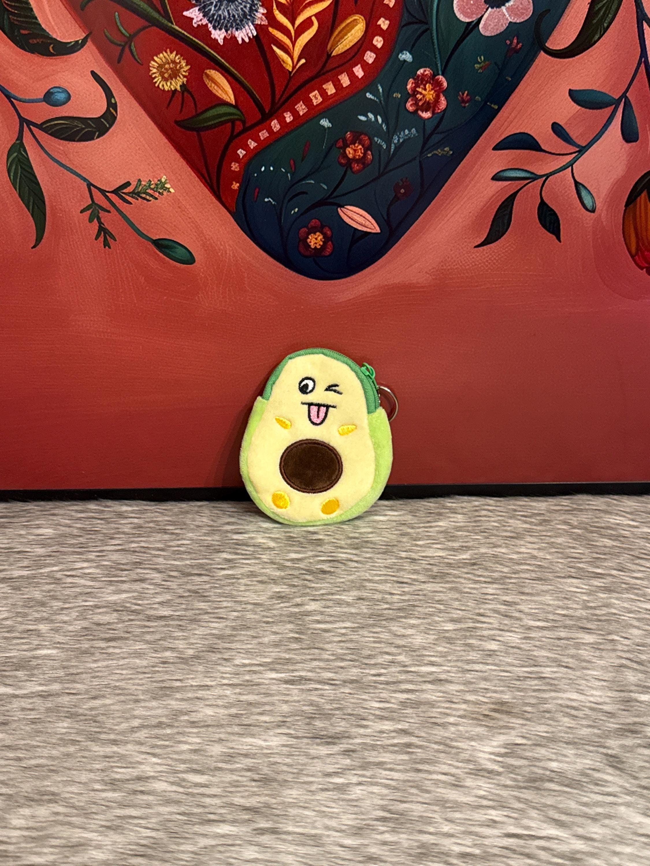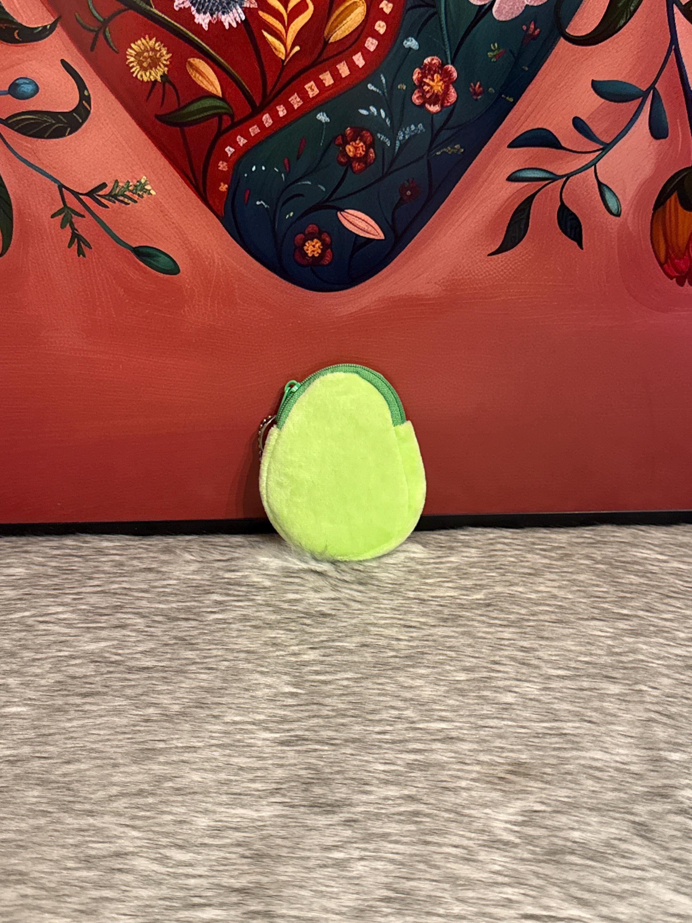 Avocado-shaped fabric coin purse, the coin purse measures approximately 4 inches long by 3 inches wide. Made in Mexico.