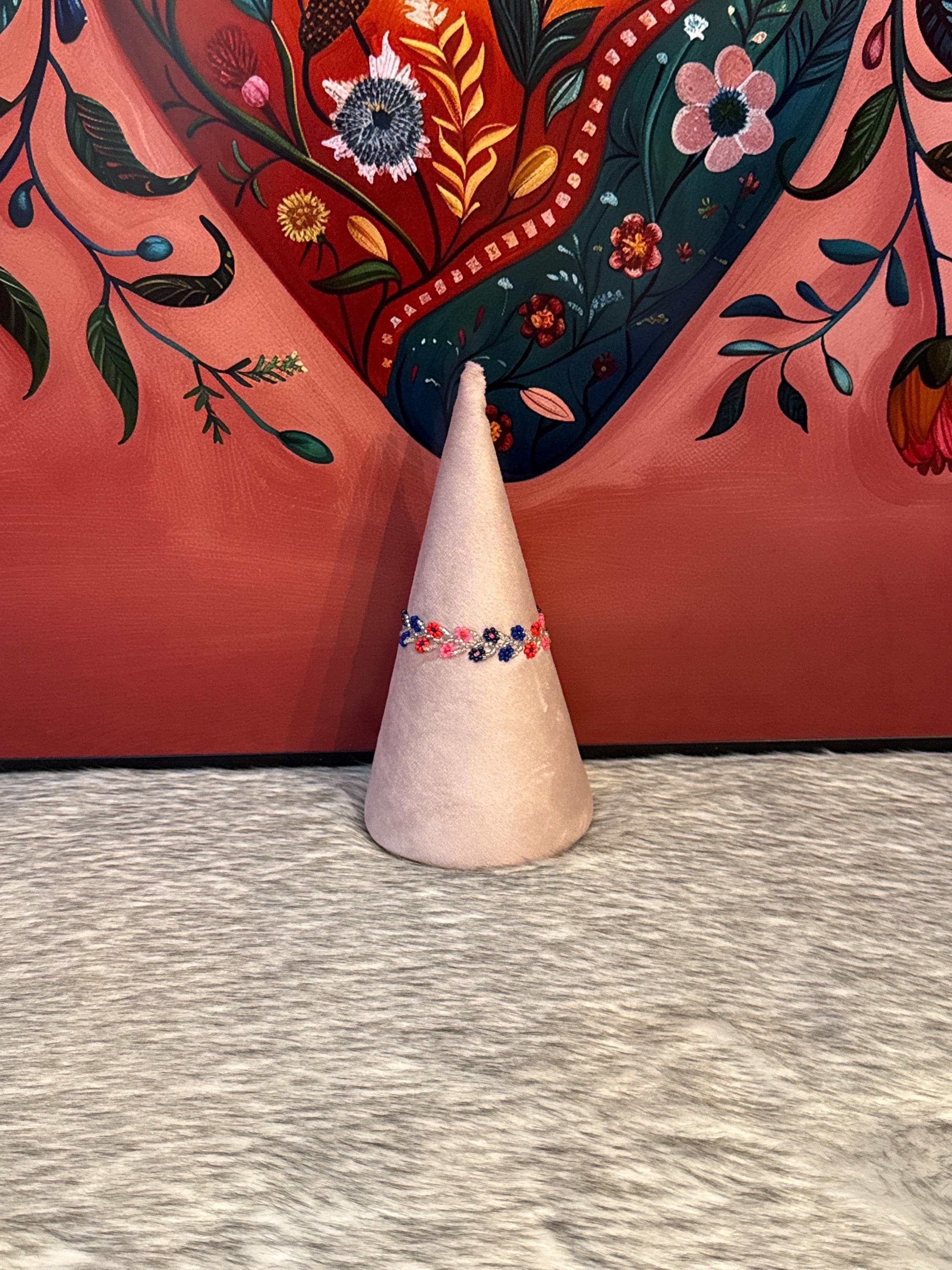 This is the first time that I ever wore a cream colored bracelet. I was surprised how attractive the color looks with the brightly colored flowers, even on my pale skin tone.