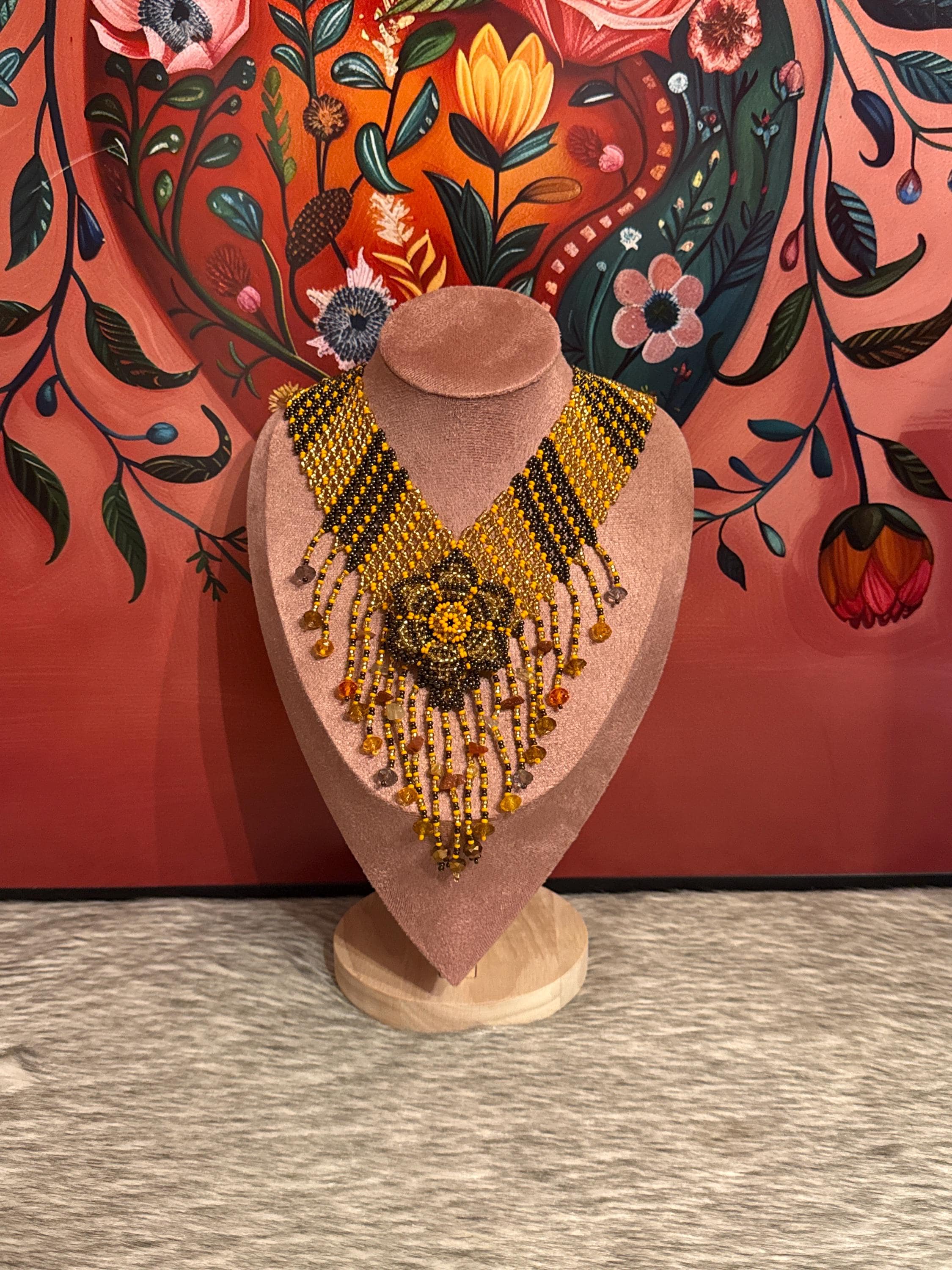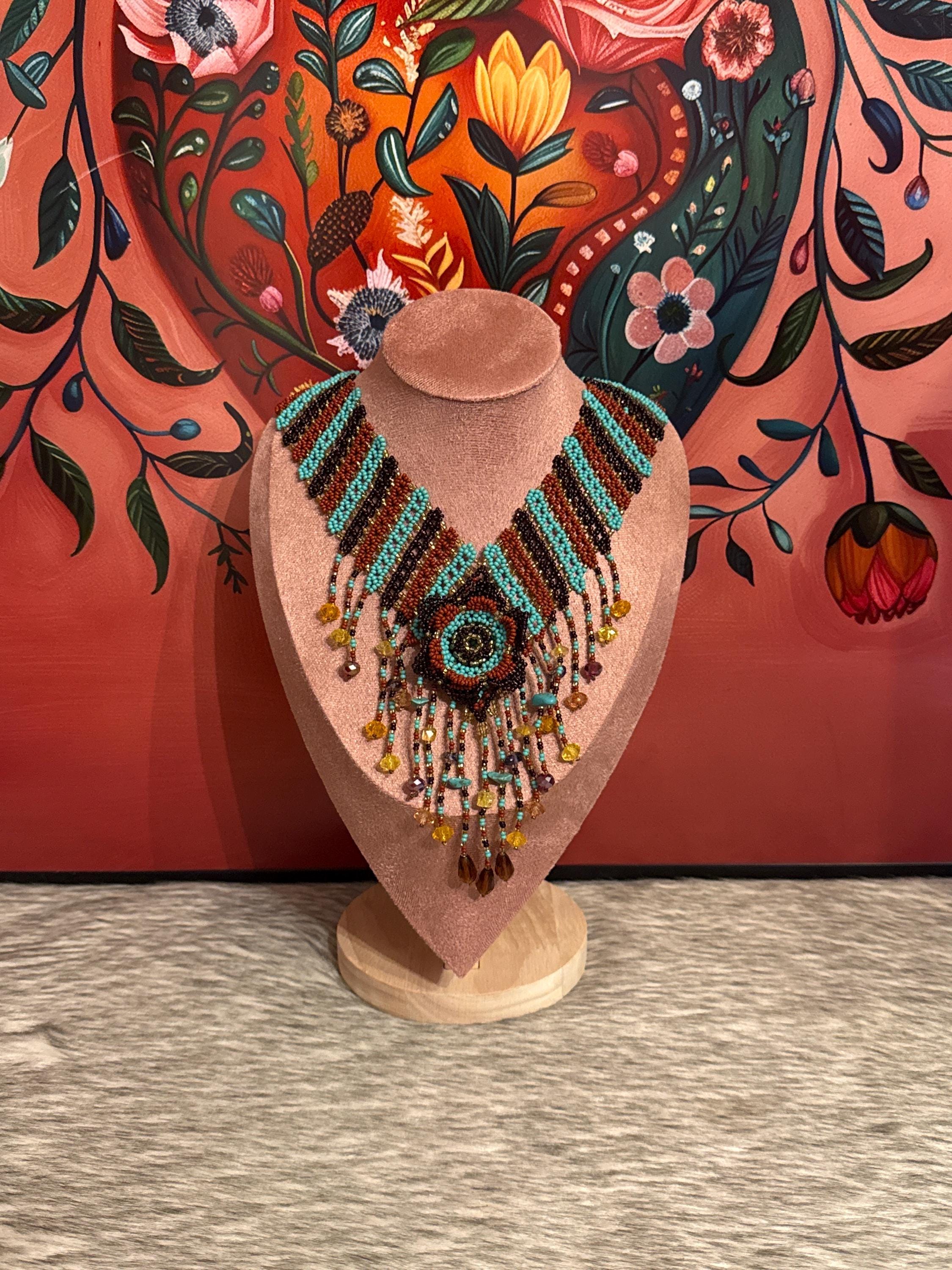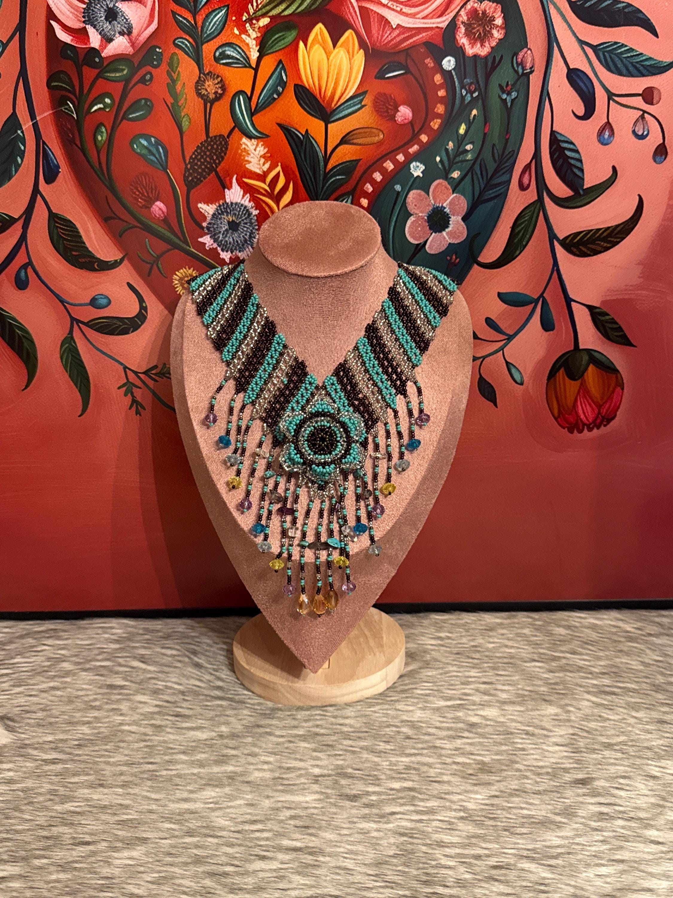 All our pieces are genuine and each bead is handcrafted by artisans from the most representative areas of Huichol art. Beautiful set of necklace, earrings and bracelet, made with beads by Mexican artisans.