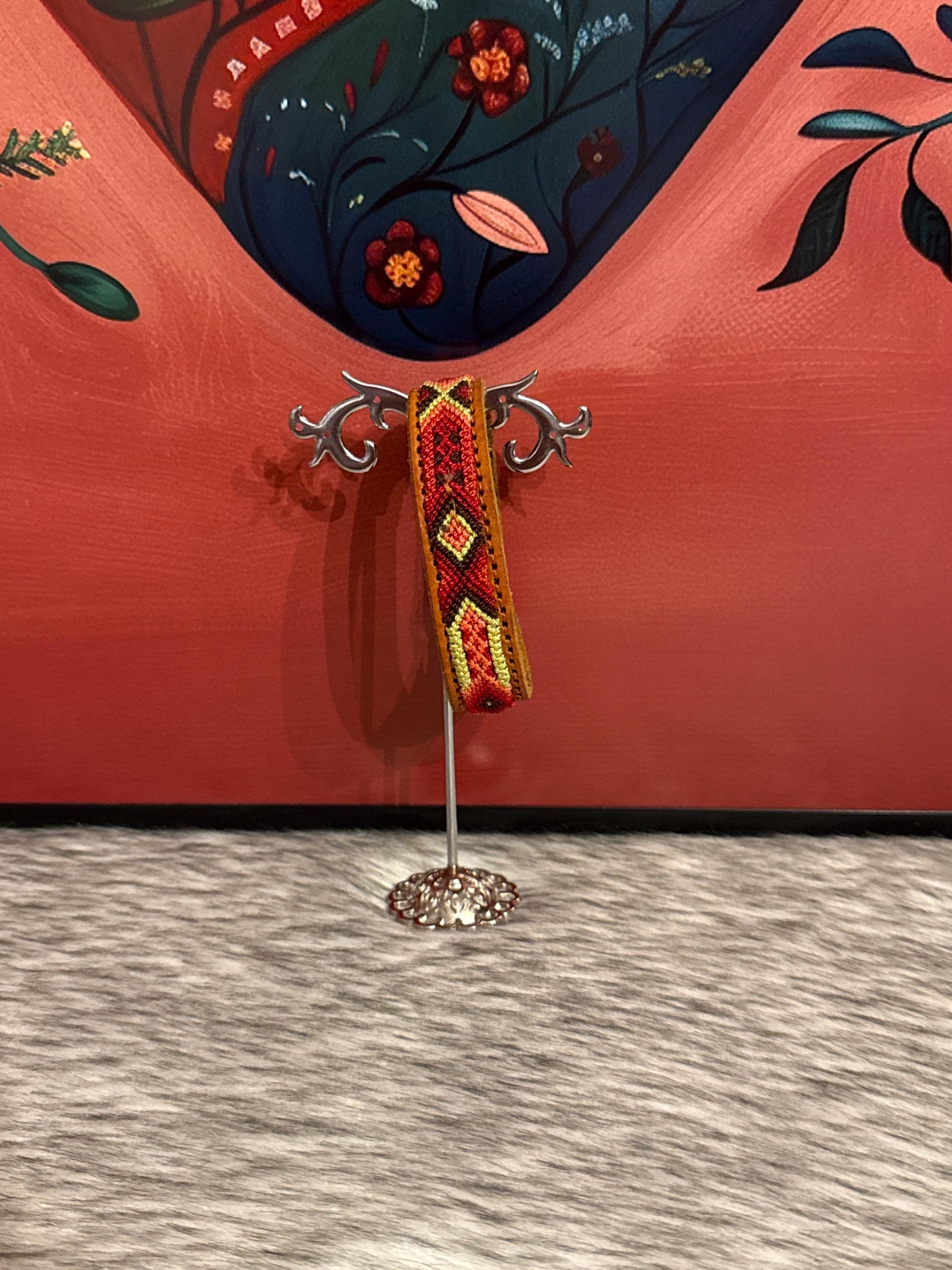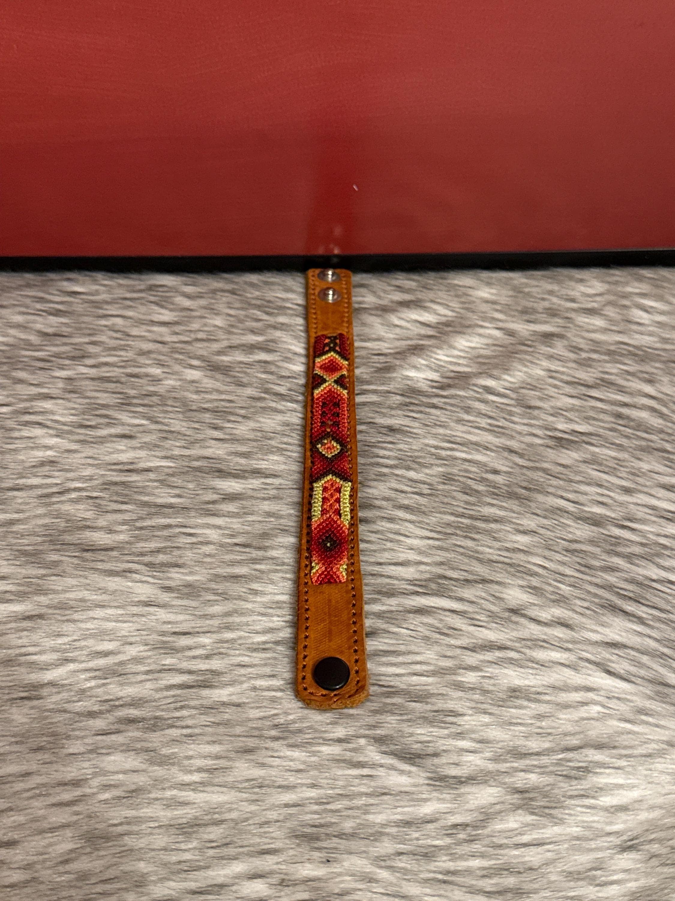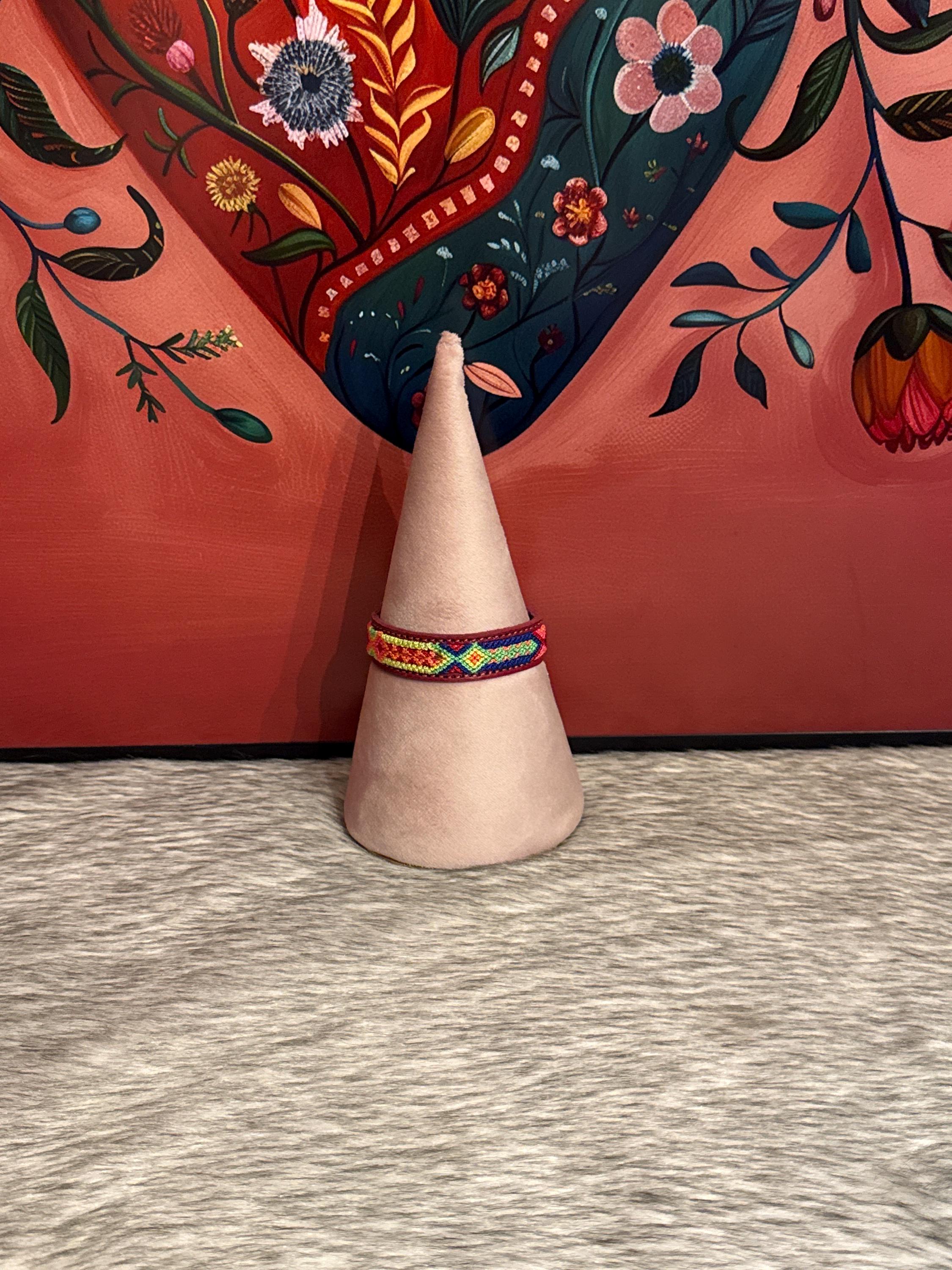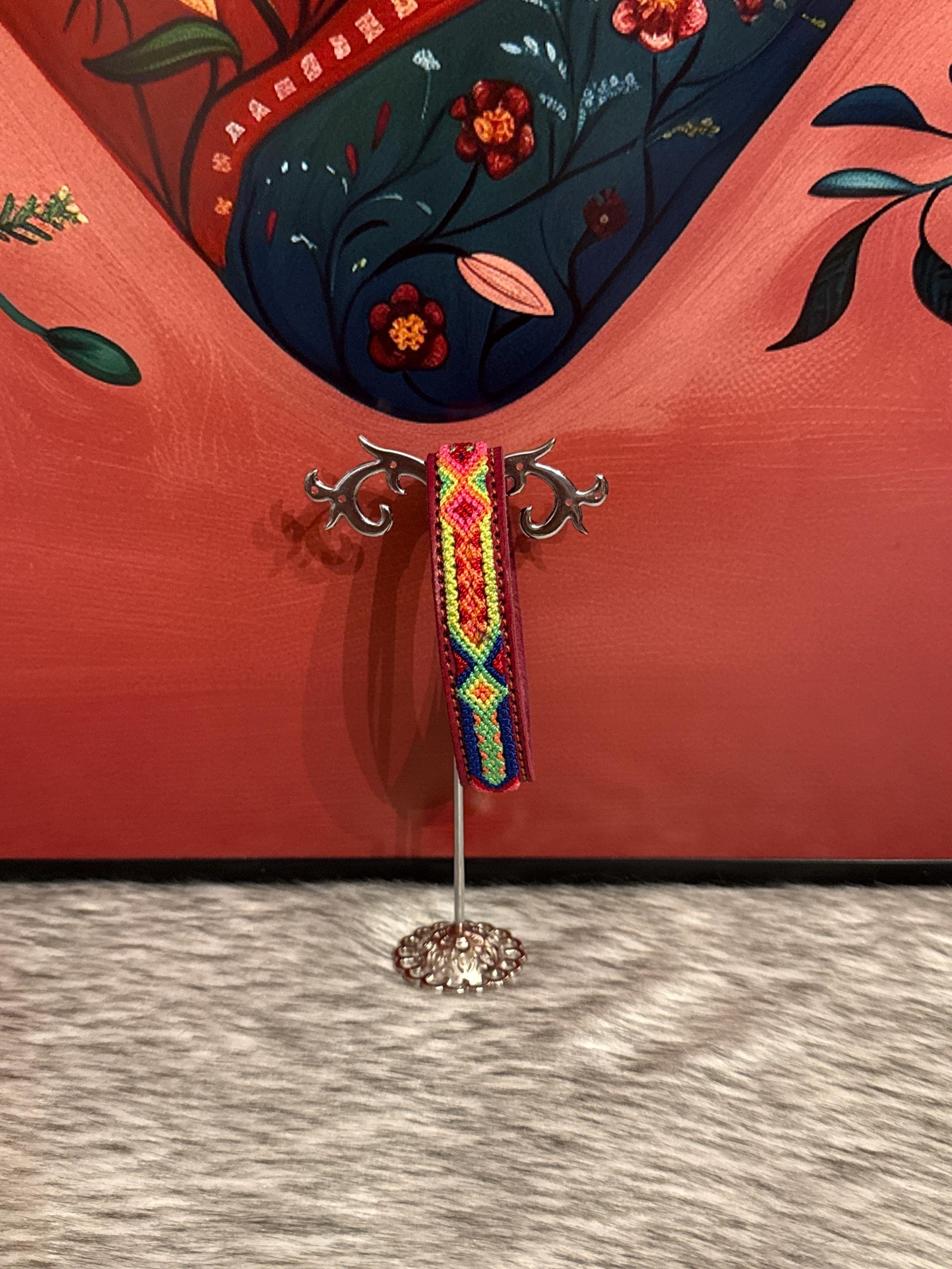 Woven leather bracelets with silk thread in macrame style. The bracelets measure approximately 8 inches long by 1/2 inch wide.