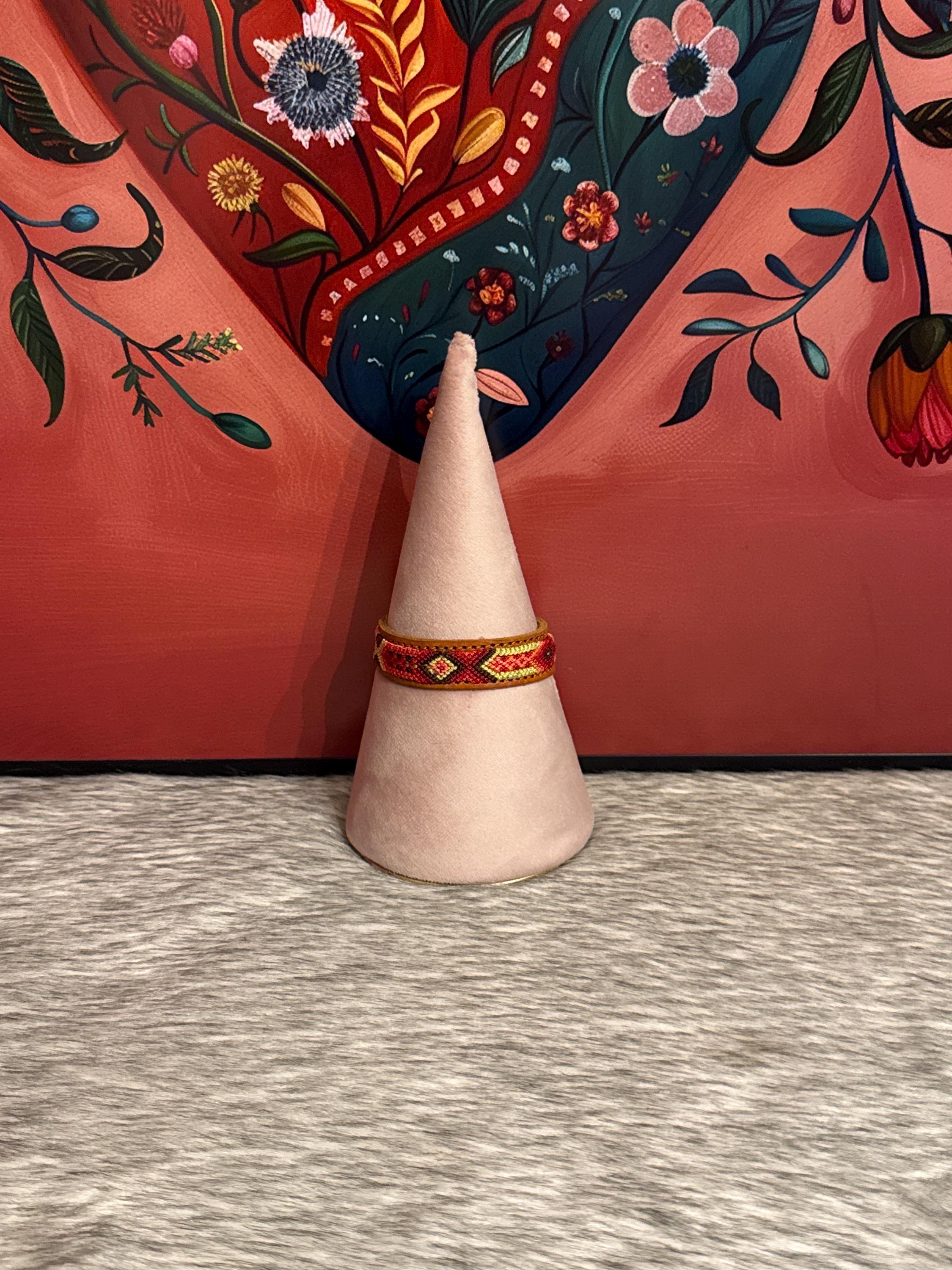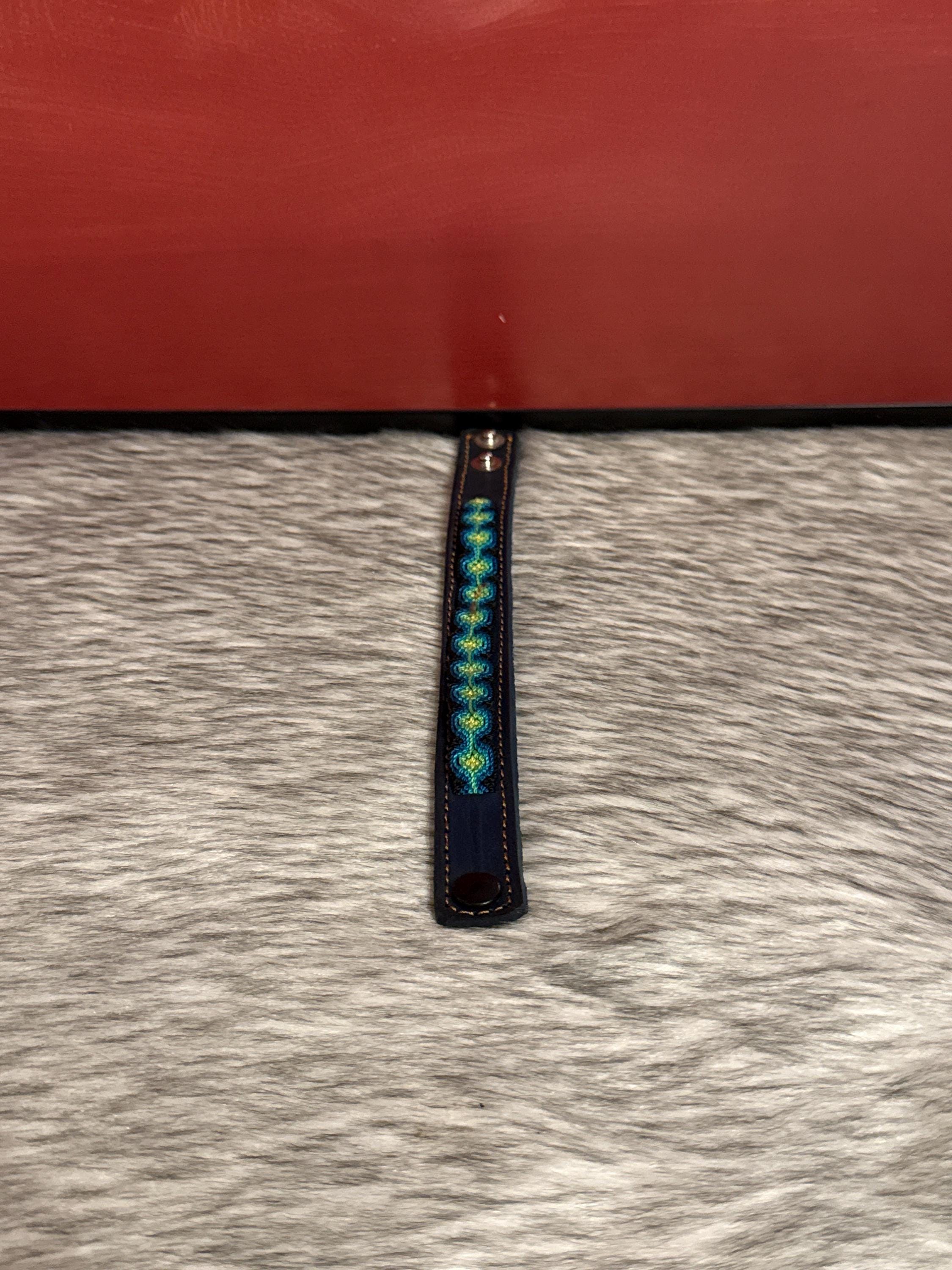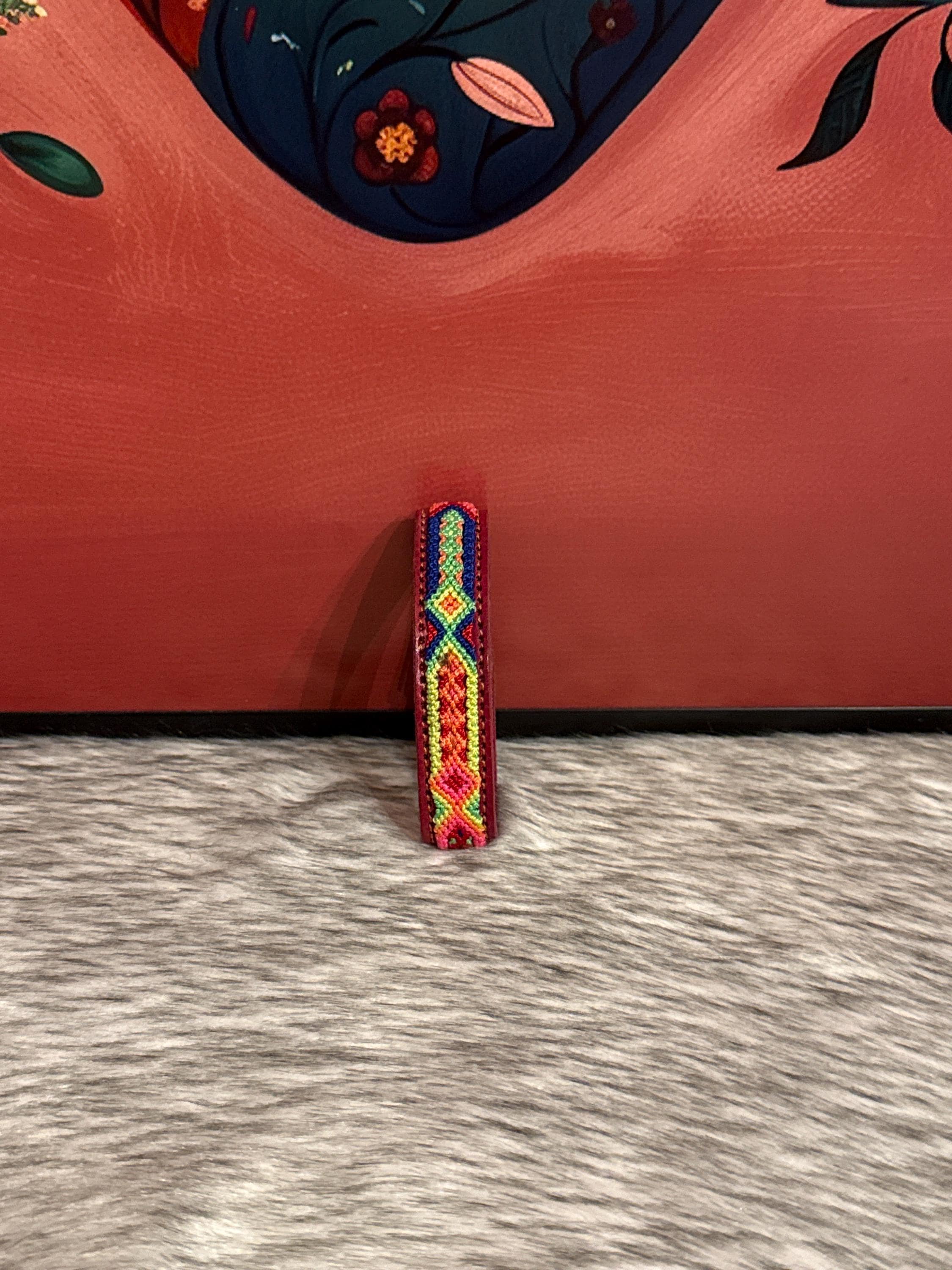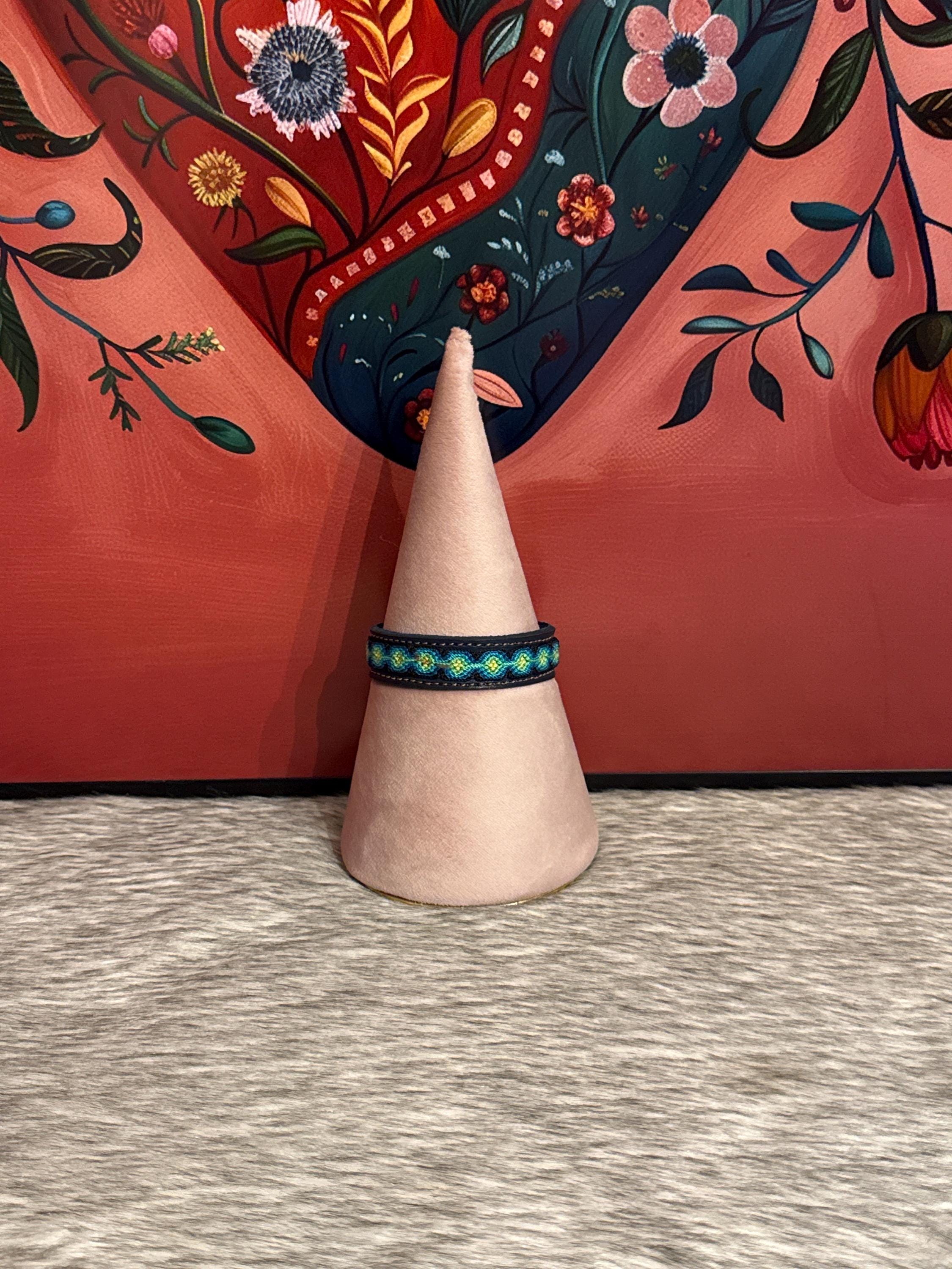 Woven leather bracelets with silk thread in macrame style. The bracelets measure approximately 8 inches long by 1/2 inch wide.
