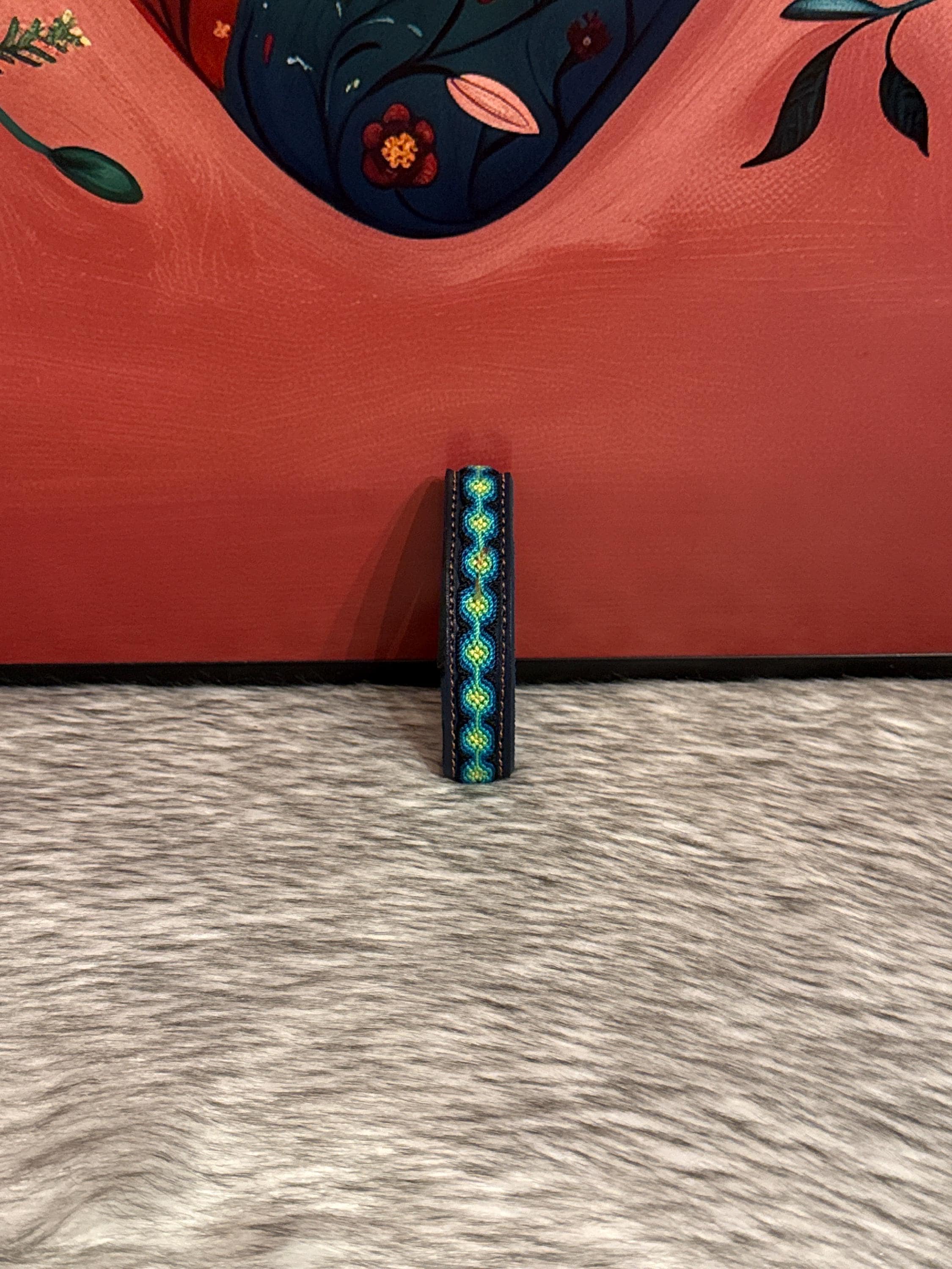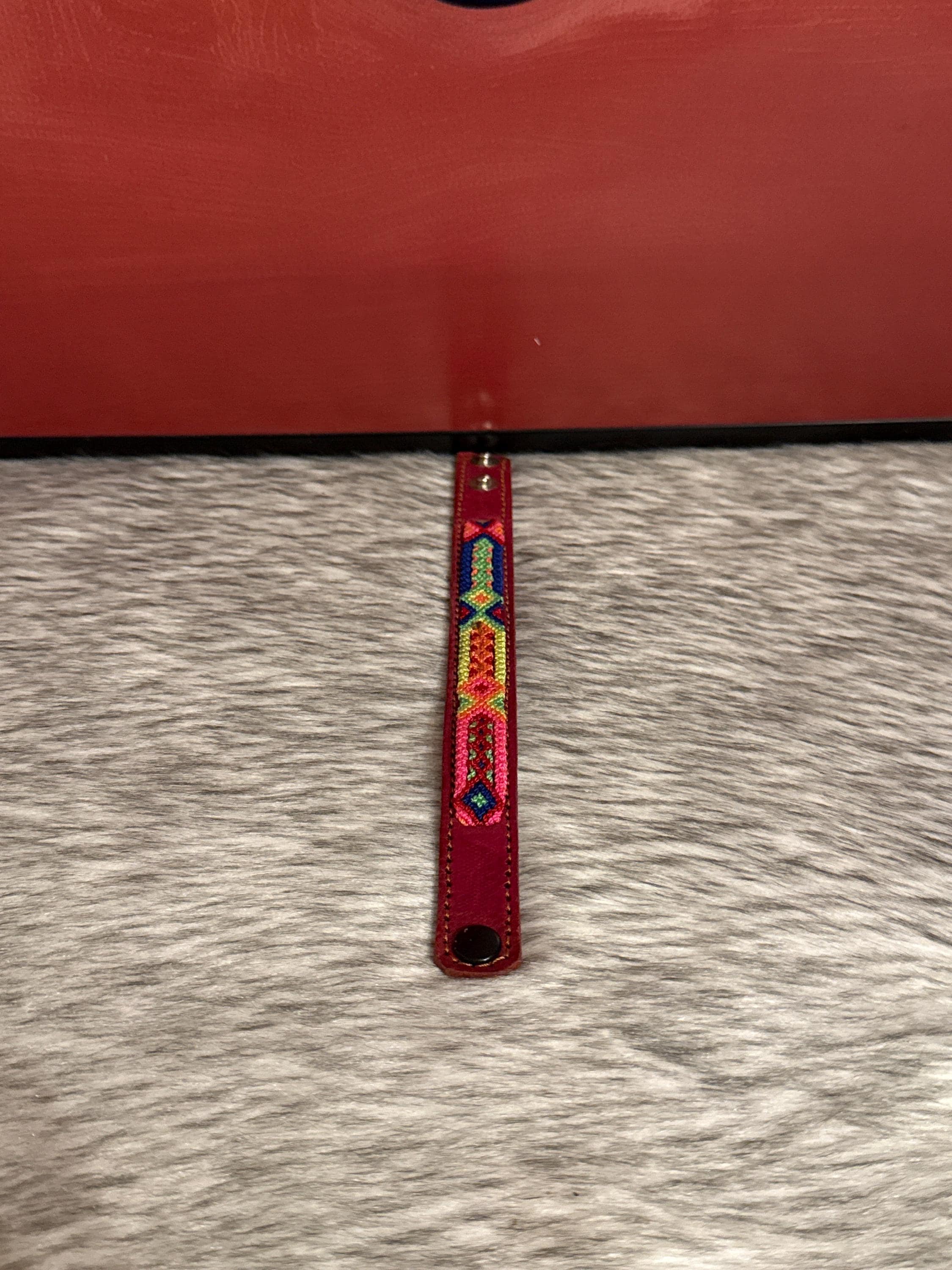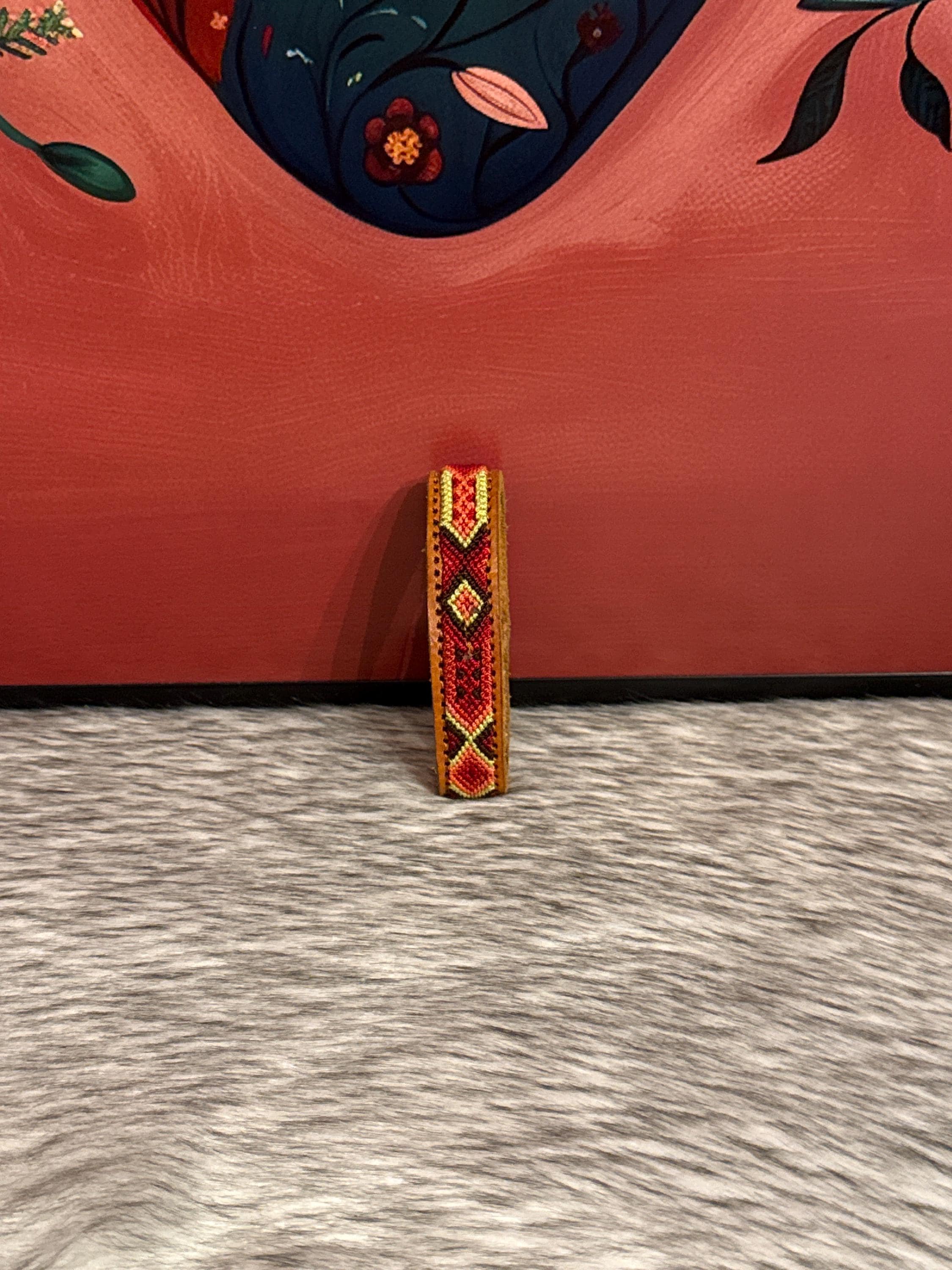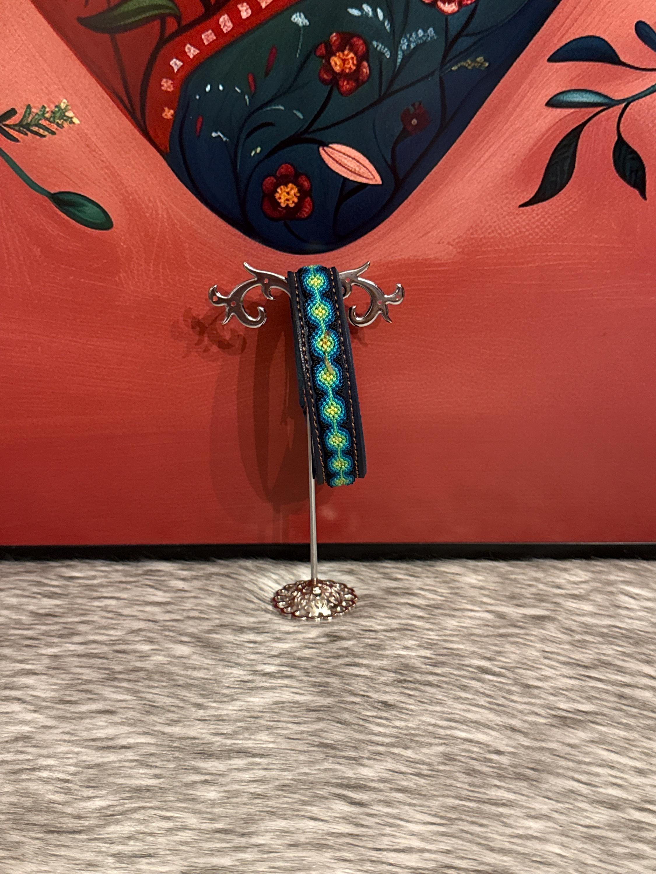 Woven leather bracelets with silk thread in macrame style. The bracelets measure approximately 8 inches long by 1/2 inch wide.