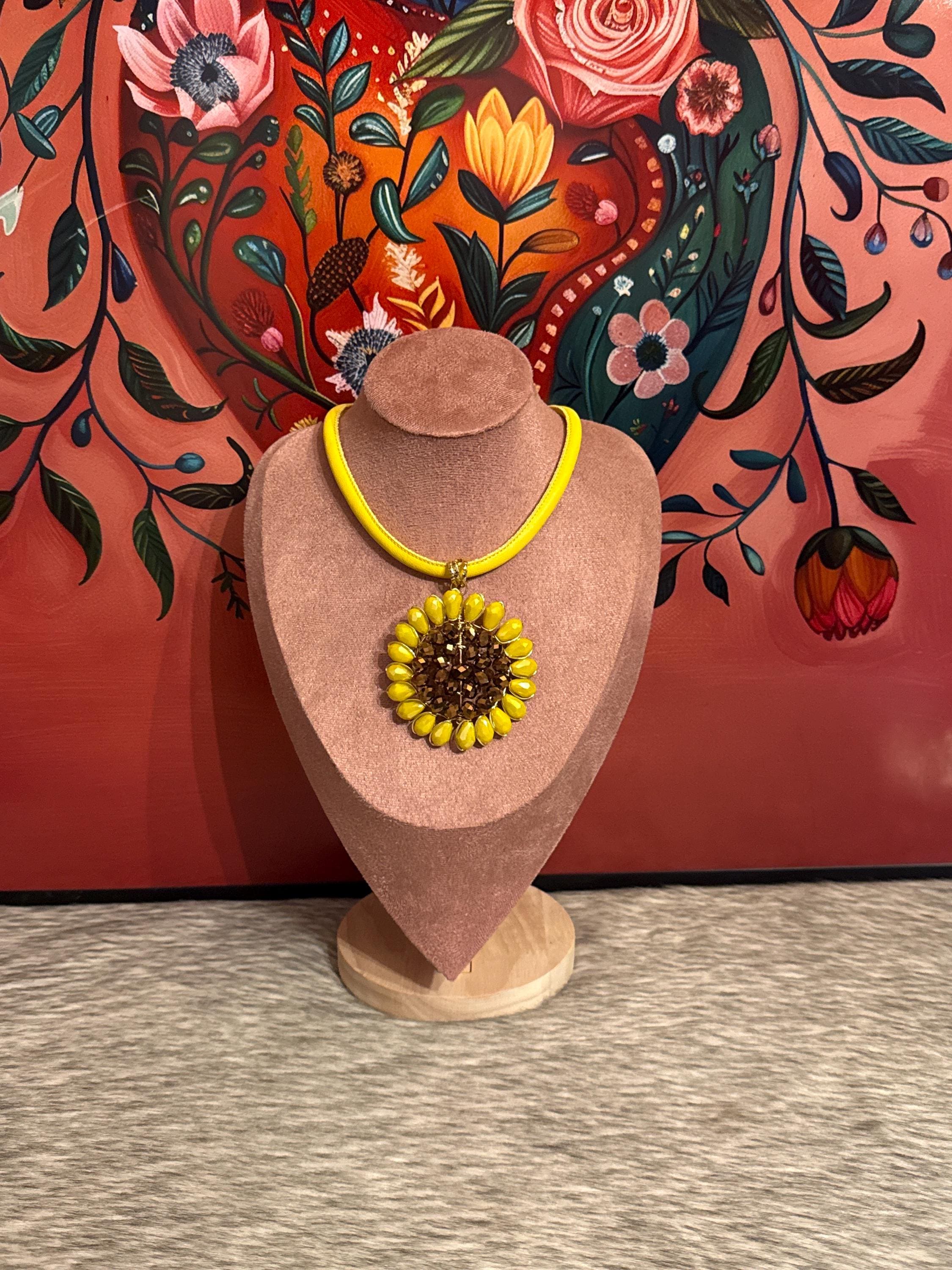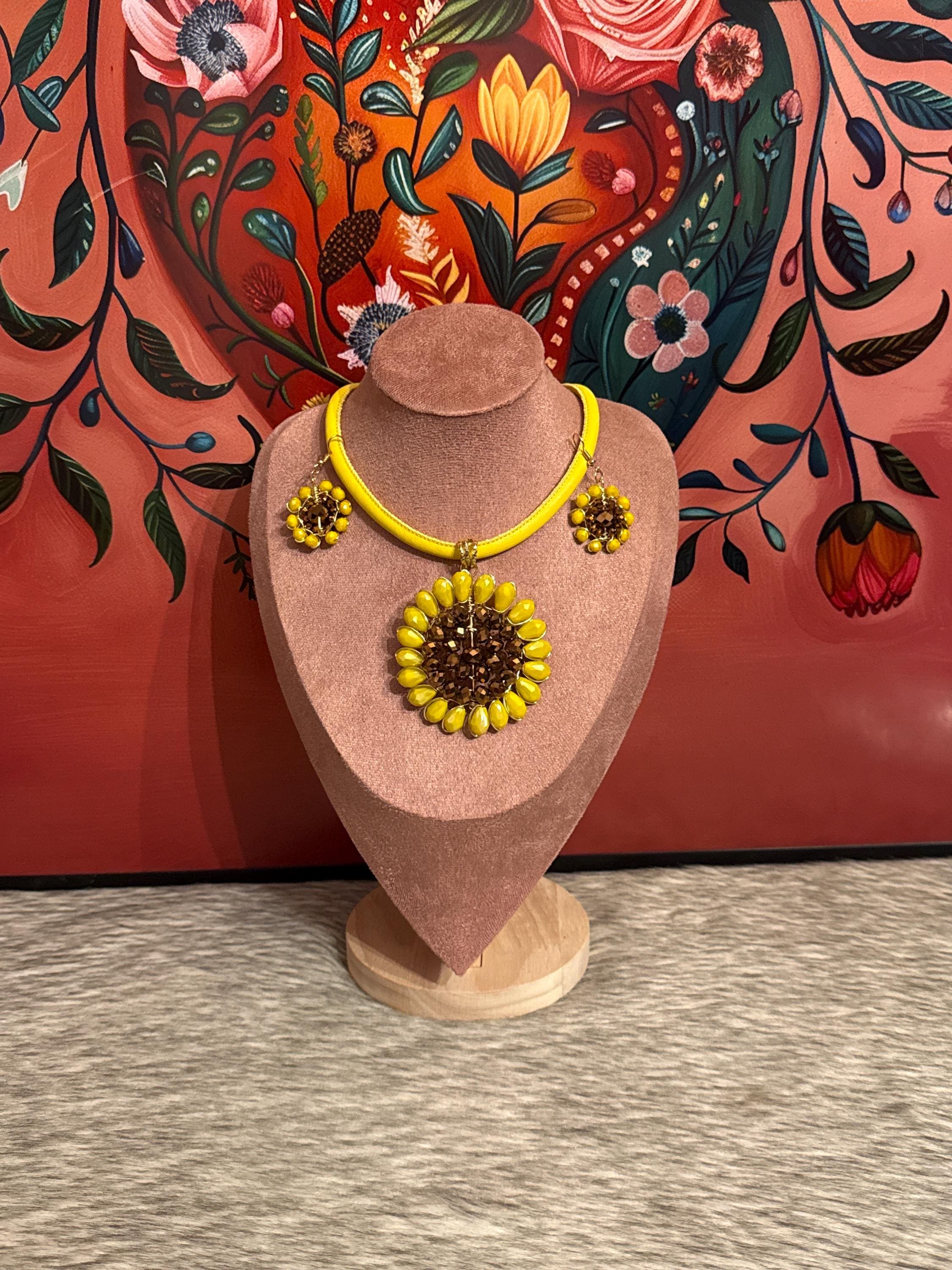 Beautiful necklace set made of synthetic leather and a pendant crafted with crystal and wire wrapping technique, with 14k gold-plated materials.