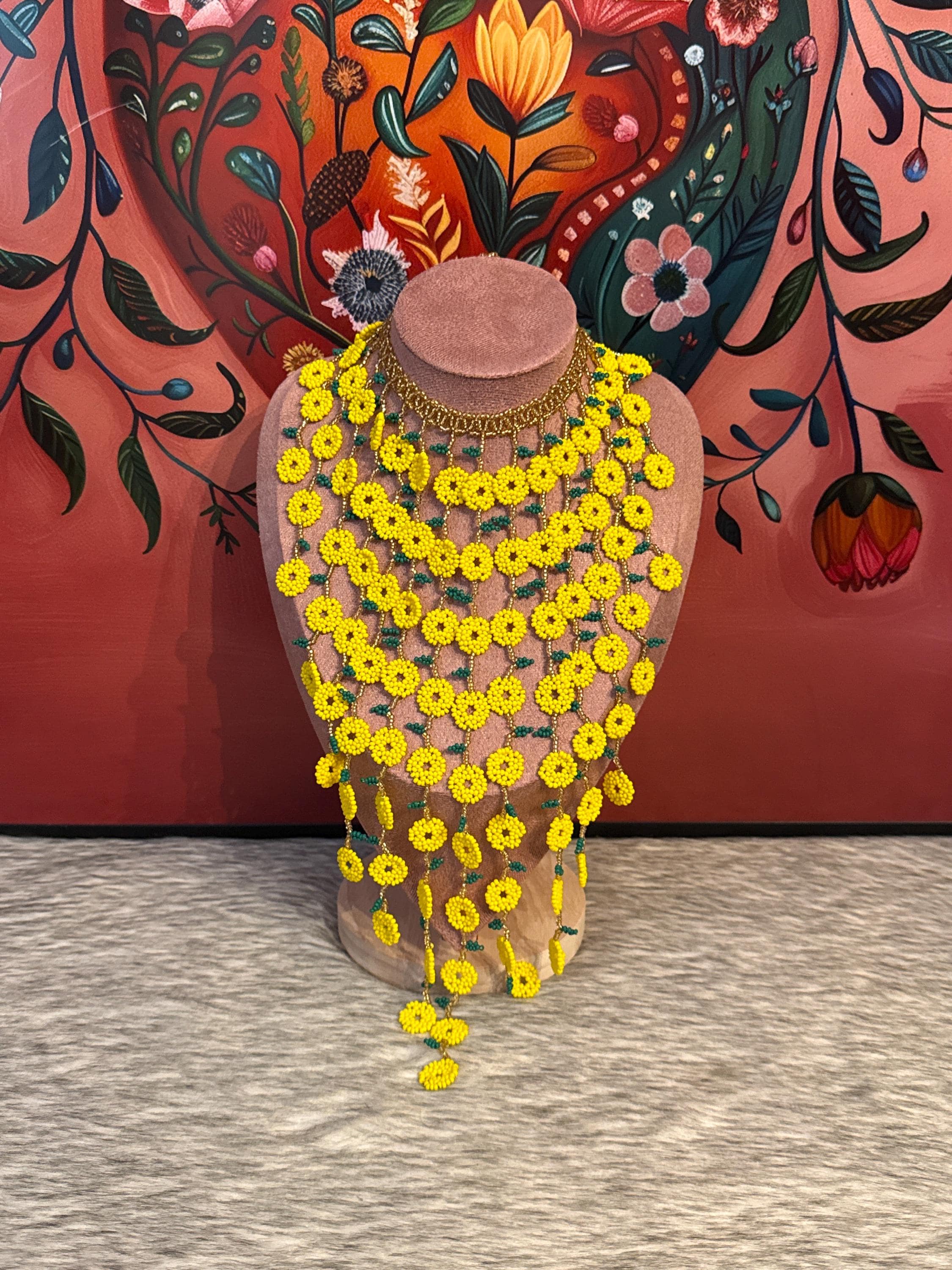 Beautiful necklace and earrings with round flowers, made with beads by Mexican artisans, are a colorful piece that enhances any outfit.