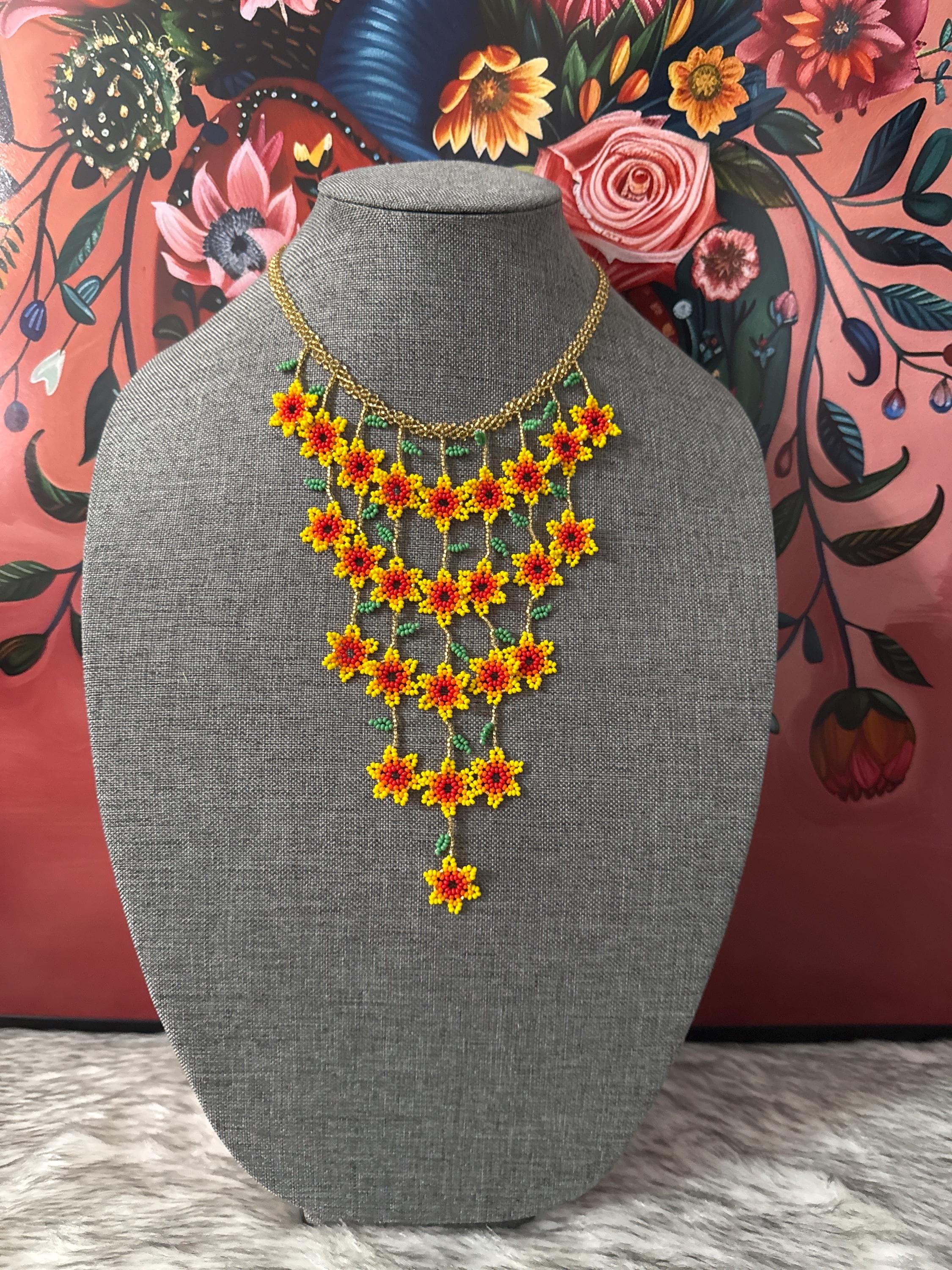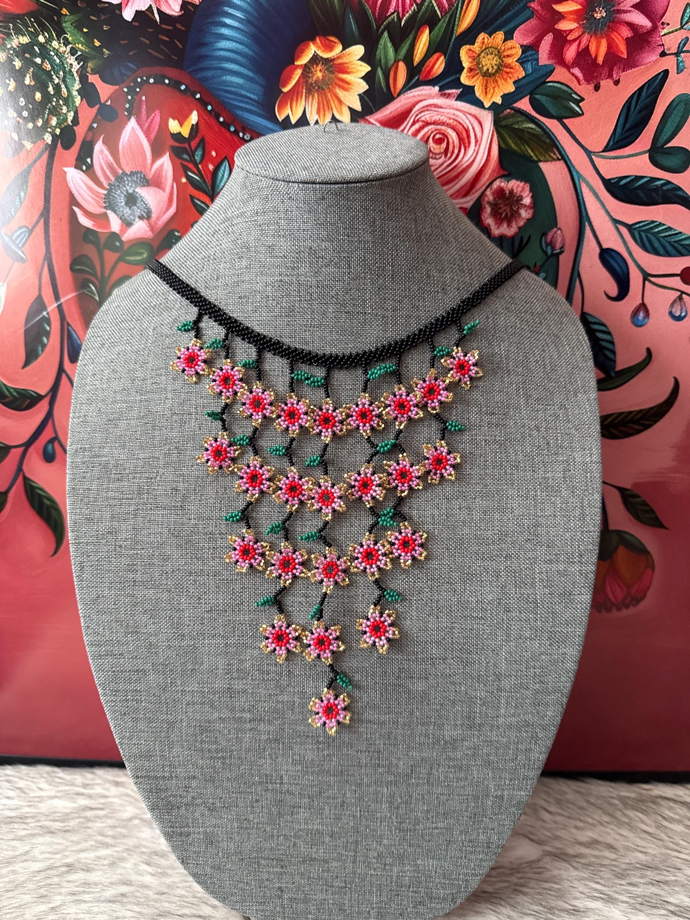 Beautiful mini flower waterfall necklace, small in size but large in color, made with beads by Mexican artisans. The necklaces measure approximately 6 inches long and have approximately 25 flowers.