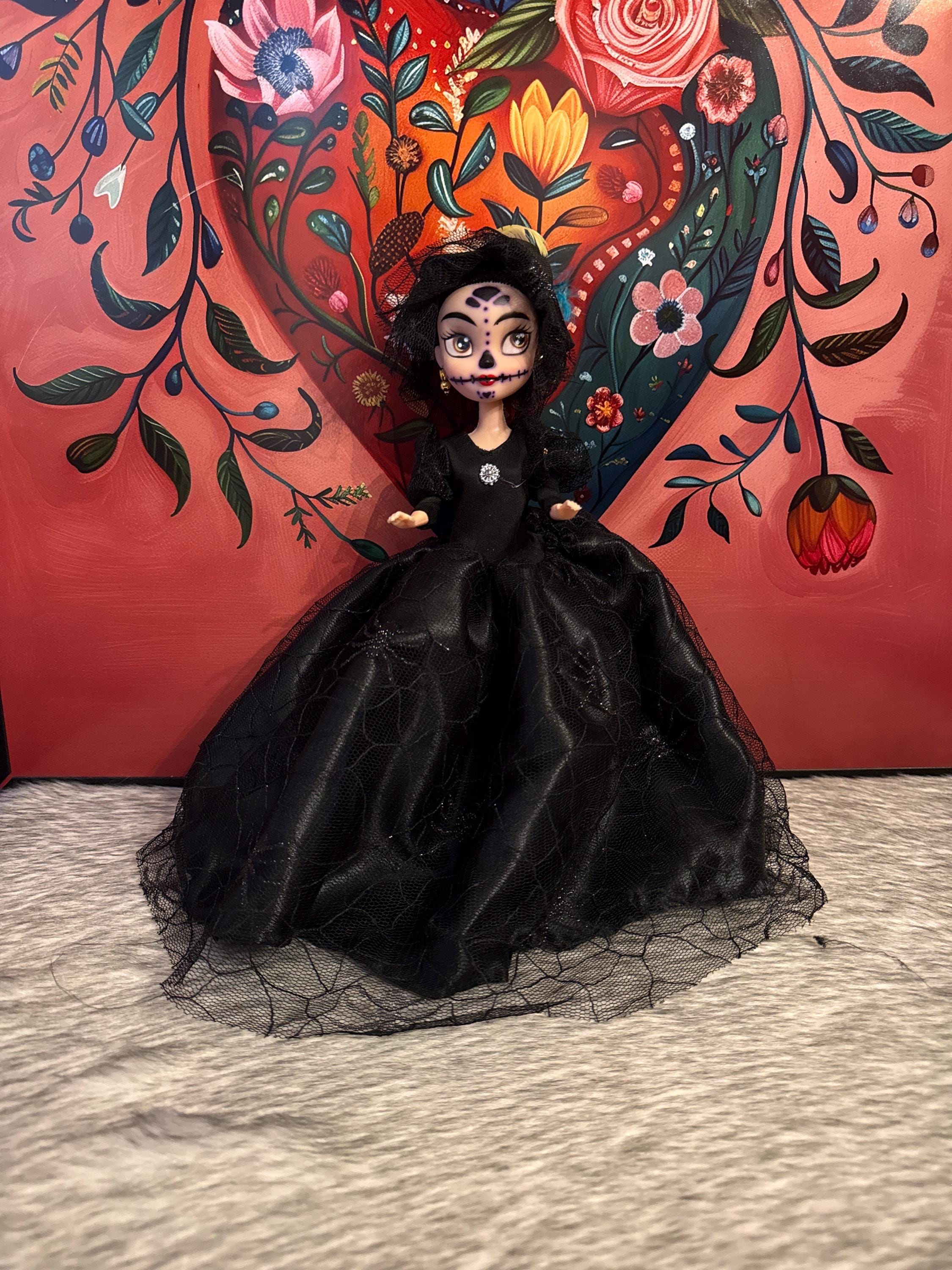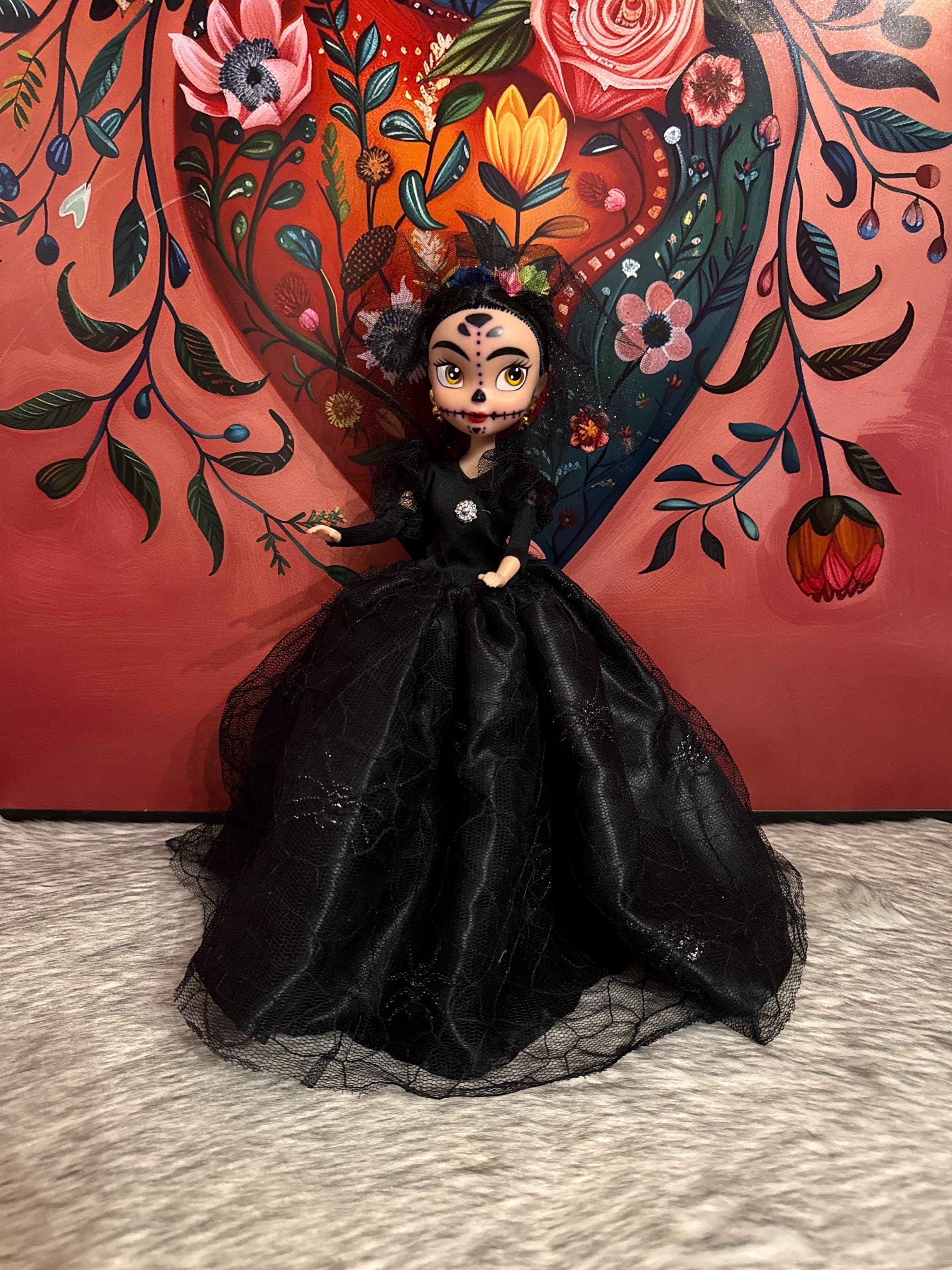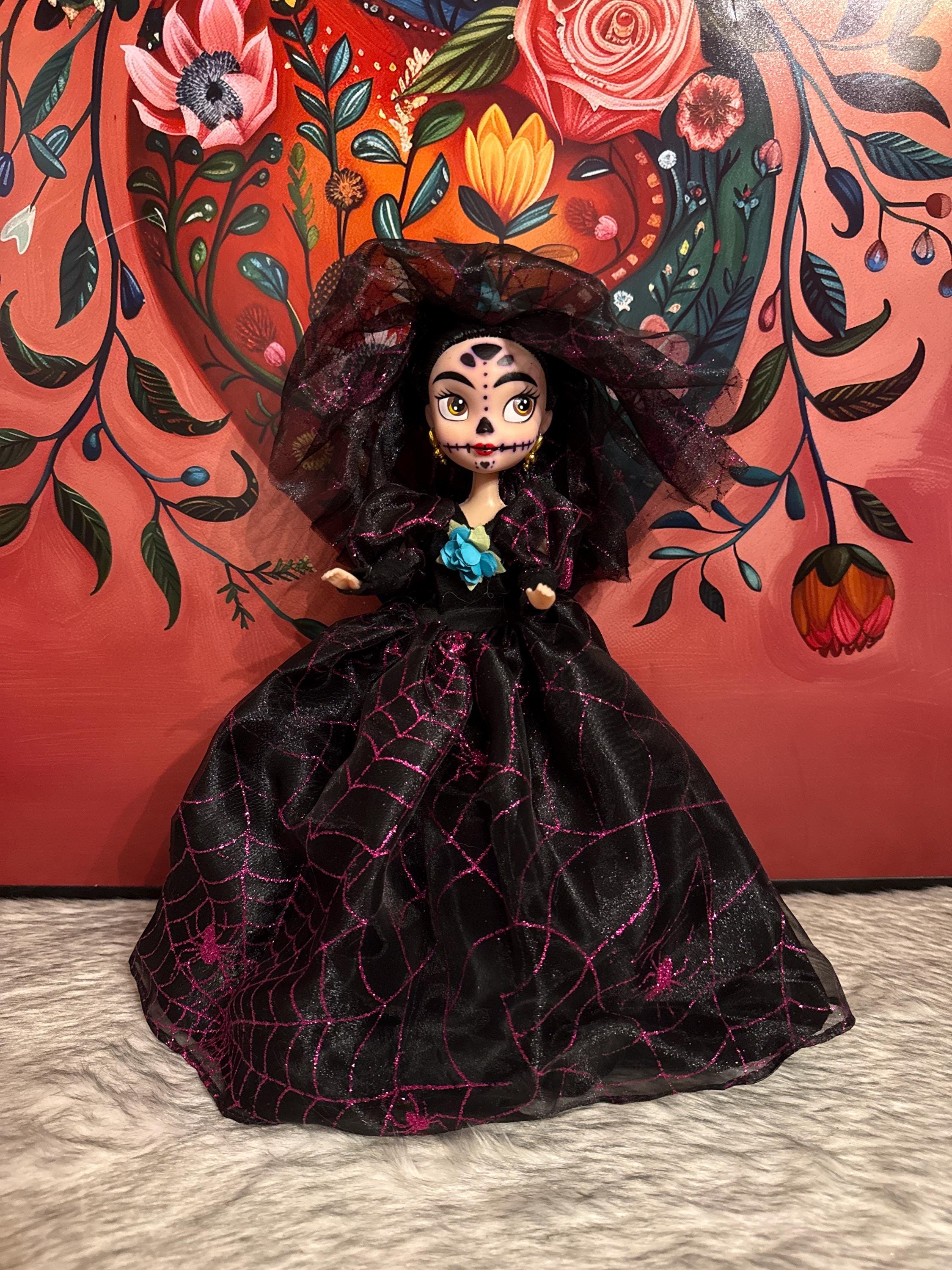 Beautiful handmade Catrina dolls, also known as seasonal dolls, are crafted from polyester, cotton, lace, and tulle fabrics. Each doll includes a full dress, hat or veil, shoes, panties, and a stand. We only have one of each style available. If you would like two or more of the same style, they can be made within 1 to 3 weeks. They are approximately 13 inches tall.