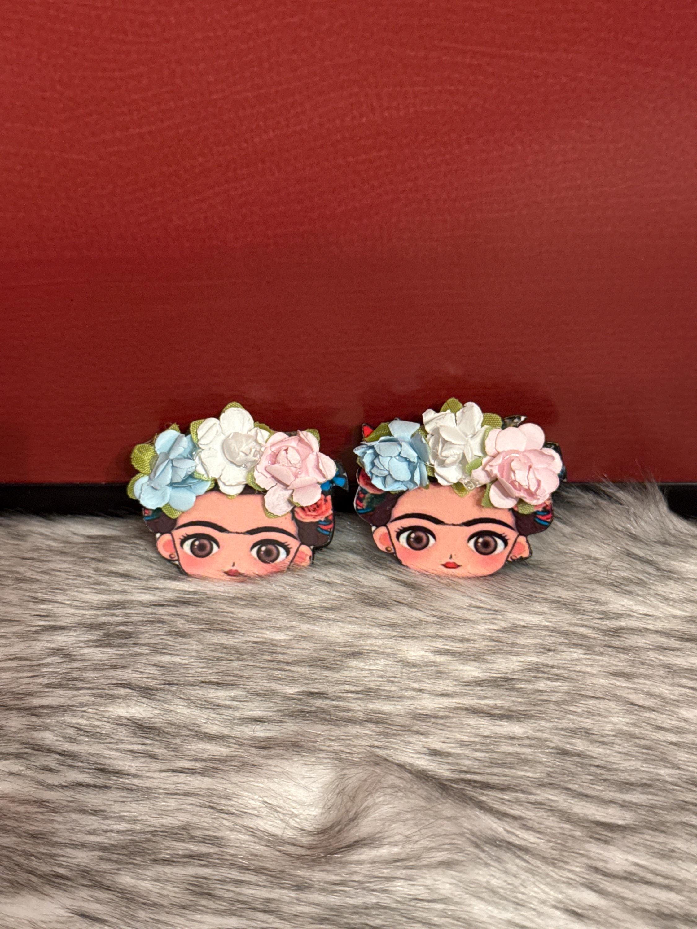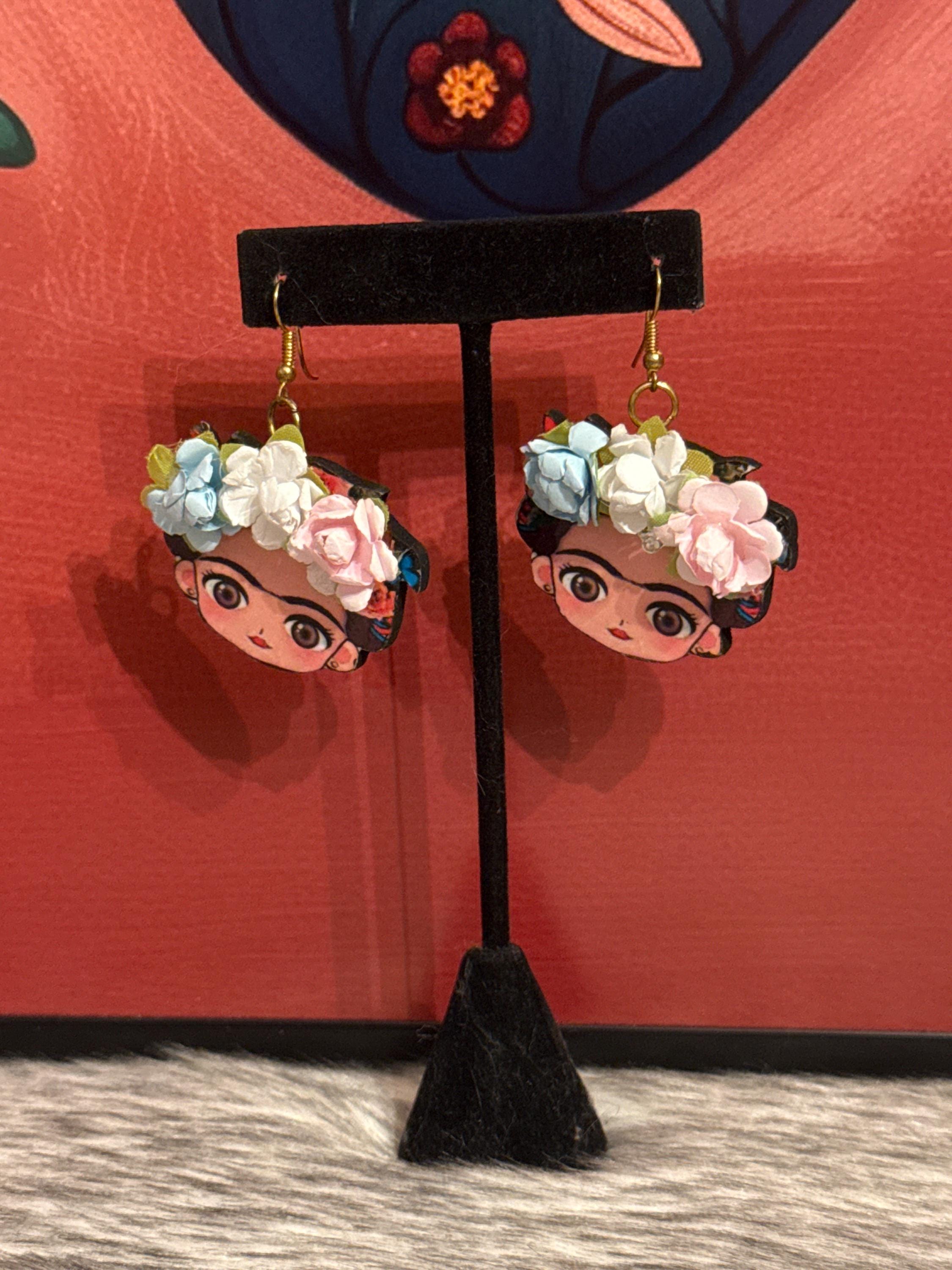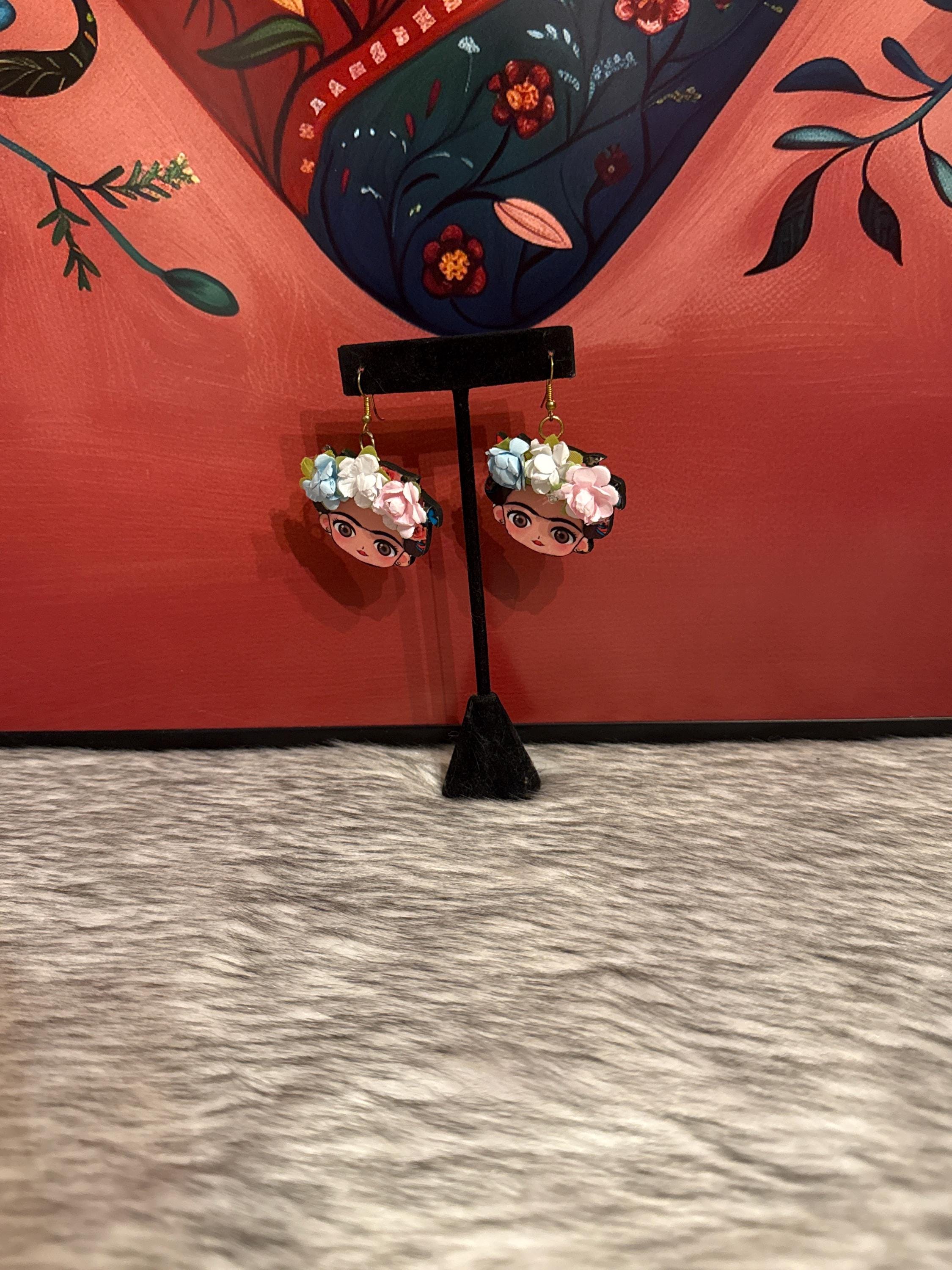 Beautiful Frida earrings, made of wood and sublimated print, 1.5 inches tall.
