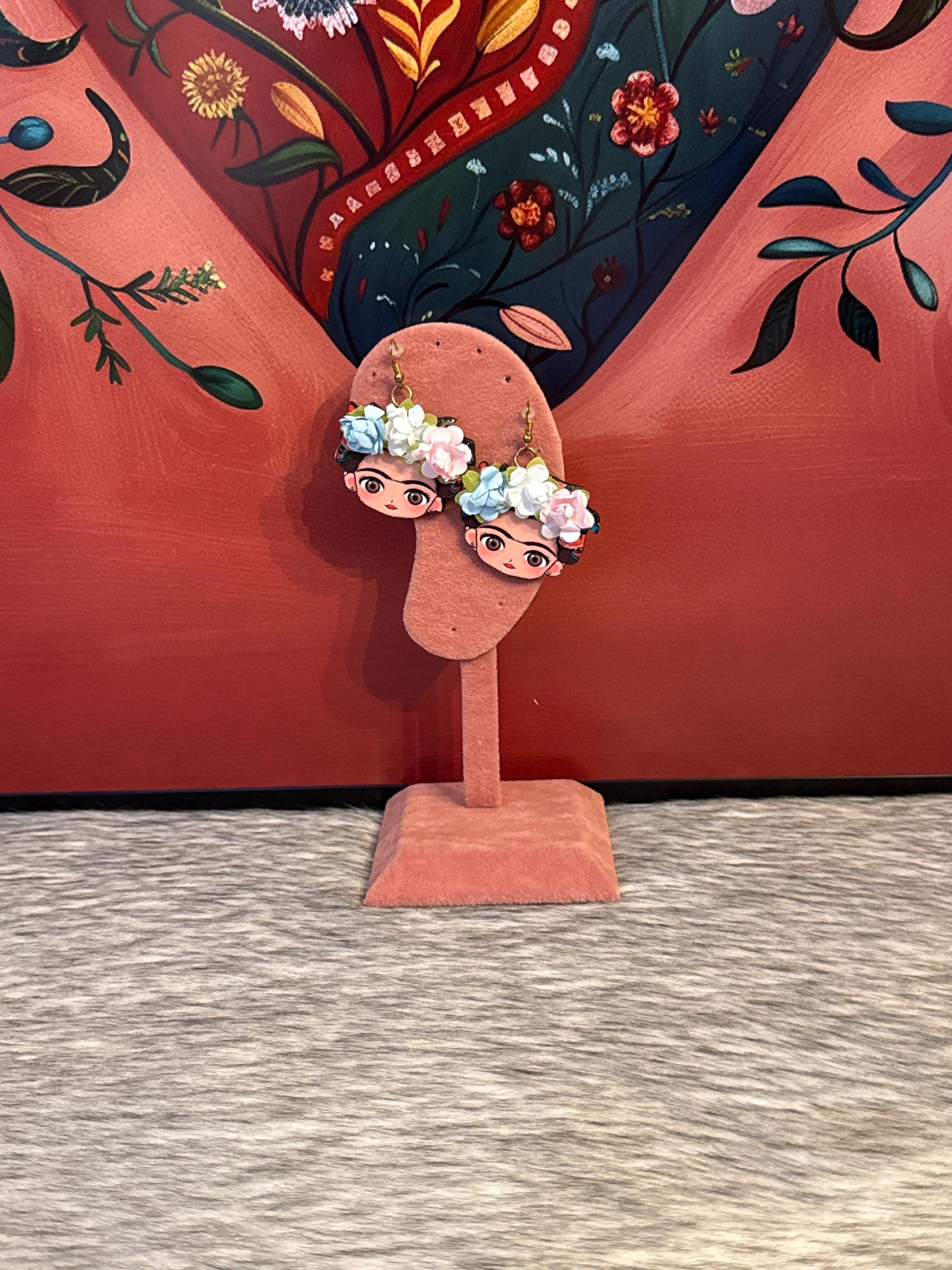 Beautiful Frida earrings, made of wood and sublimated print, 1.5 inches tall.