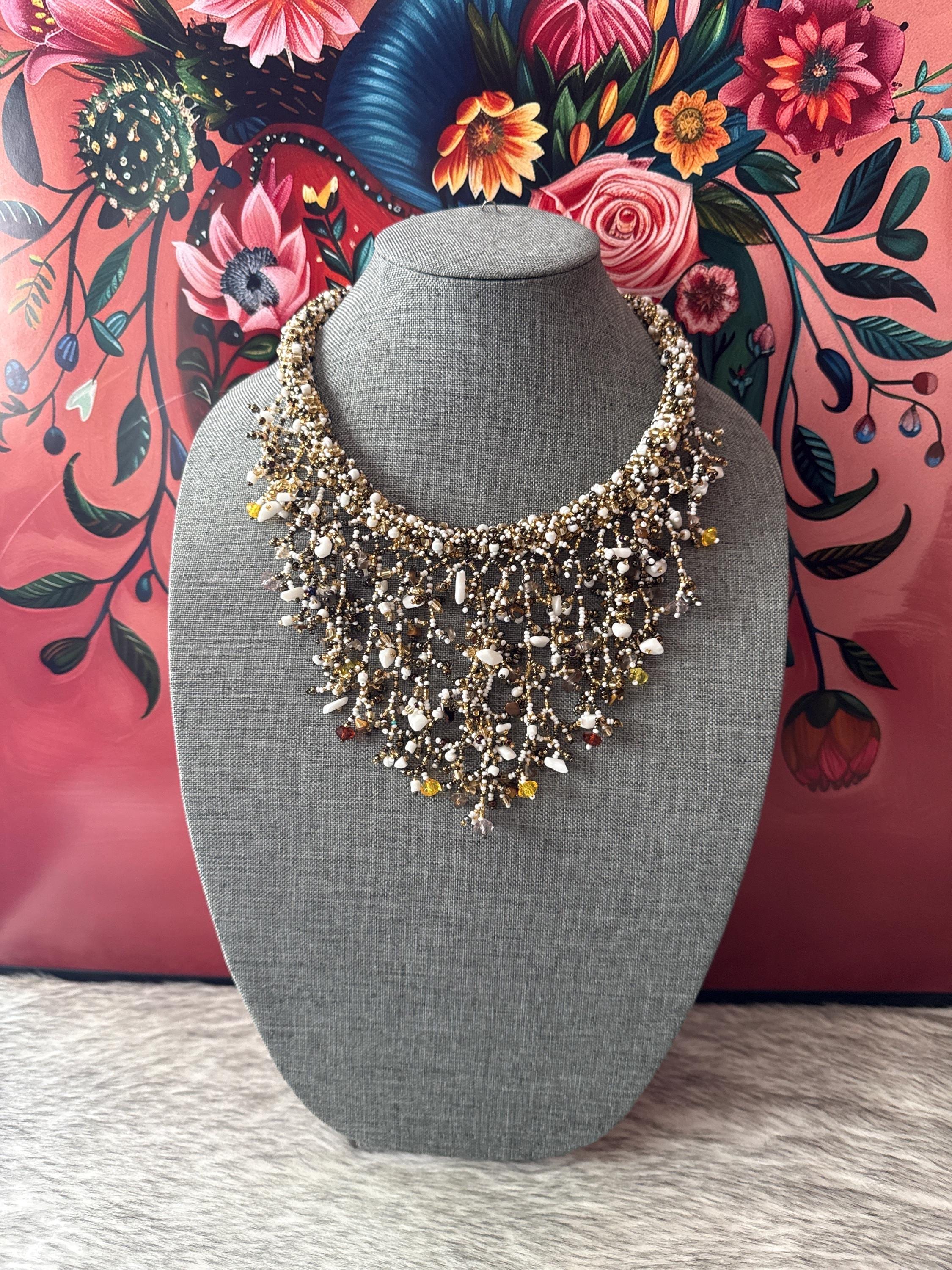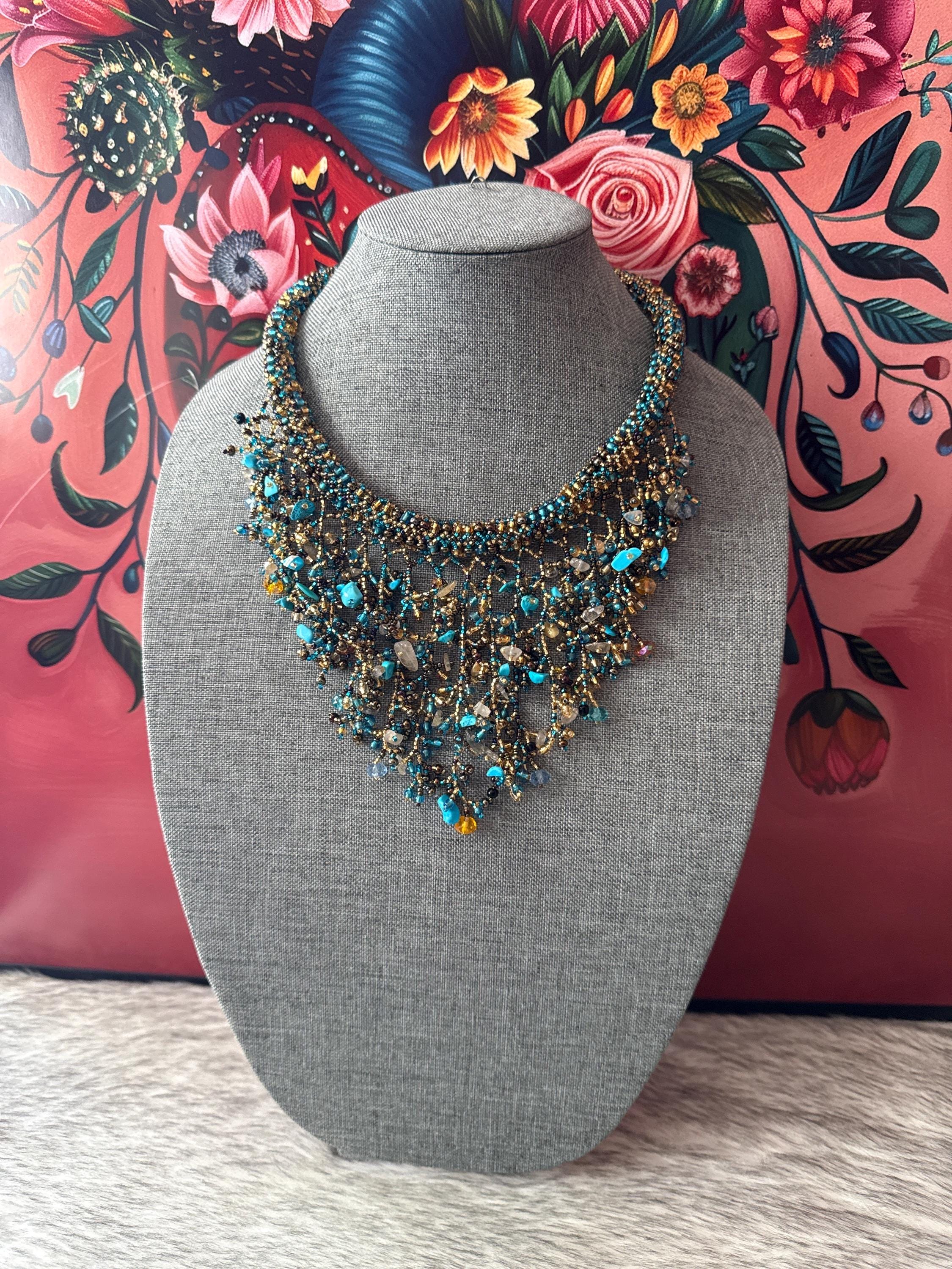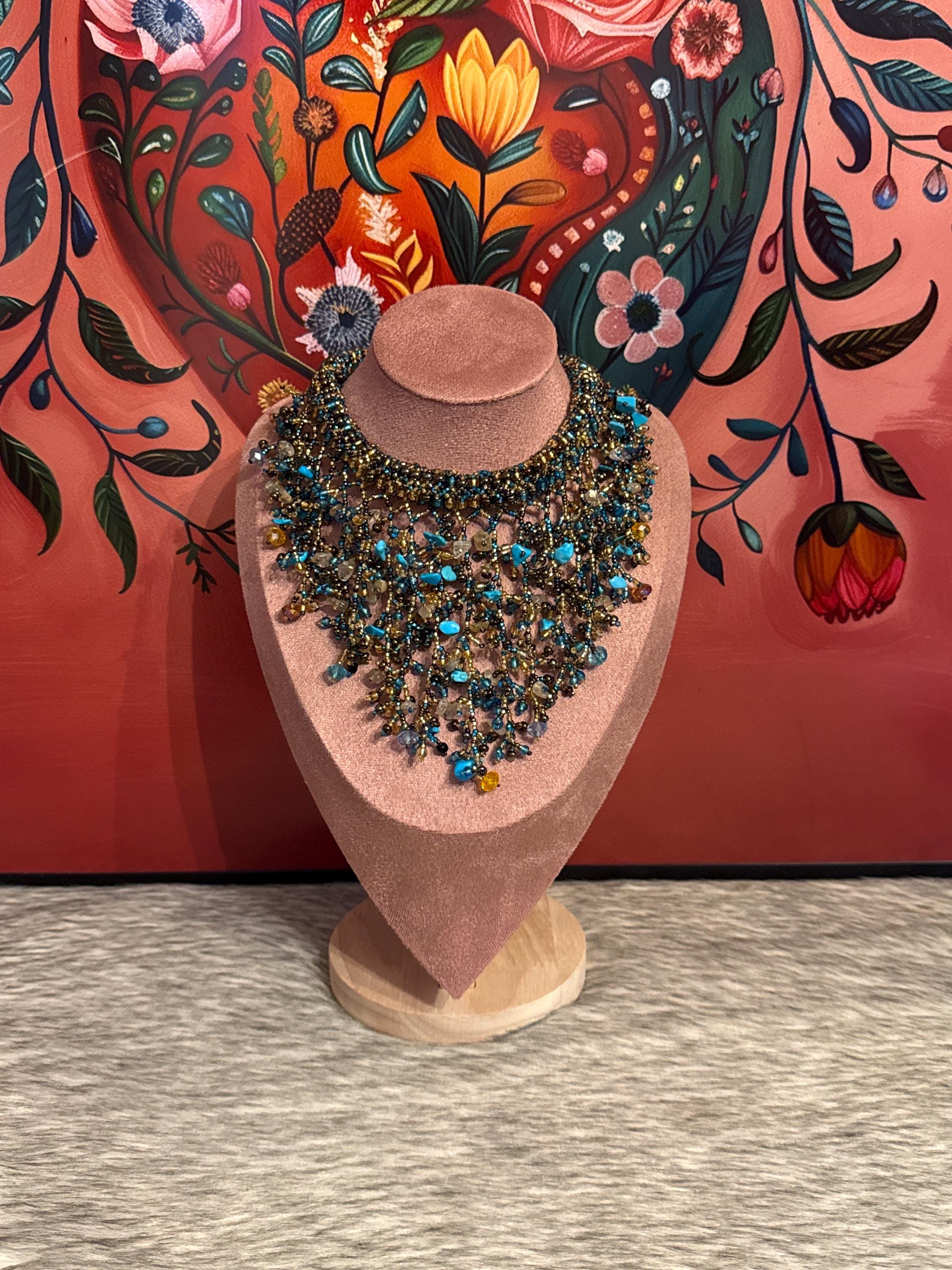 Beautiful necklace, bracelet, and earring set, made with beads, crystals, and stones, crafted by Mexican artisans.