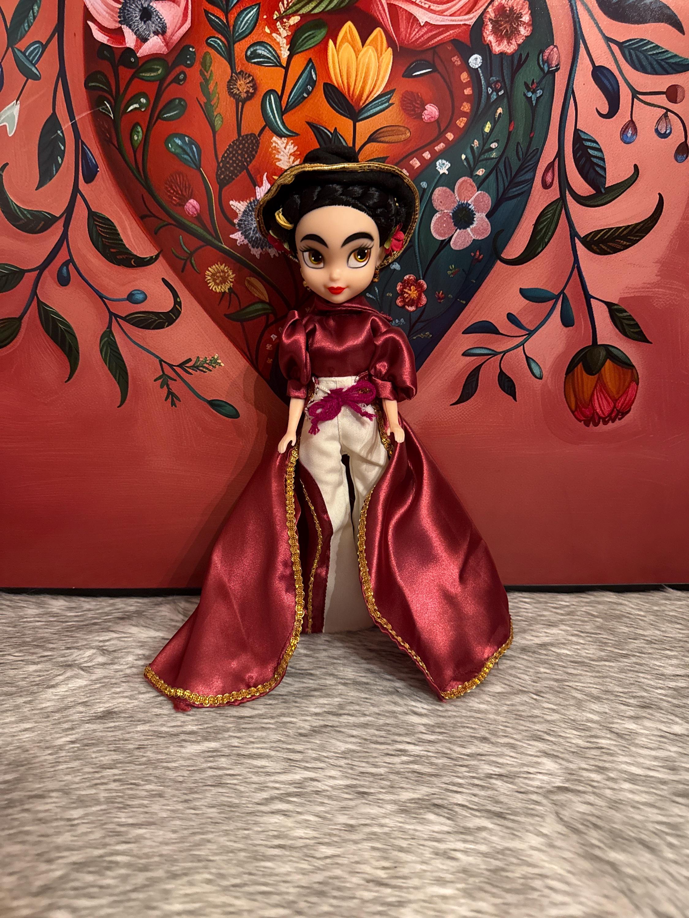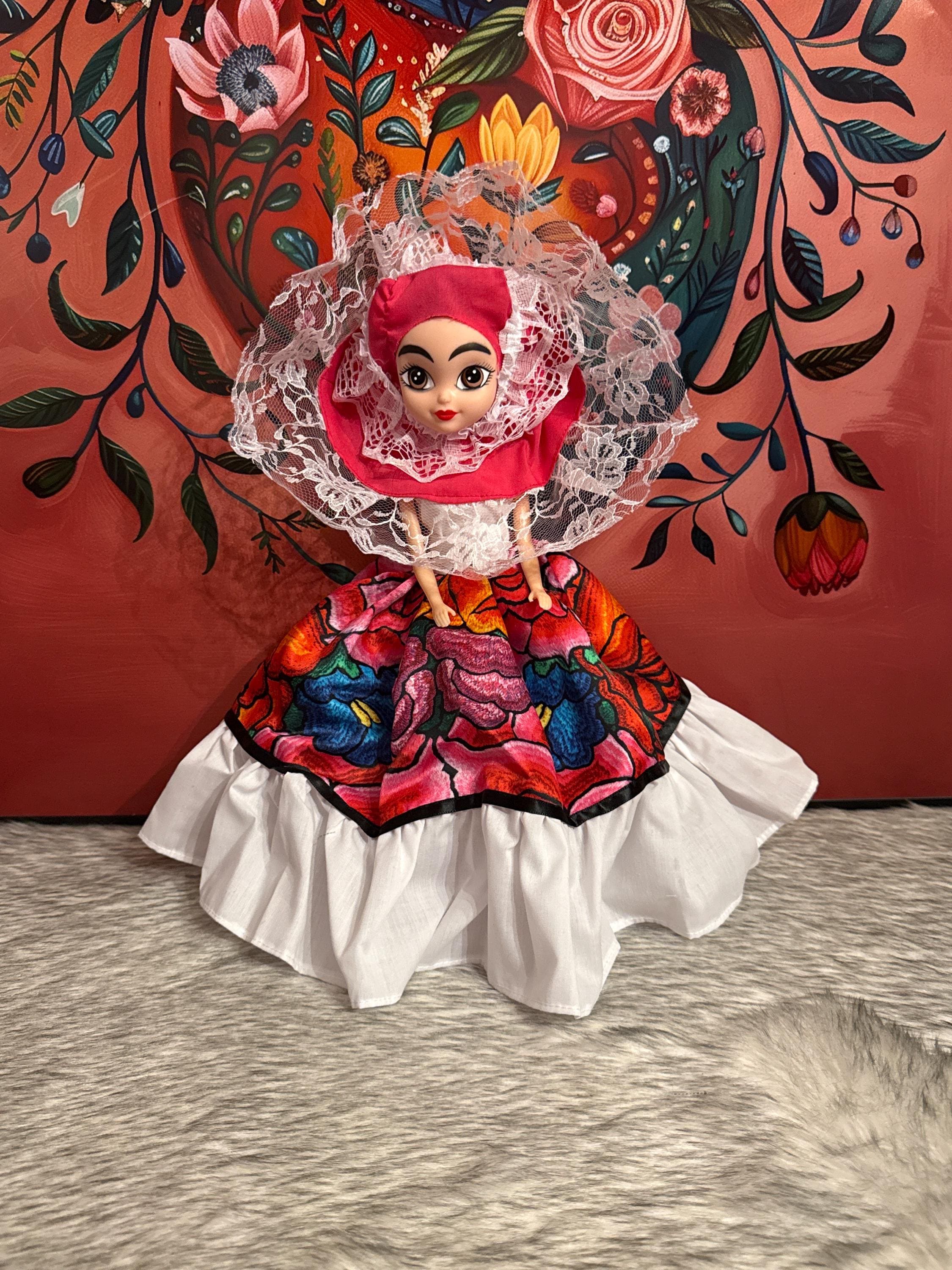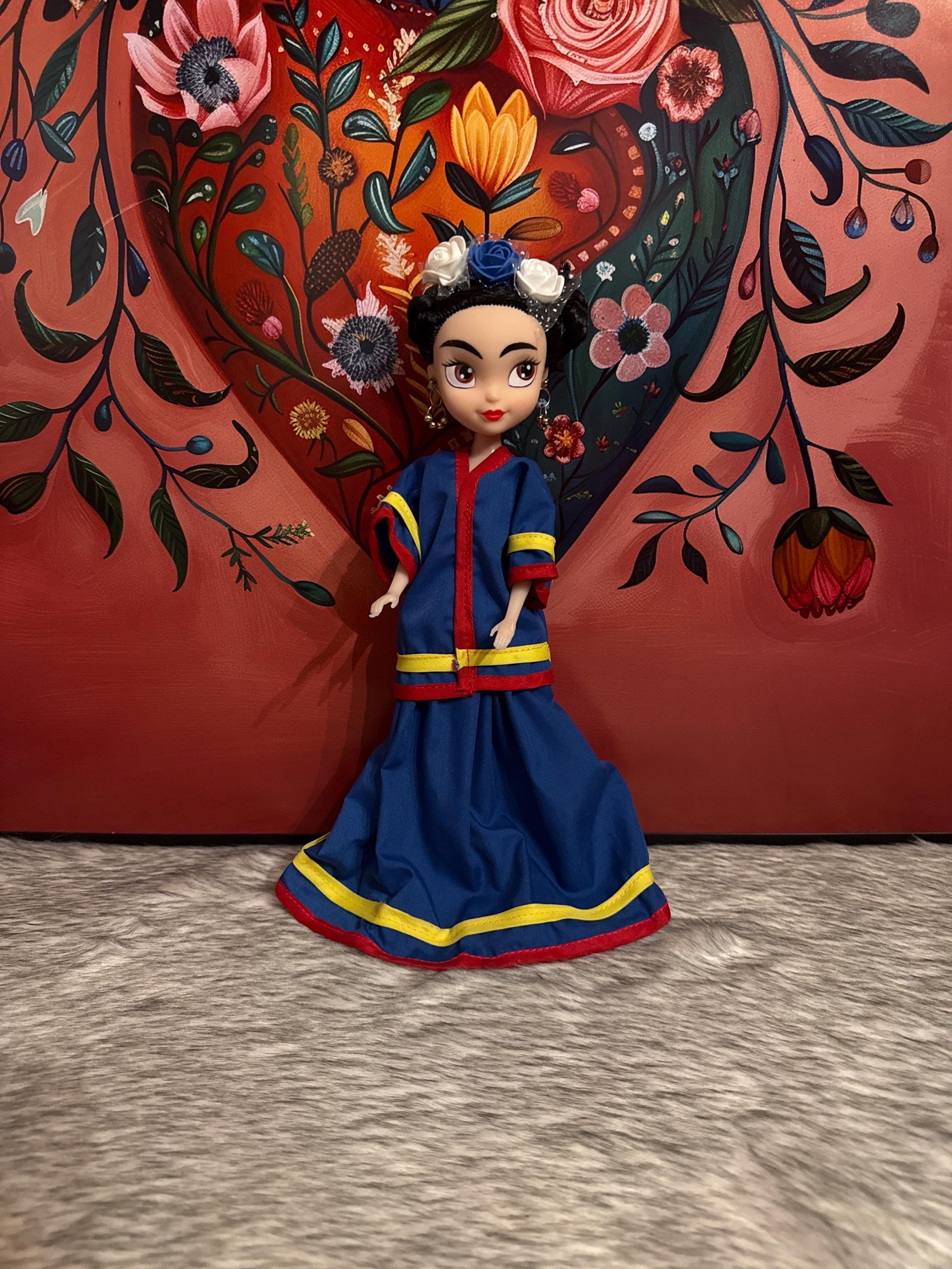 Beautiful Frida dolls, made with polyester and cotton fabrics, lace and ribbons, measure approximately 13 inches tall, wider and more elaborate dresses, includes earrings, headdress, panties, shoes, a base to stand them on and includes a crinoline skirt to give greater volume to each dress.
