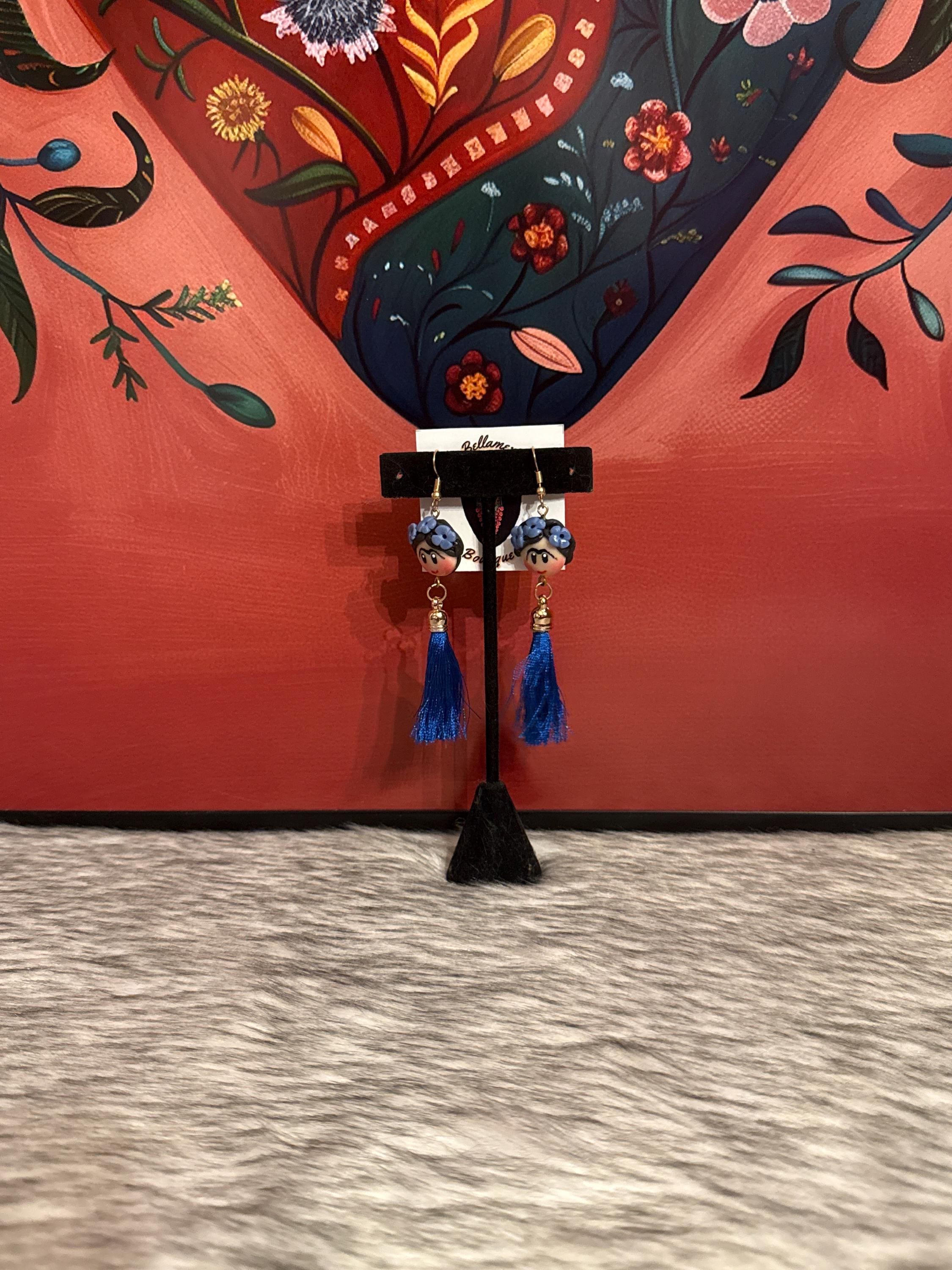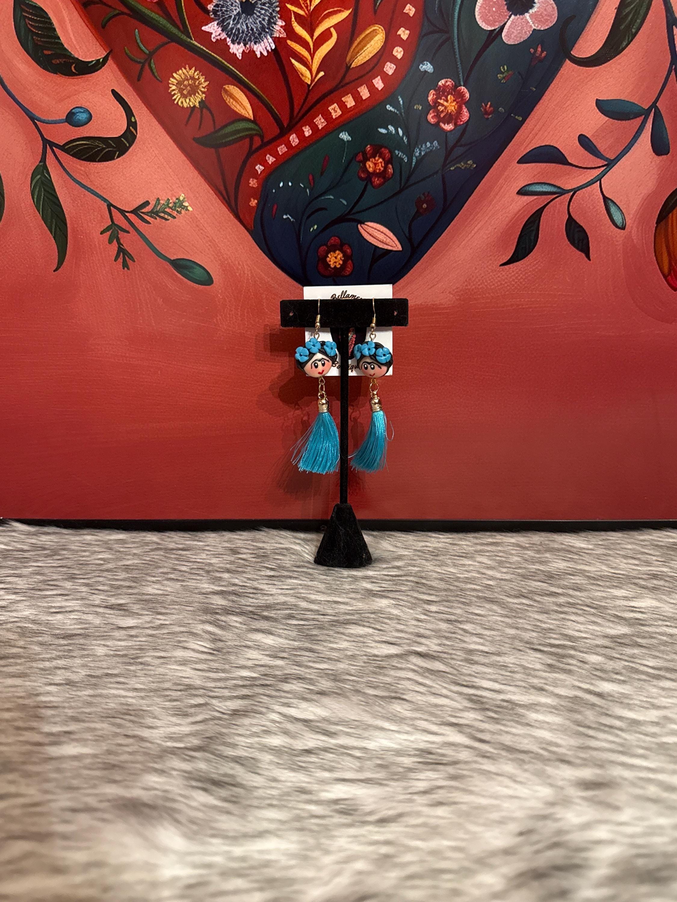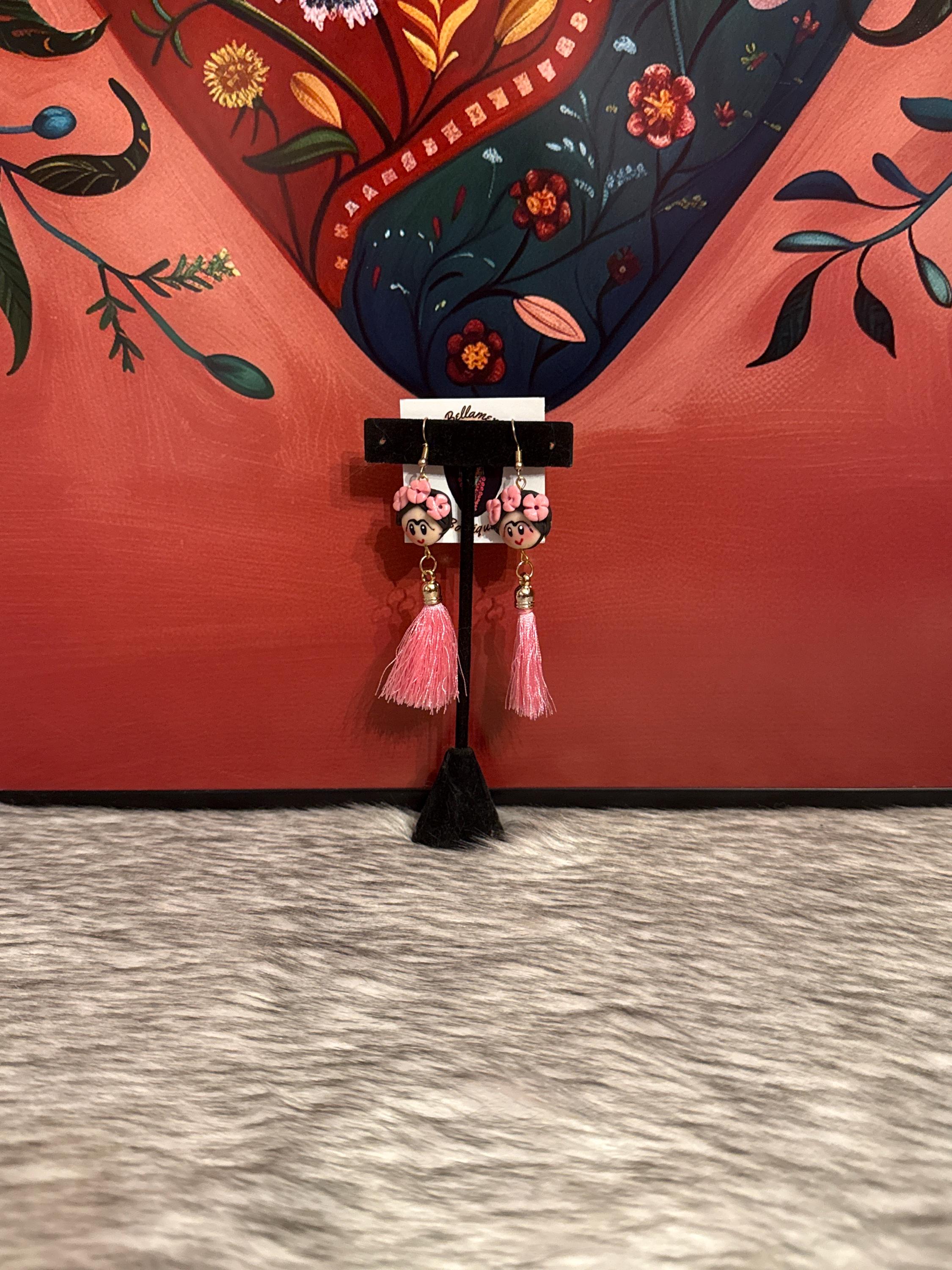 Beautiful Frida-inspired earrings, handmade with moldable cold clay and silk thread tassel, made in Mexico.
