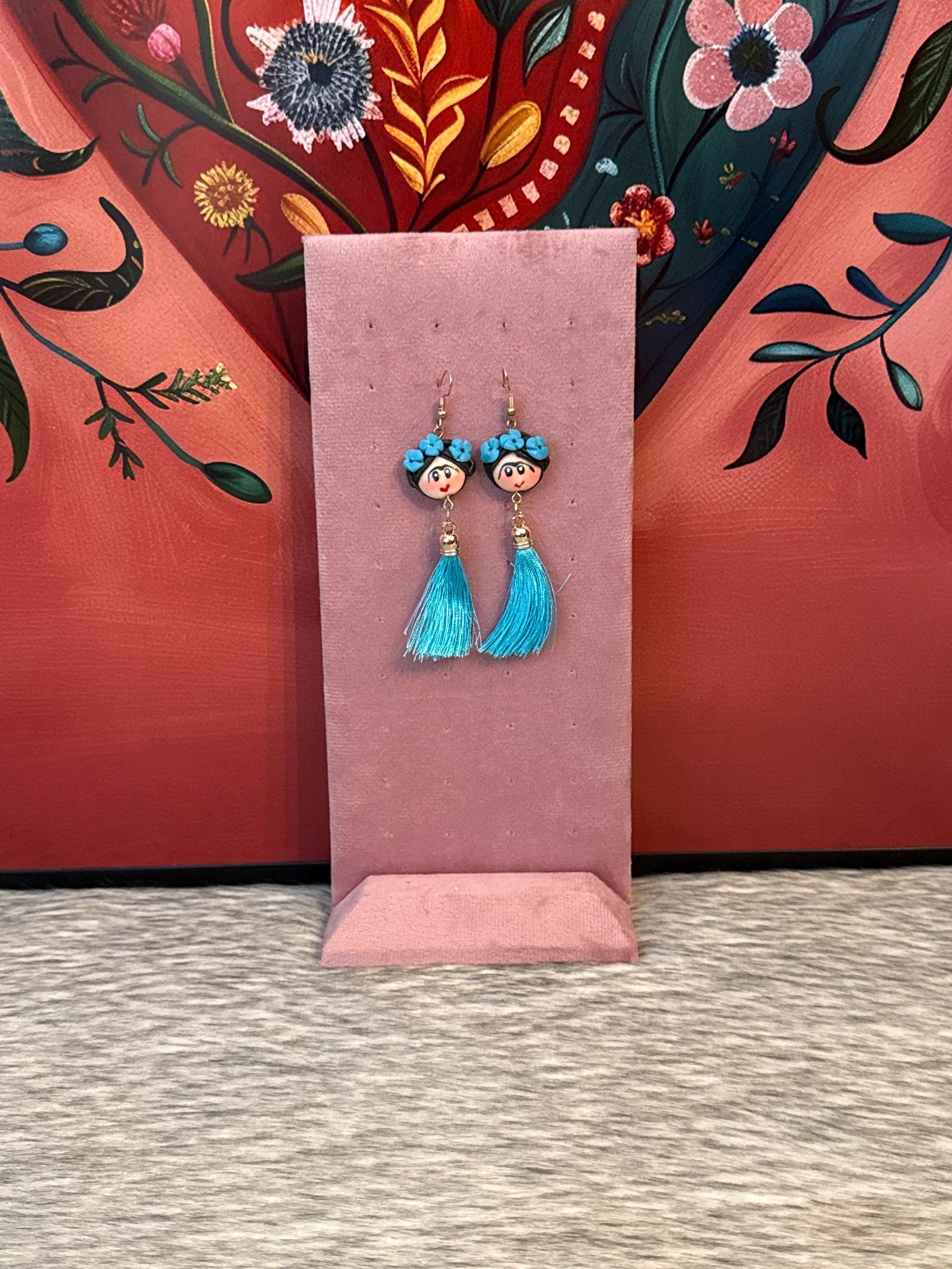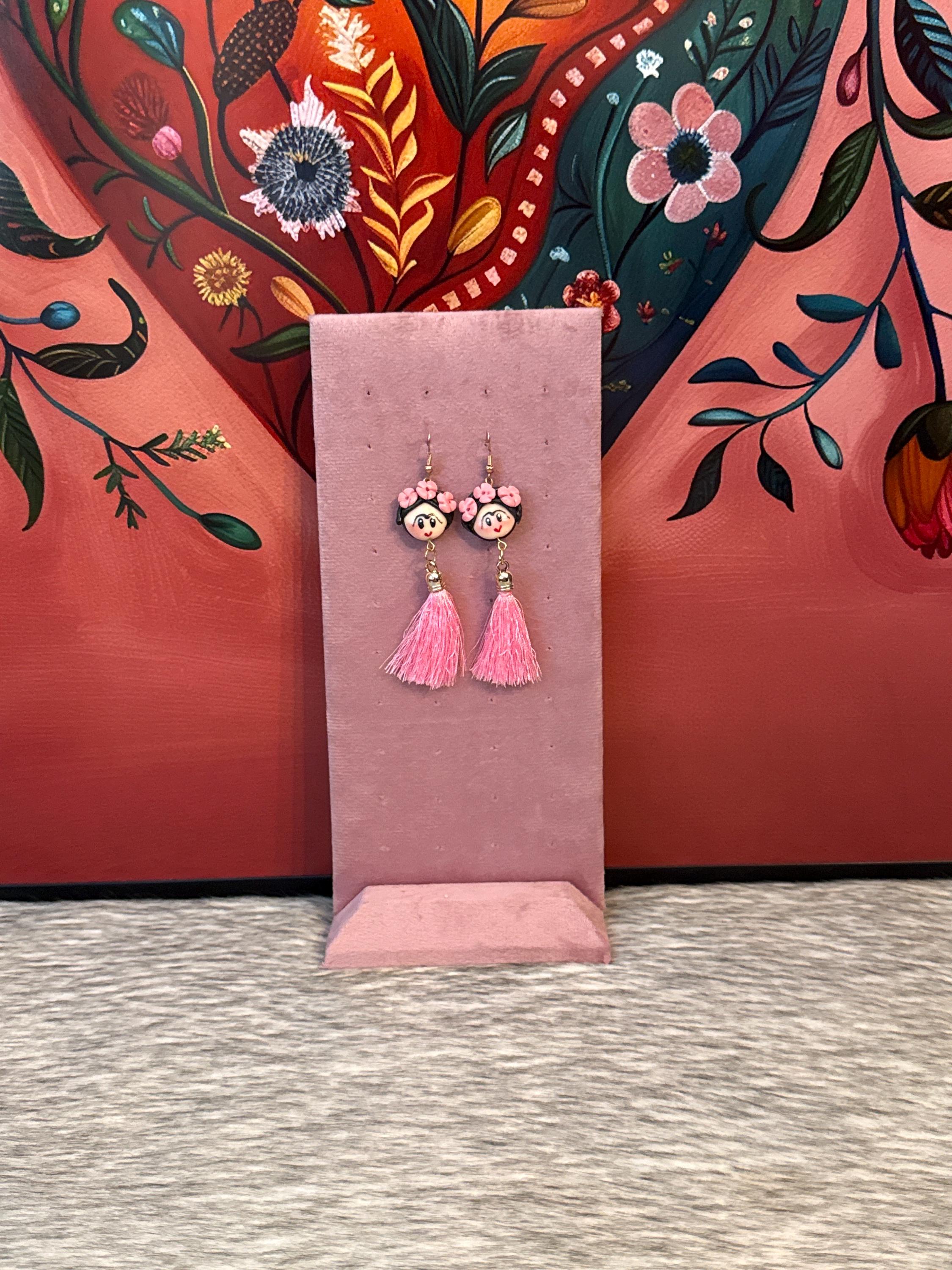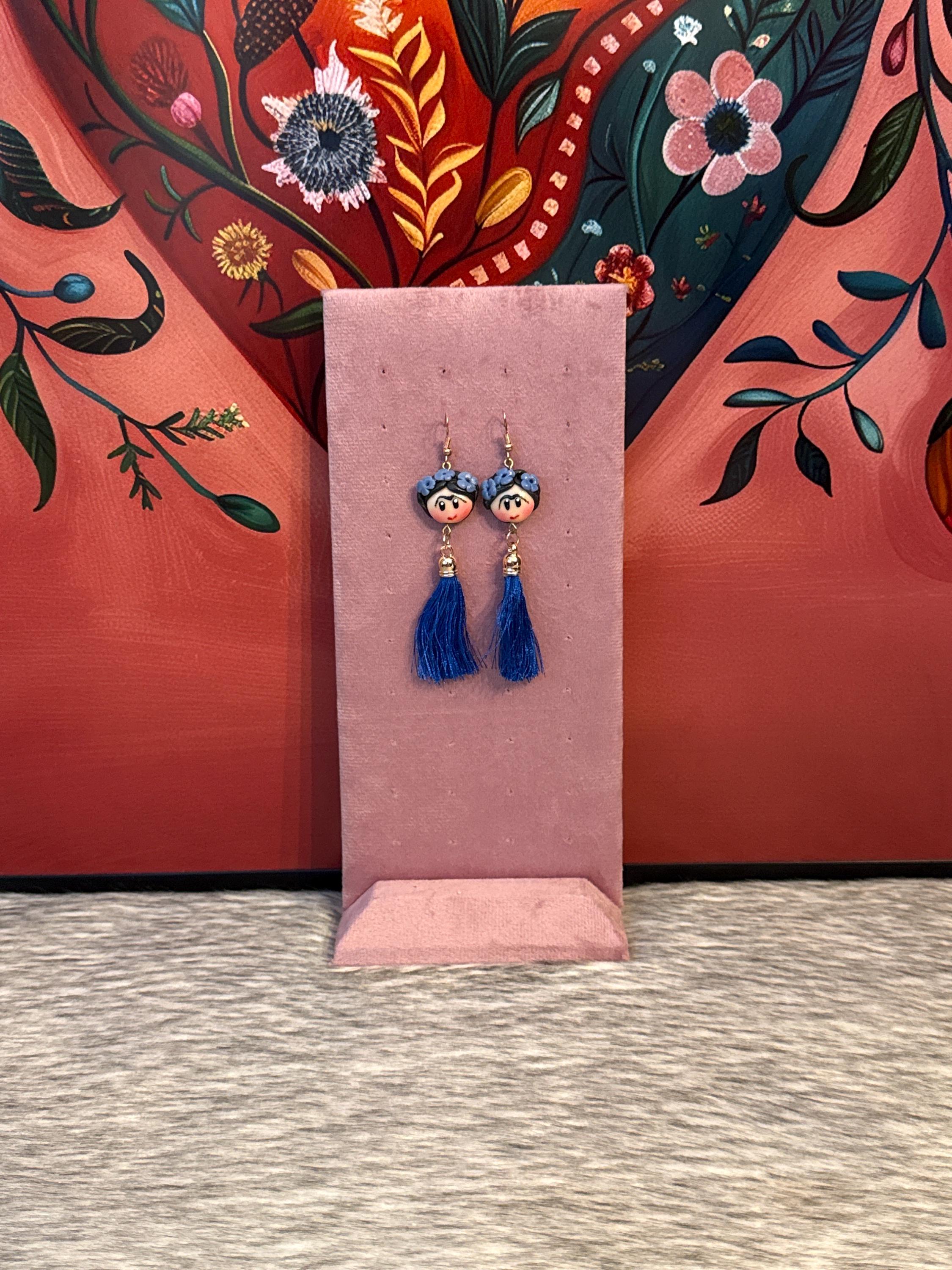 Beautiful Frida-inspired earrings, handmade with moldable cold clay and silk thread tassel, made in Mexico.