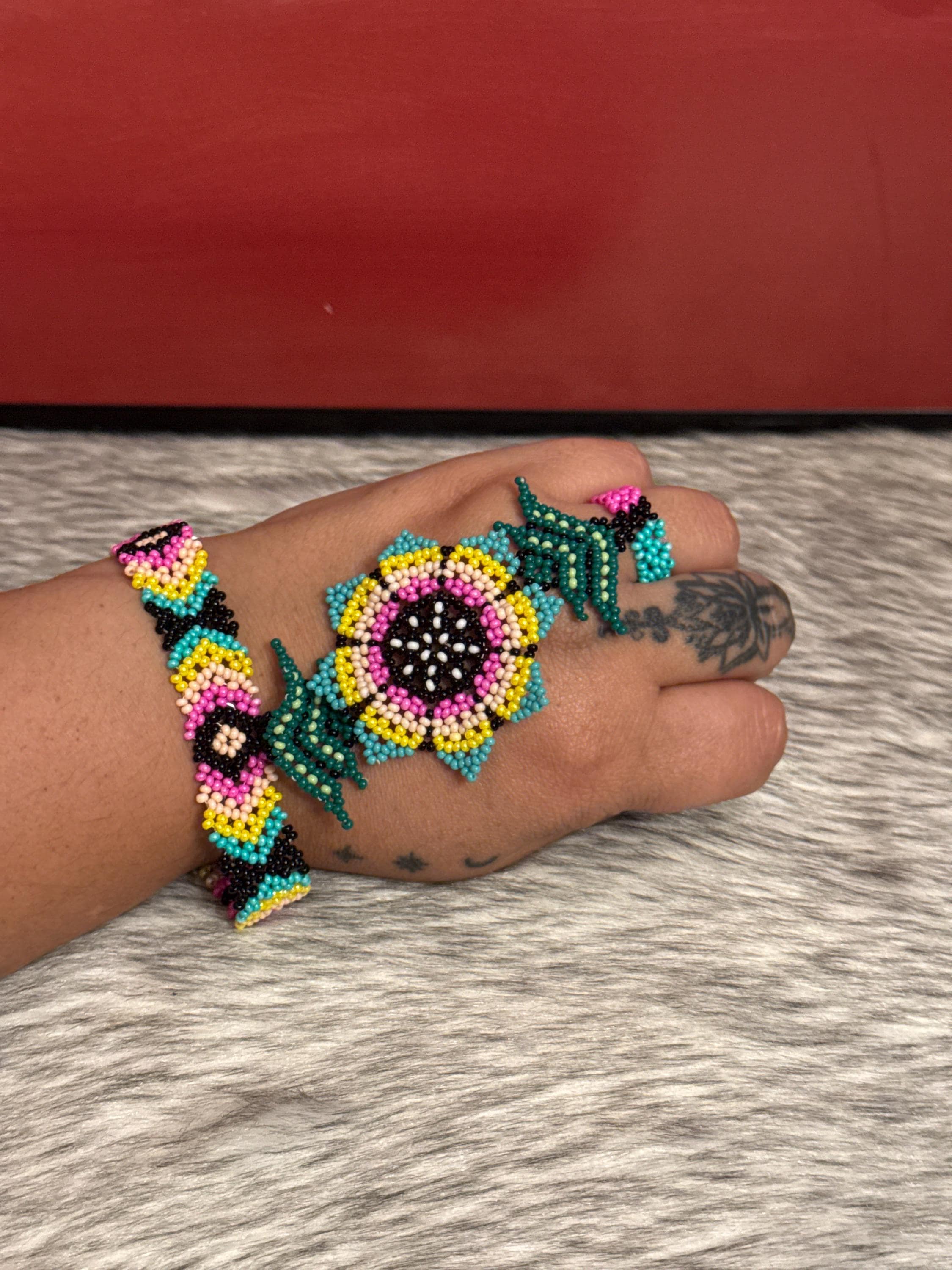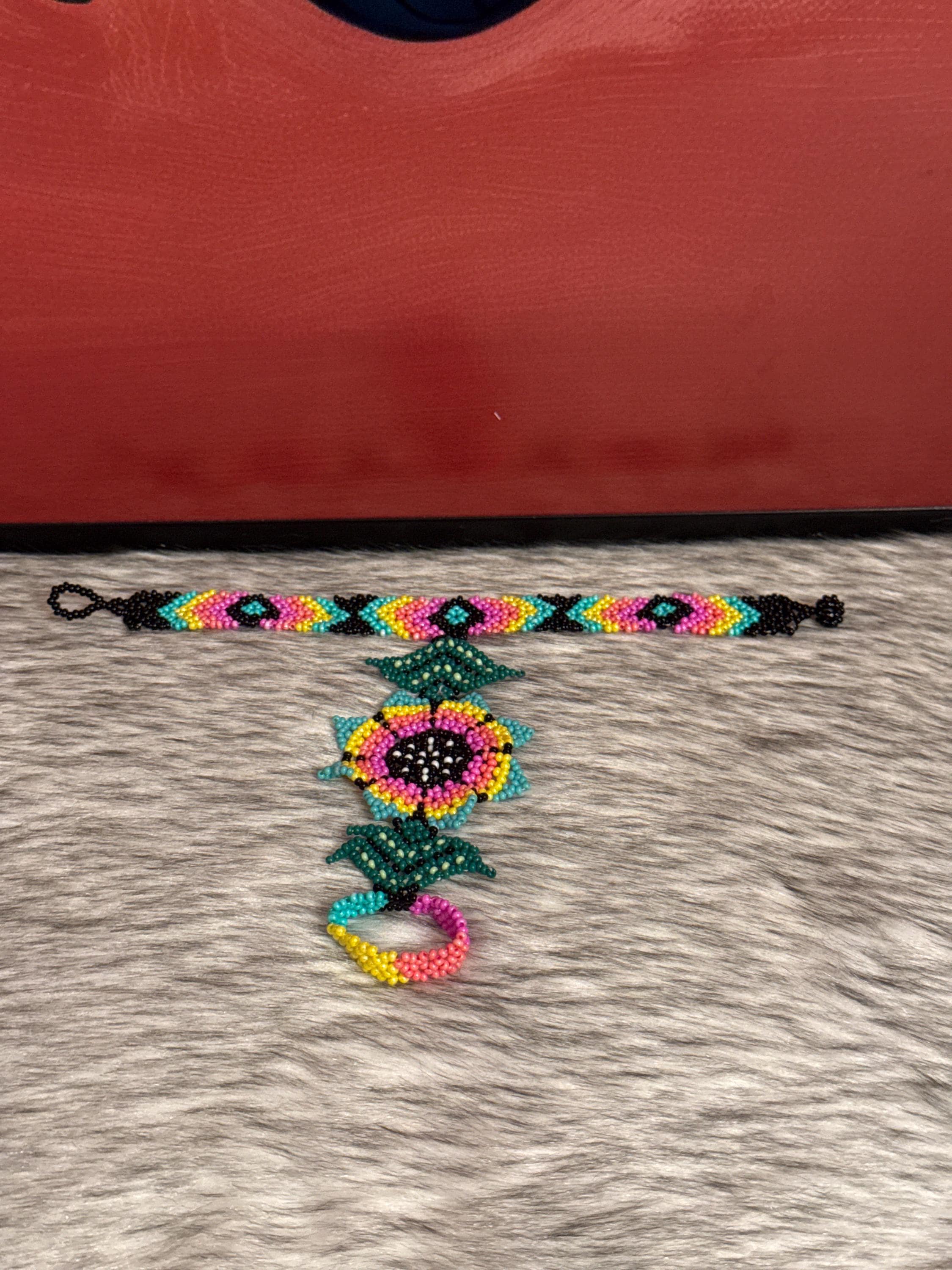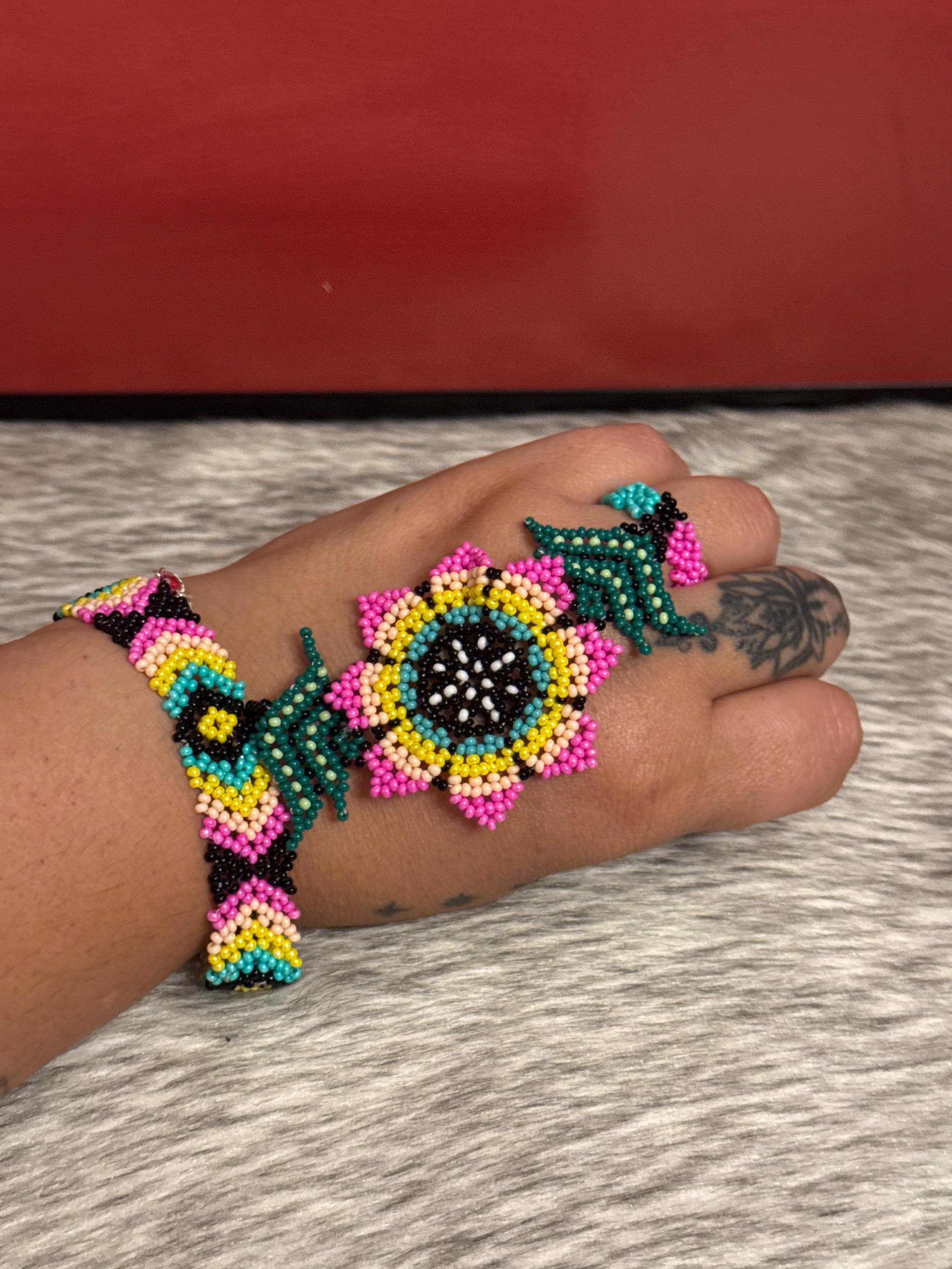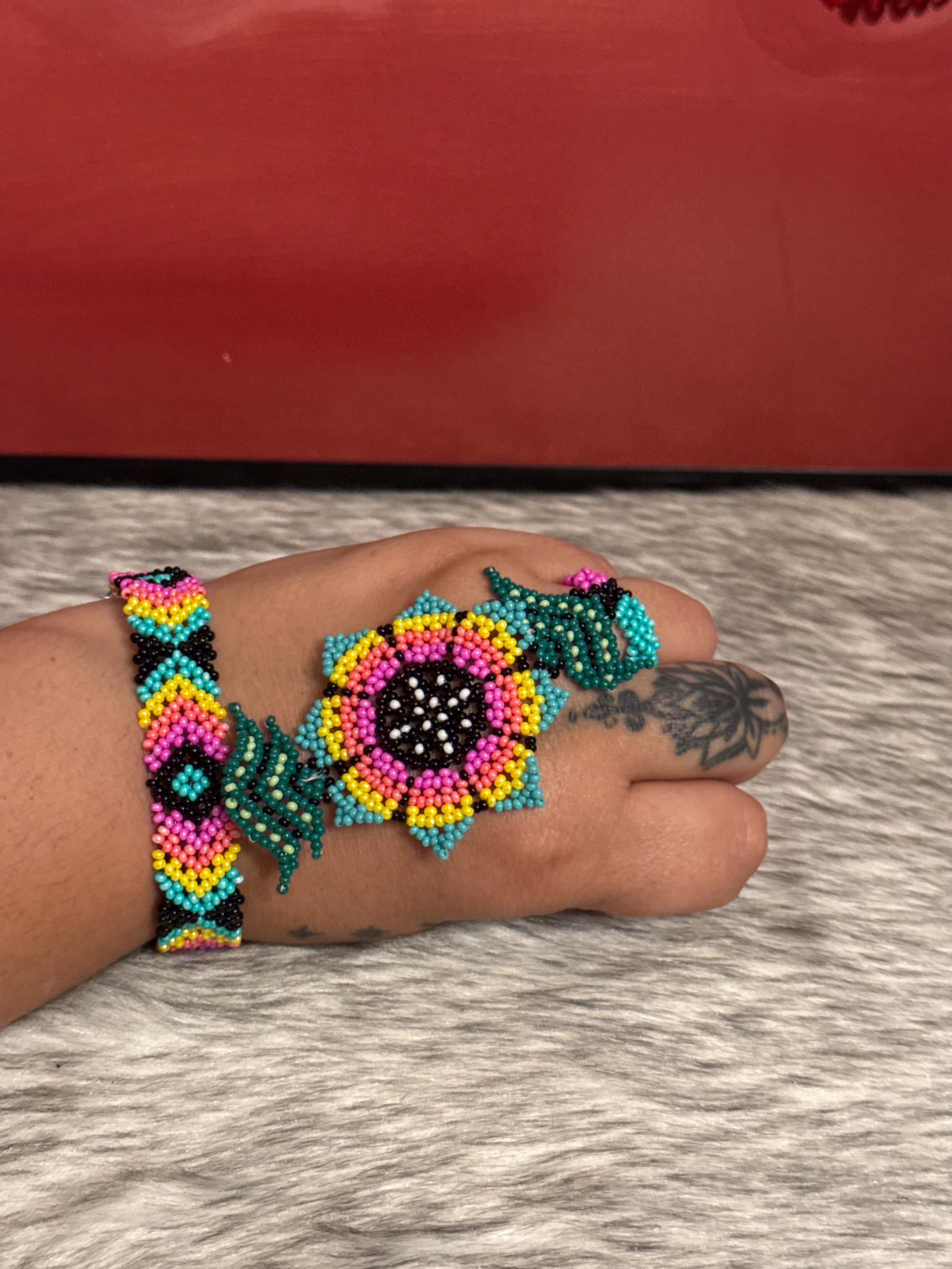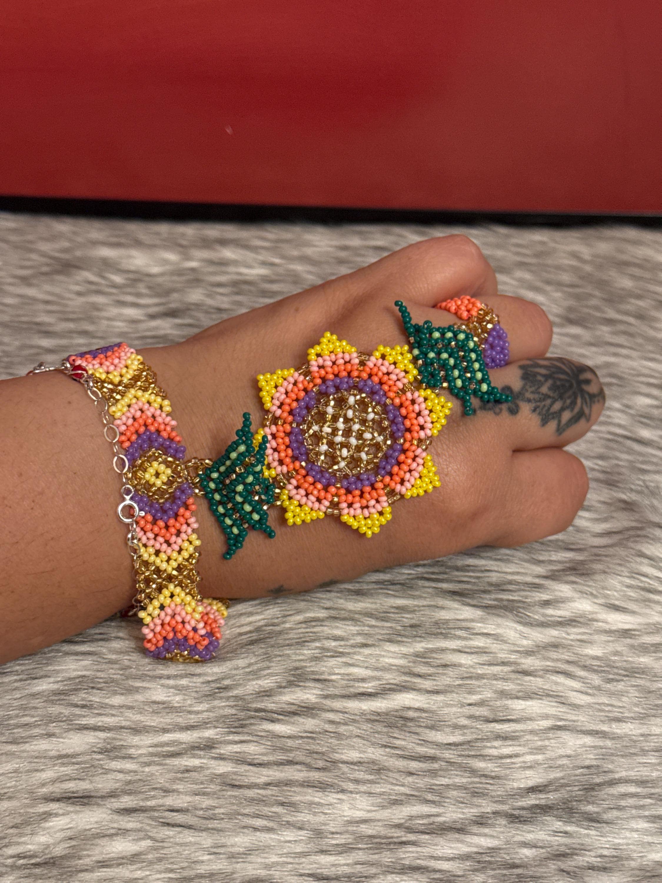 Beautiful flower bracelets with integrated ring, handmade with beads, the bracelets measure approximately 6 to 8 inches long and the rings come in size 8/9 approximately.