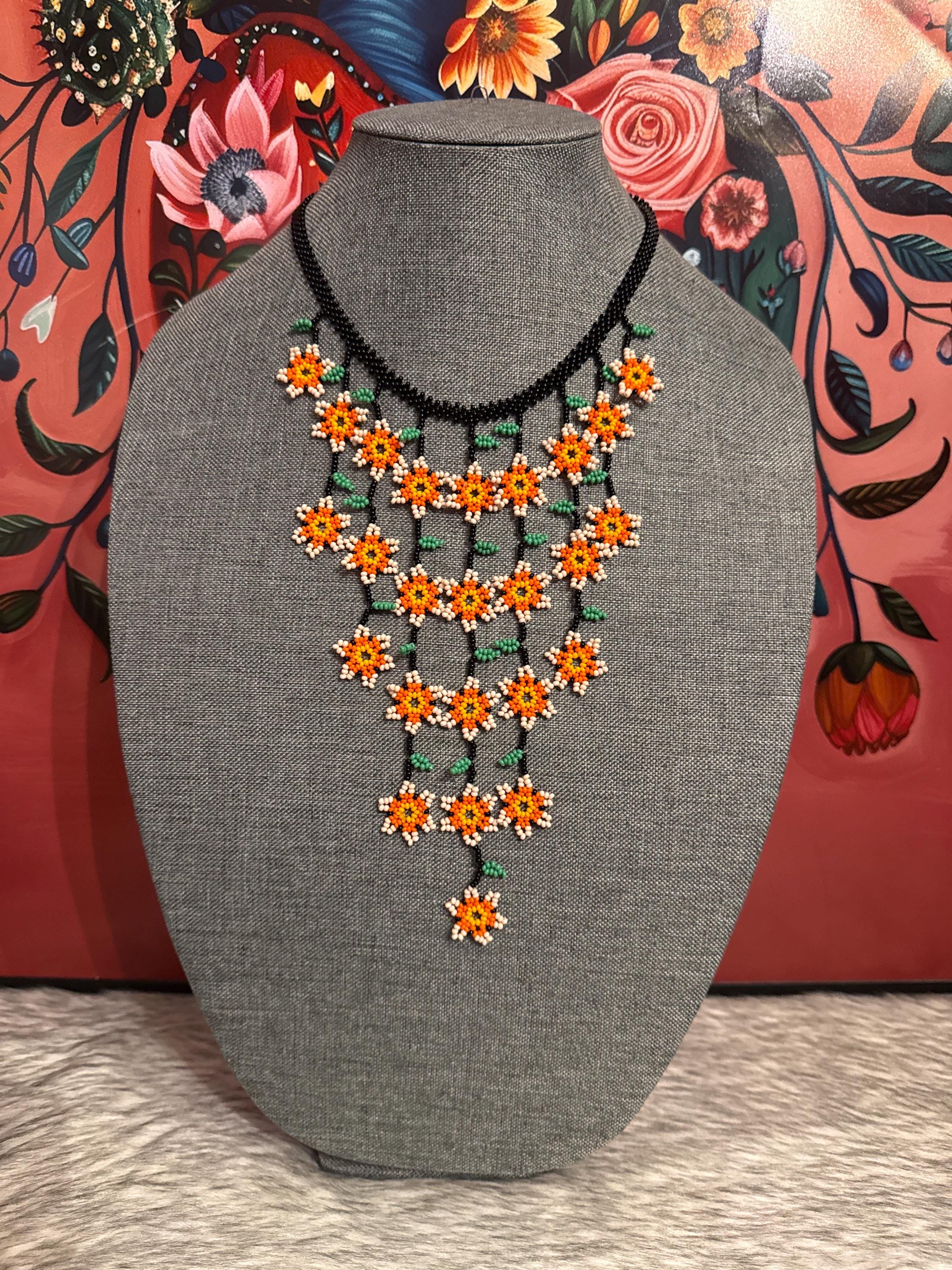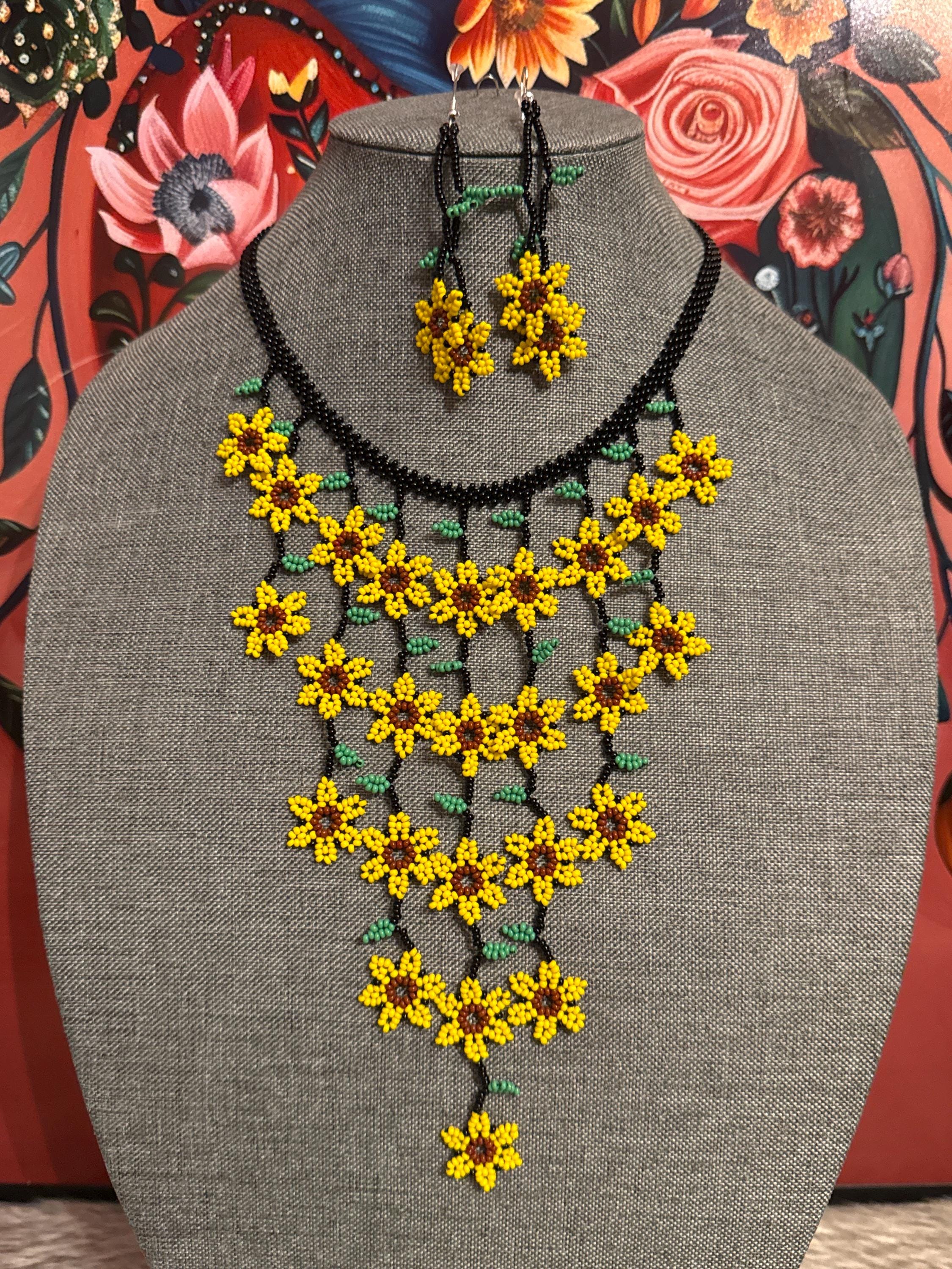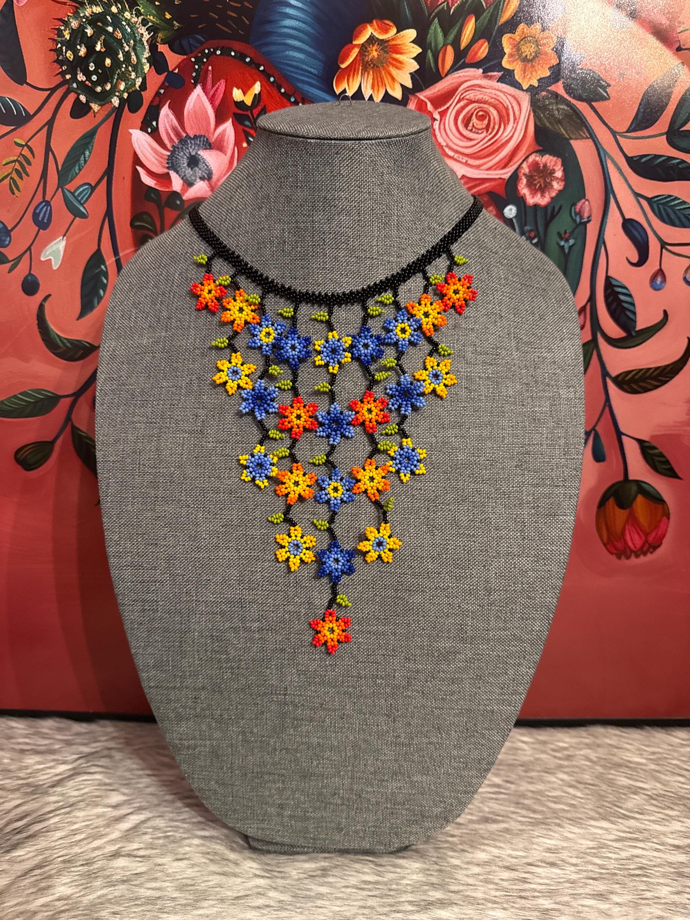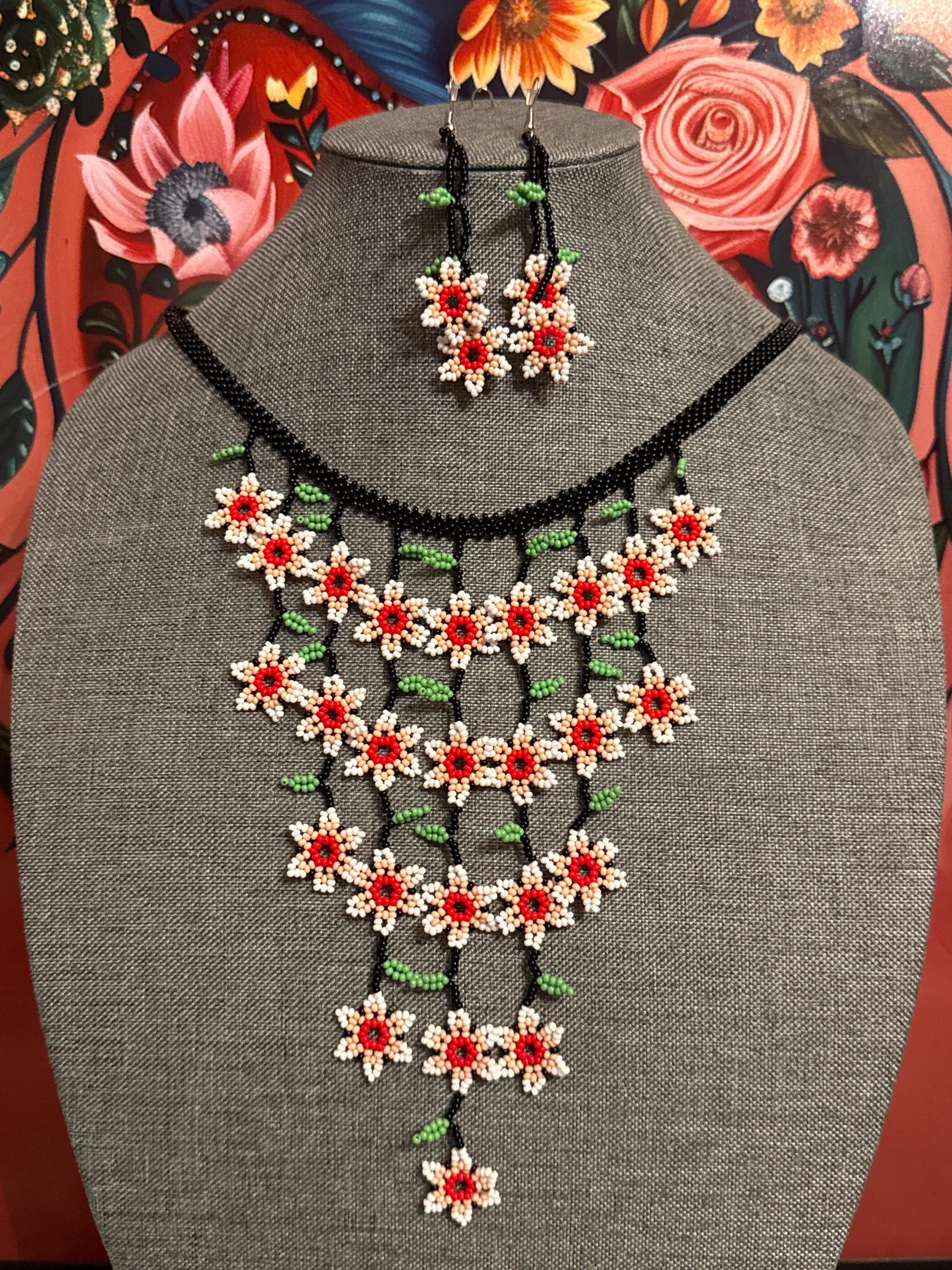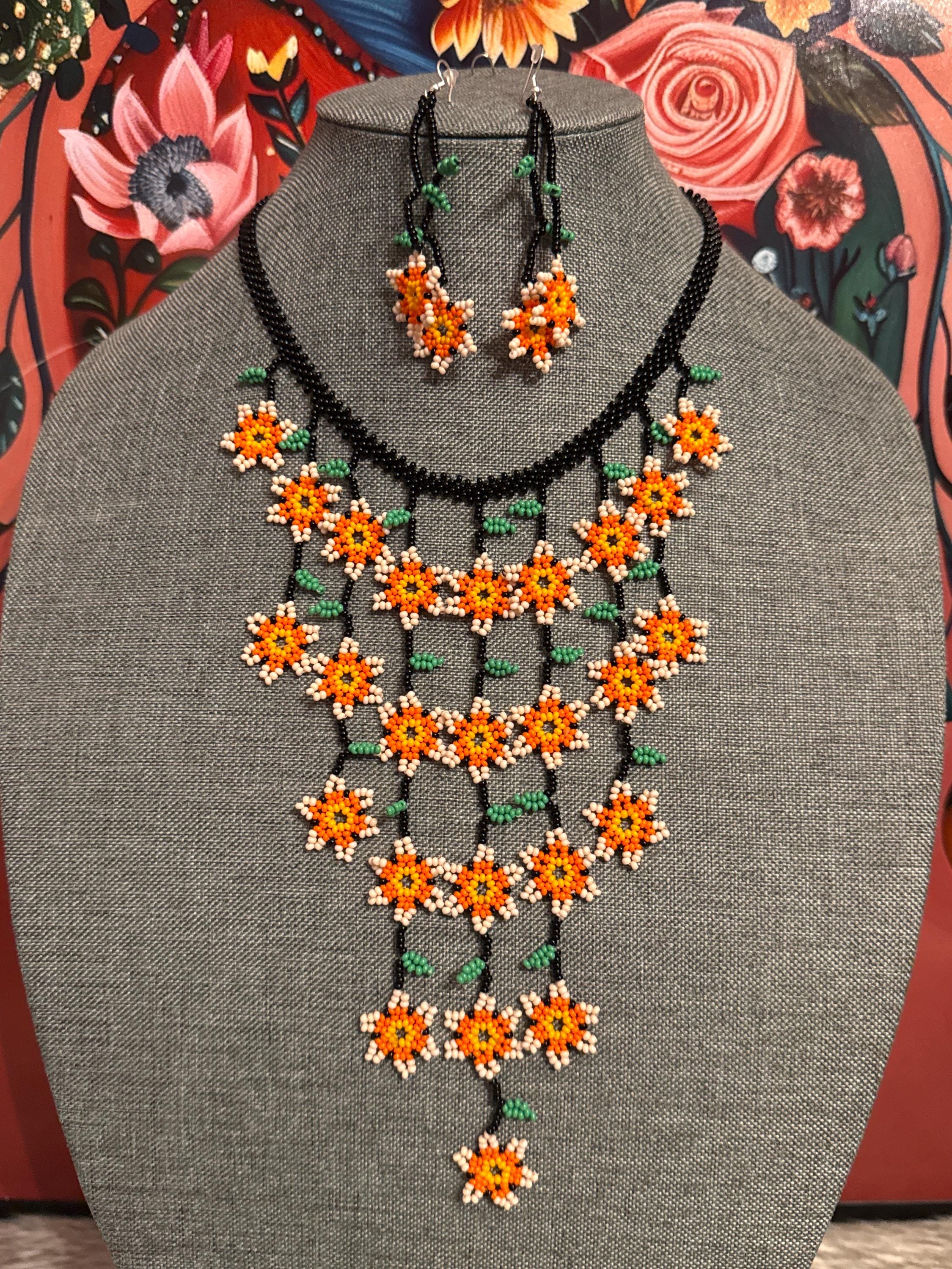 Hermoso collar de cascada de flores tamaño mini con sus aretes,hecho a mano con chaquiras por artesanos mexicanos,es pequeño en tamaño pero grande en color.