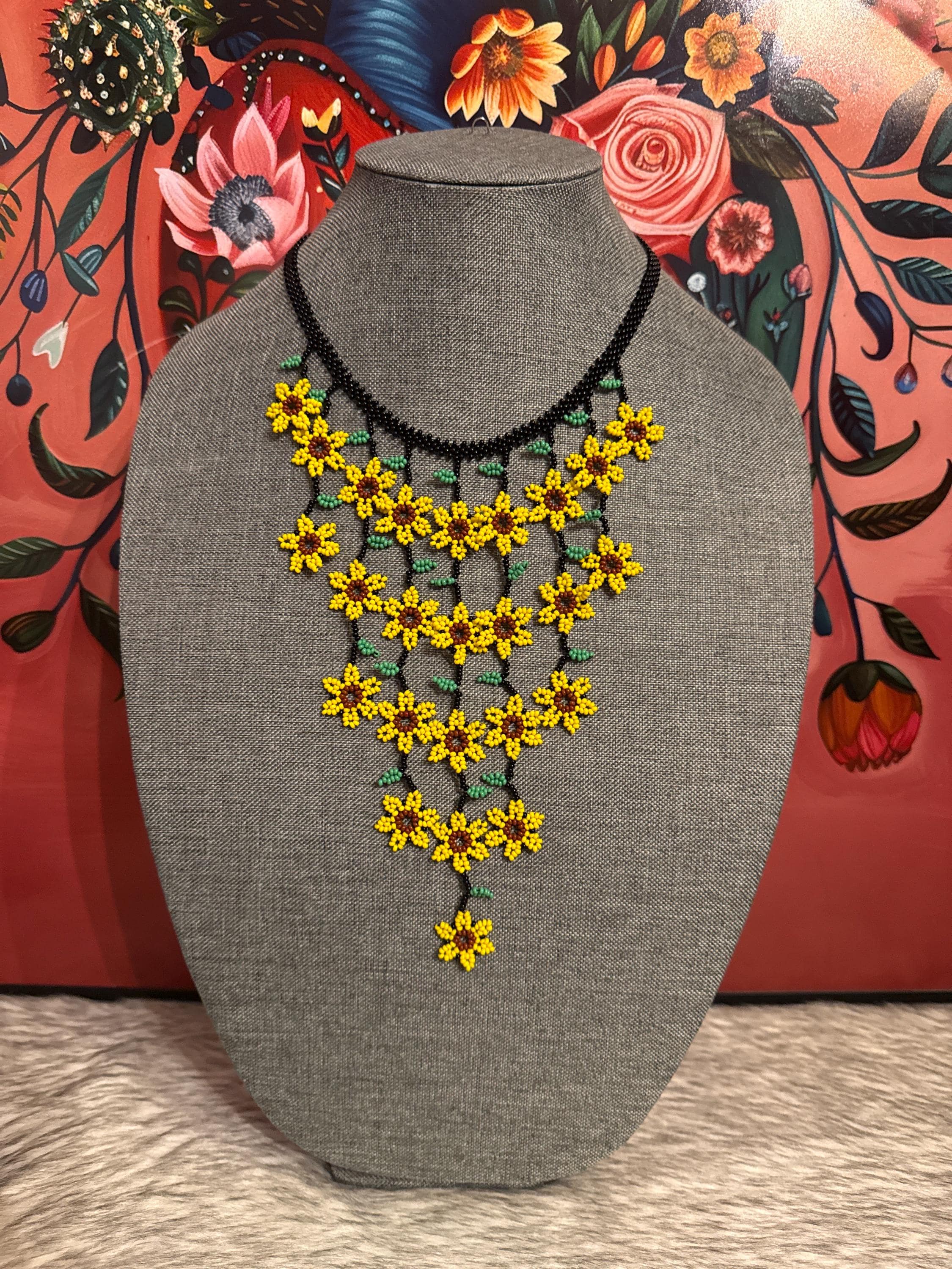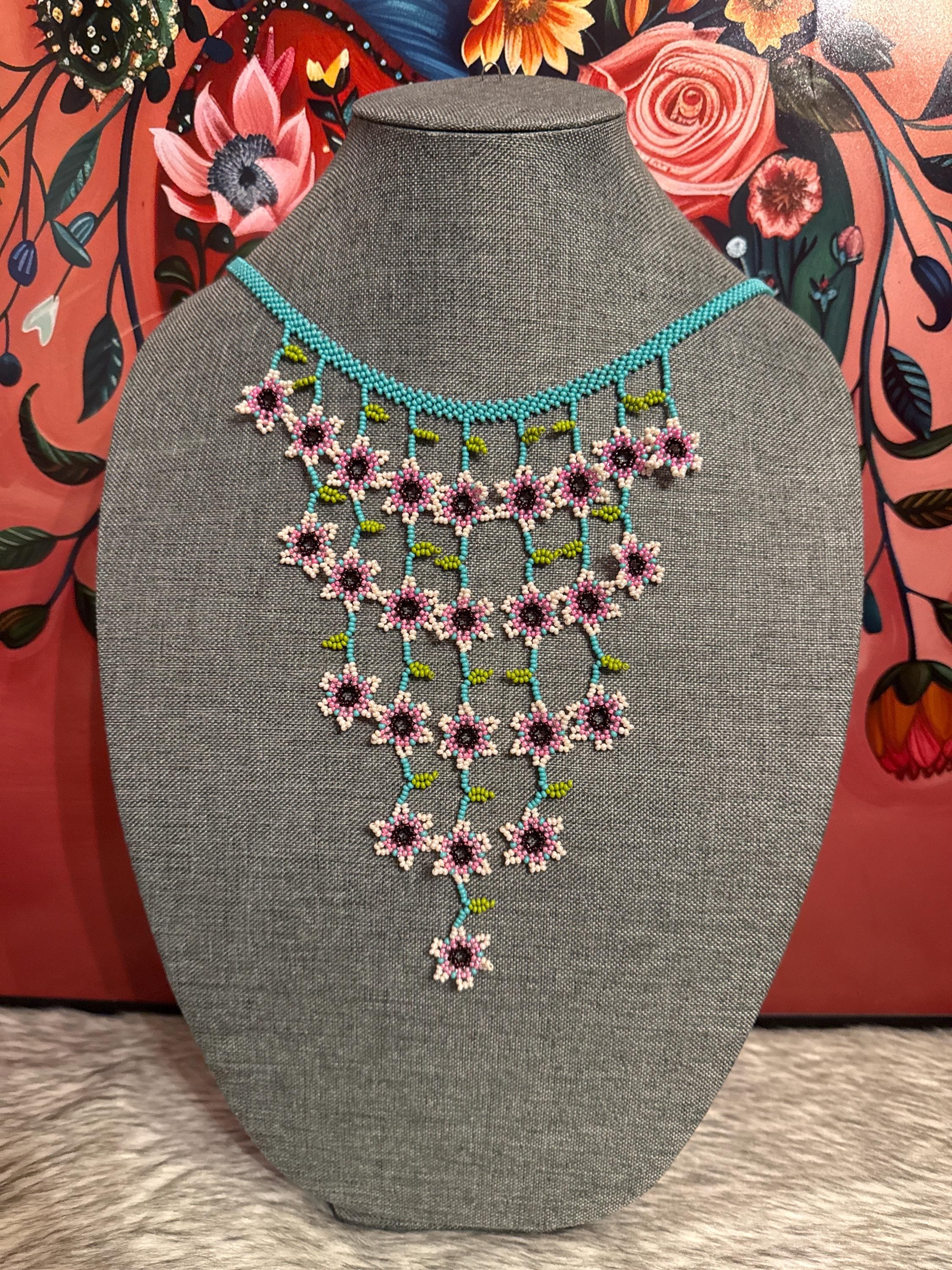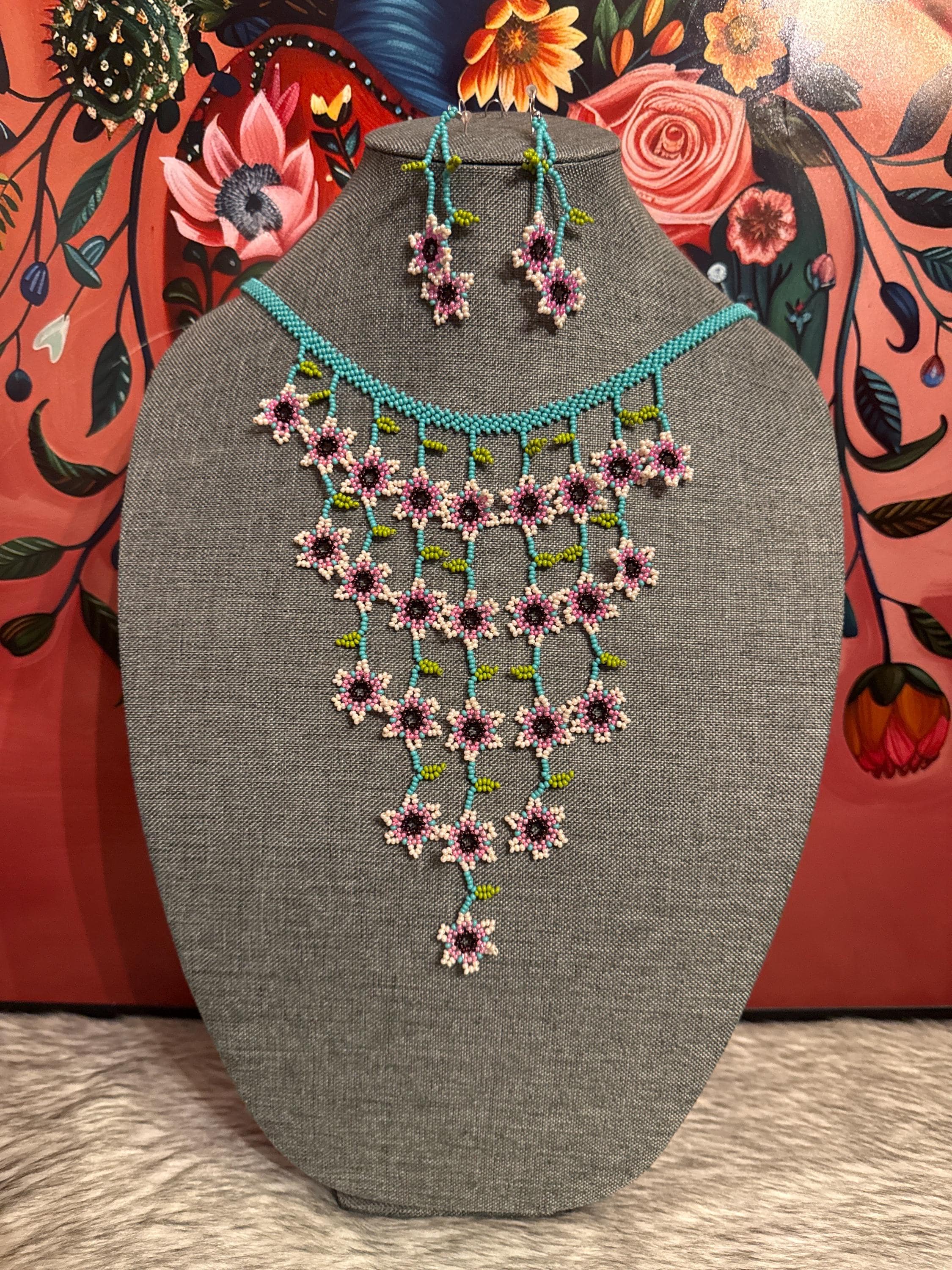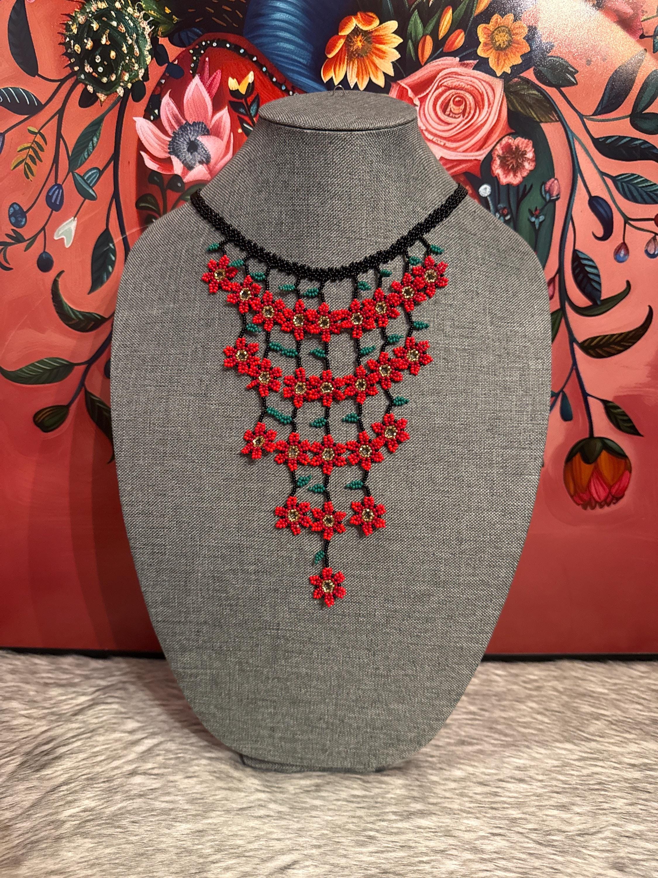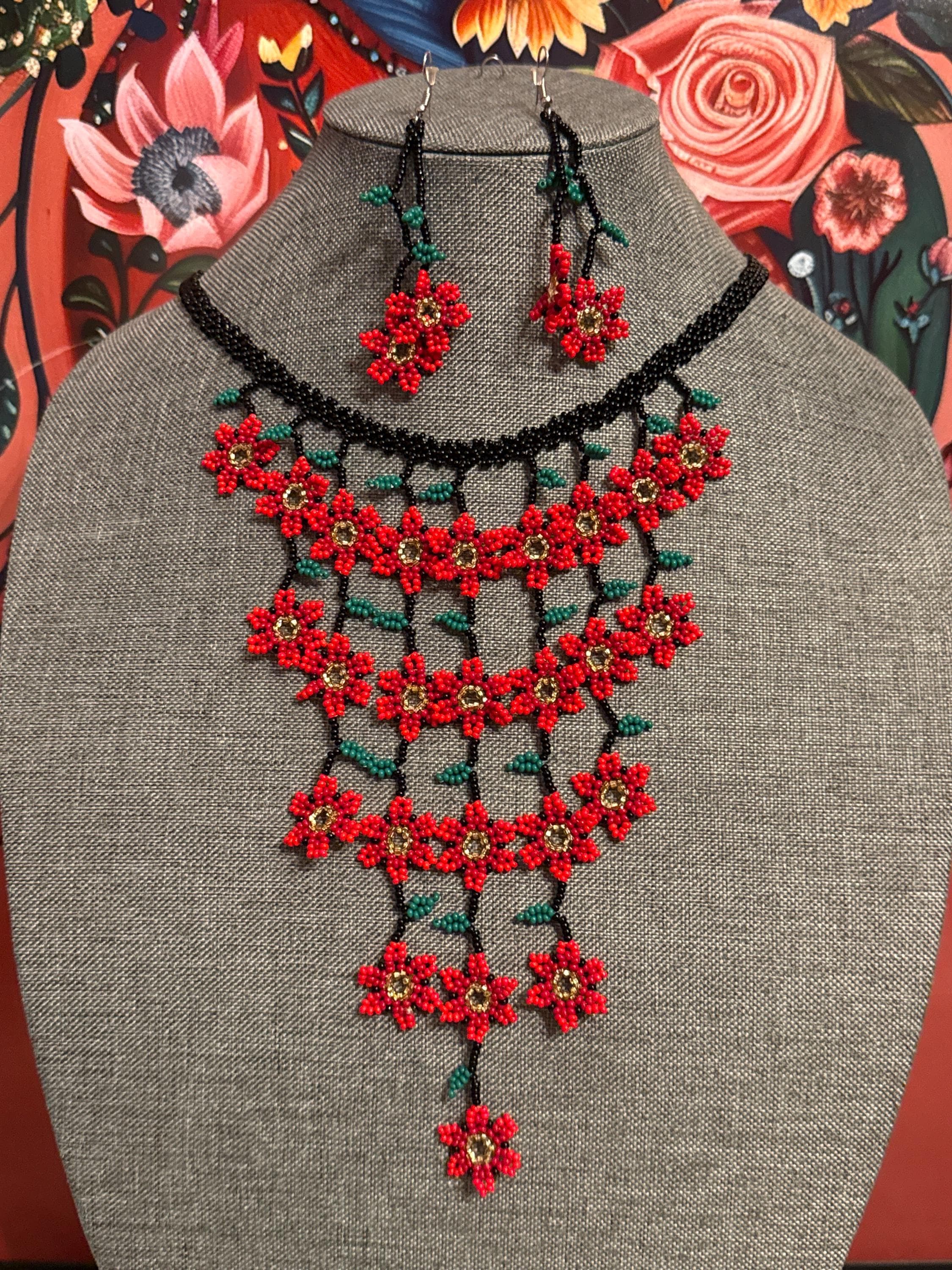 Hermoso collar de cascada de flores tamaño mini con sus aretes,hecho a mano con chaquiras por artesanos mexicanos,es pequeño en tamaño pero grande en color.