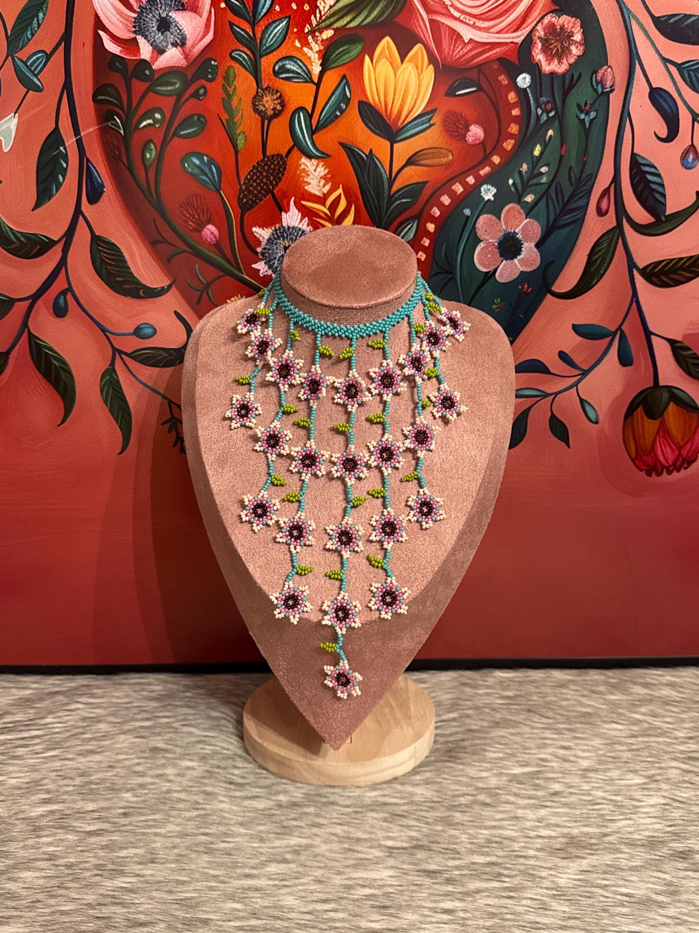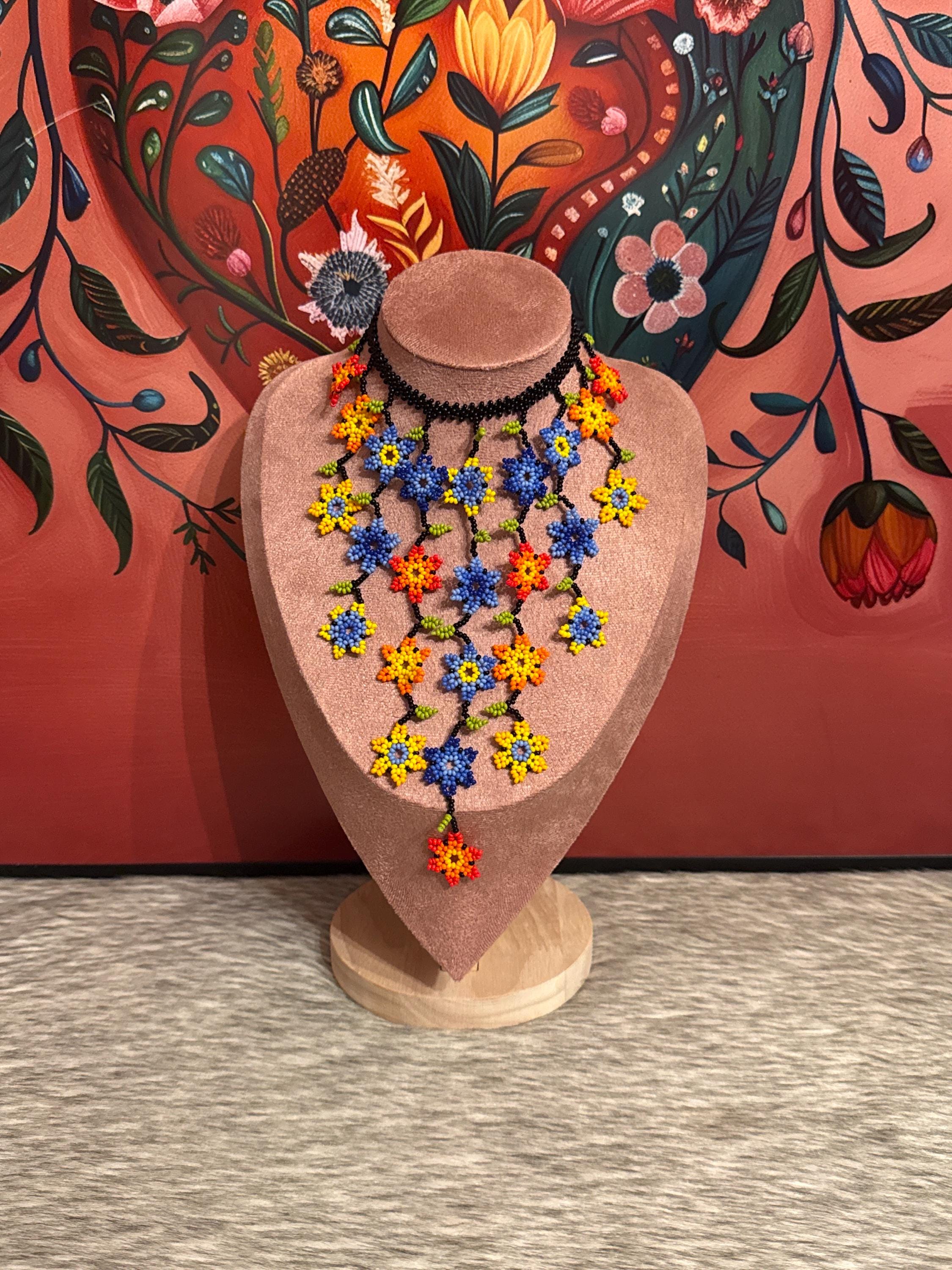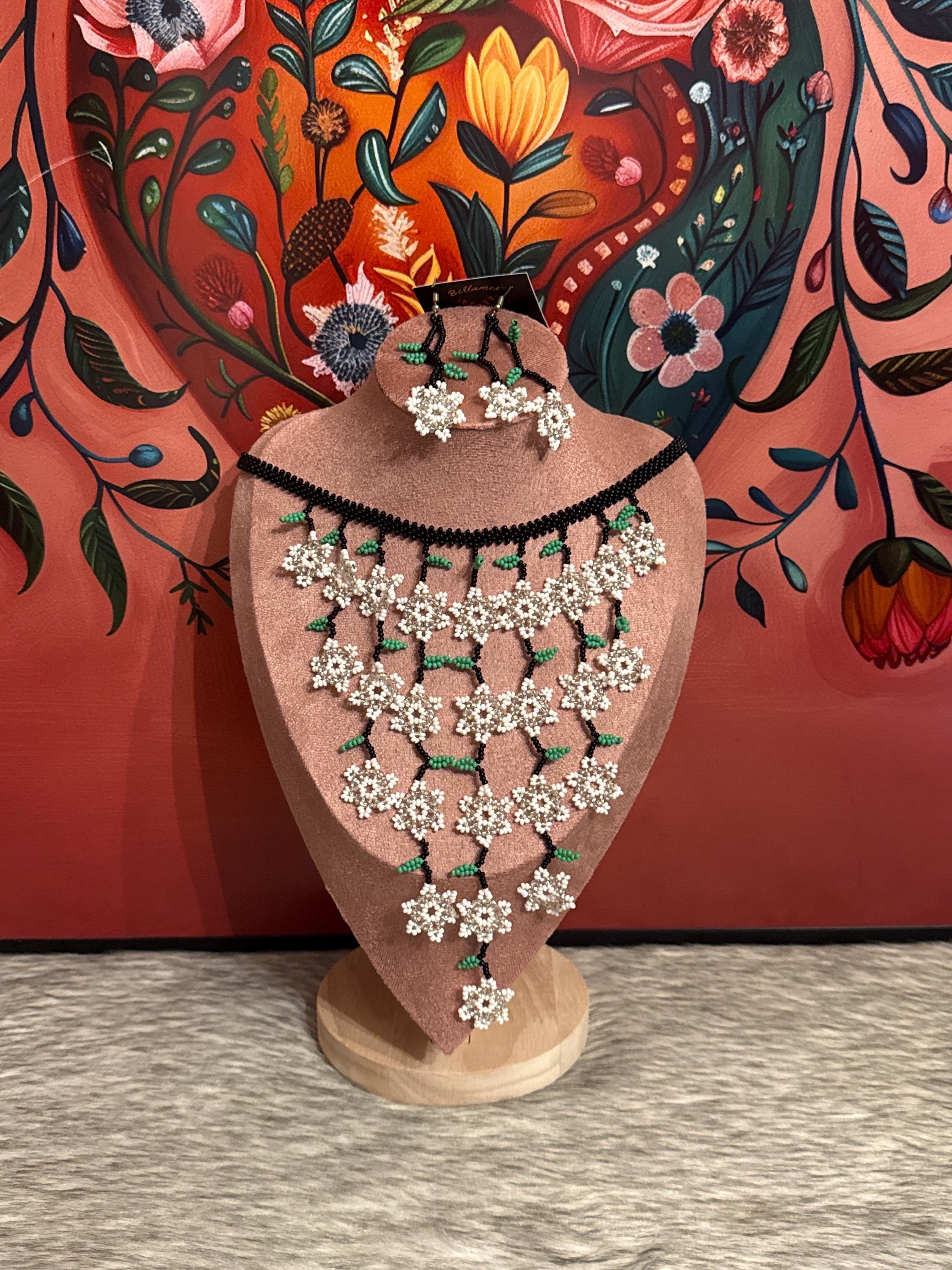 Beautiful mini flower waterfall necklace with earrings, handmade with beads by Mexican artisans, small in size but big in color.