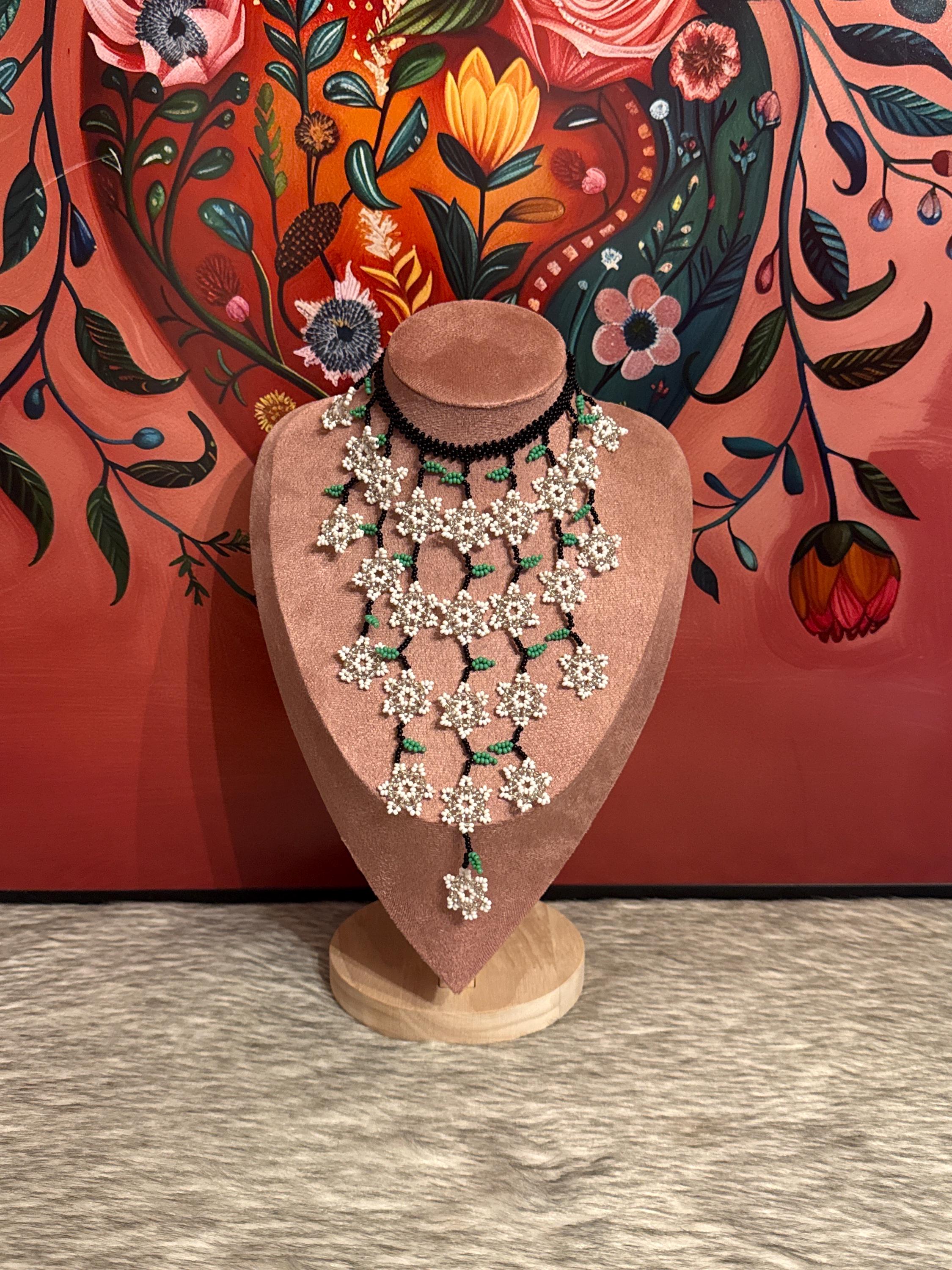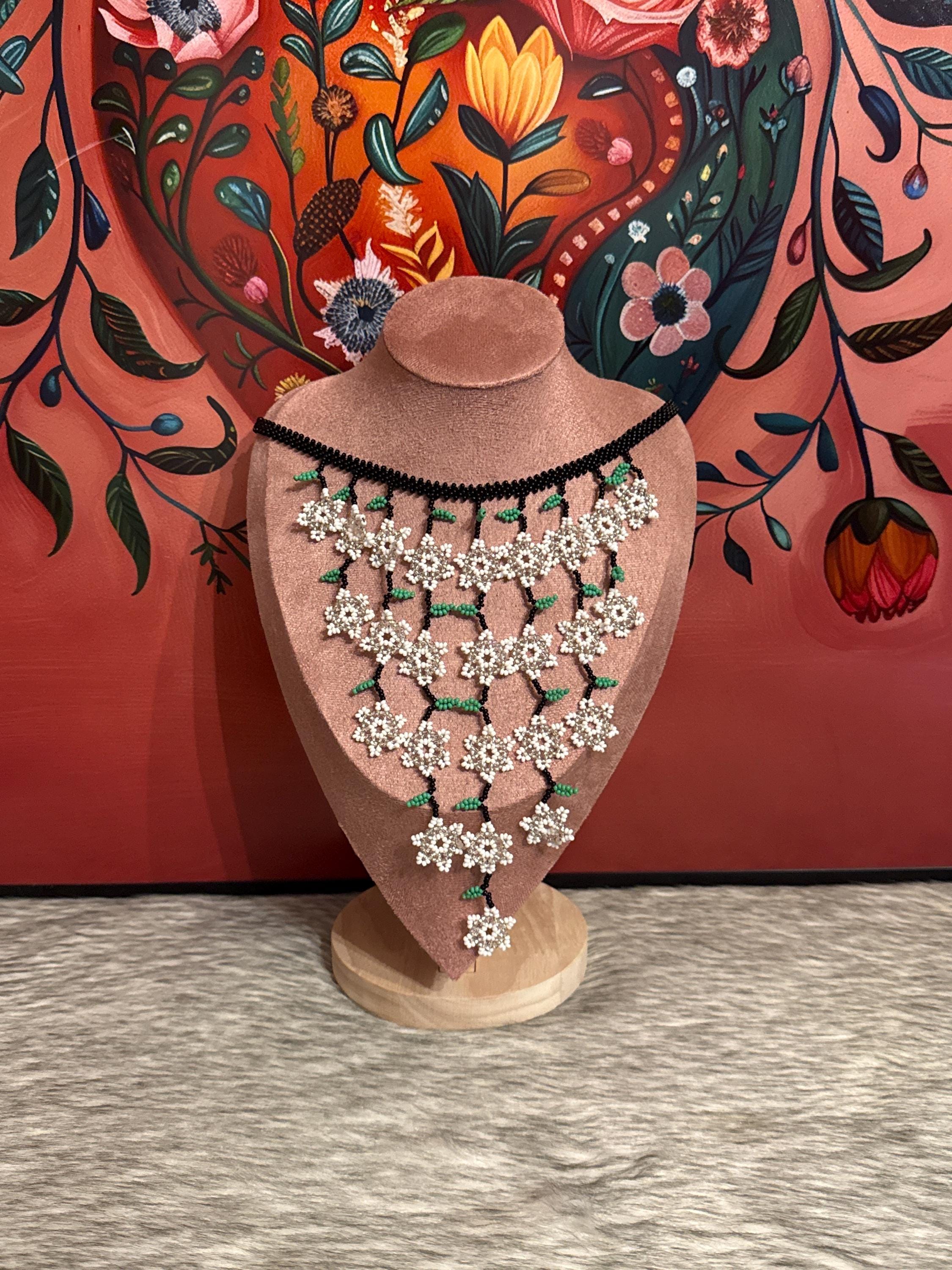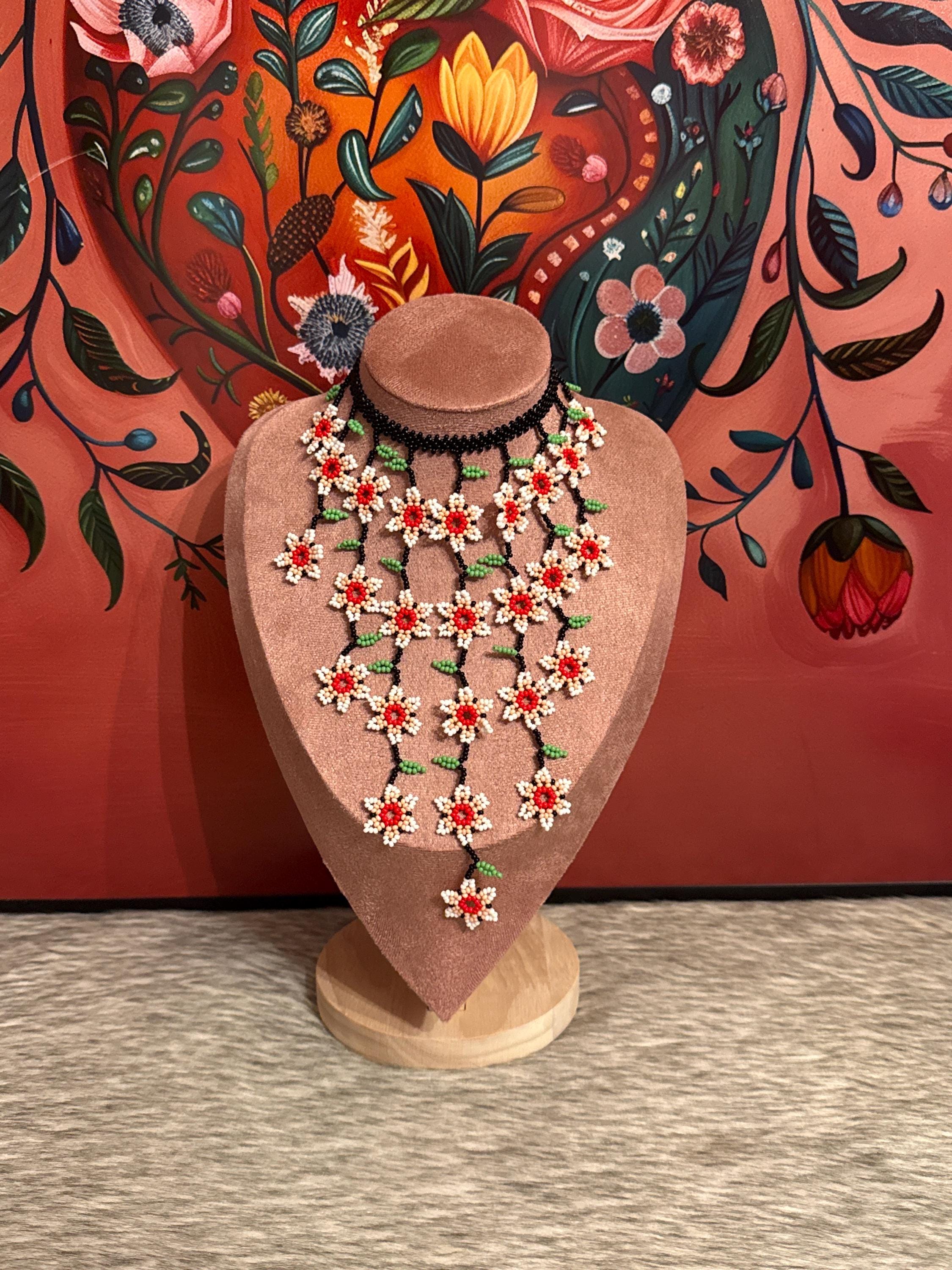 Beautiful mini flower waterfall necklace with earrings, handmade with beads by Mexican artisans, small in size but big in color.