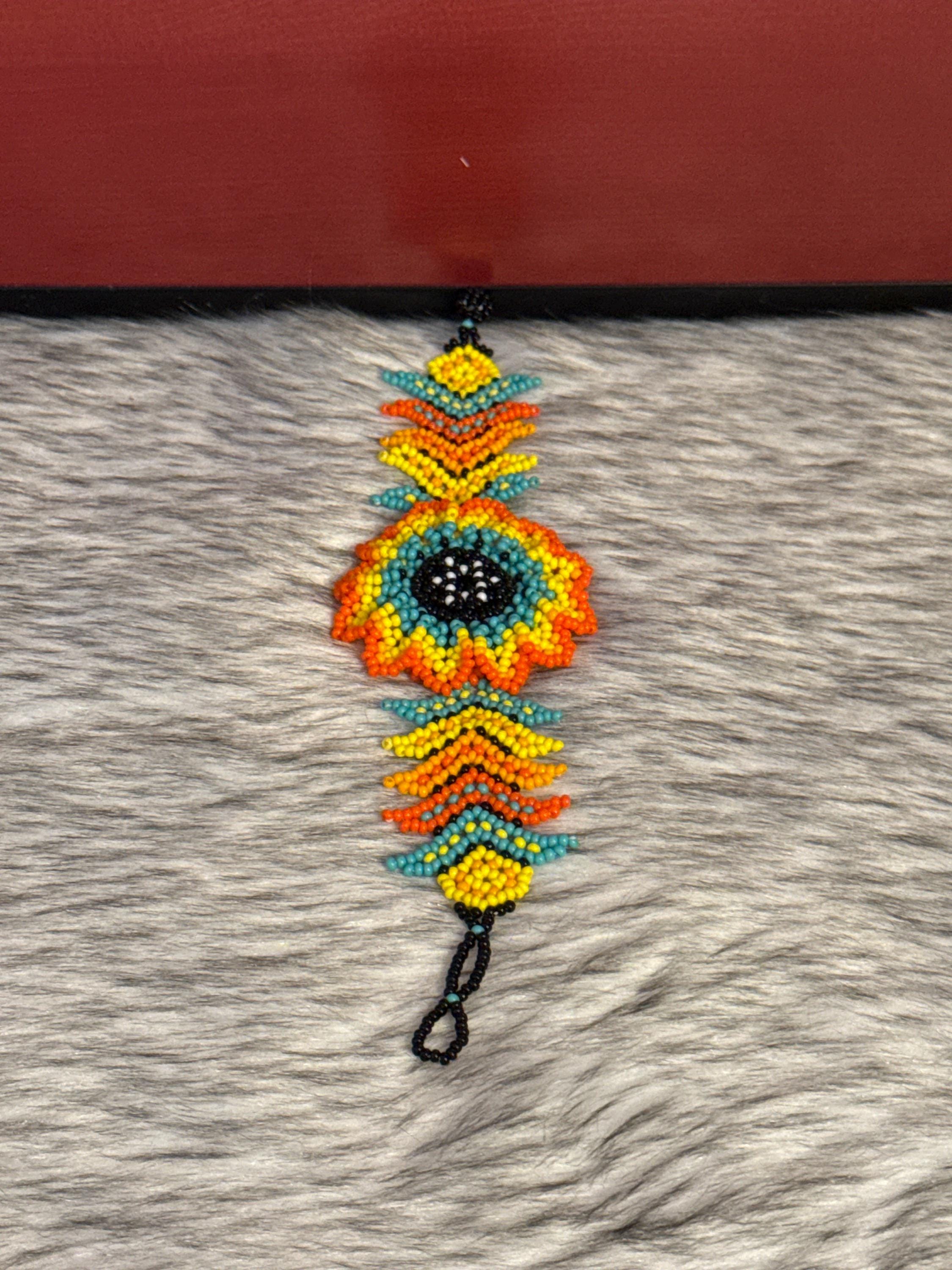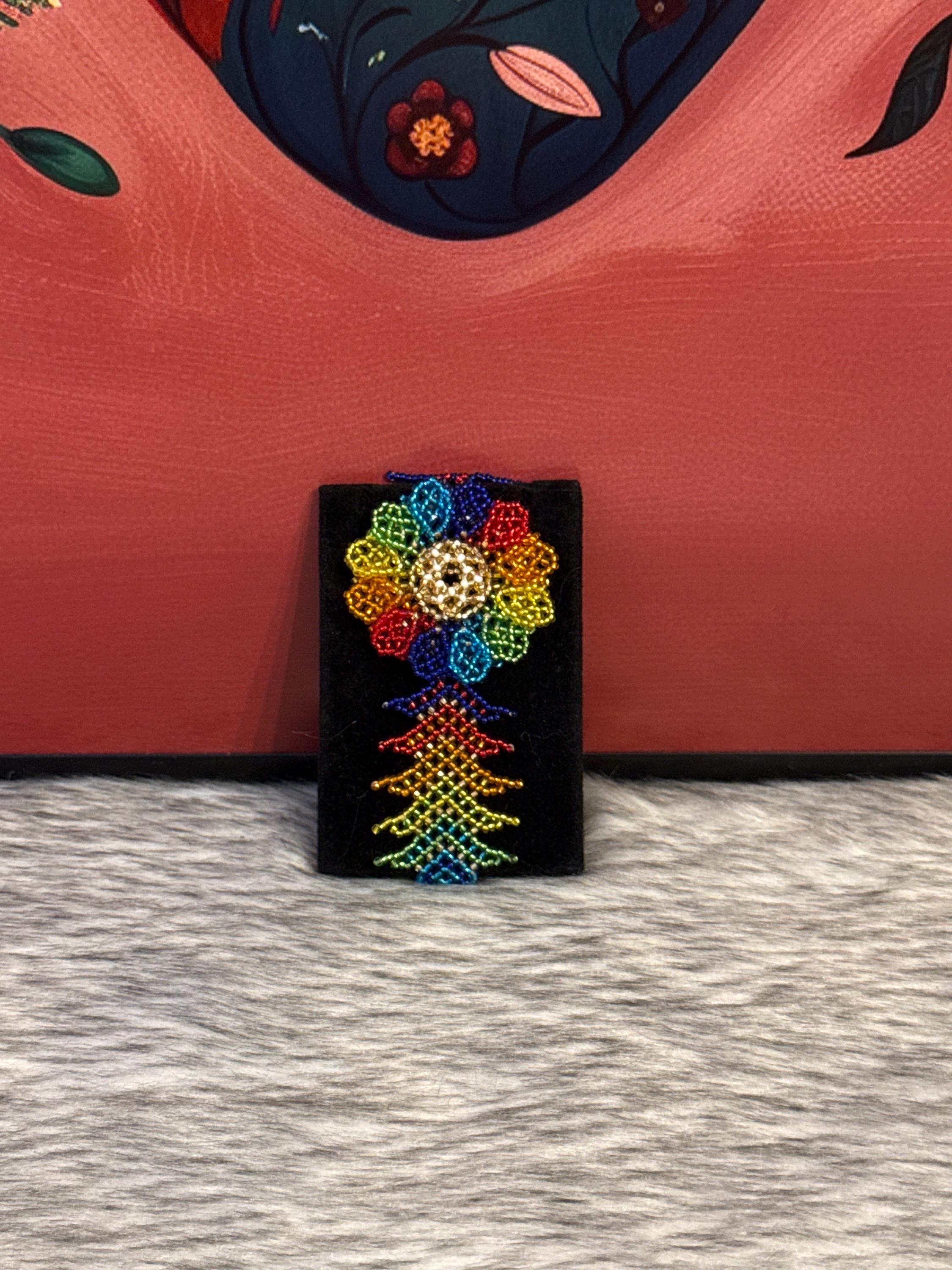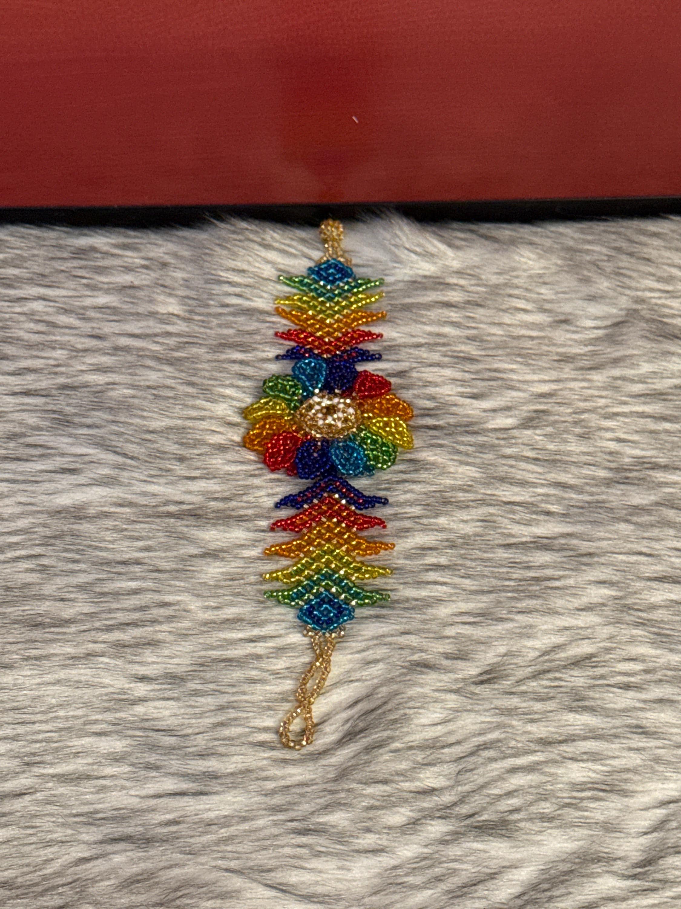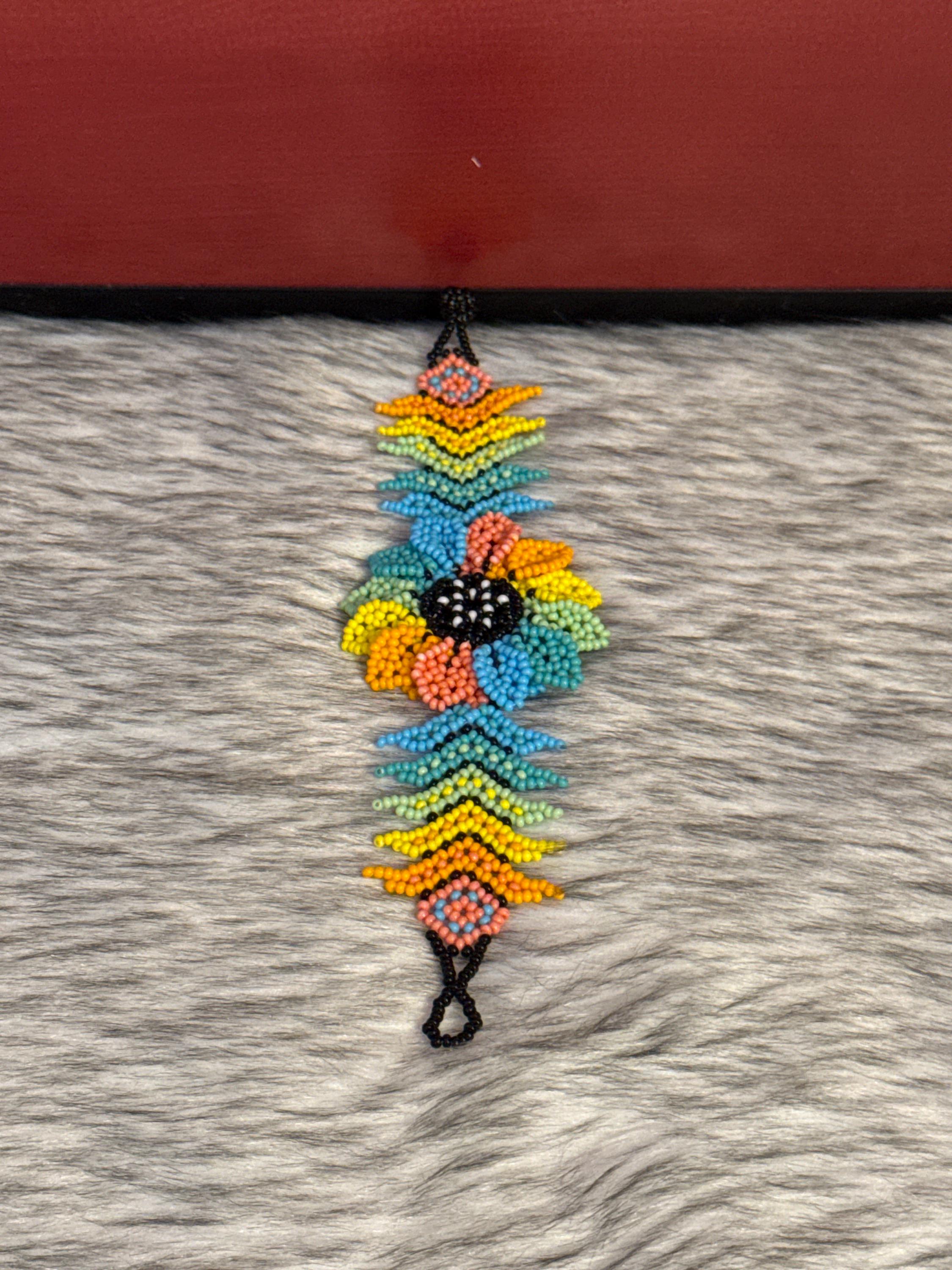 Beautiful Huichol flower-shaped bracelets, made with beads by Mexican artisans. The bracelets measure approximately 7.5 to 8 inches long.