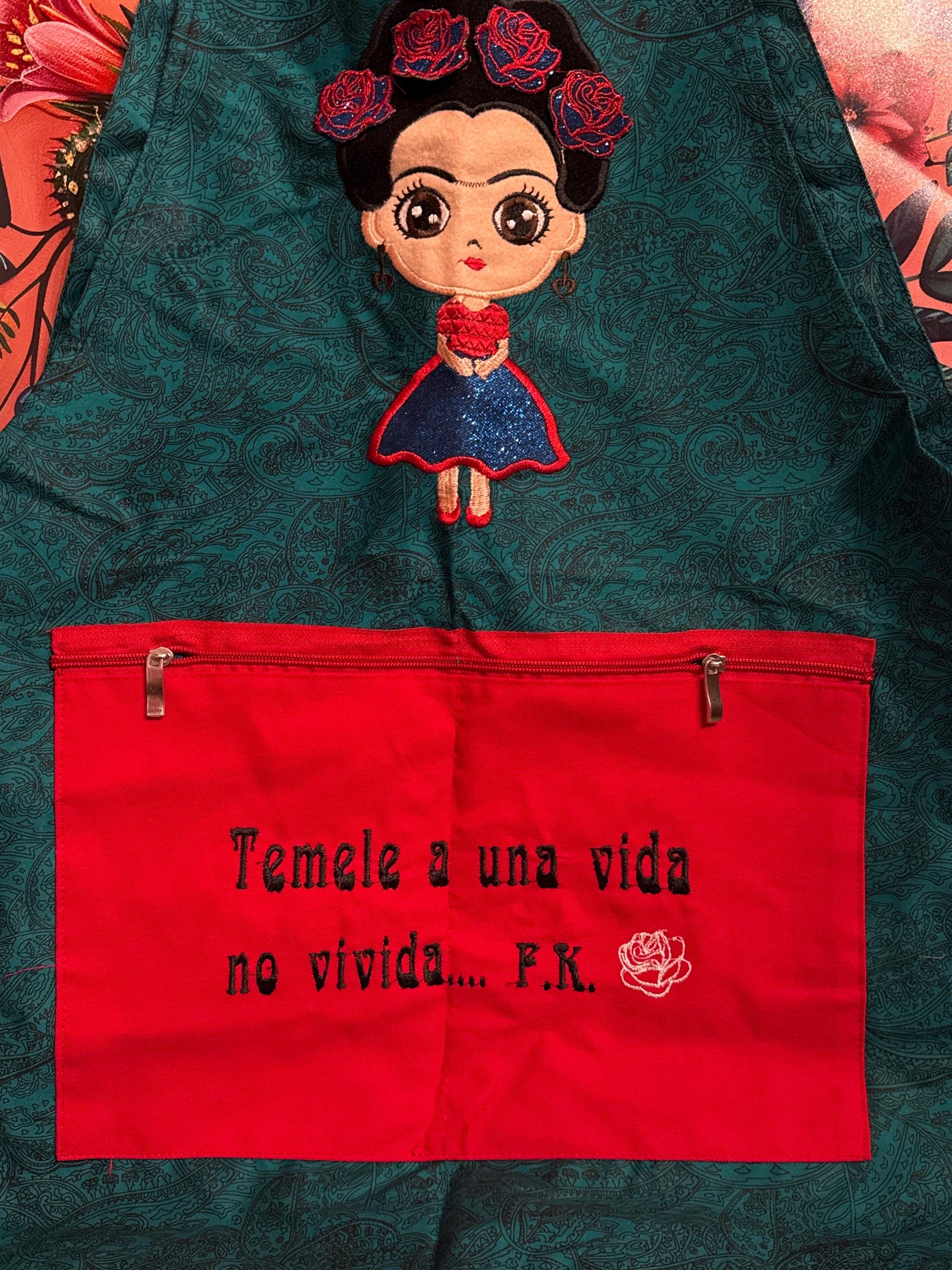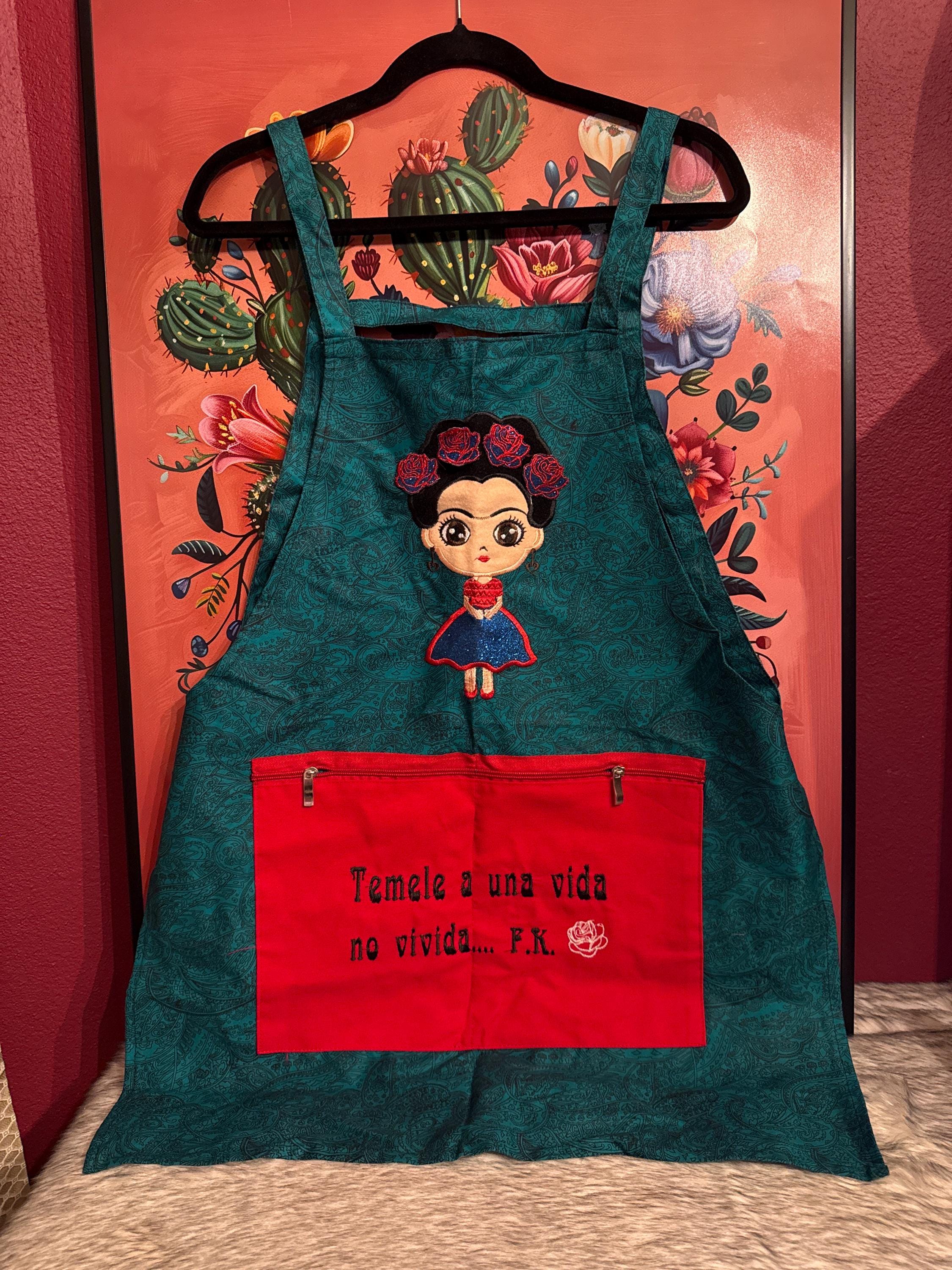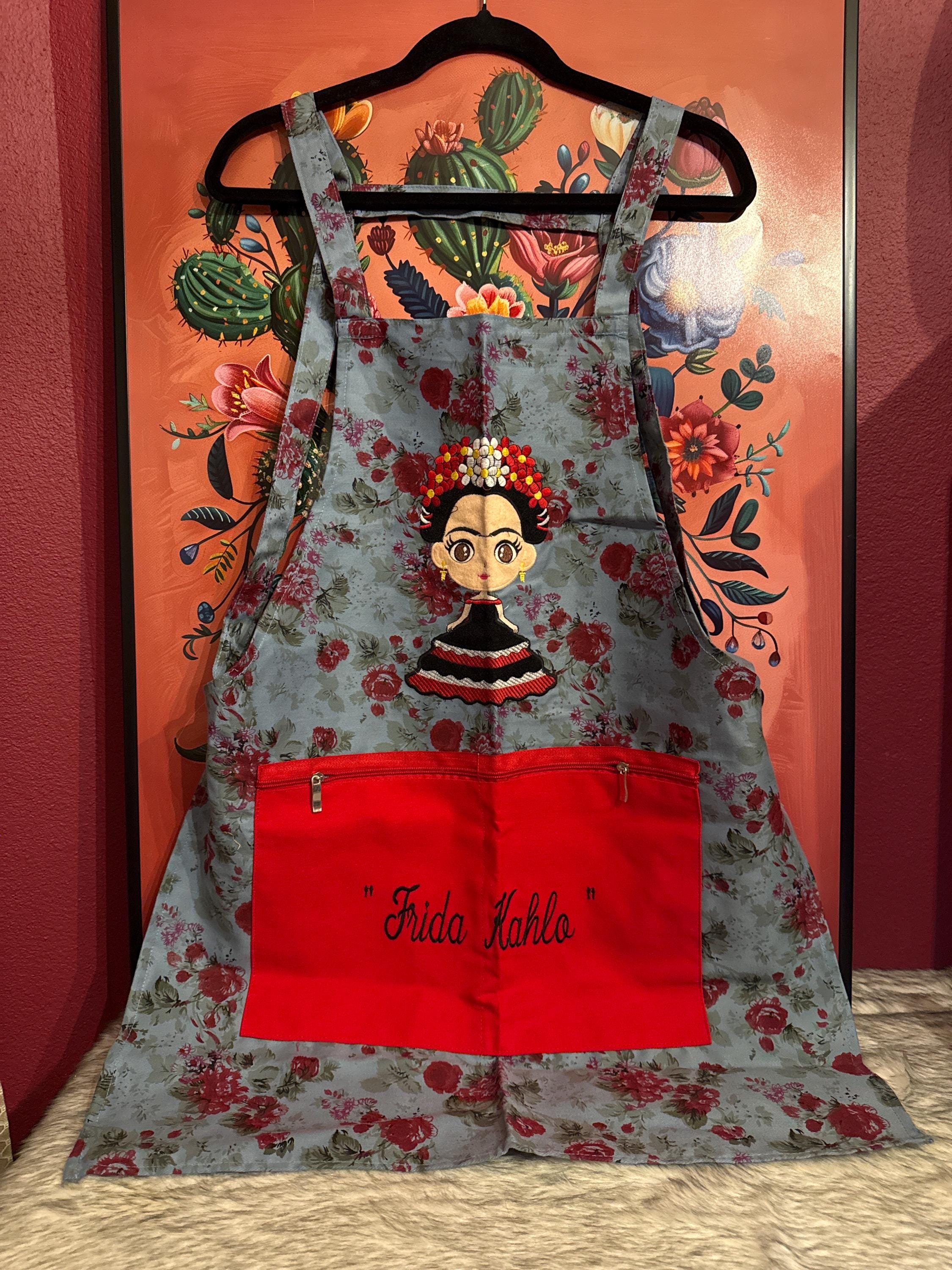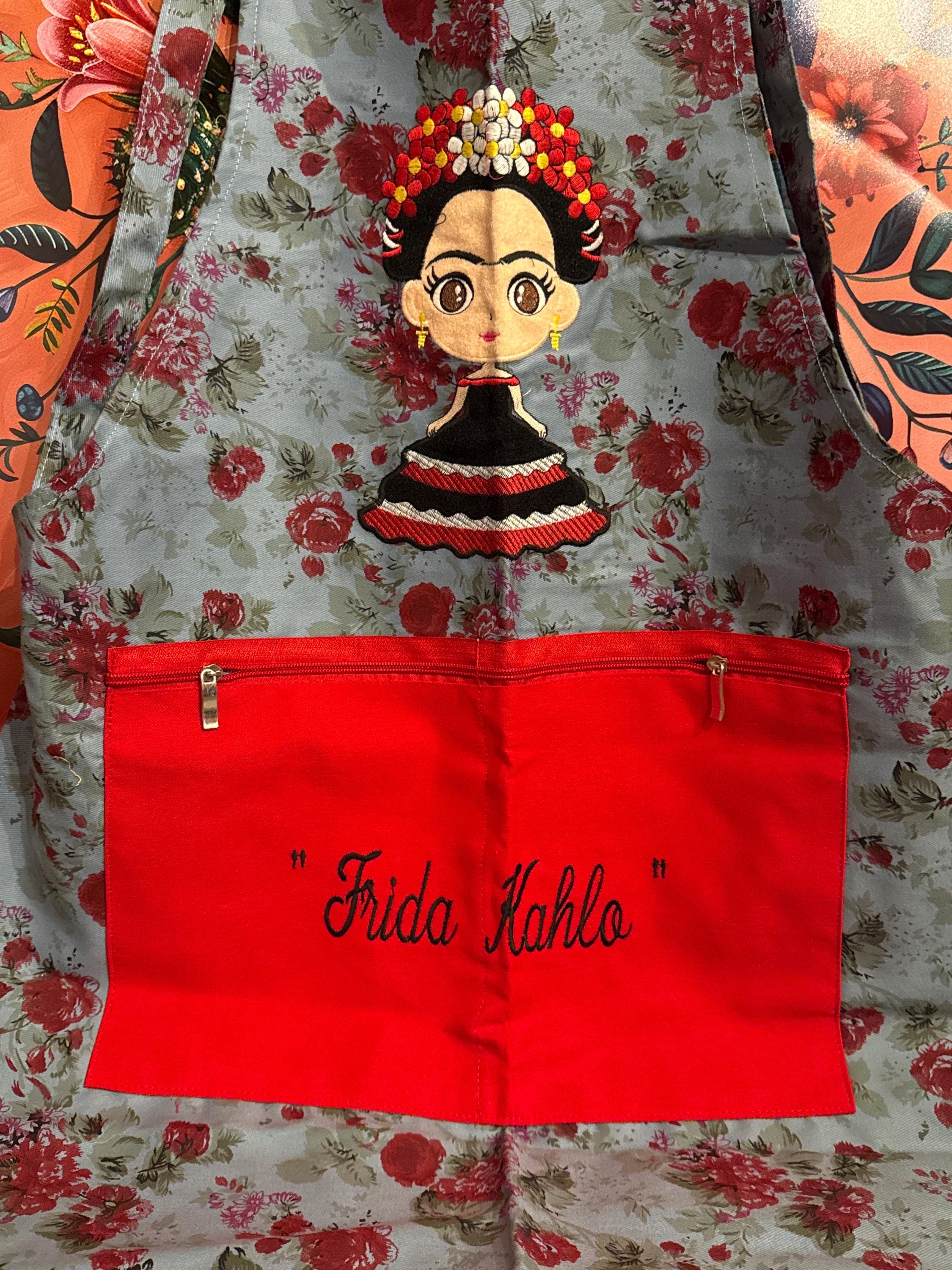Beautiful Frida aprons embroidered on a mix of cotton and denim fabric.