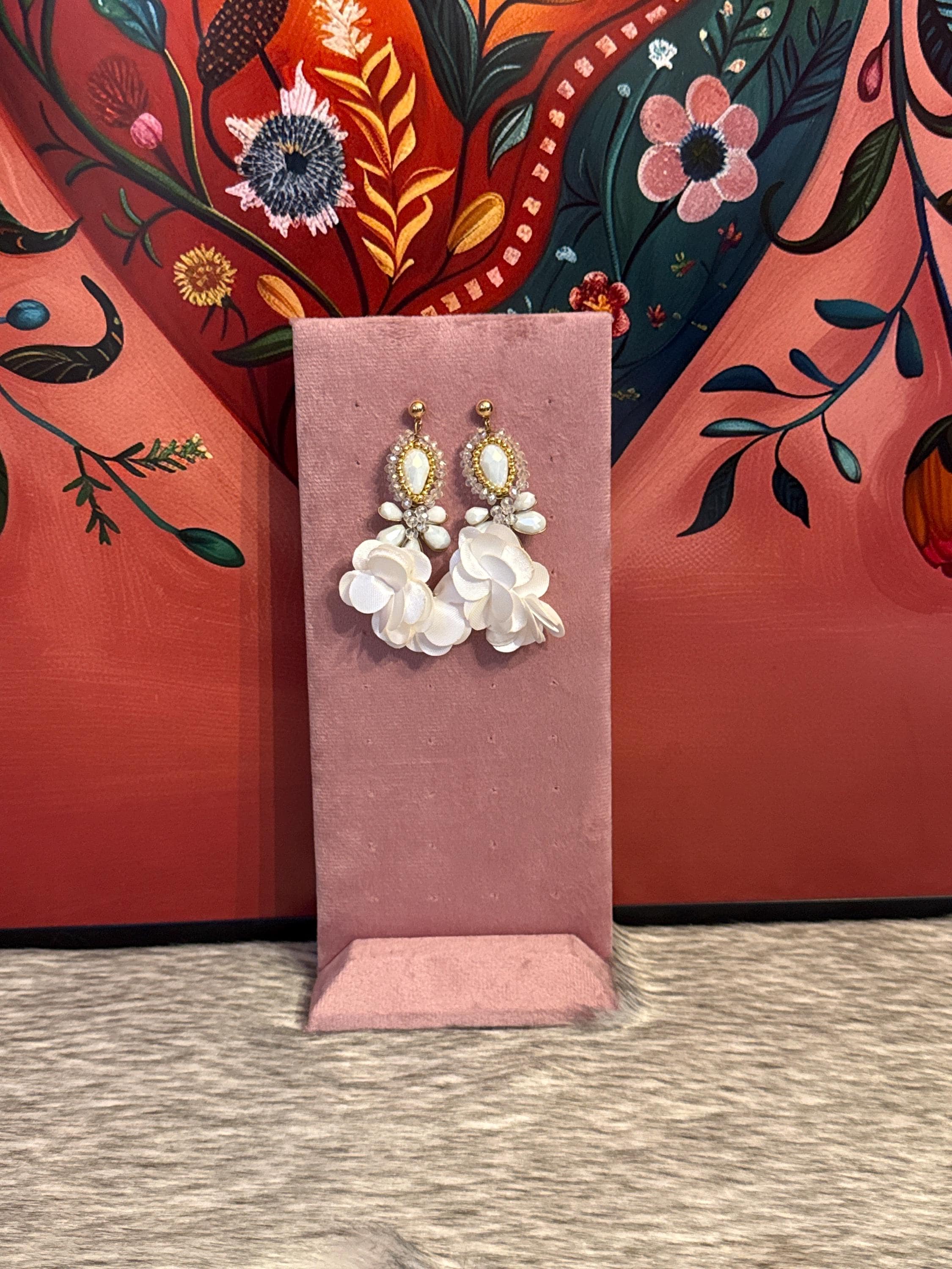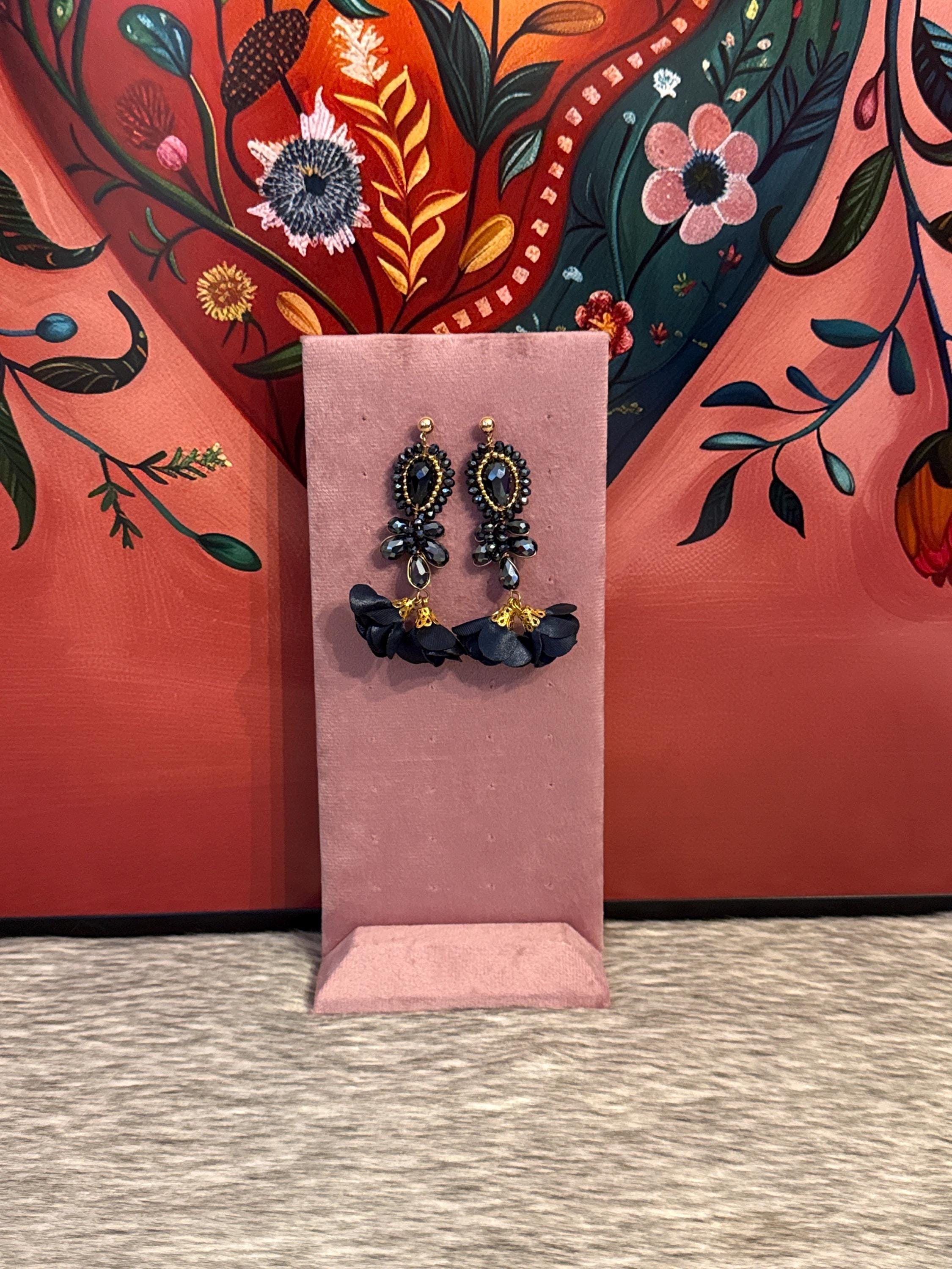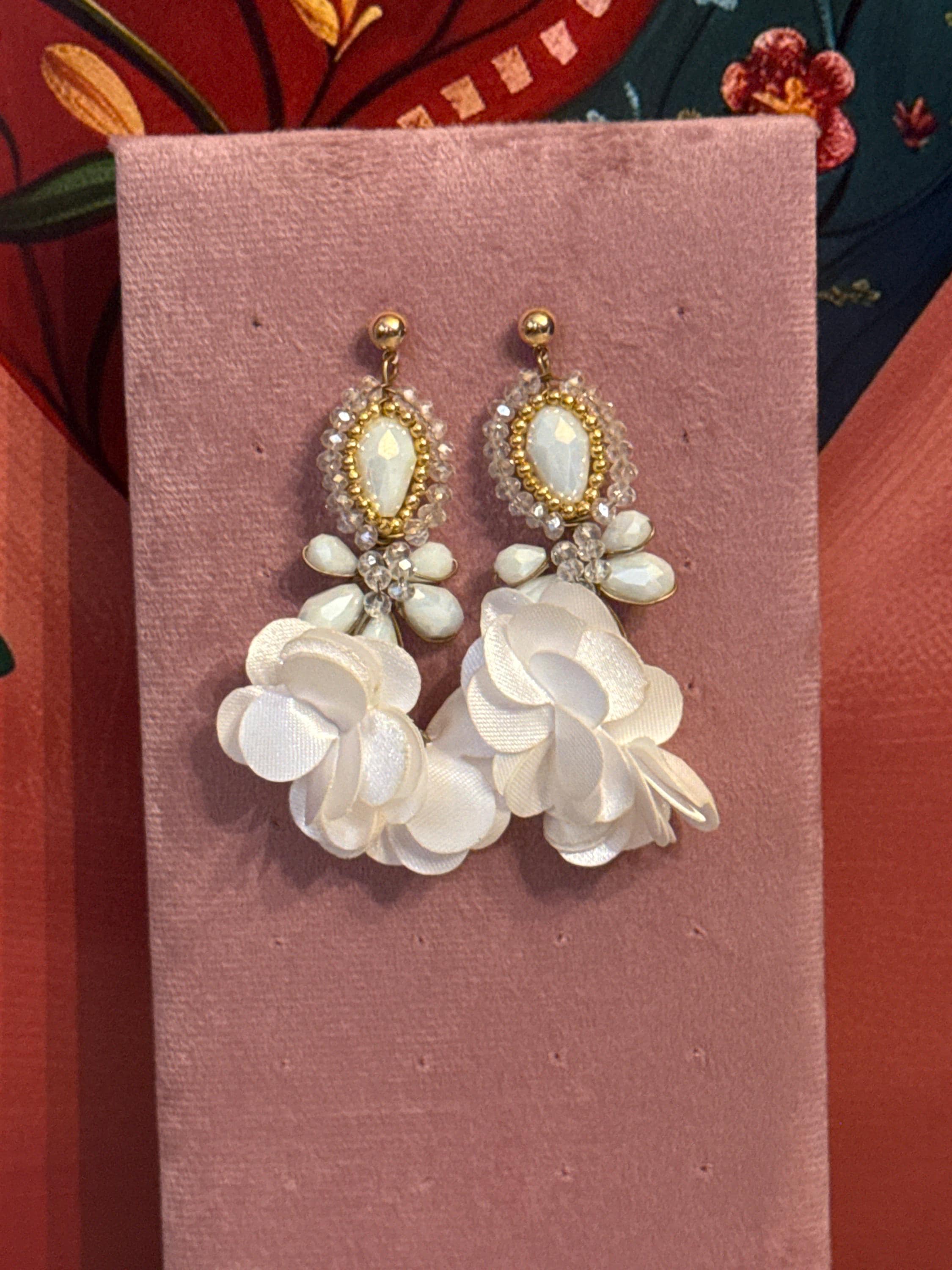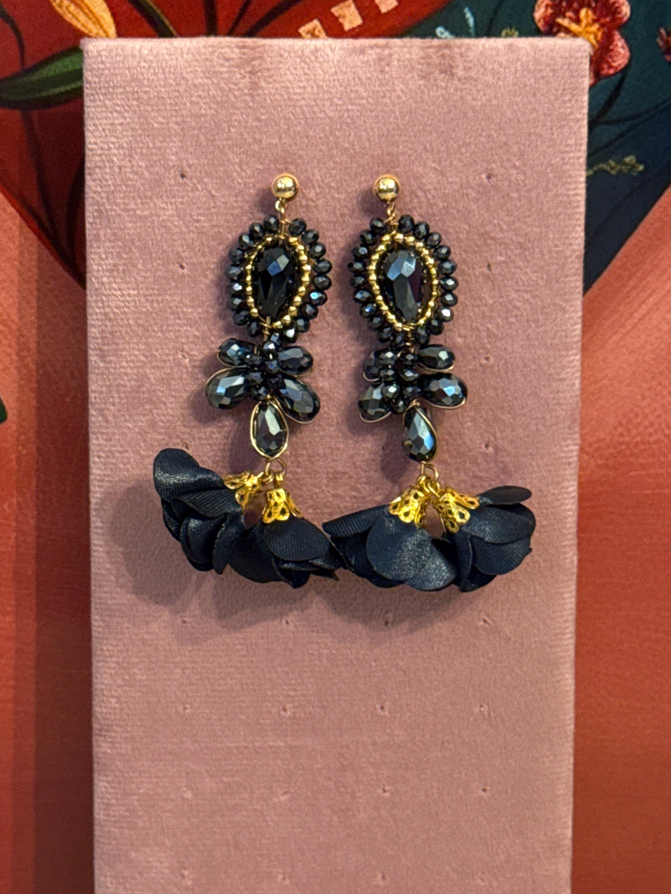 Beautiful crystal earrings in wire wrapping technique, made with Czech crystals and silk flowers, handmade by Mexican artisans.