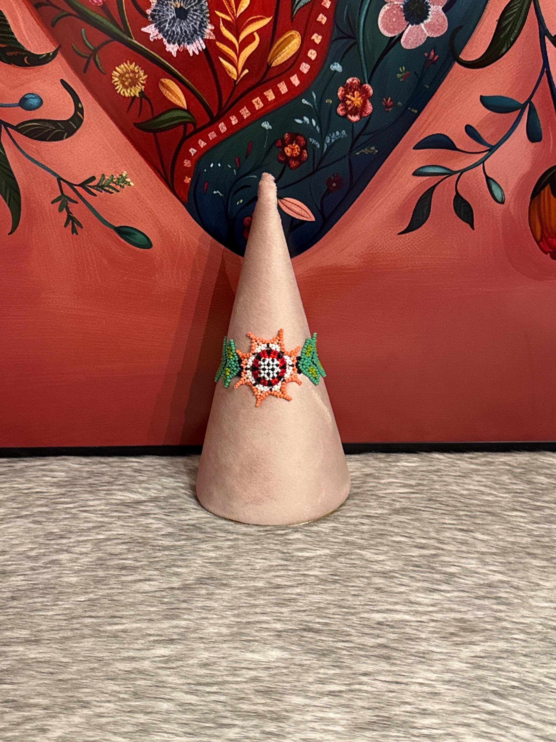 Beautiful Huichol flower-shaped bracelet, handmade with beads by Mexican artisans. The bracelet measures approximately 7 inches long.