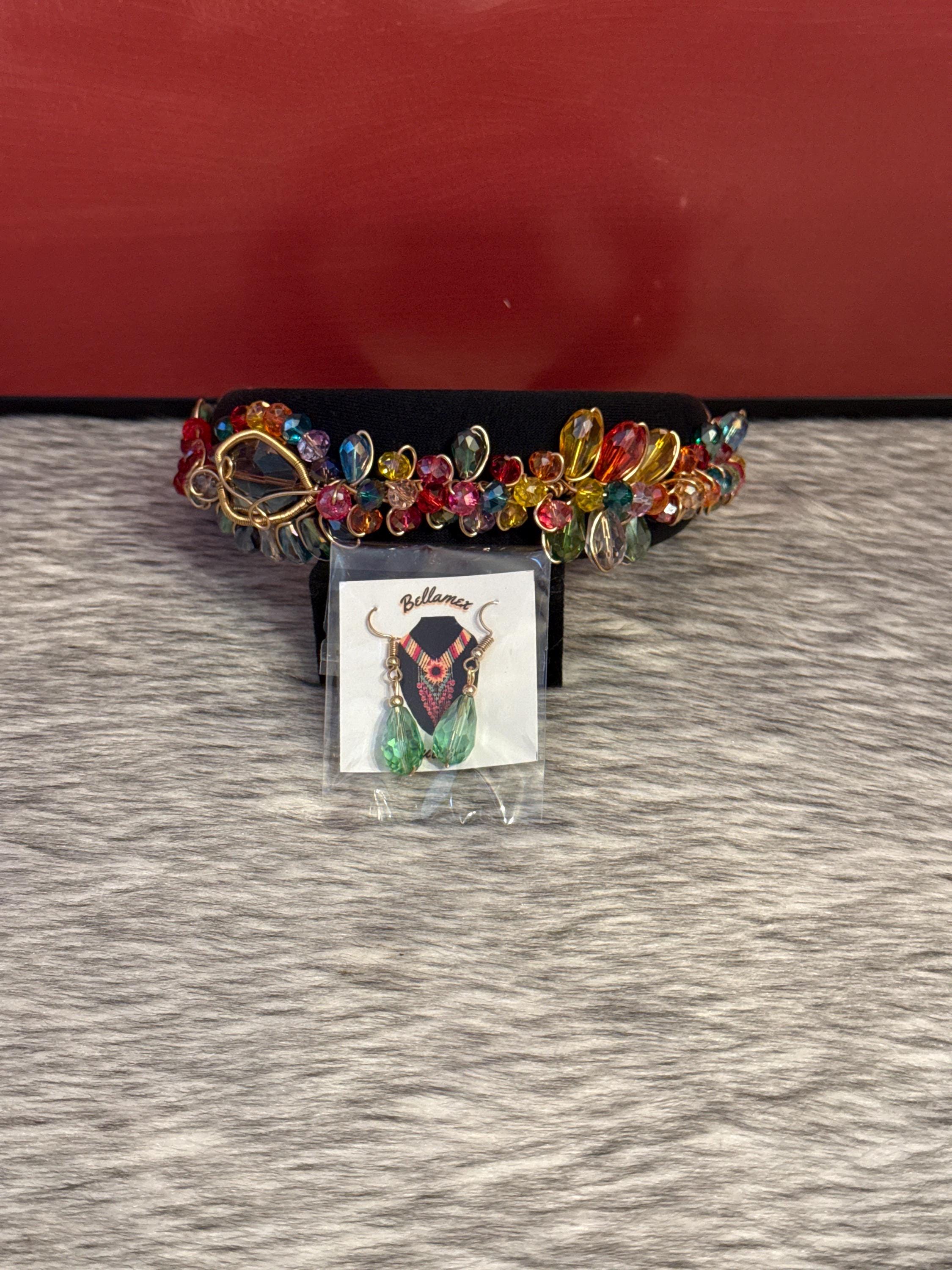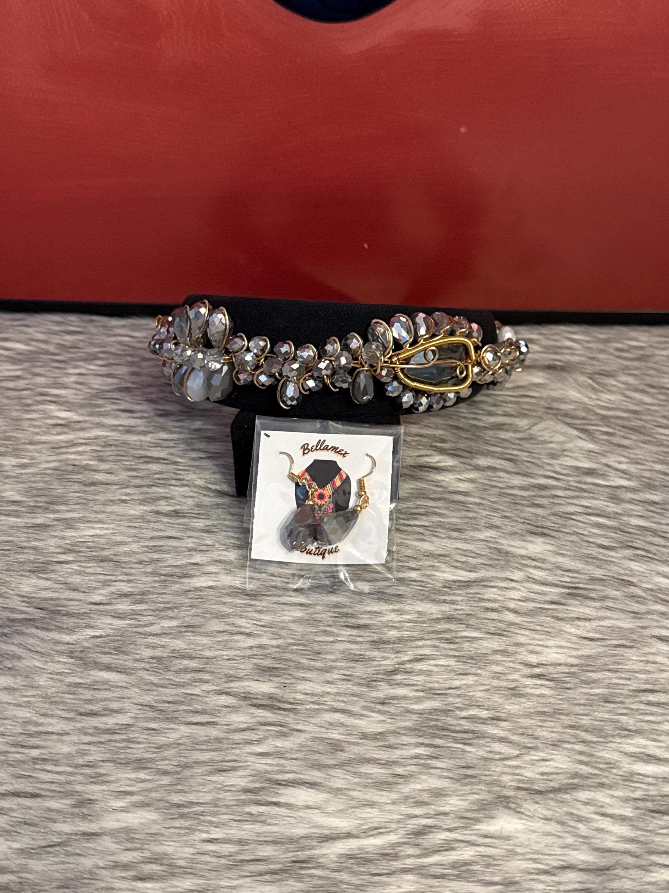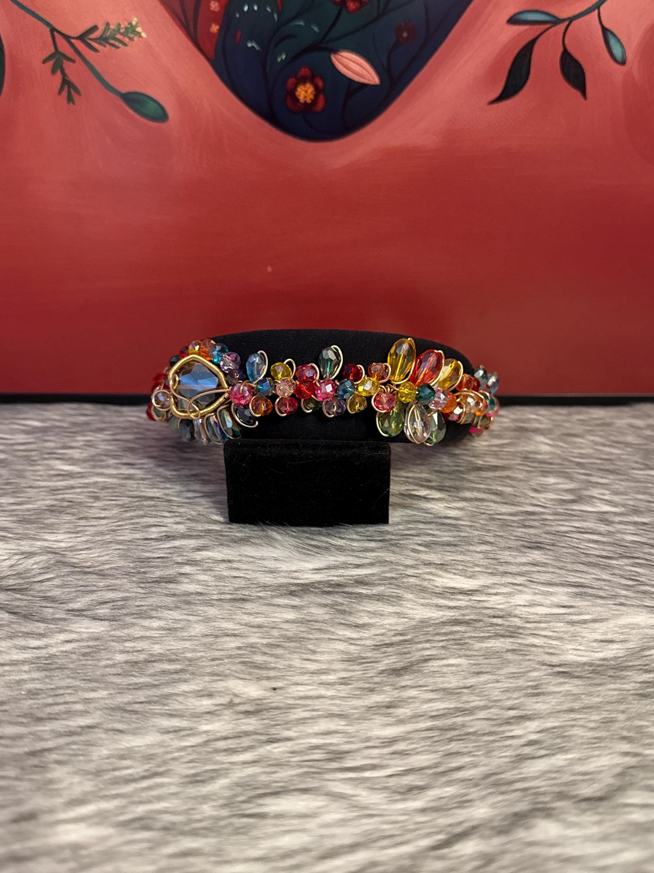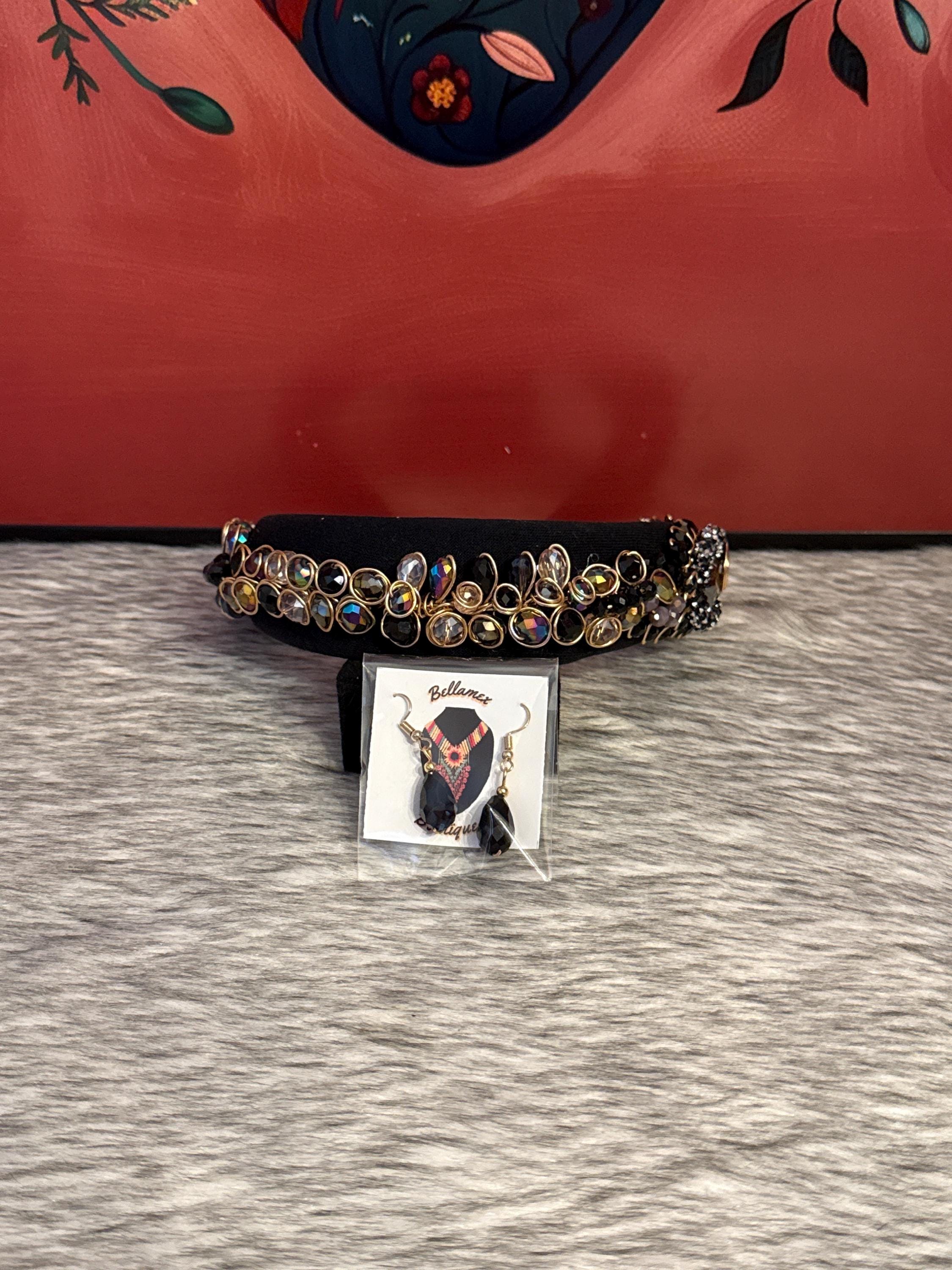 Beautiful velvet headband embroidered with crystals using the wire wrapping technique, handmade by Mexican artisans, includes free earrings.