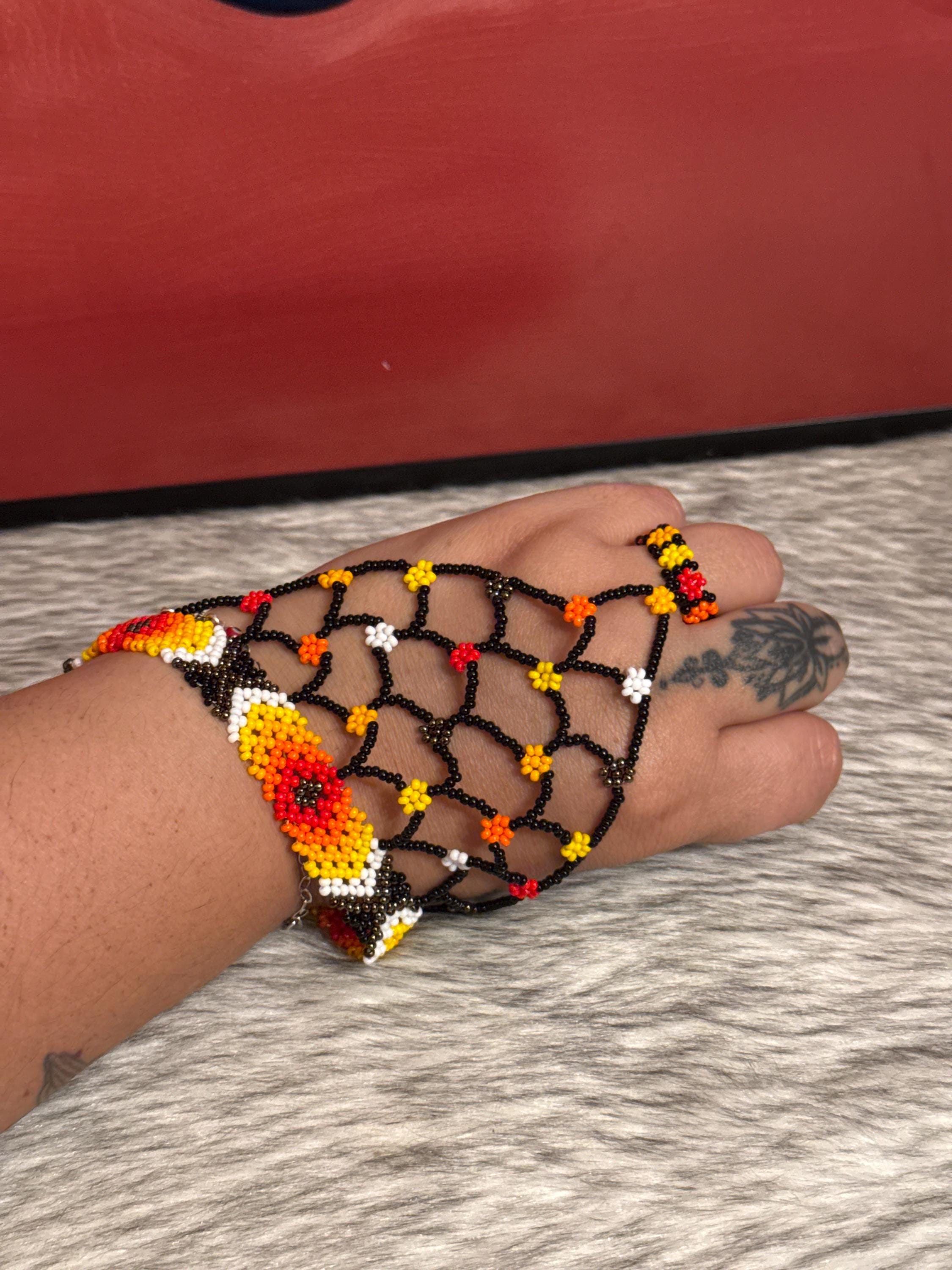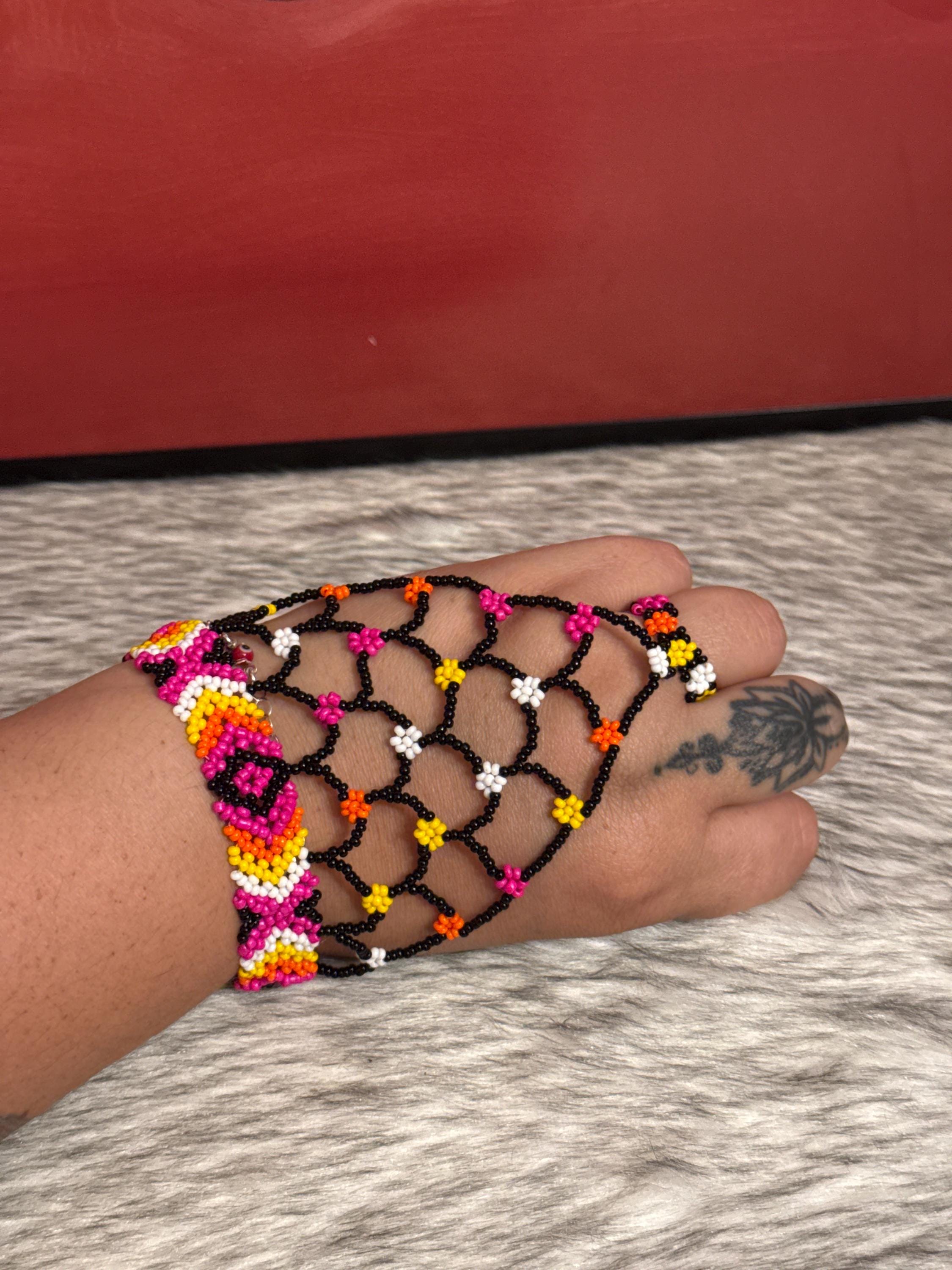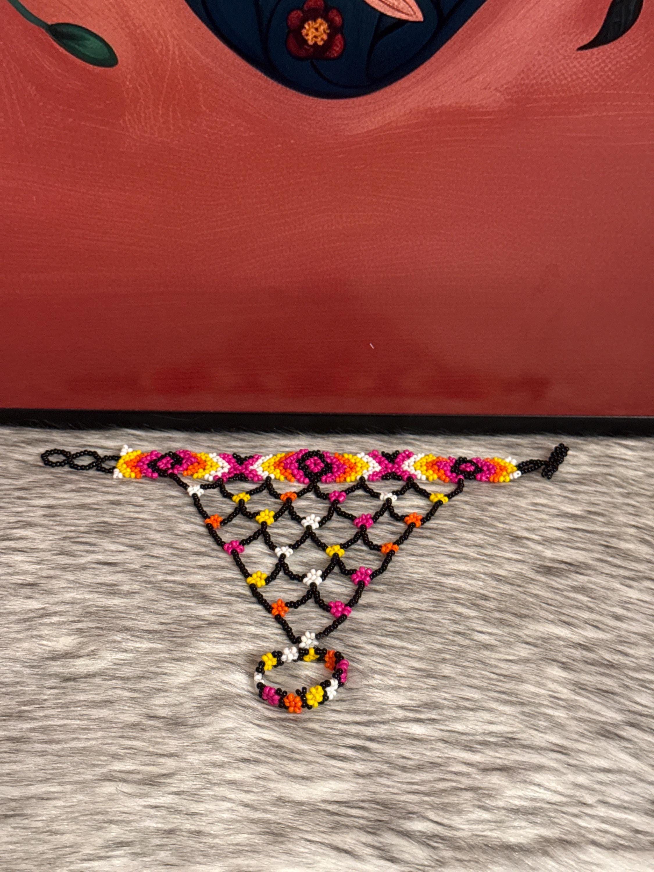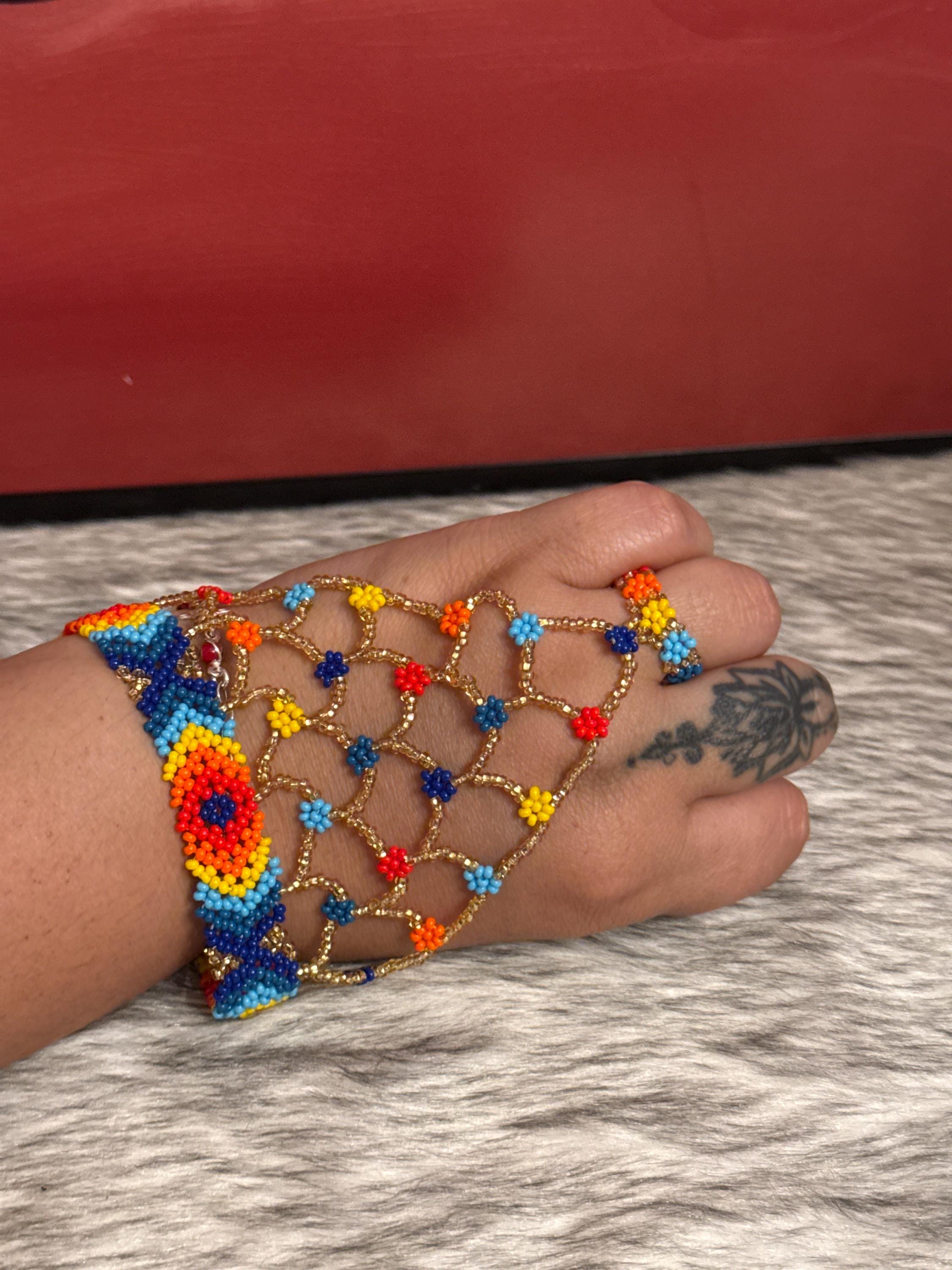Beautiful Mayan-shaped bracelet with integrated ring, handmade with beads, the bracelets measure approximately 7 inches long and the rings vary in size.