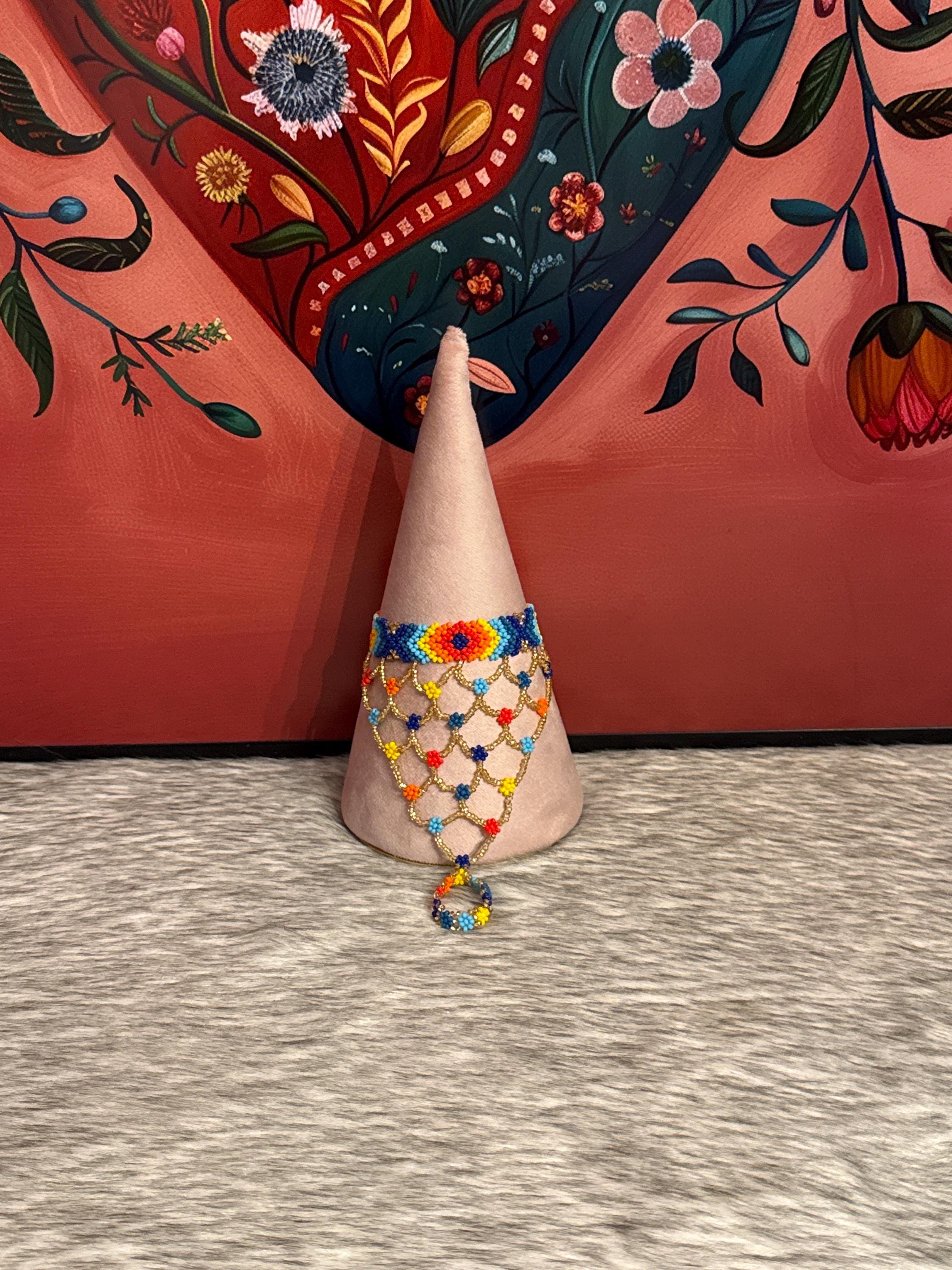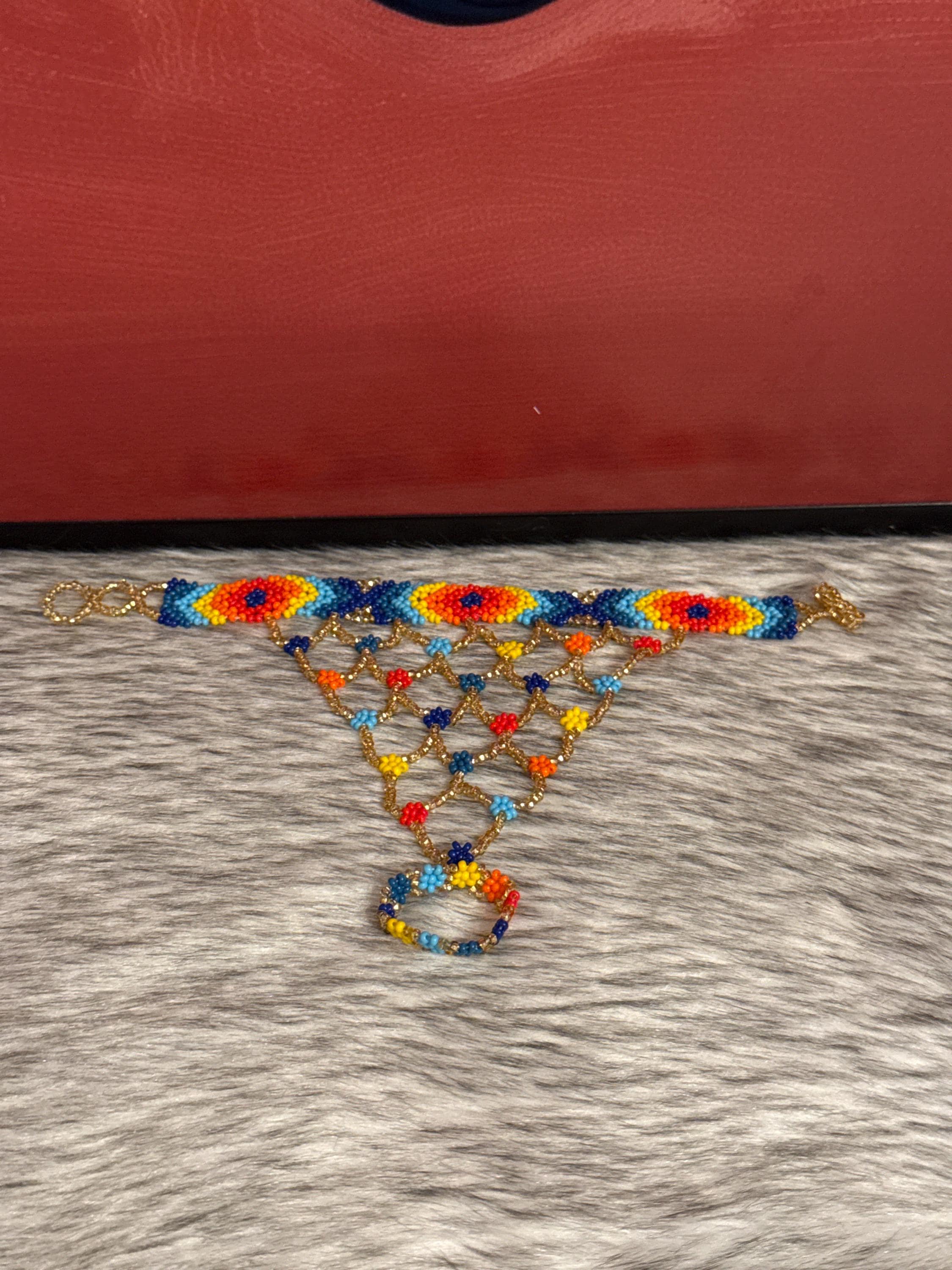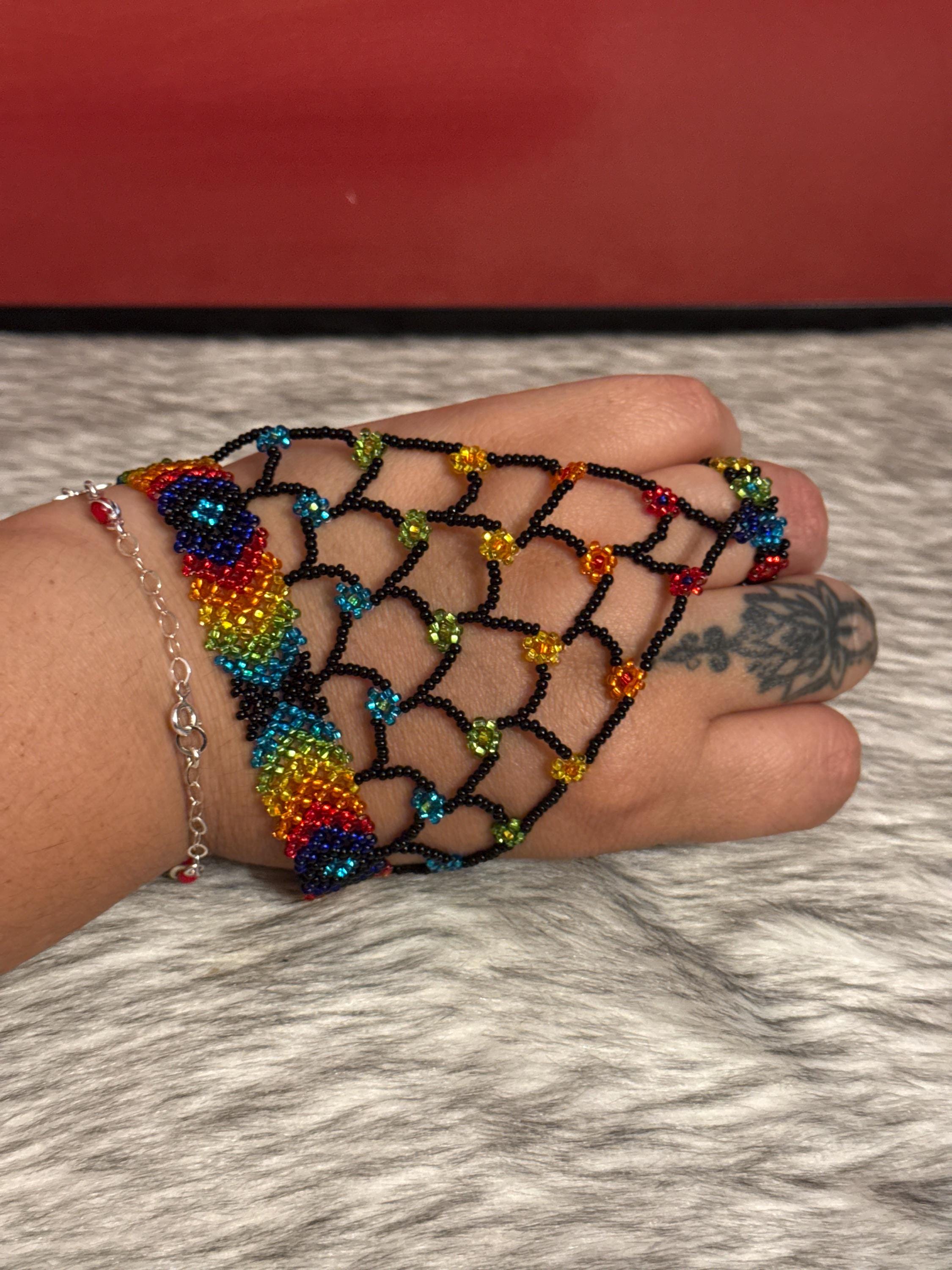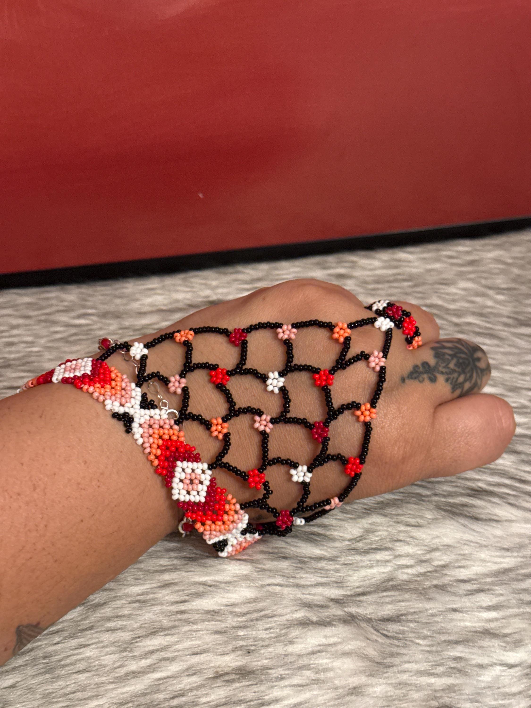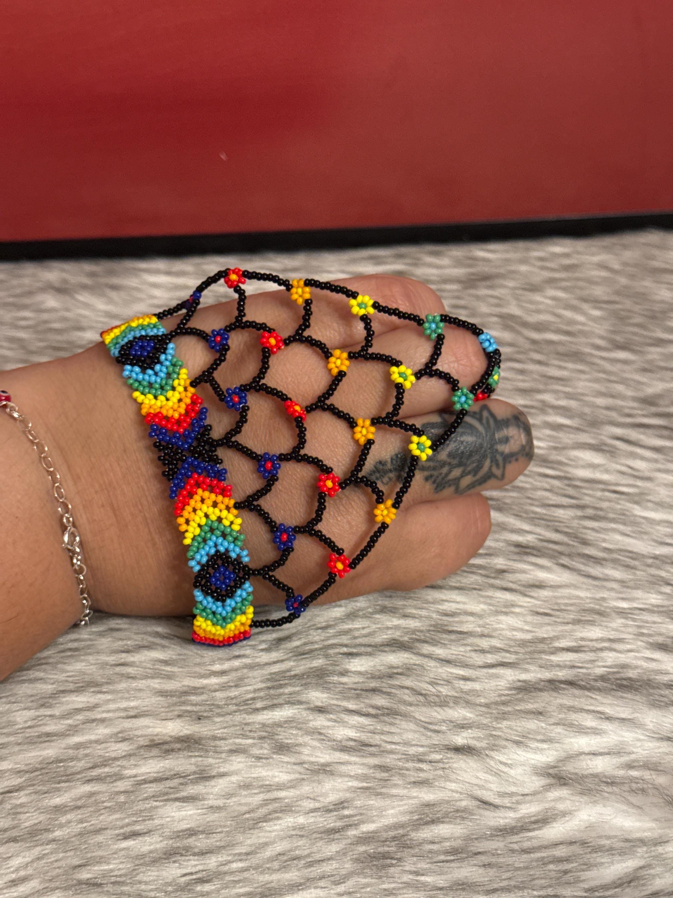 Beautiful Mayan-shaped bracelet with integrated ring, handmade with beads, the bracelets measure approximately 7 inches long and the rings vary in size.