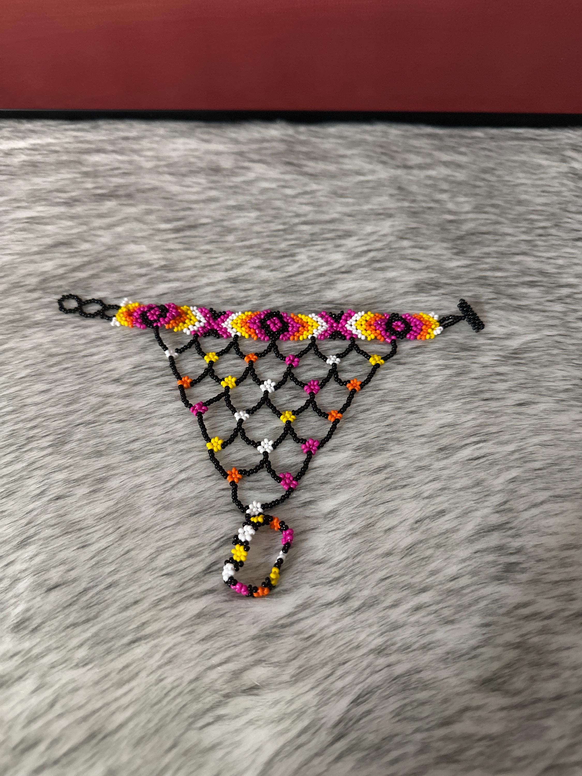 Beautiful Mayan-shaped bracelet with integrated ring, handmade with beads, the bracelets measure approximately 7 inches long and the rings vary in size.