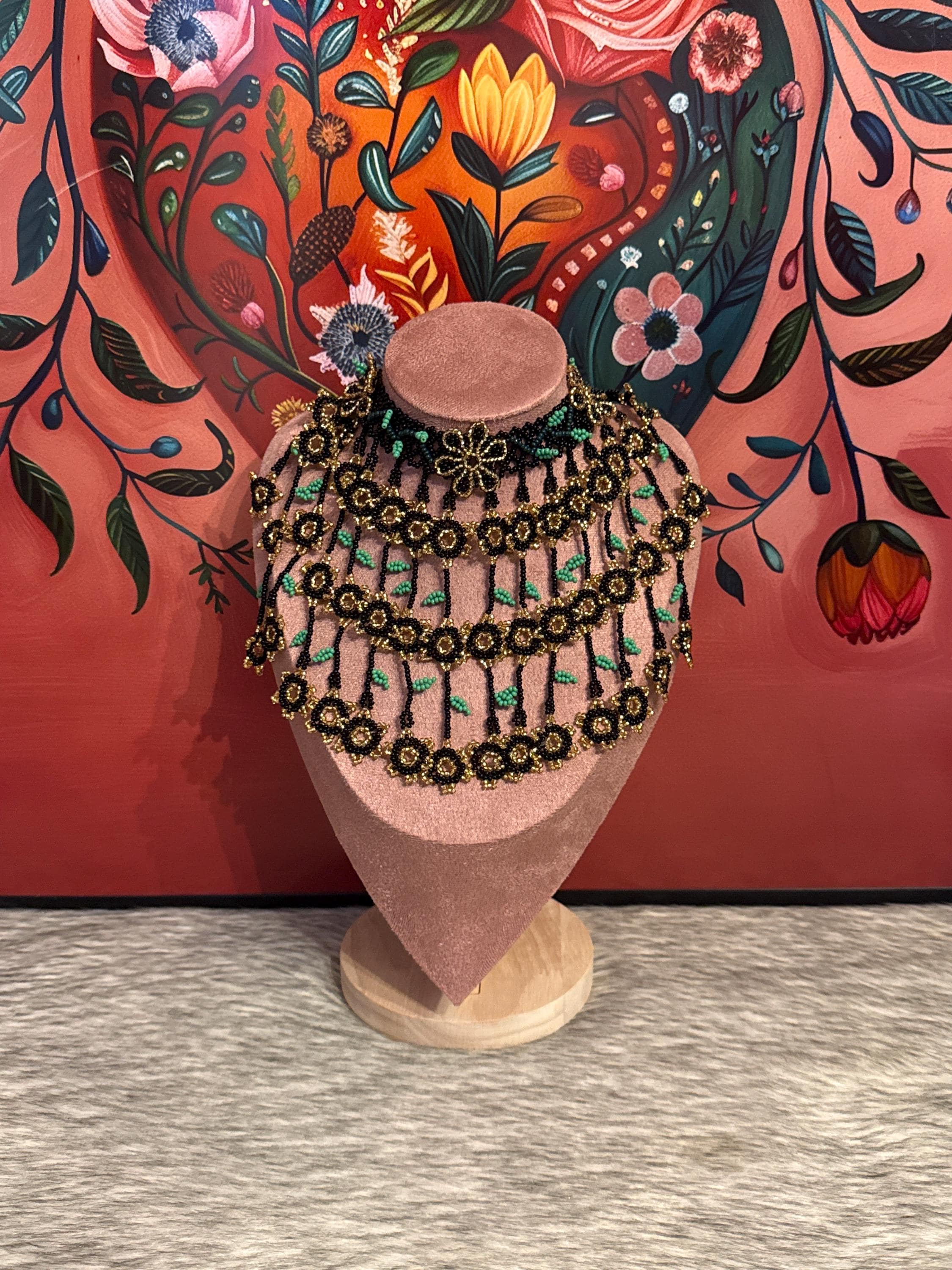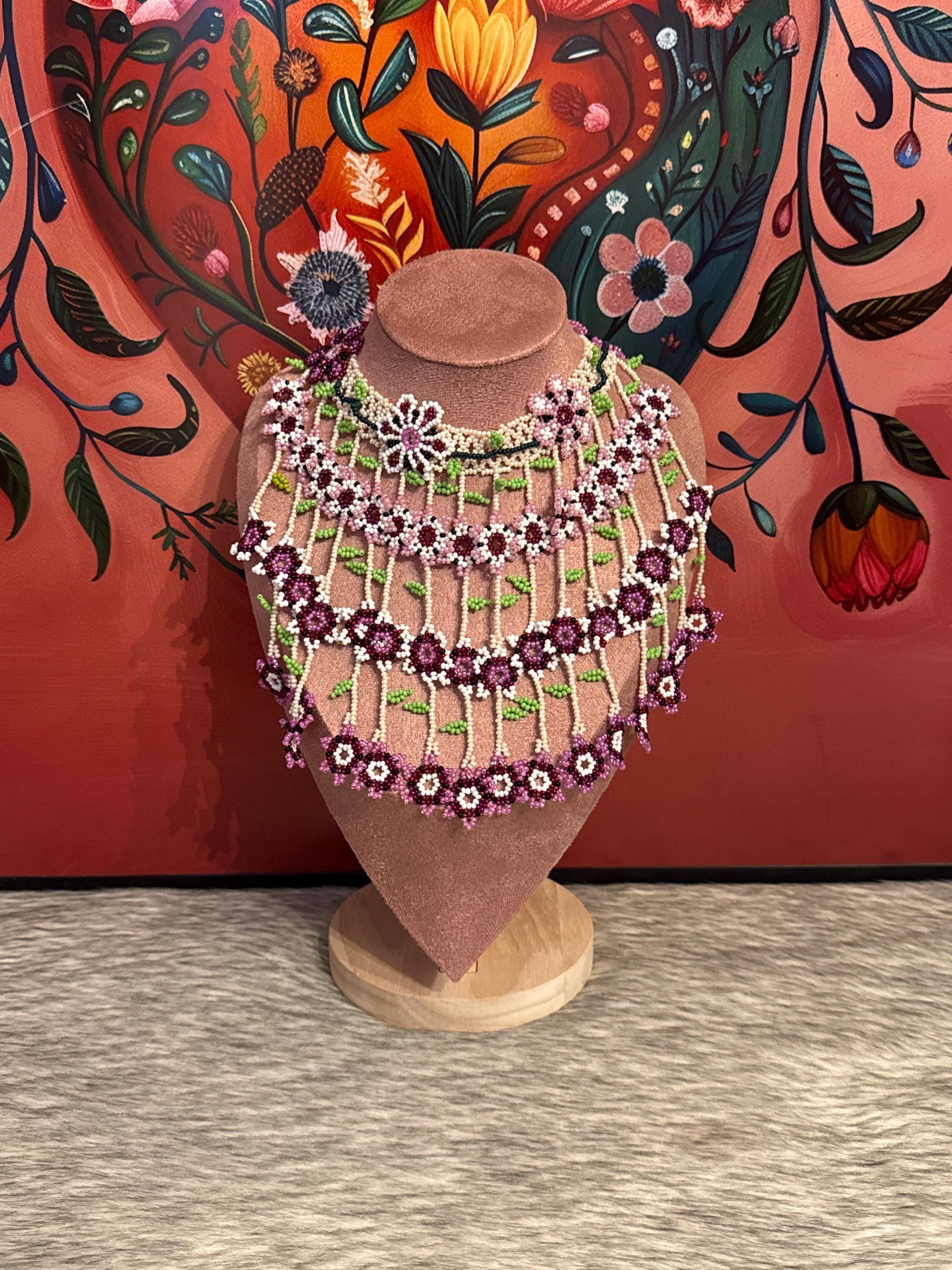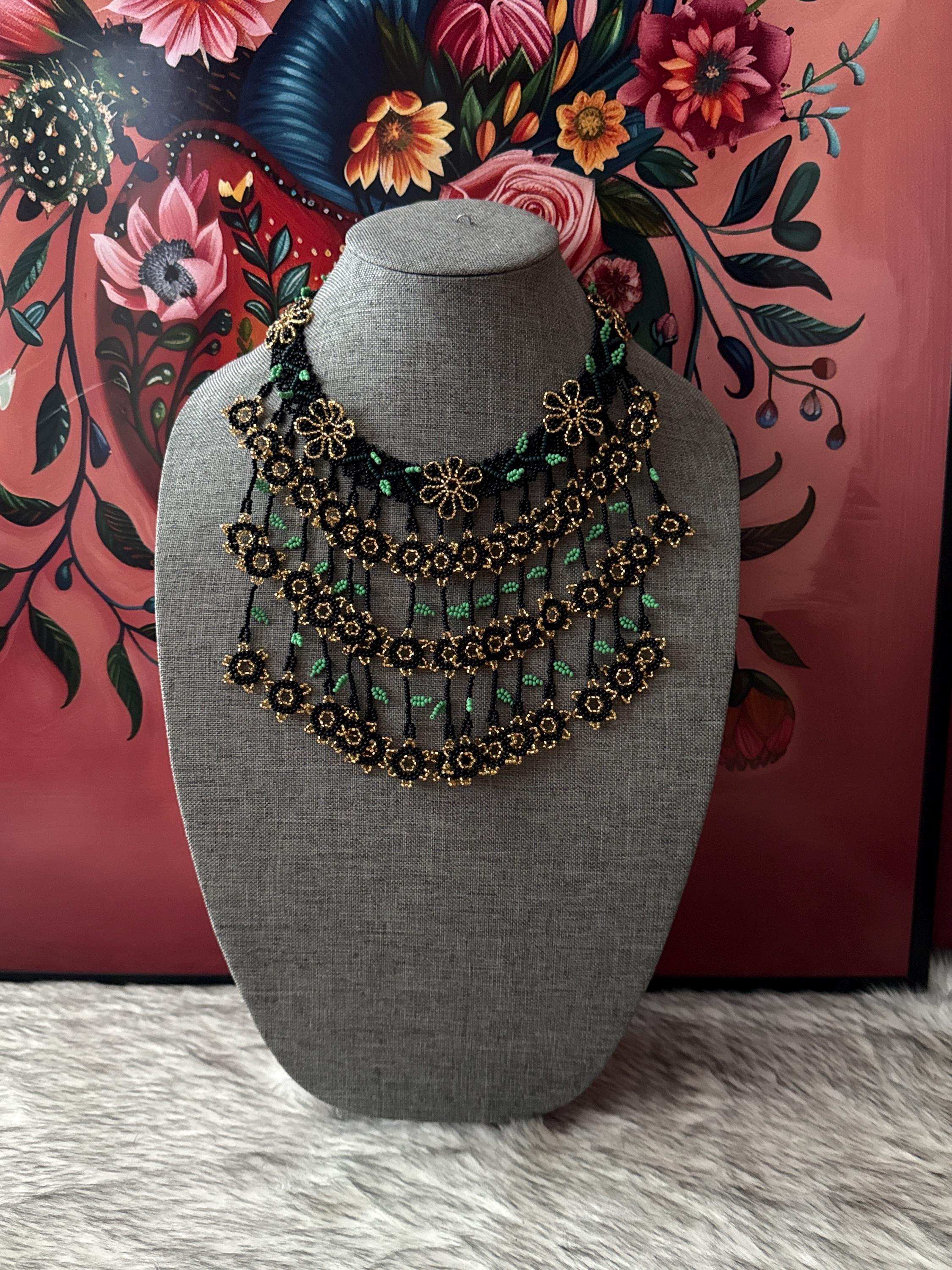 Beautiful set of necklace, earrings and bracelet handmade with glass beads called chaquiras, made by Mexican artisans